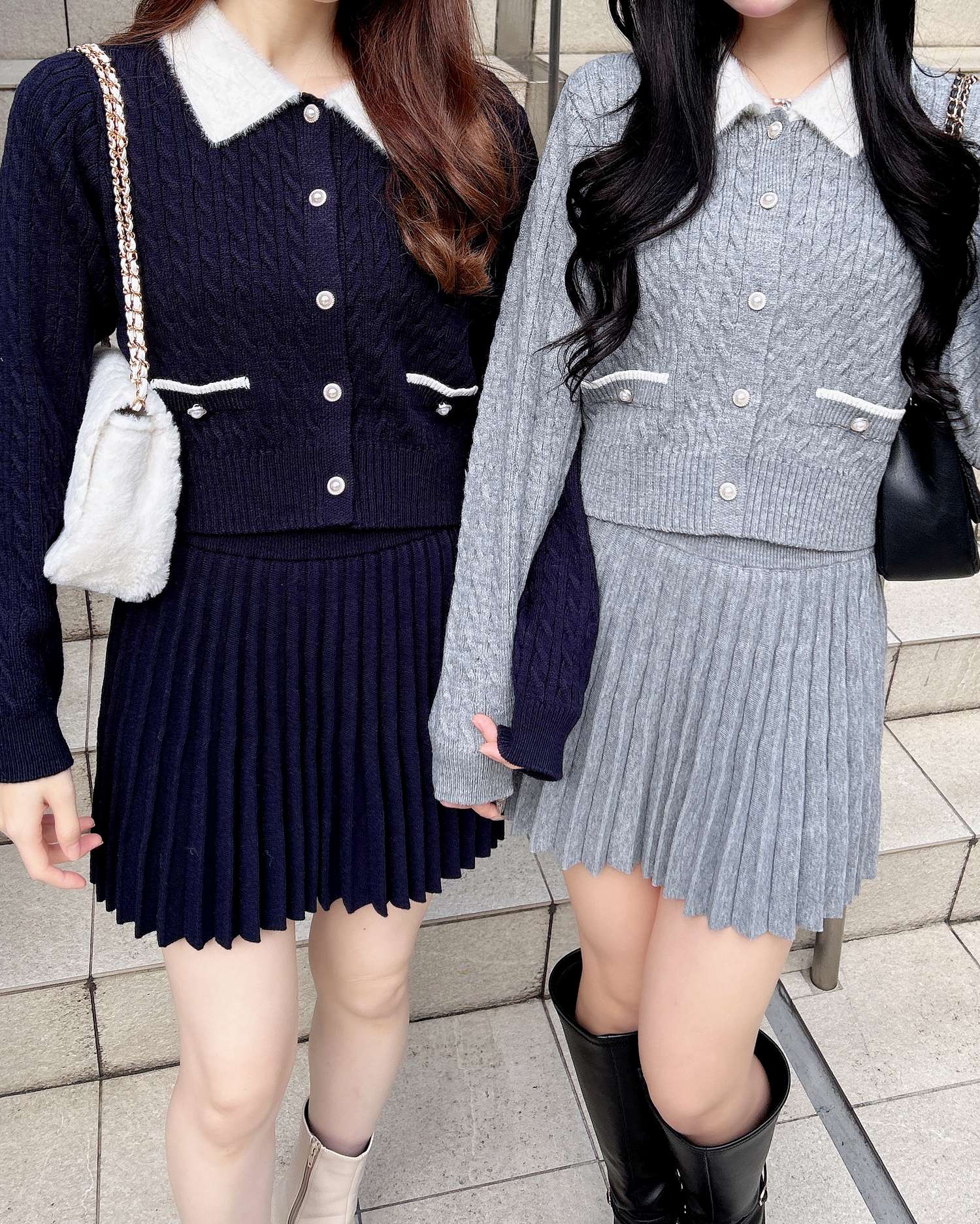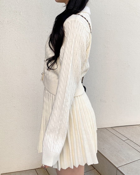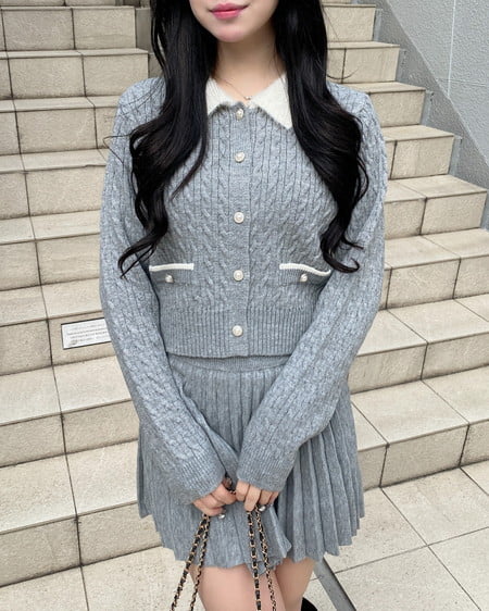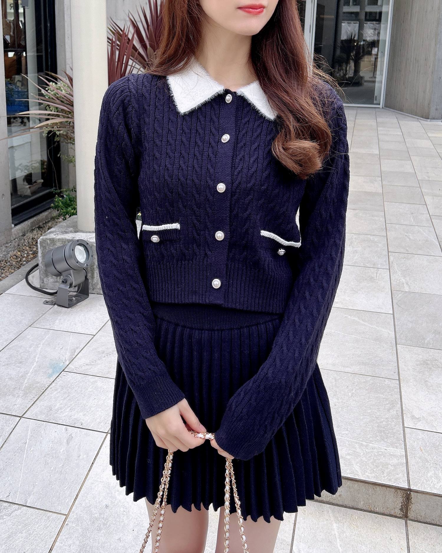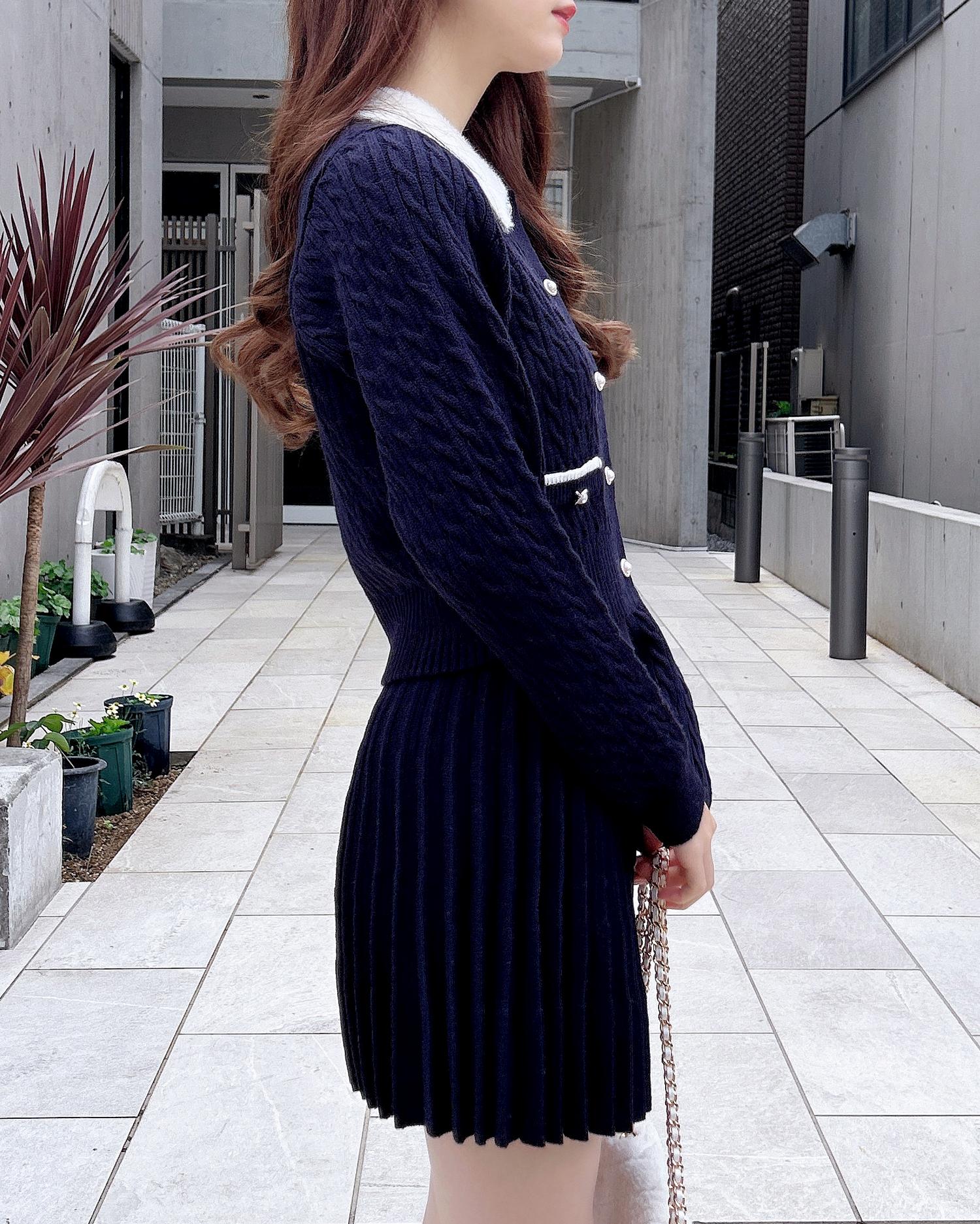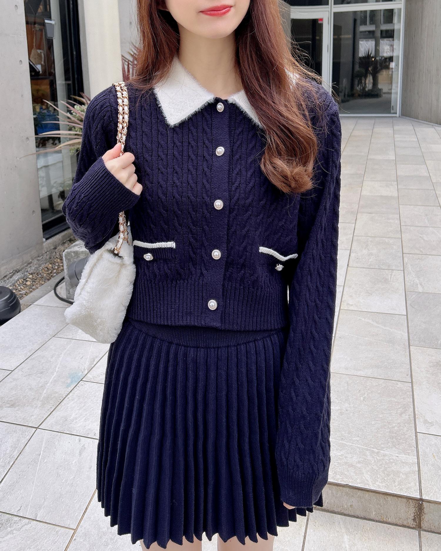 フェザー襟の付いたニットカーディガンと上品なプリーツスカートのセットアイテムです。