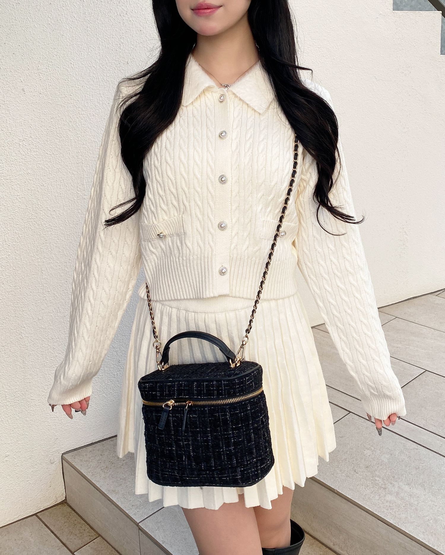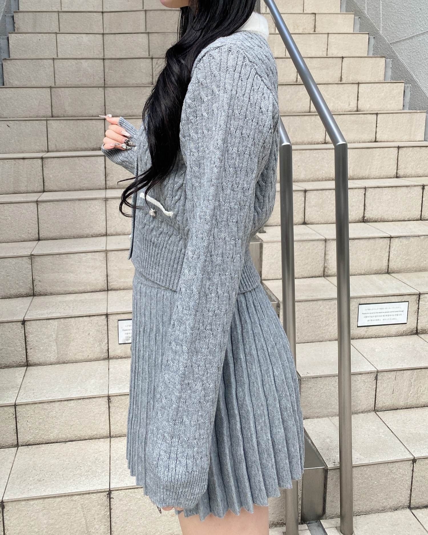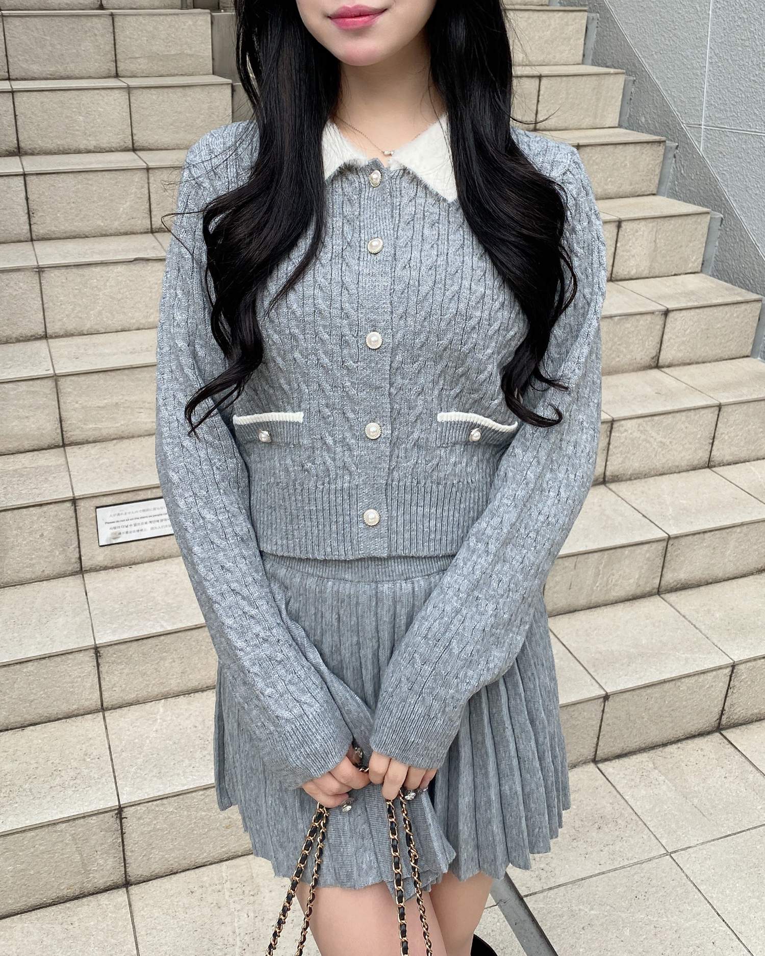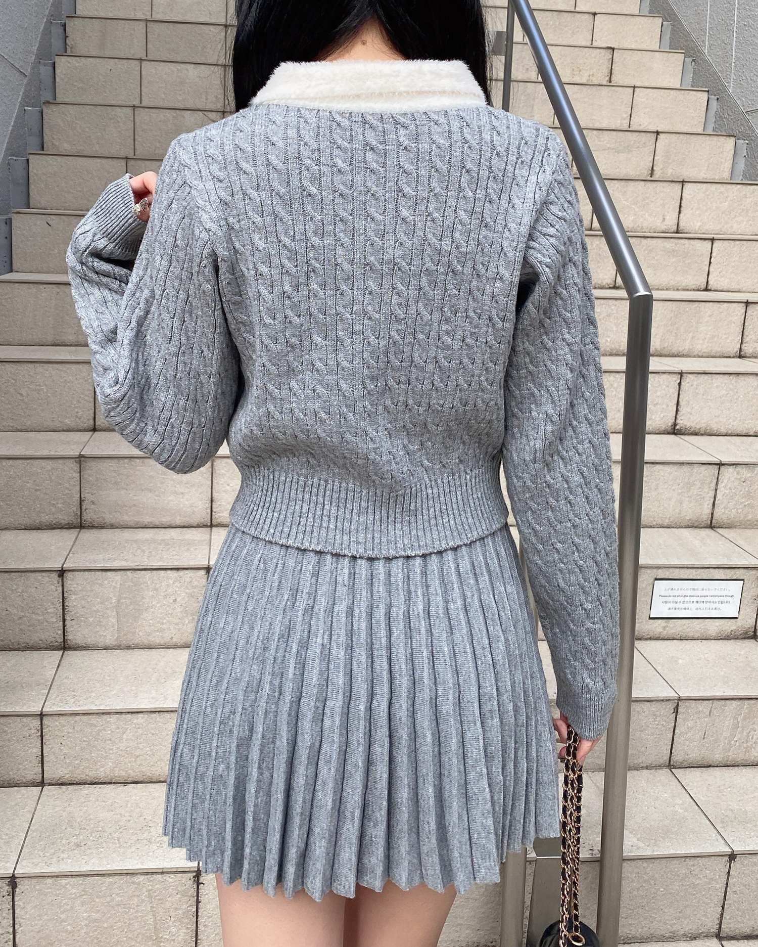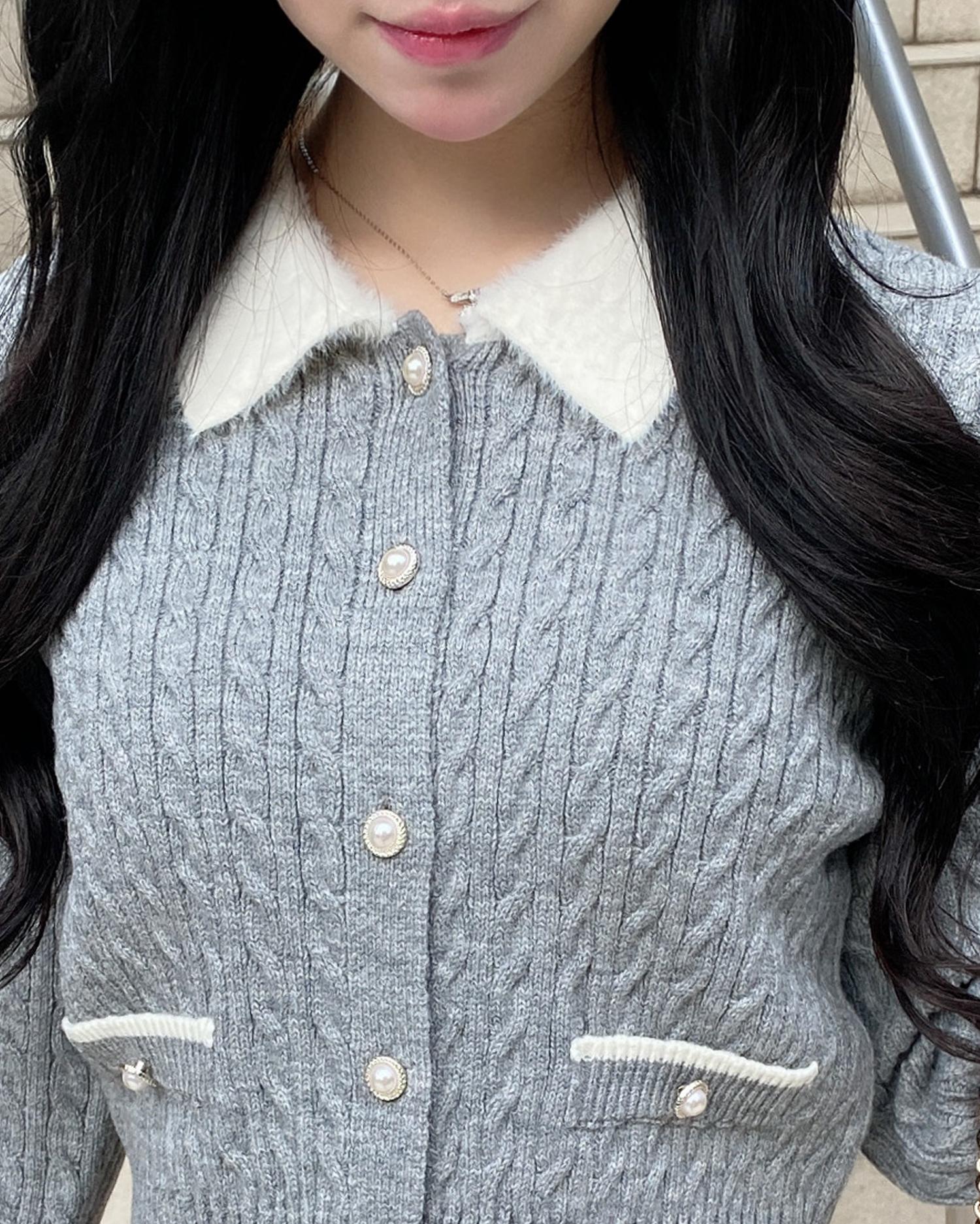 フェザー襟の付いたニットカーディガンと上品なプリーツスカートのセットアイテムです。