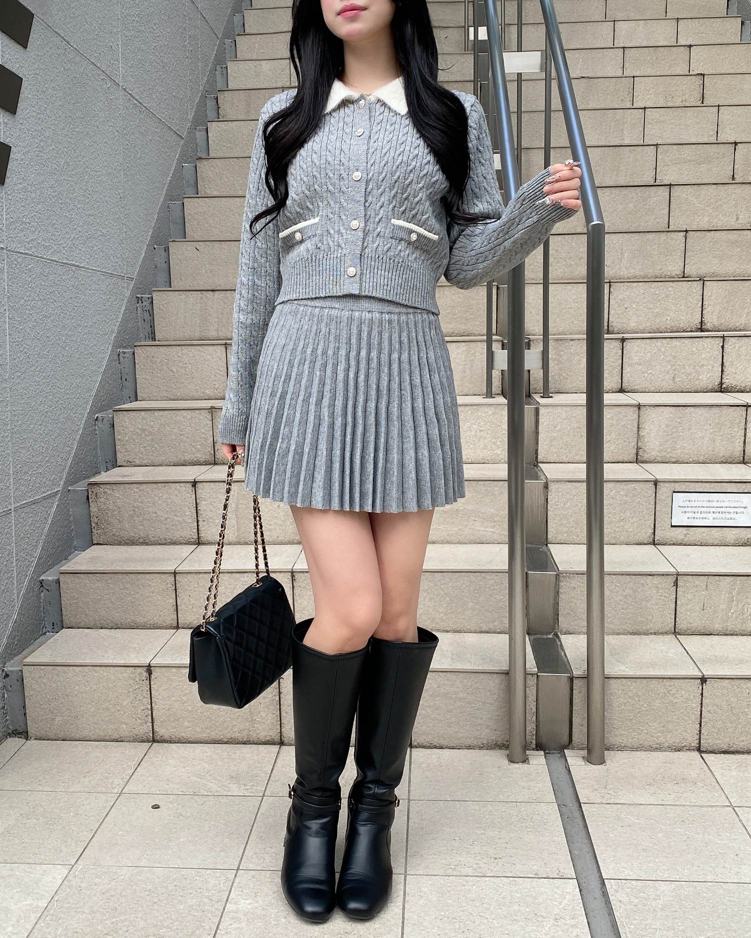 スカートがミニ丈なのでロングブーツを合わせるのがおすすめです。