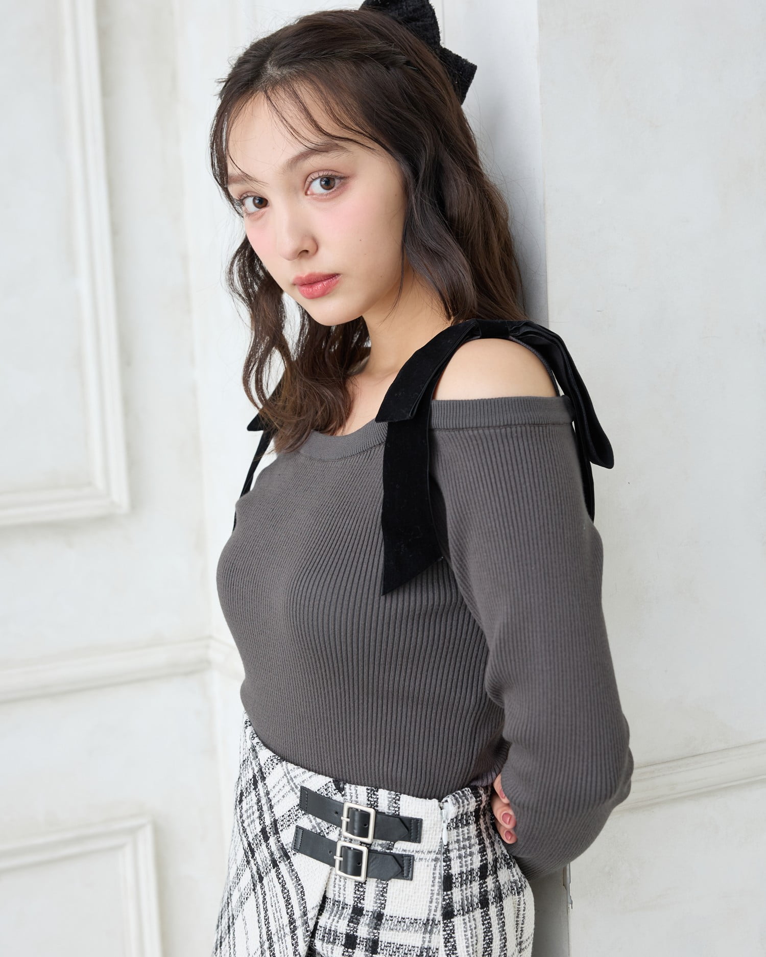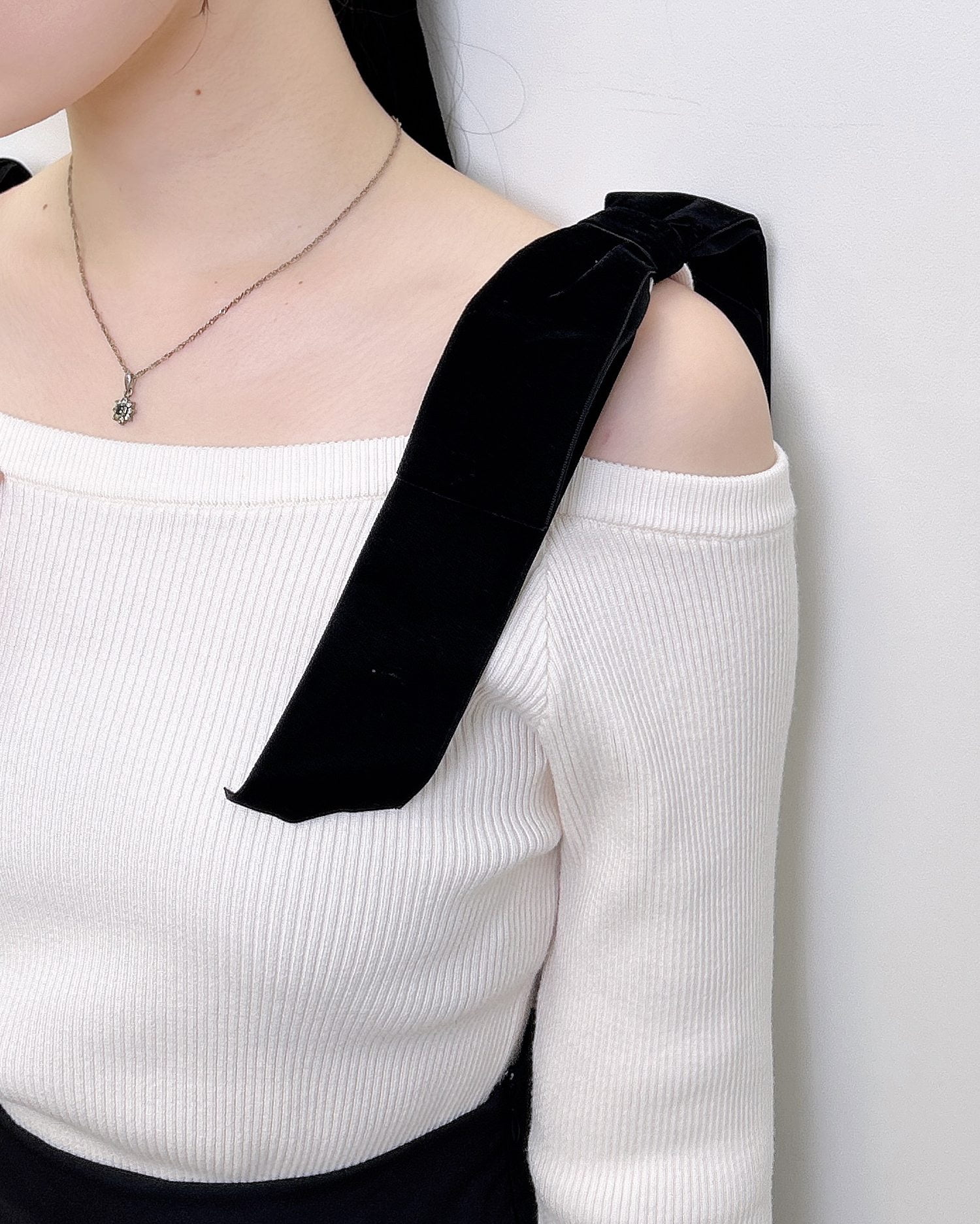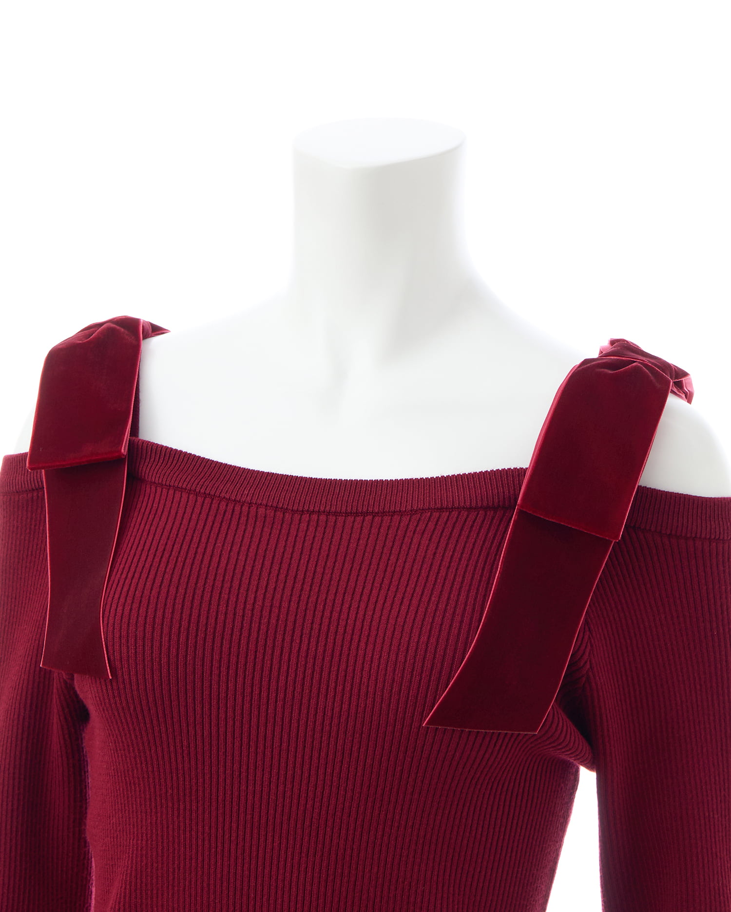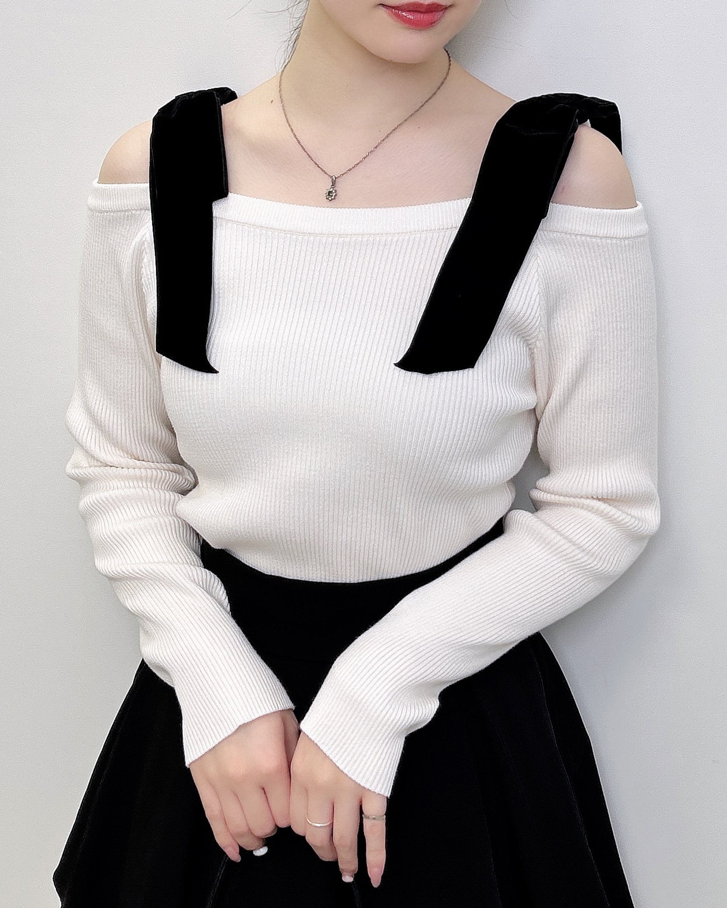 使いやすいオフショルニットに季節感のあるベロア素材のリボンがついた主役級ニットが登場!