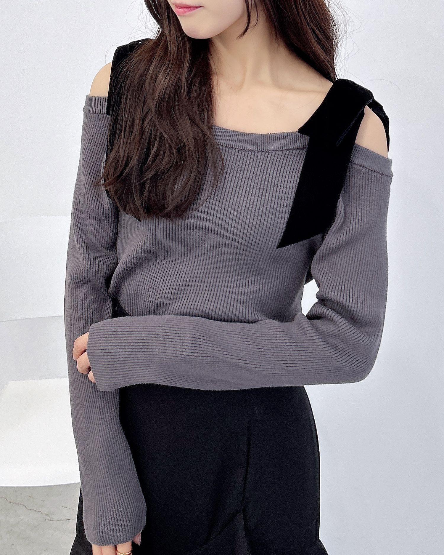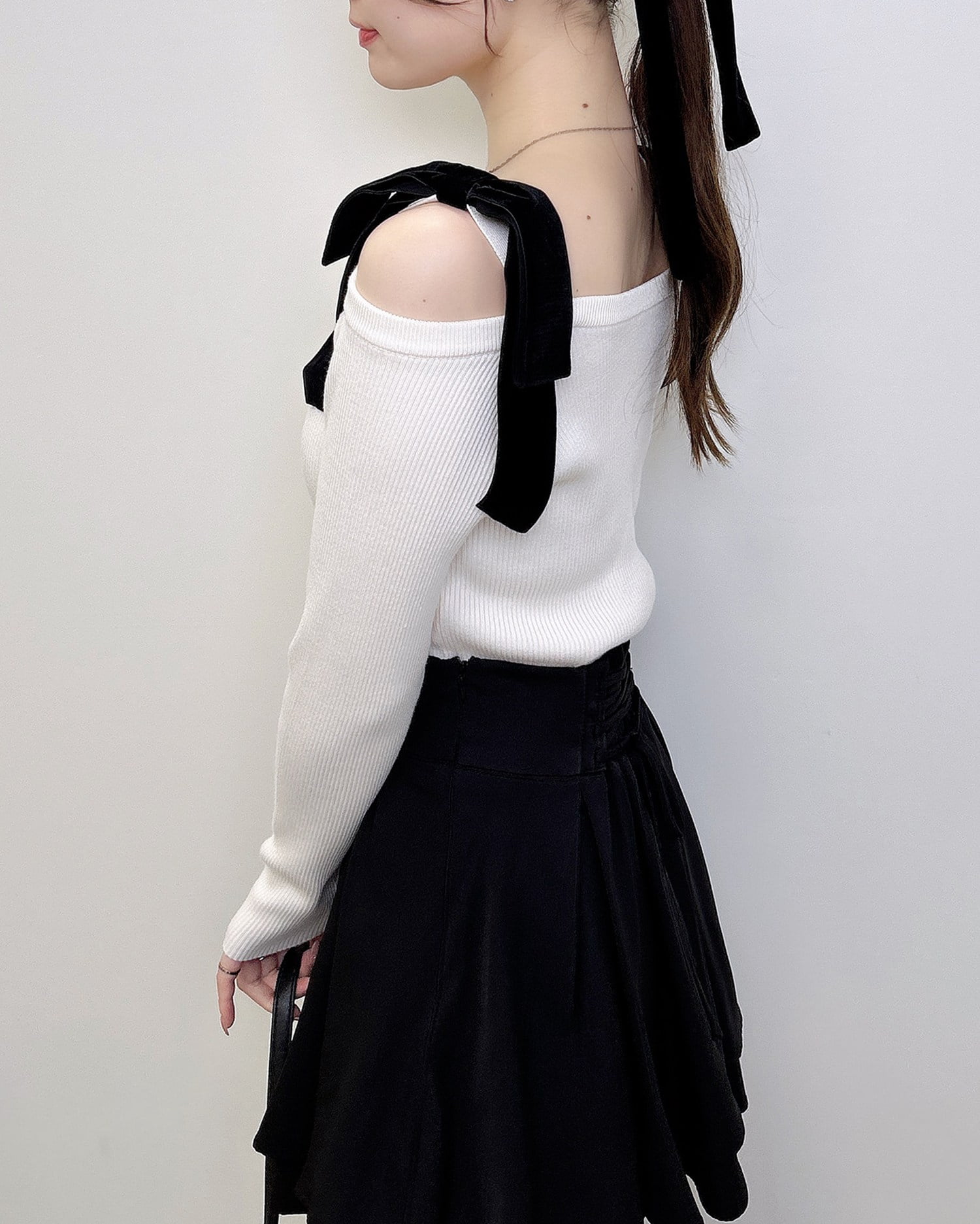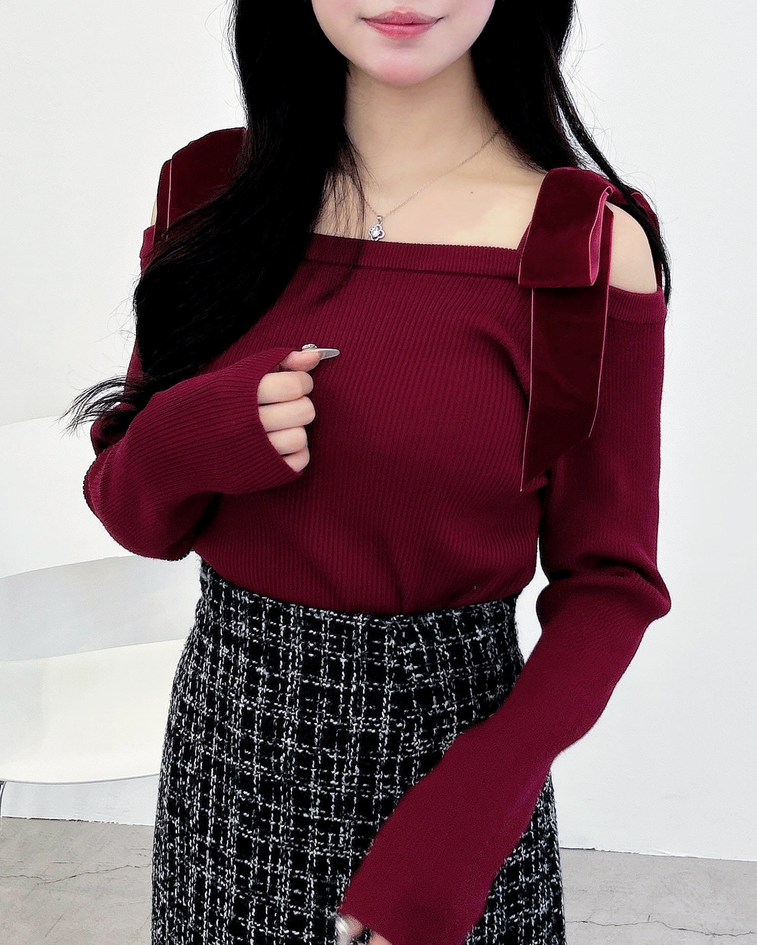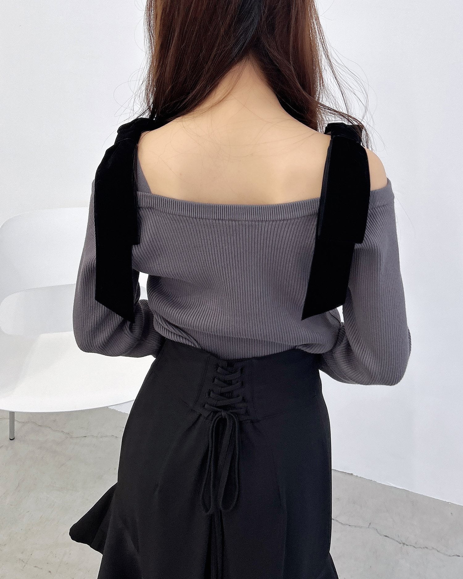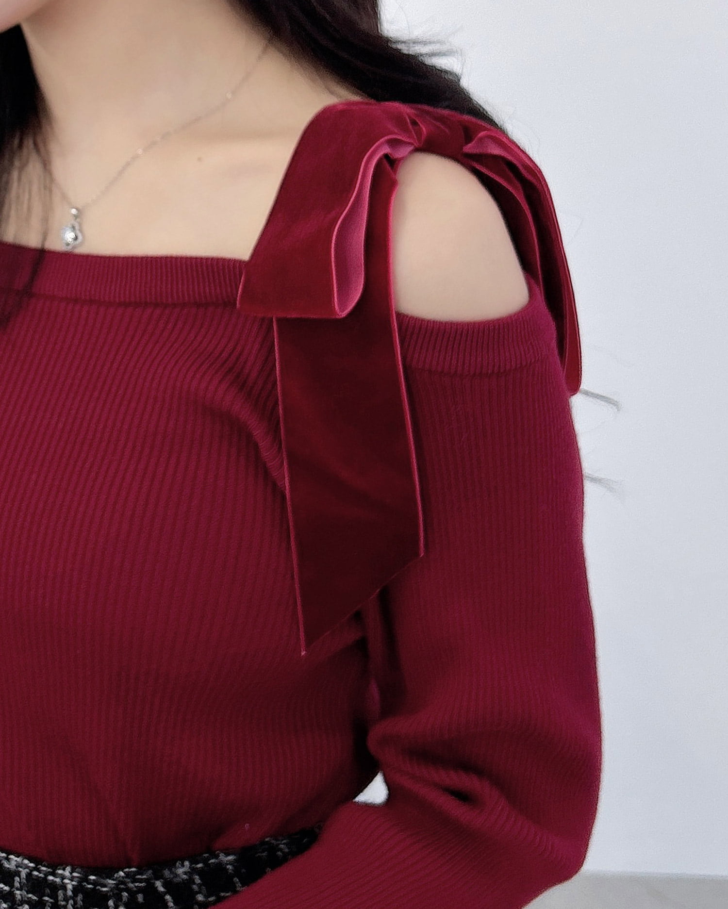 使いやすいオフショルニットに季節感のあるベロア素材のリボンがついた主役級ニットが登場!