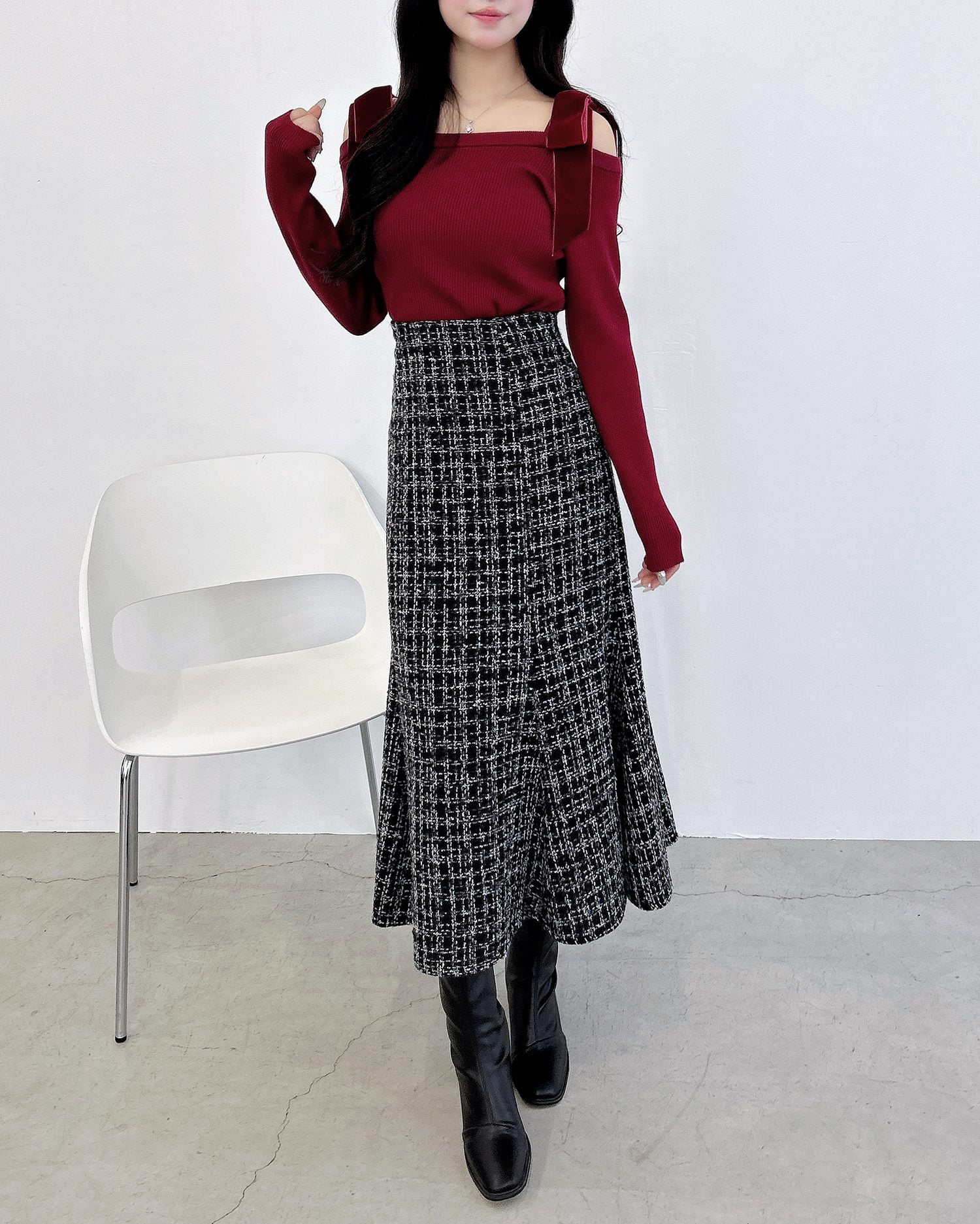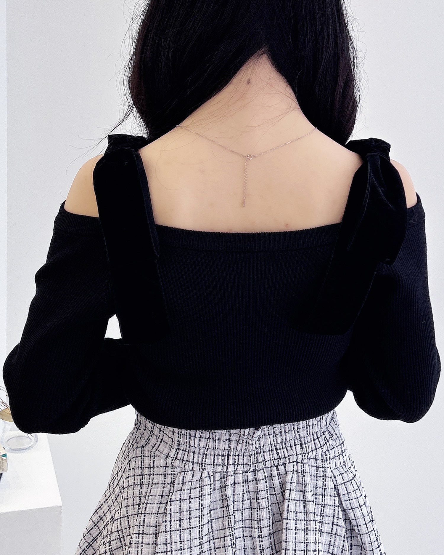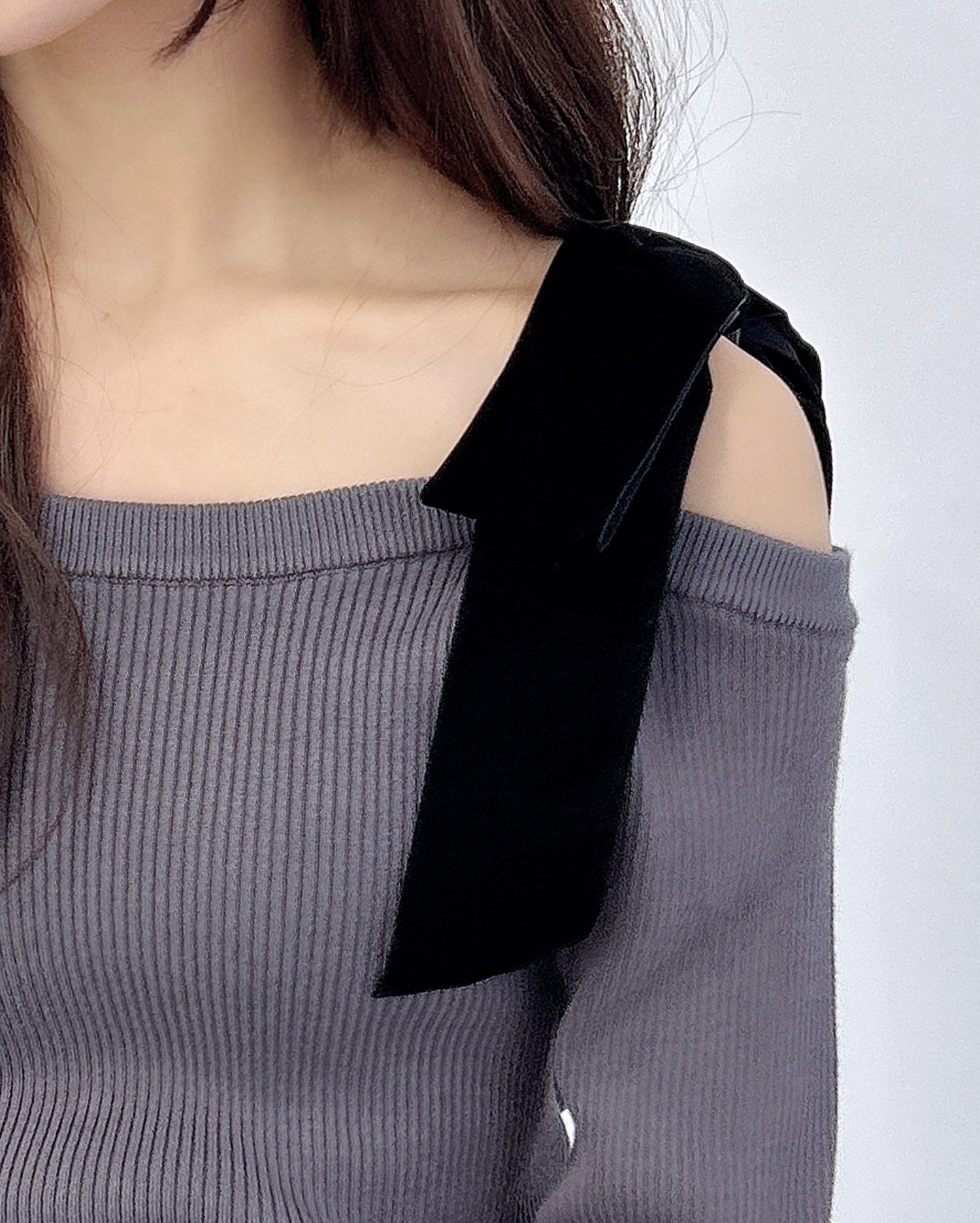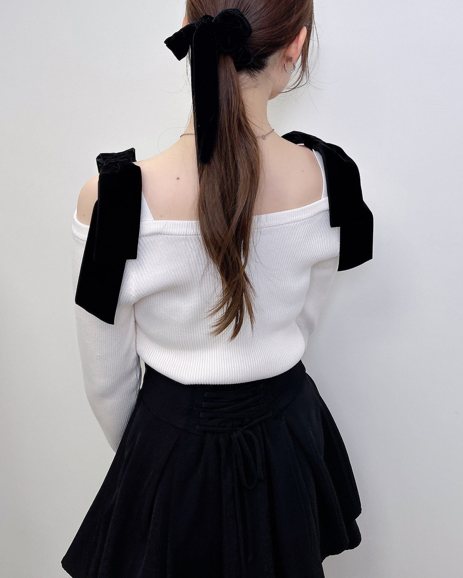 使いやすいオフショルニットに季節感のあるベロア素材のリボンがついた主役級ニットが登場!