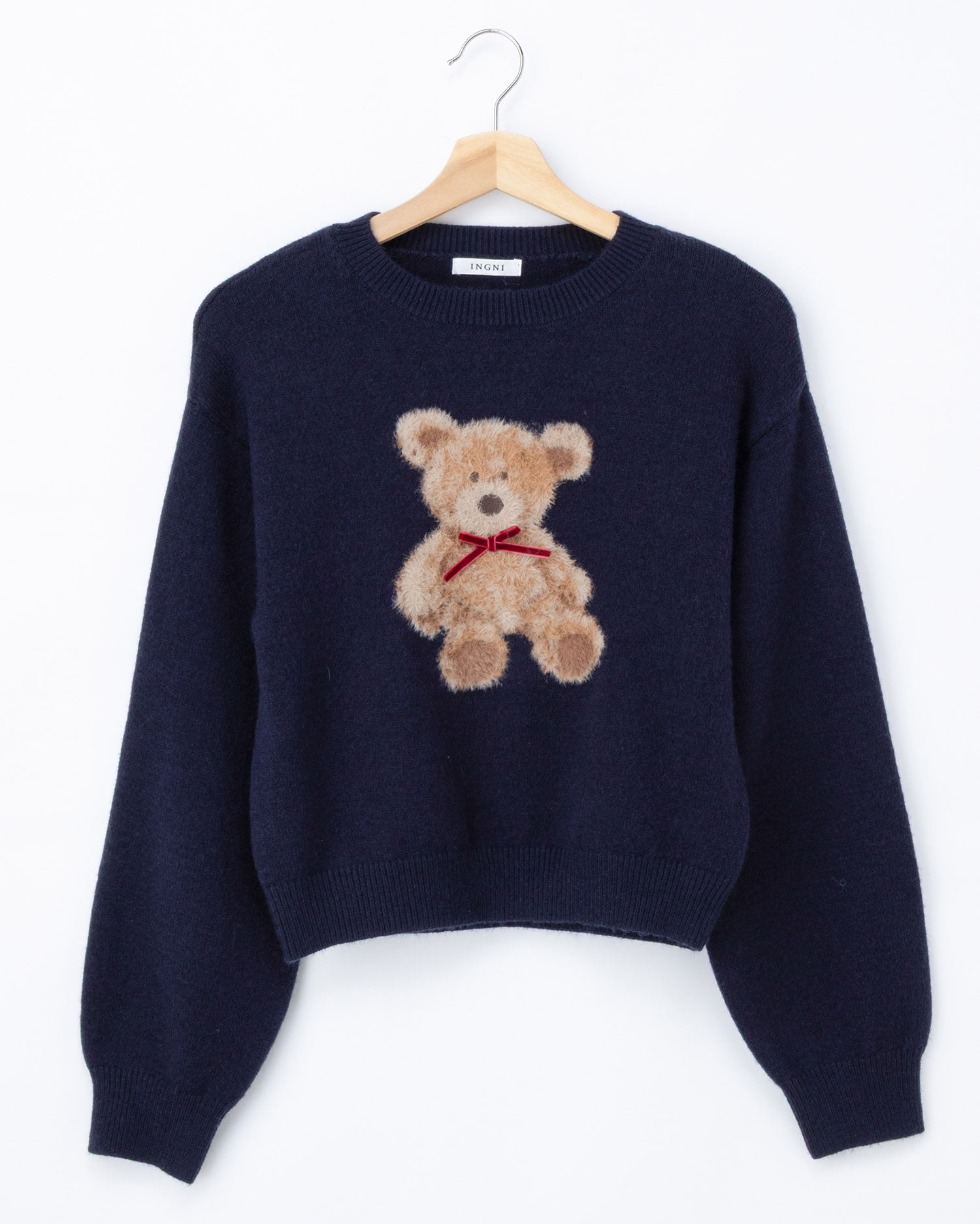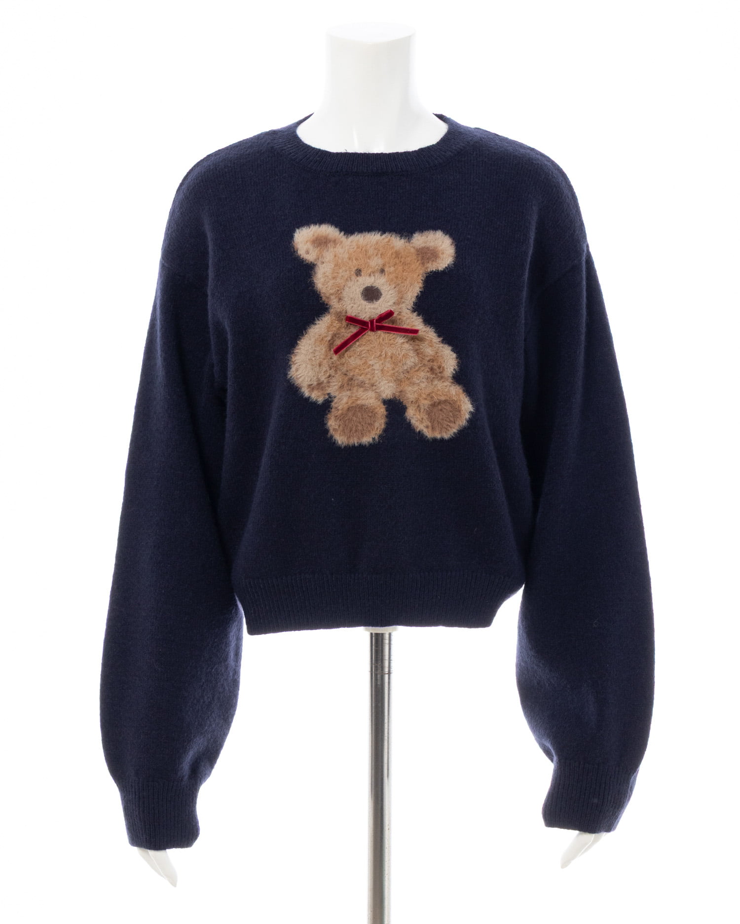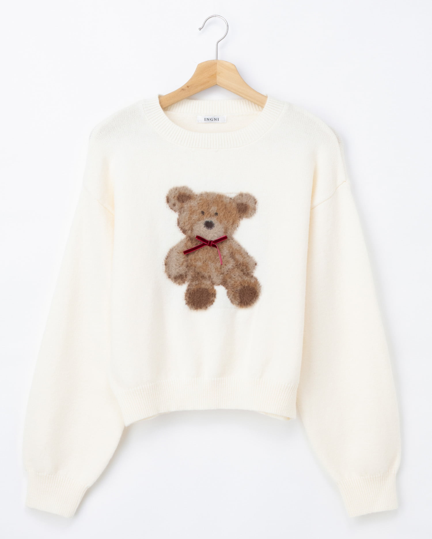毛足の長いフェザー素材で立体的に仕立てたキュートなくまが印象的なアイテムです。