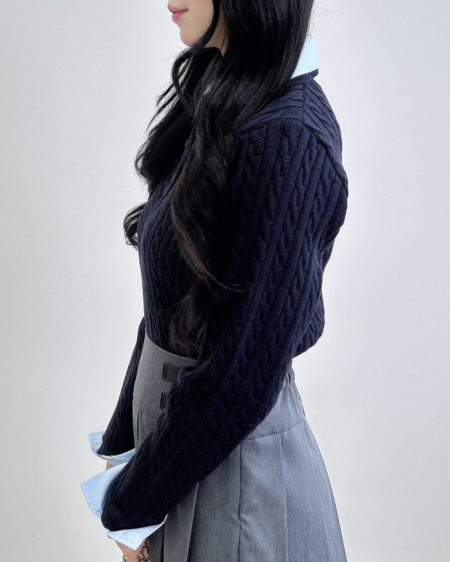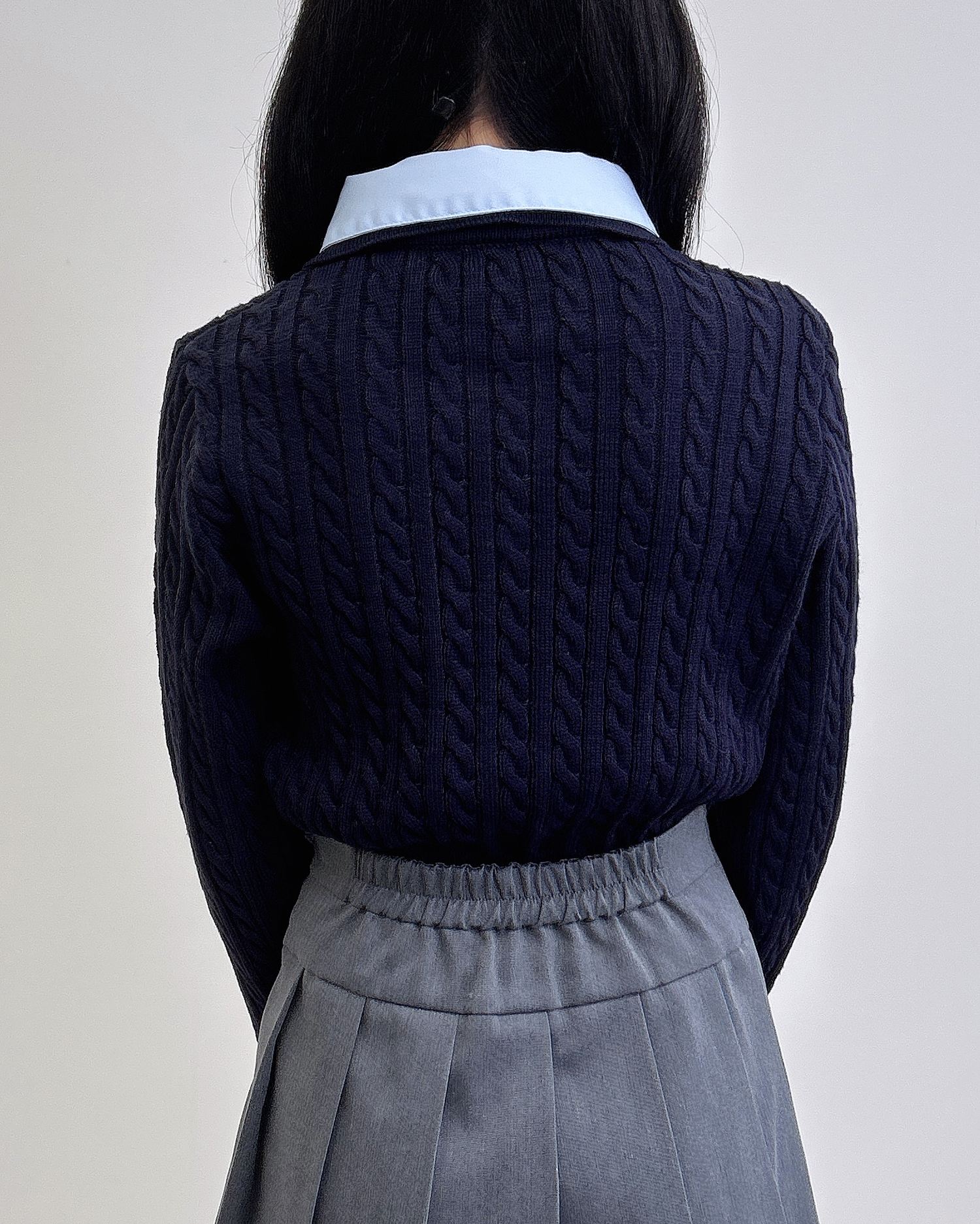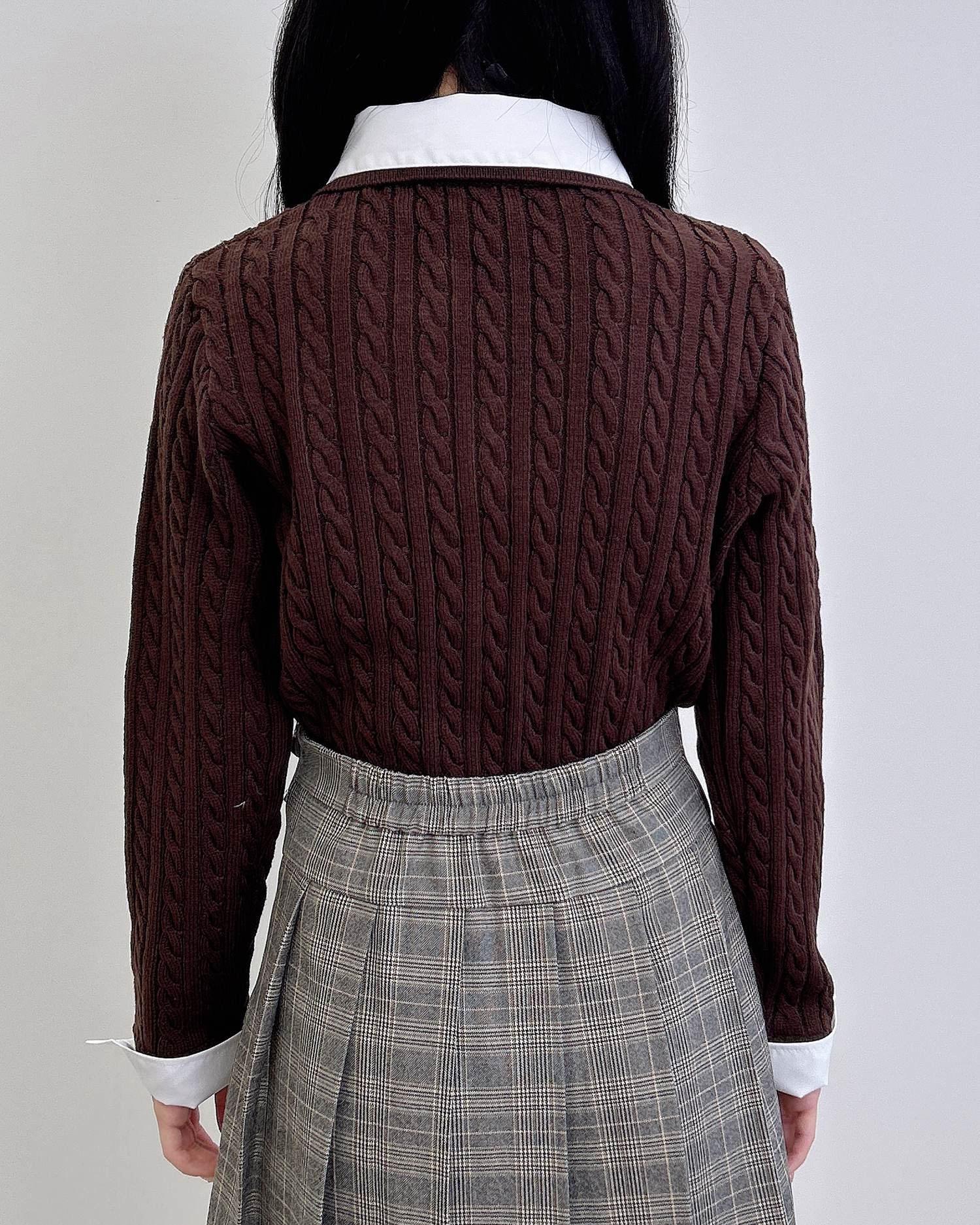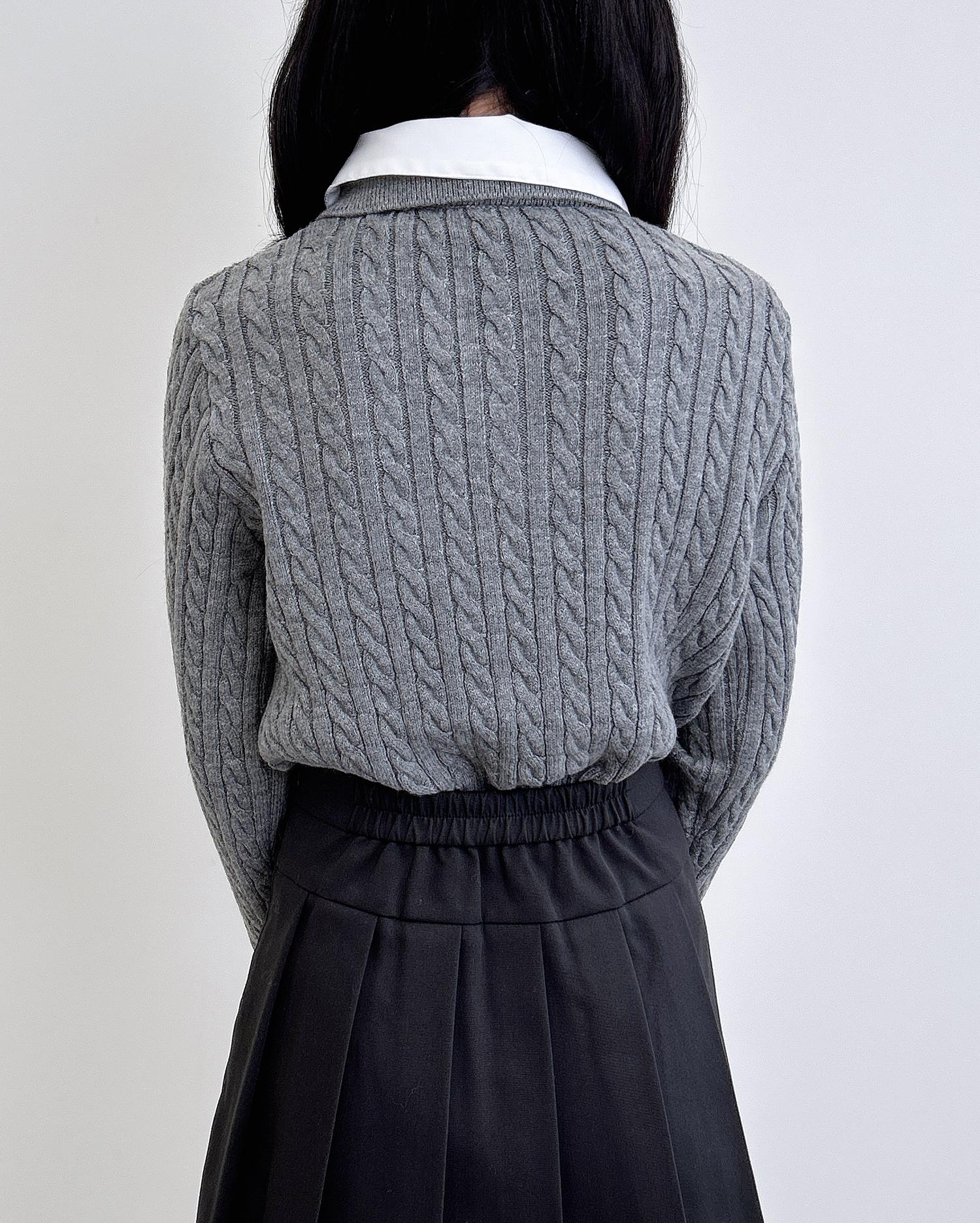 さらっとしたシャツとケーブルニットのレイヤードアイテム。