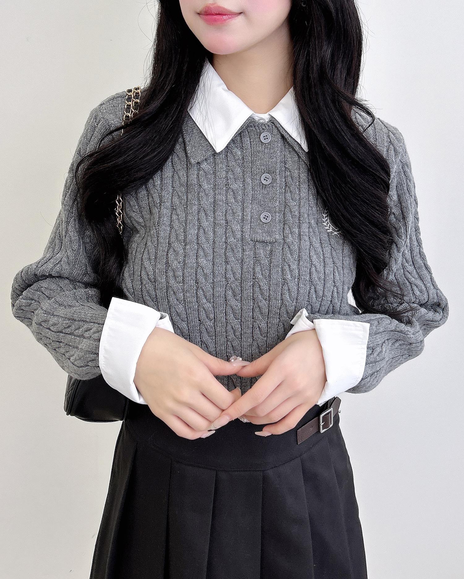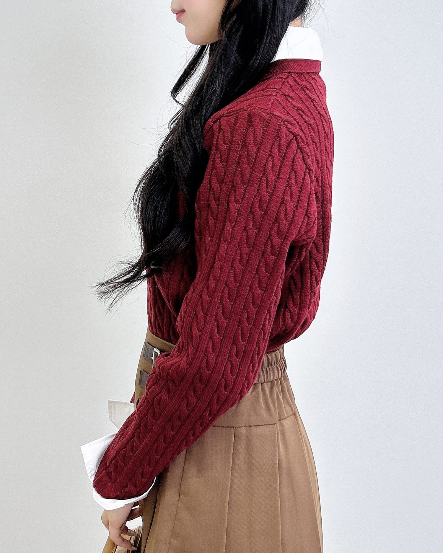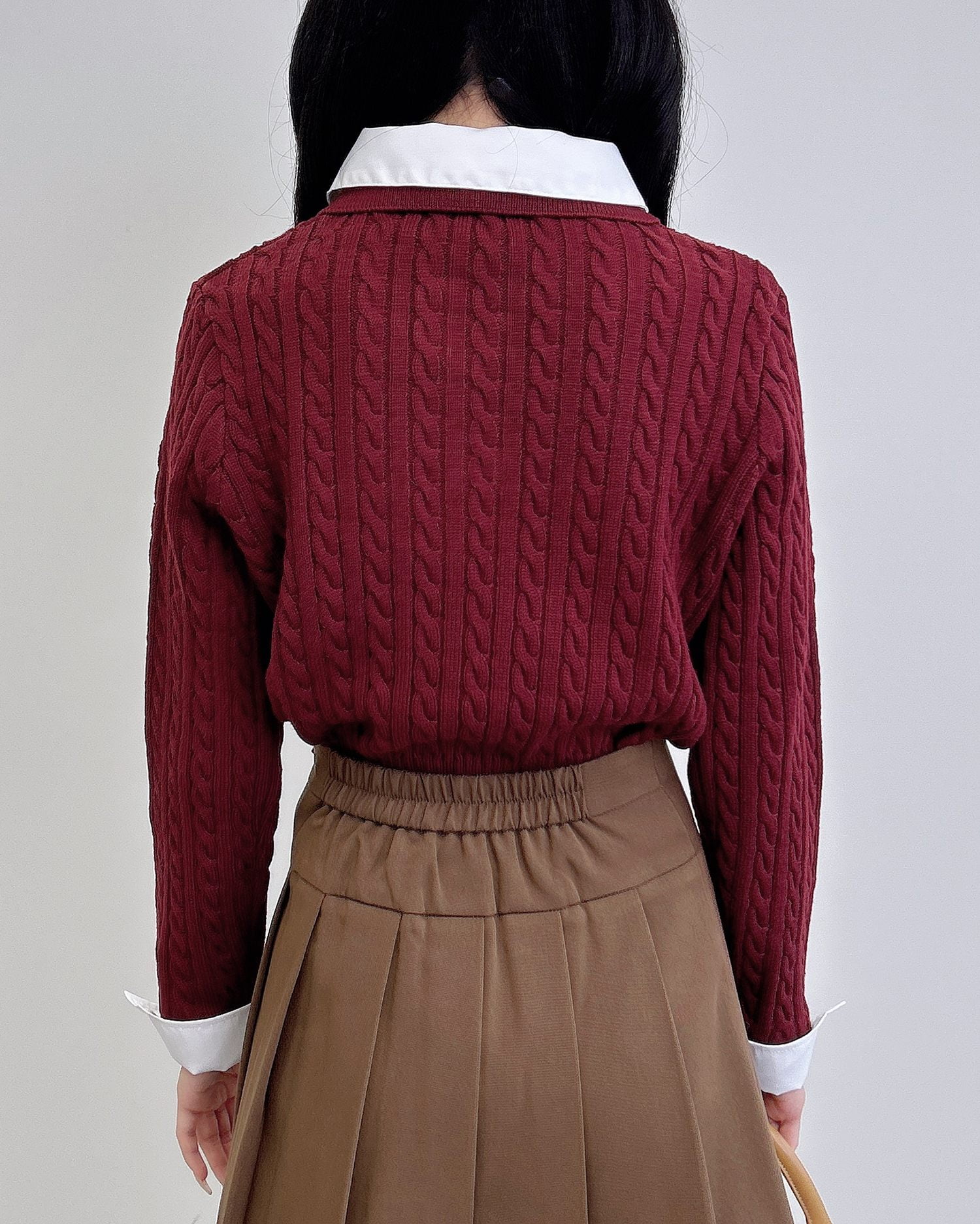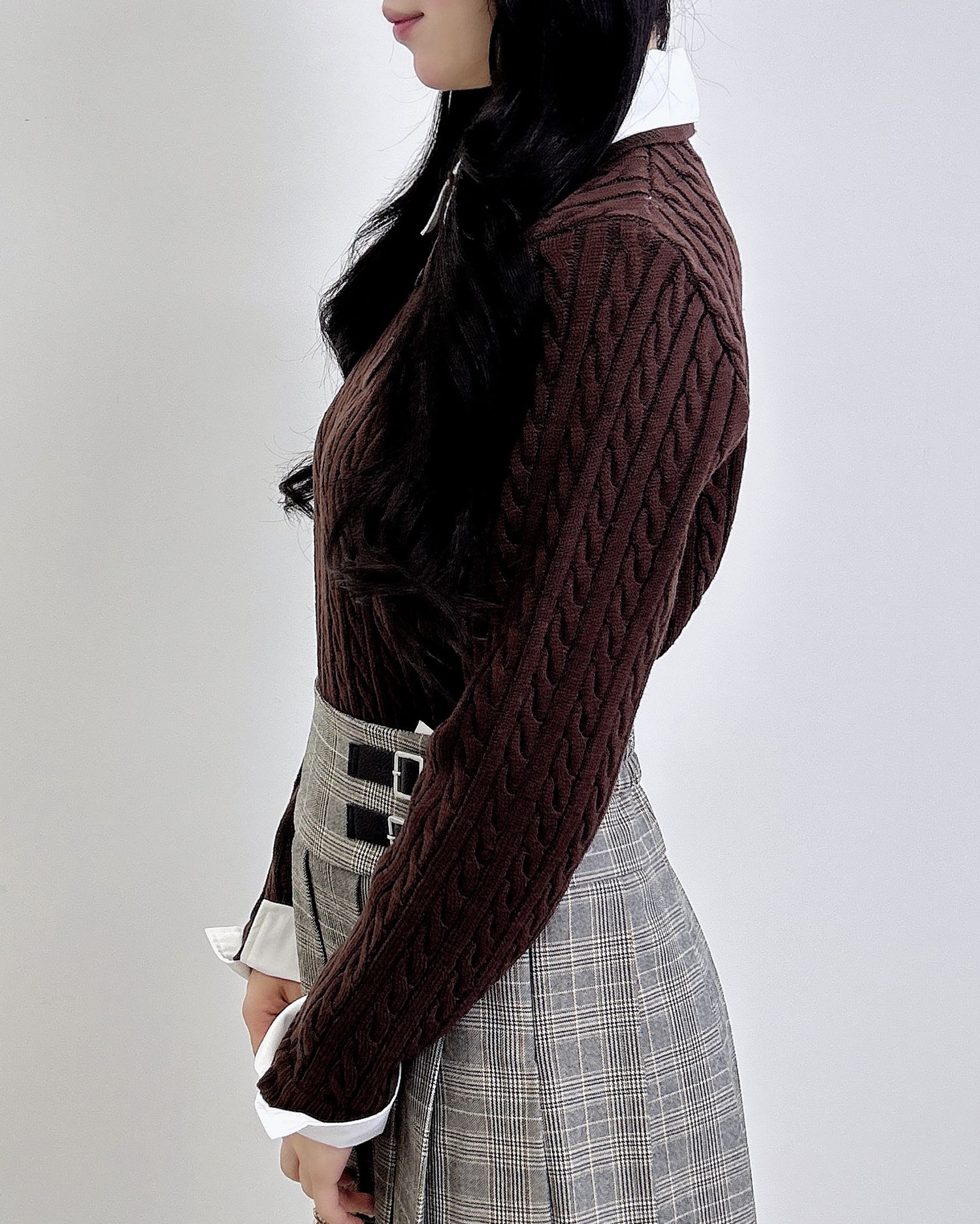 さらっとしたシャツとケーブルニットのレイヤードアイテム。
