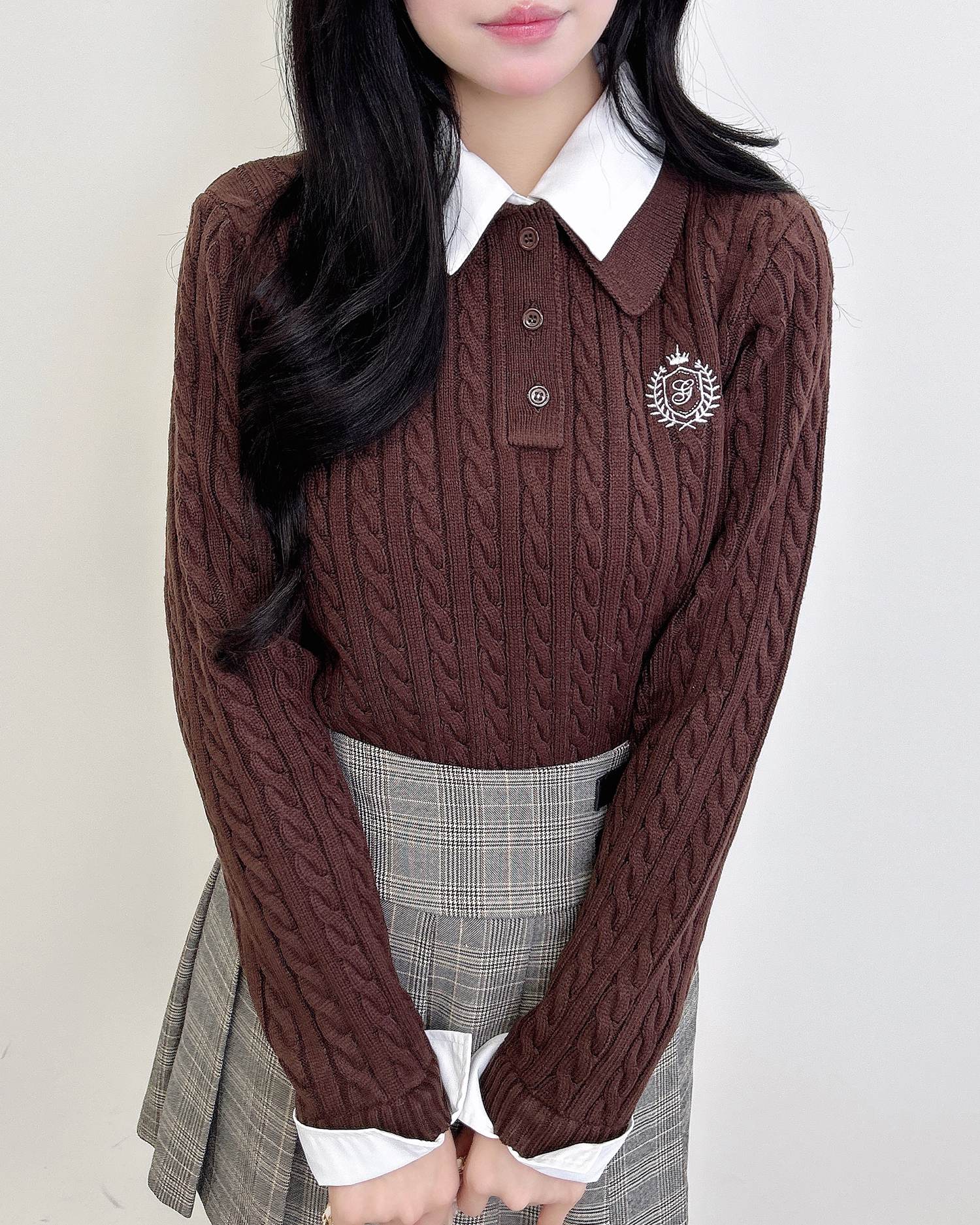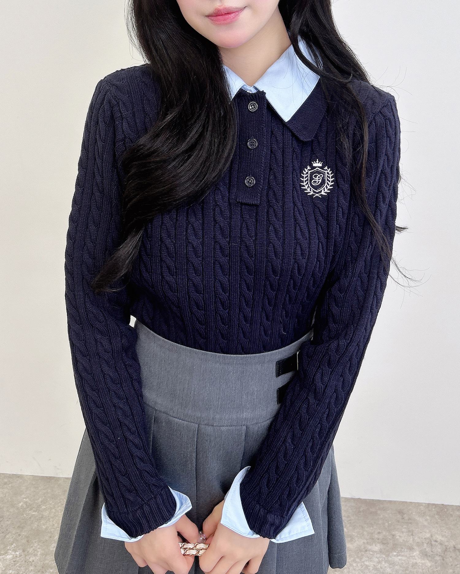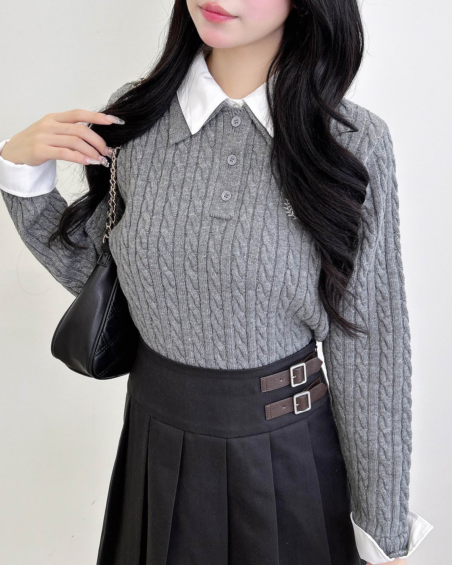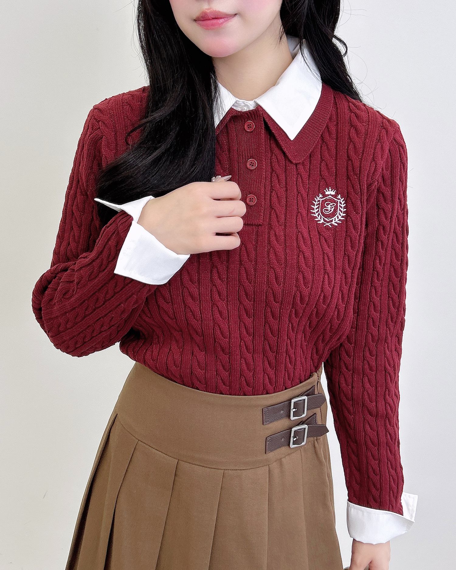 さらっとしたシャツとケーブルニットのレイヤードアイテム。