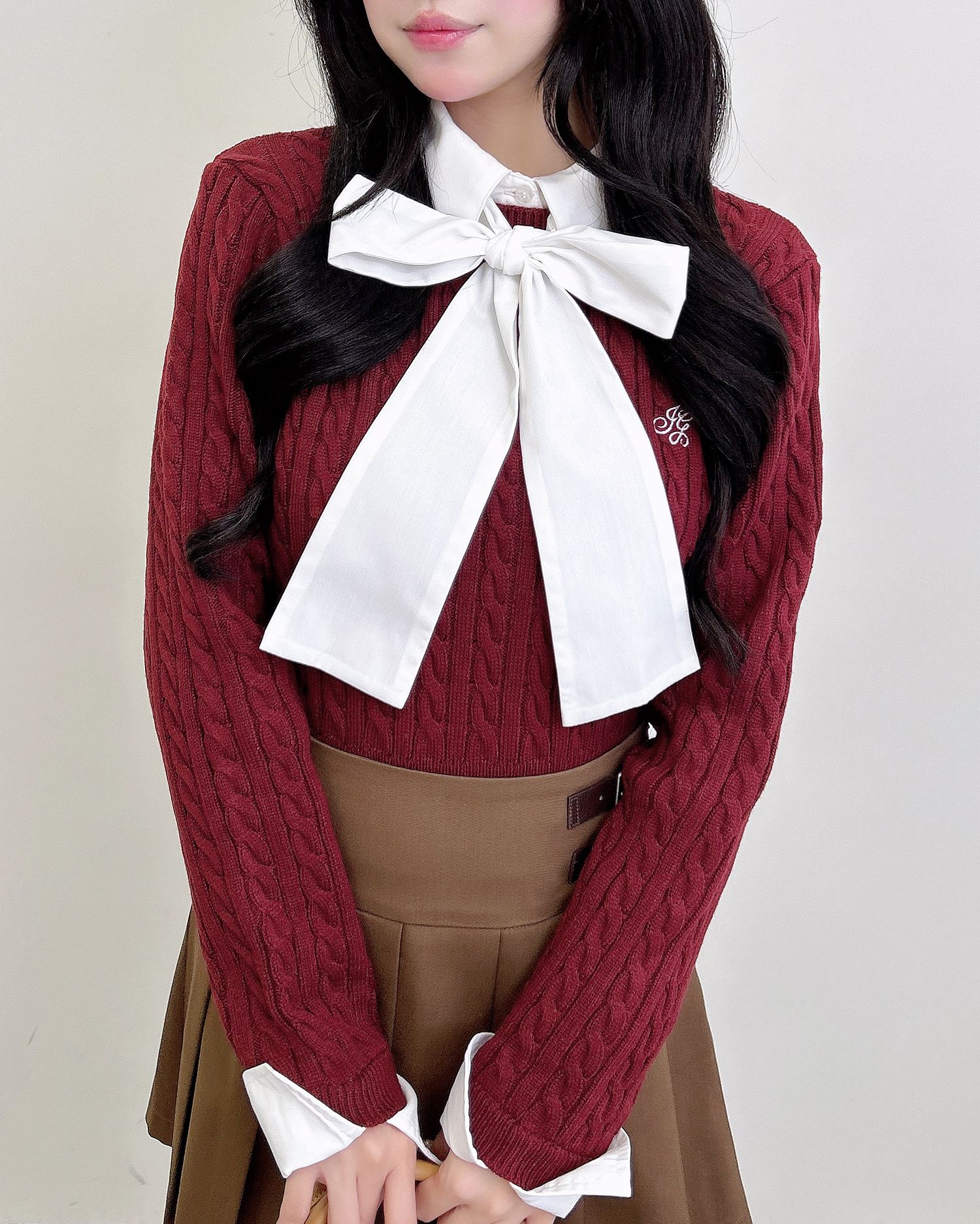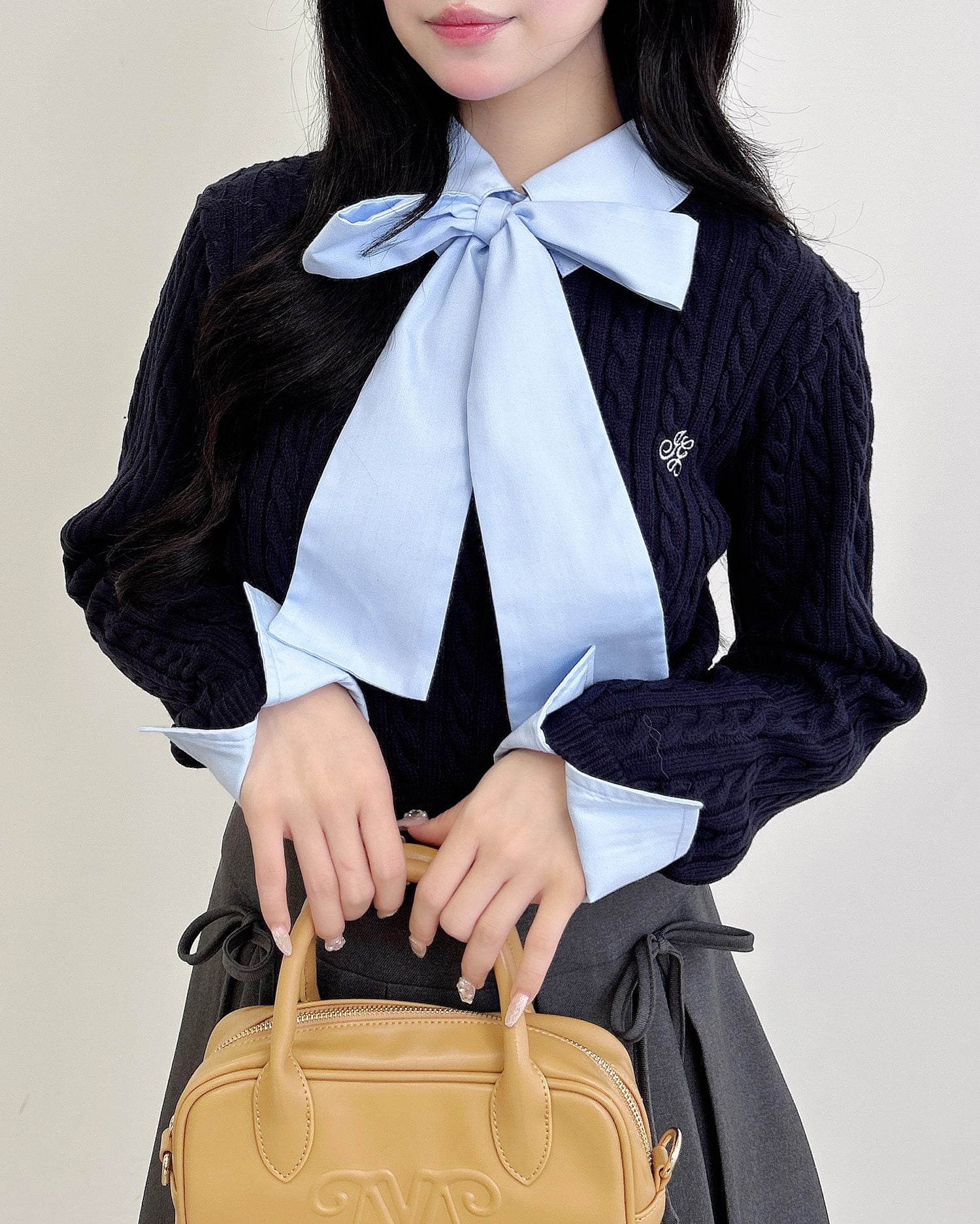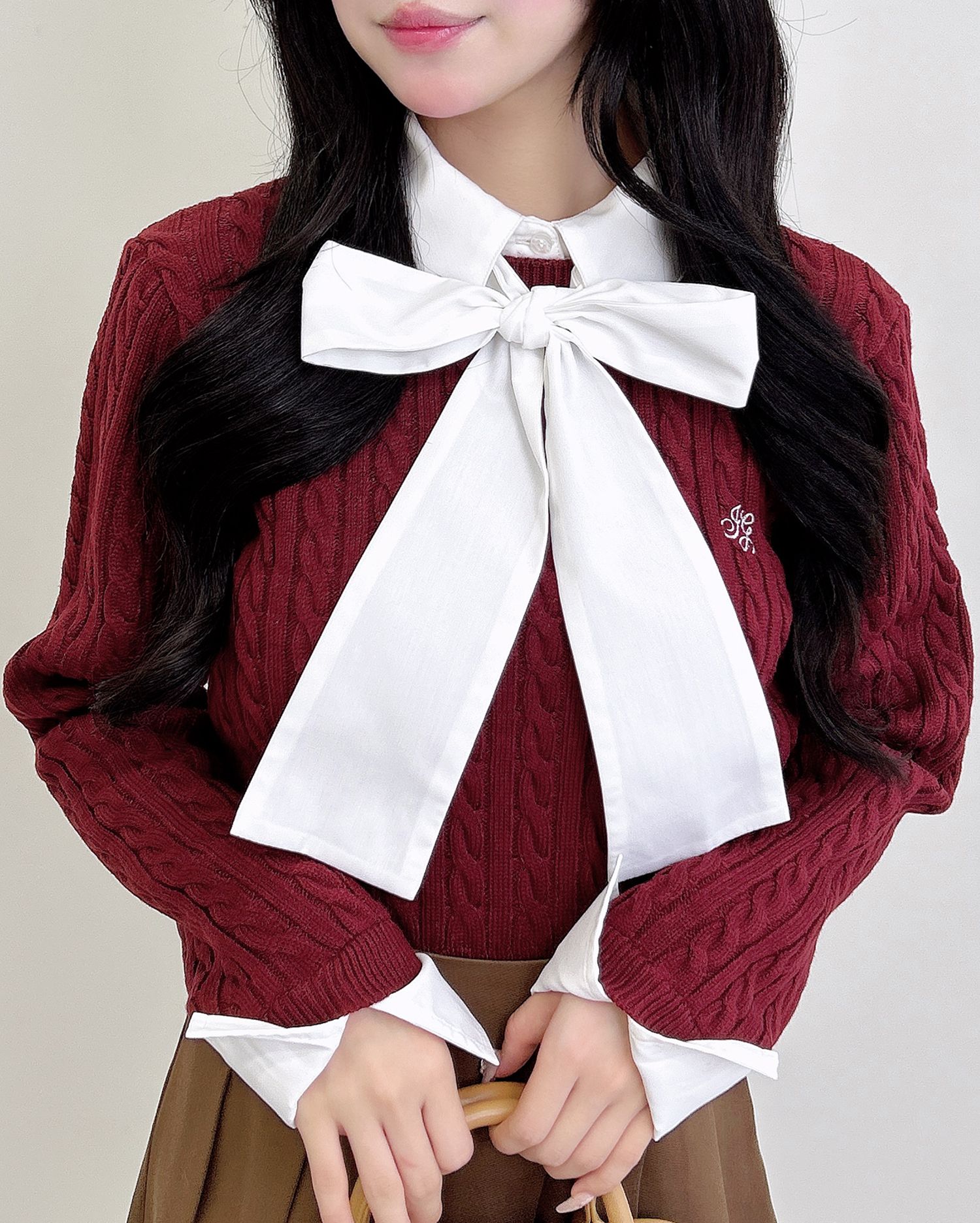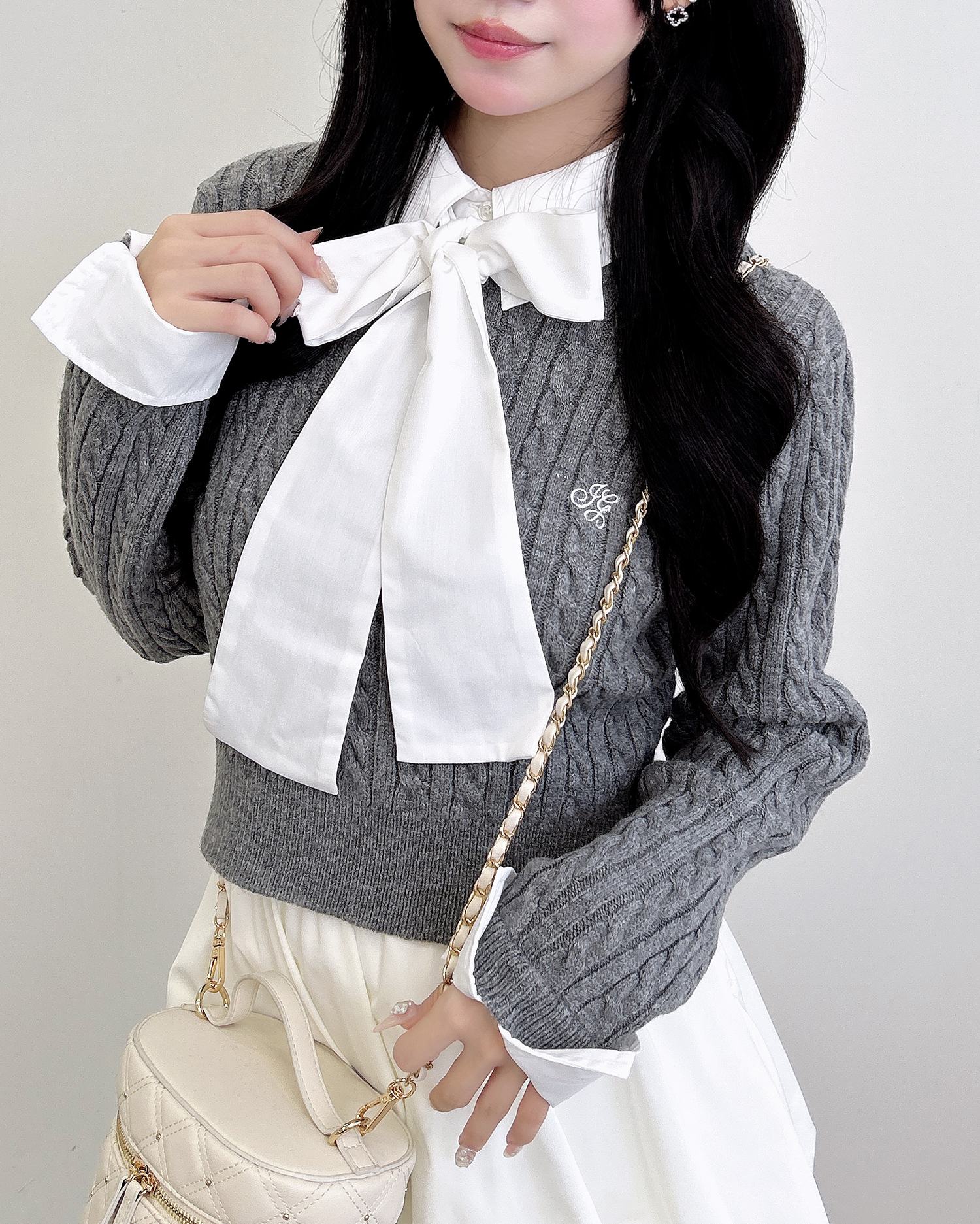 【存在感のあるボウタイリボンがかわいい!トレンドのレイヤード風ニット】