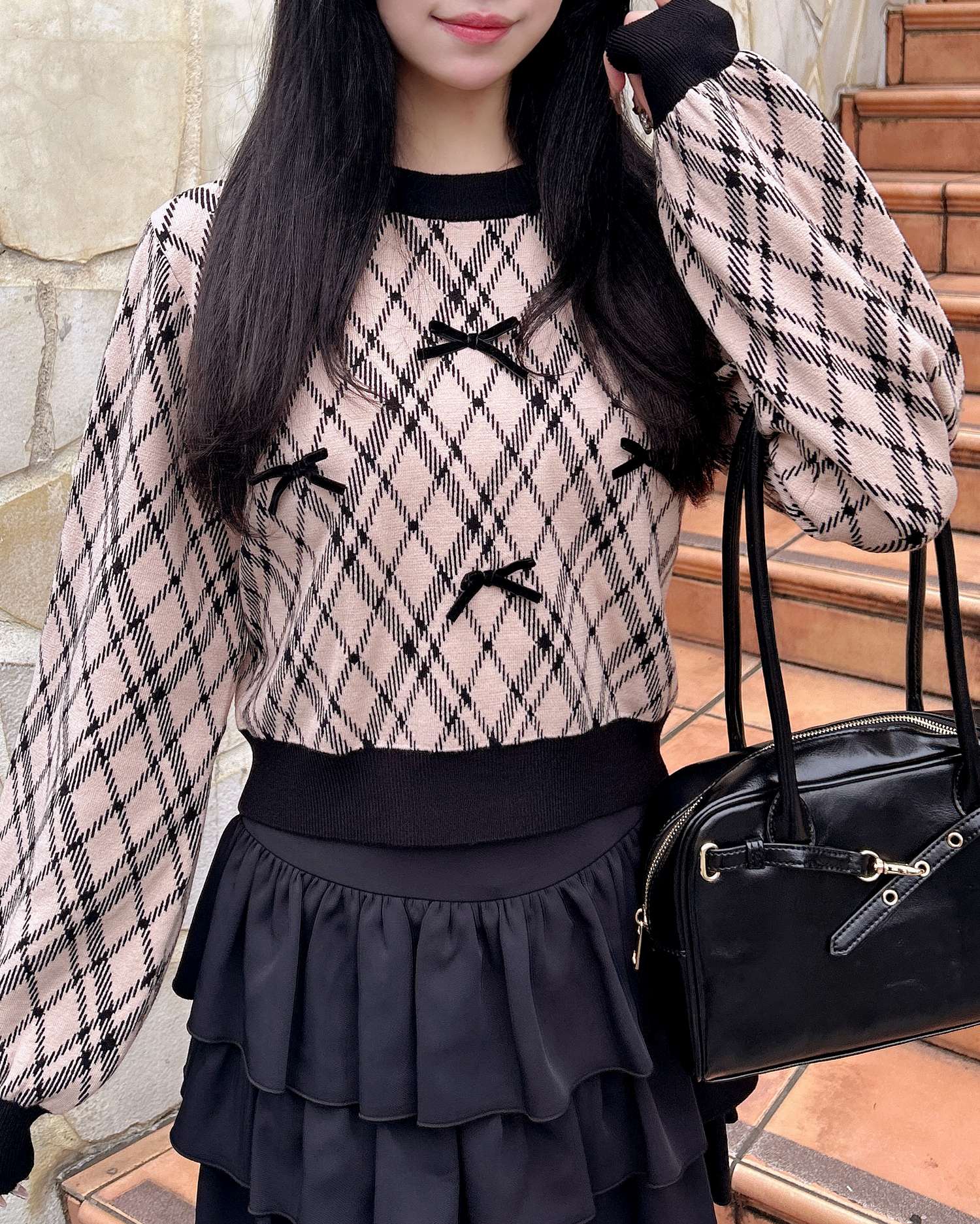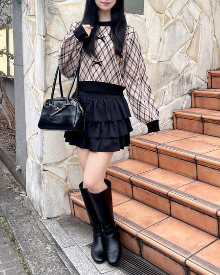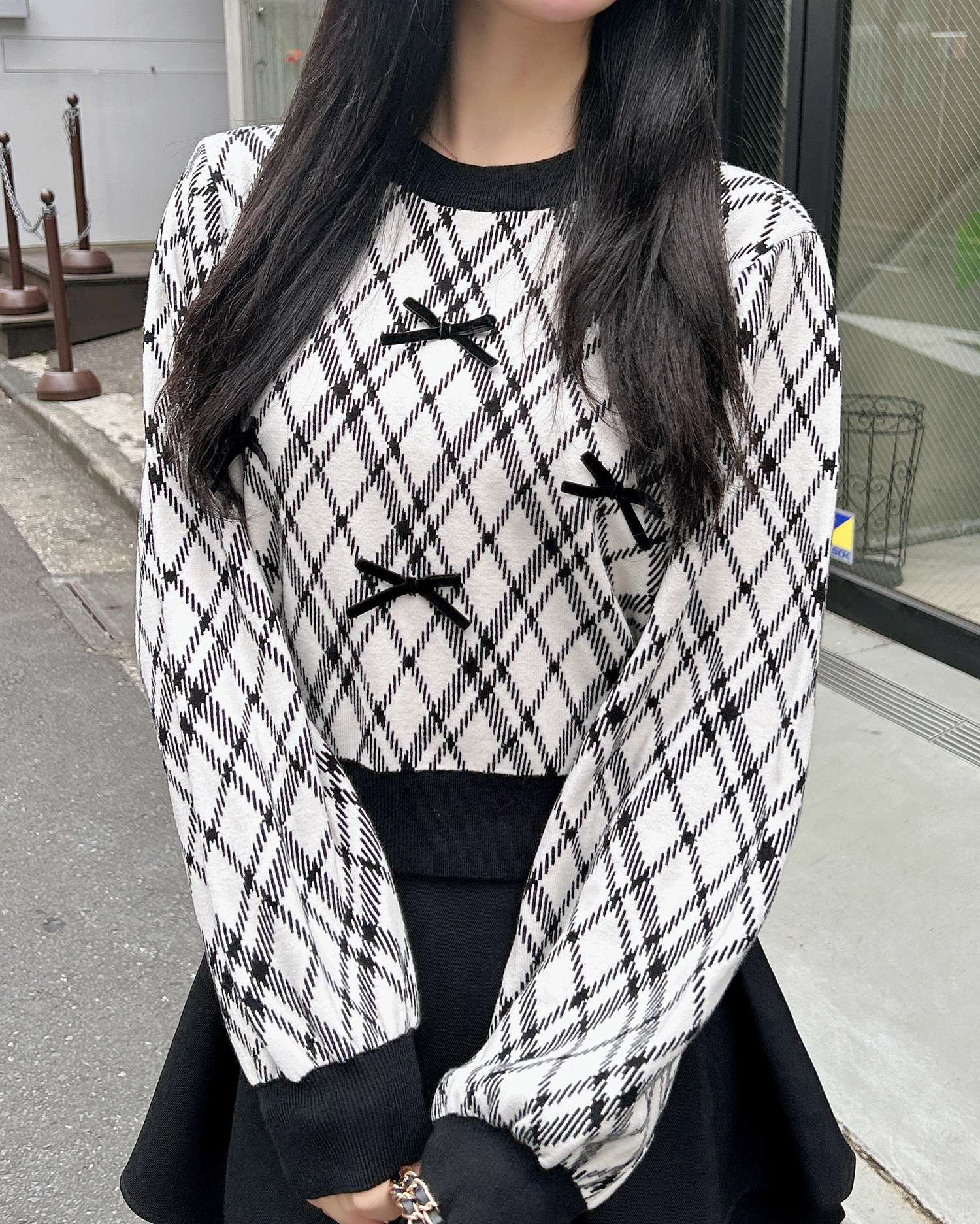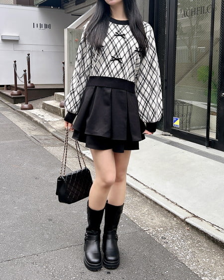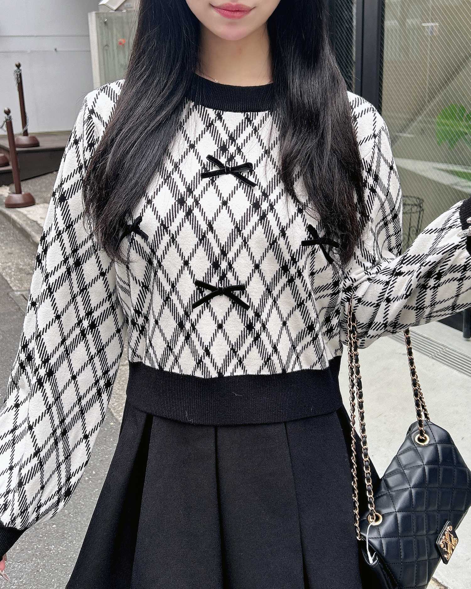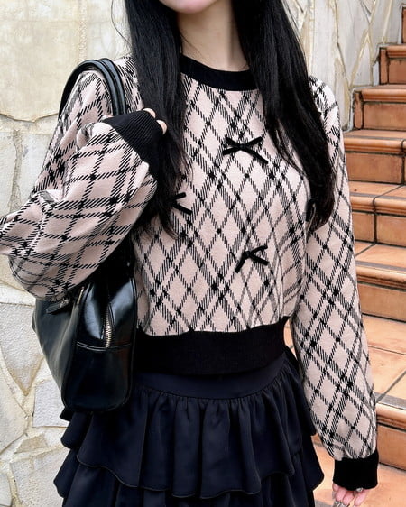 チェック柄のニットにリボンをあしらった写真映え間違いなしのアイテムです。