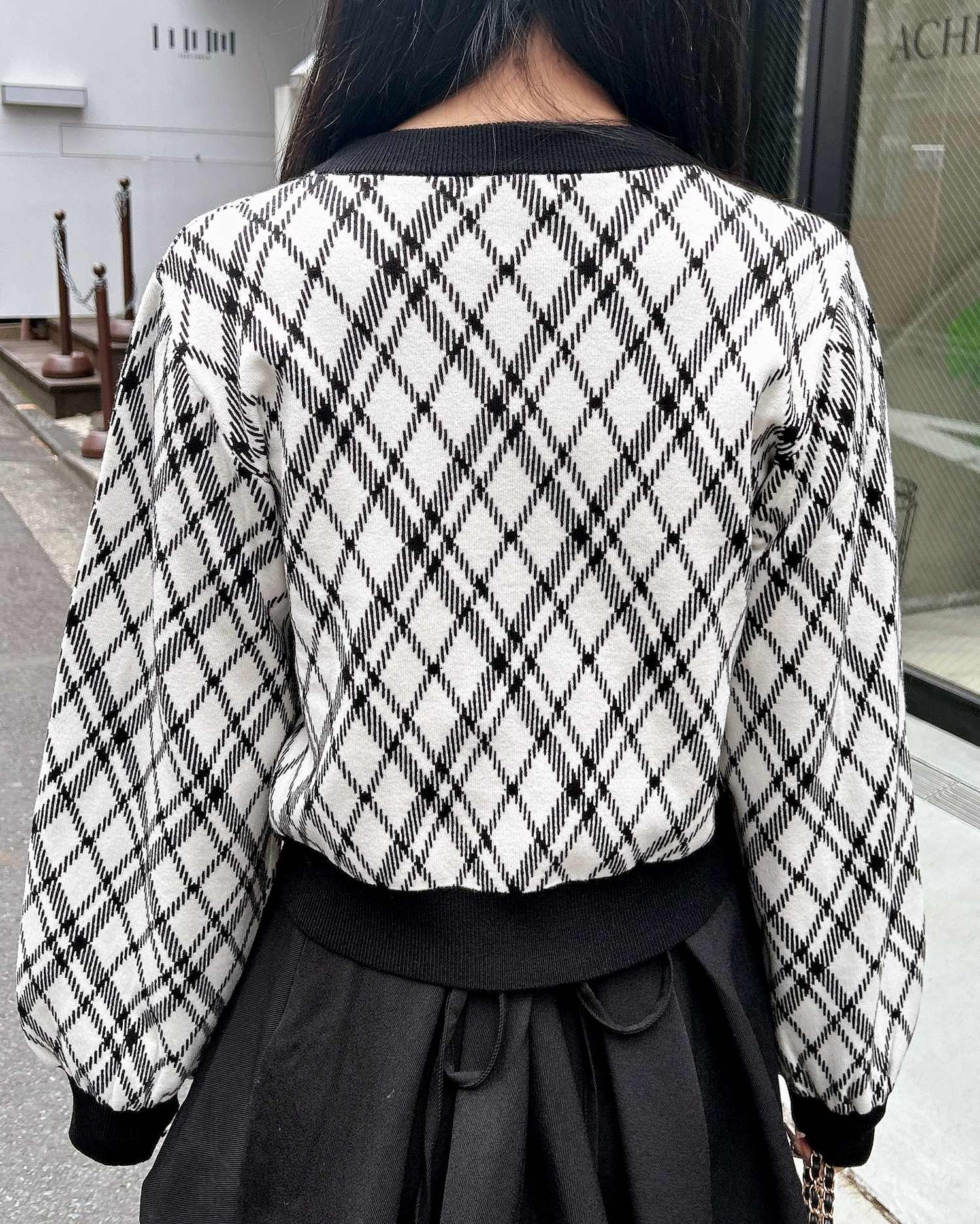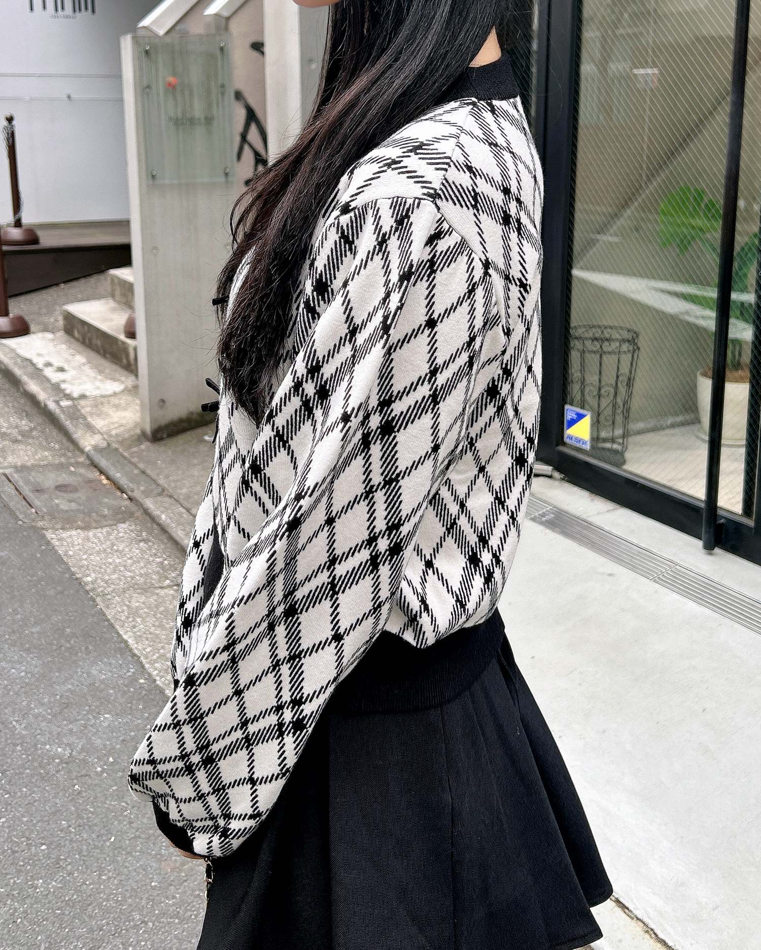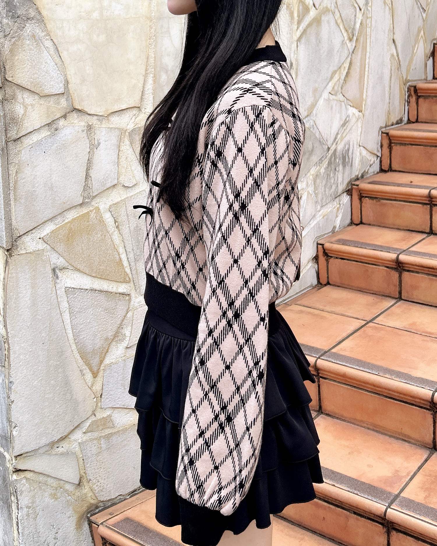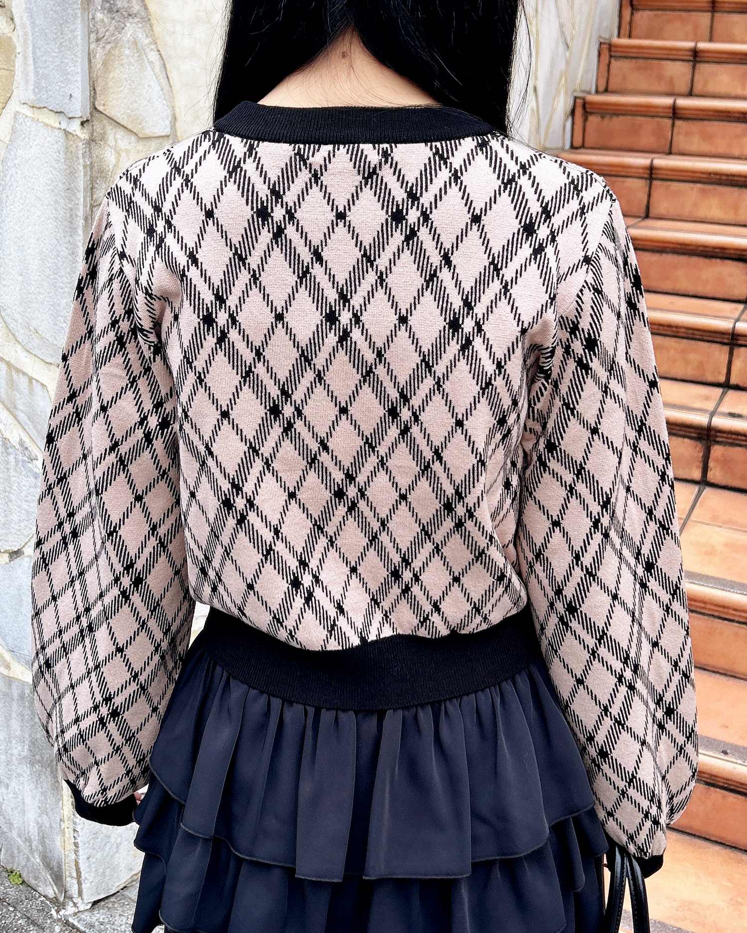 チェック柄のニットにリボンをあしらった写真映え間違いなしのアイテムです。
