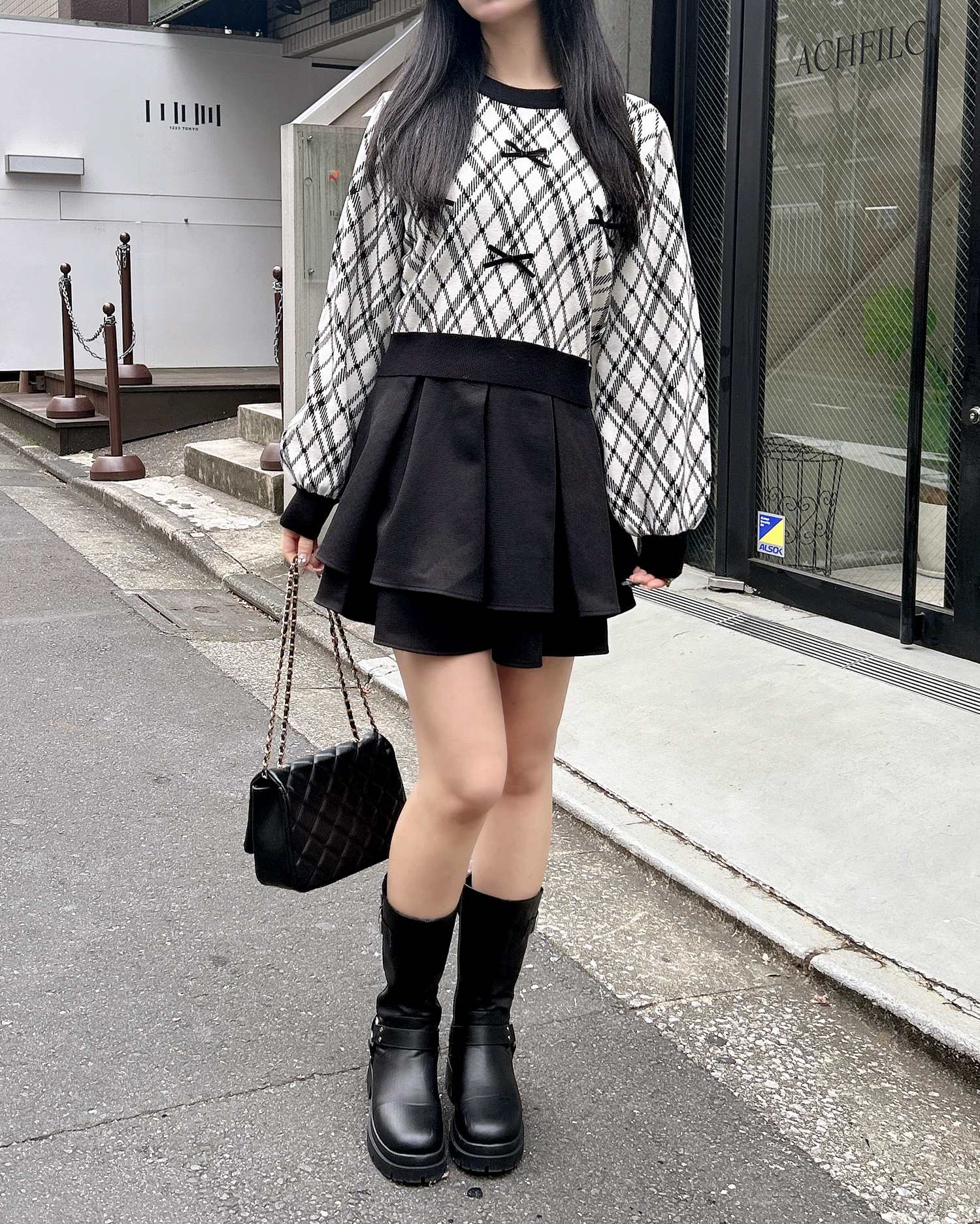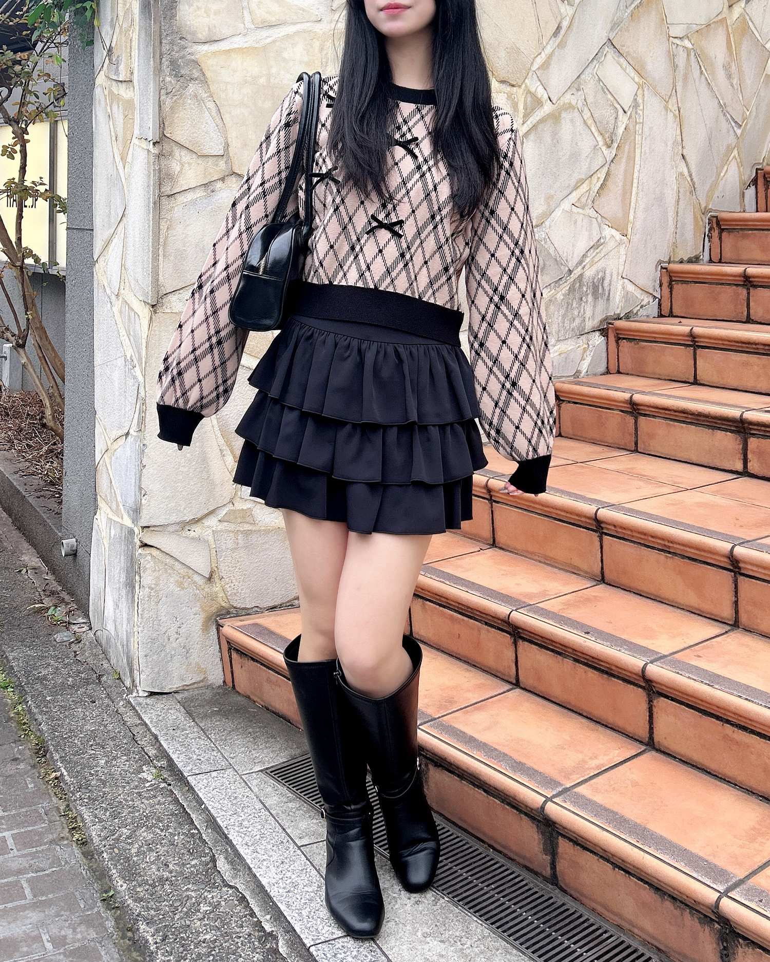 ミニスカートとロングブーツを合わせてガーリーコーデに!