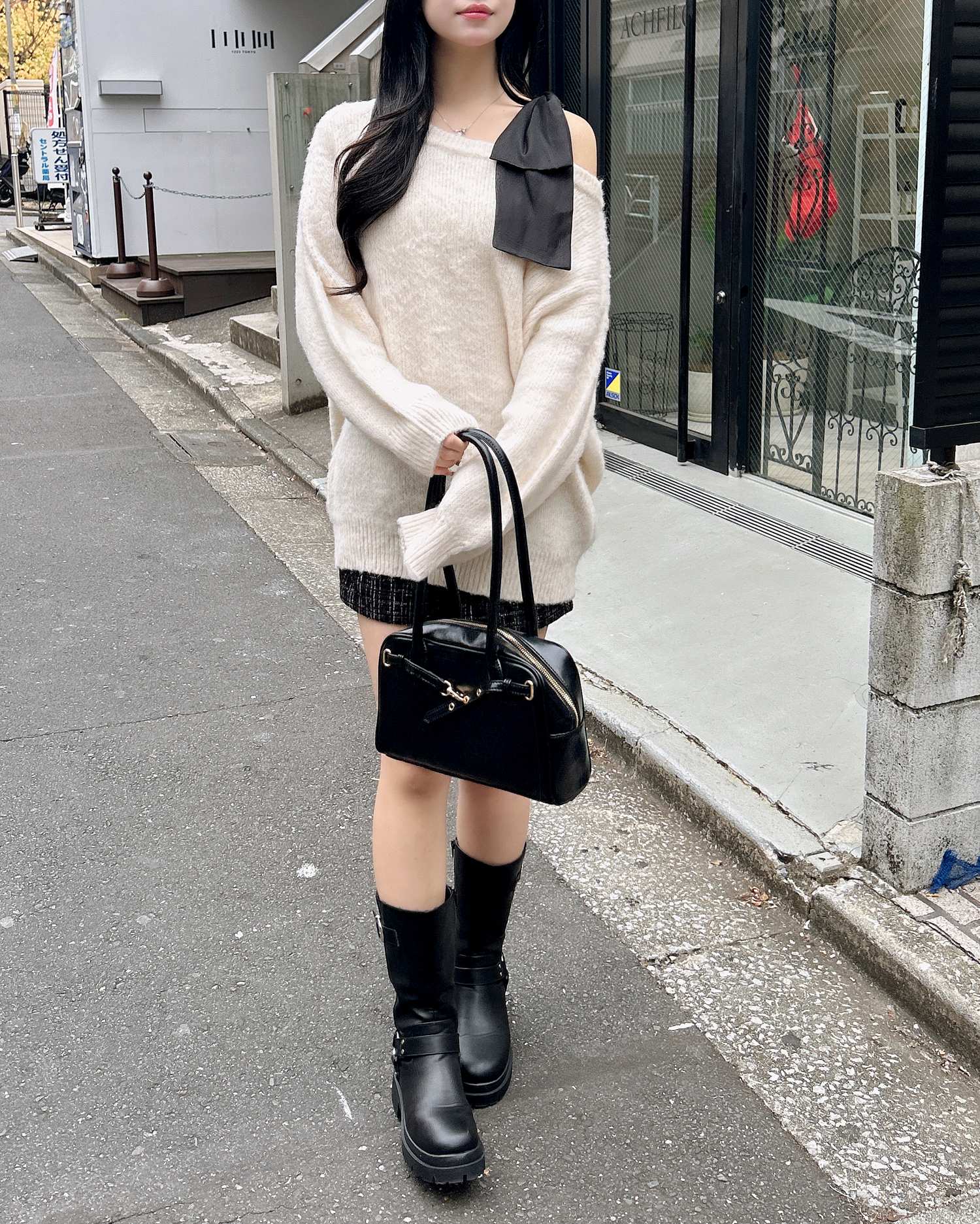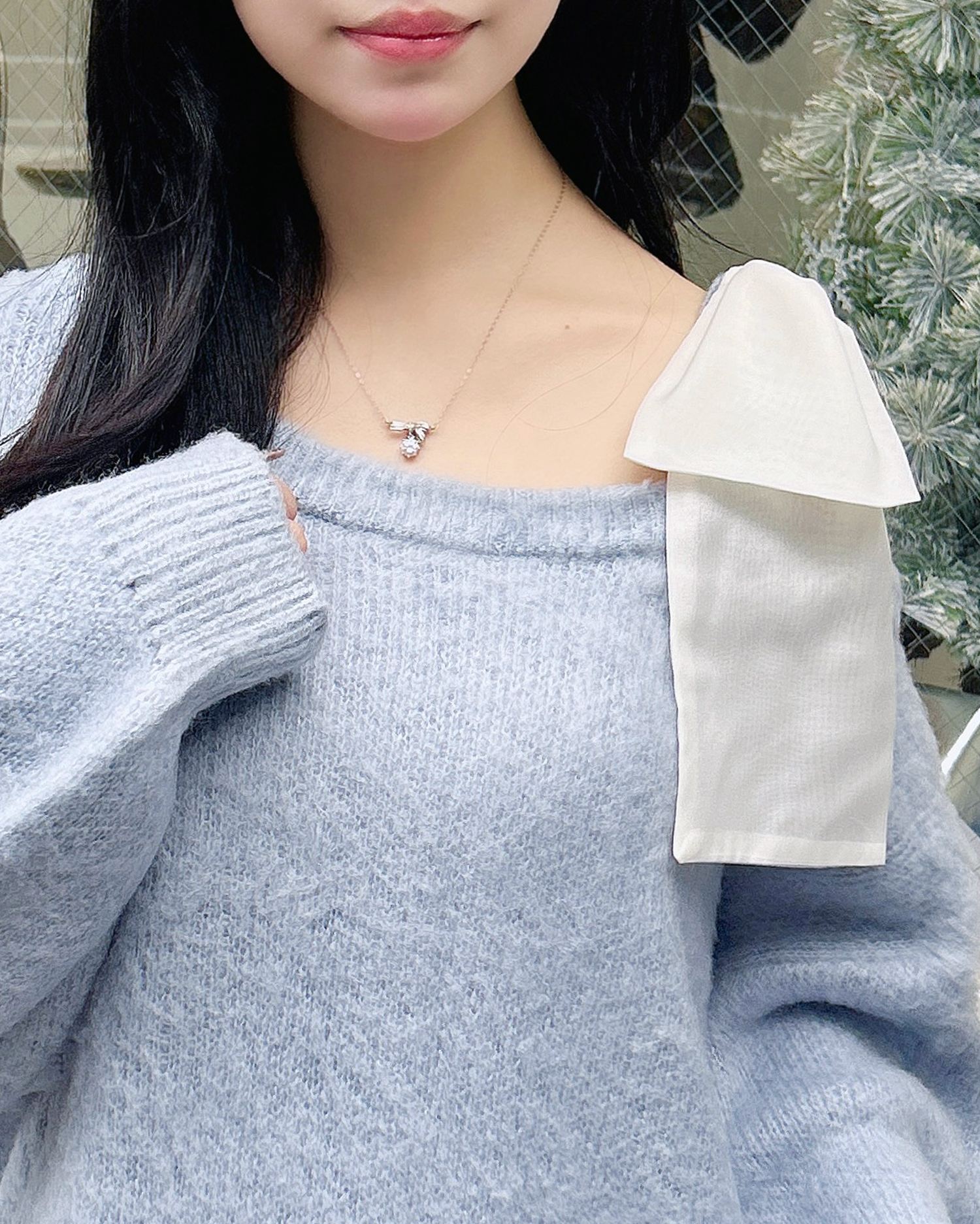 ショルダー部分にあしらった異素材の大きなリボンがキュートなアクセントになっています。
