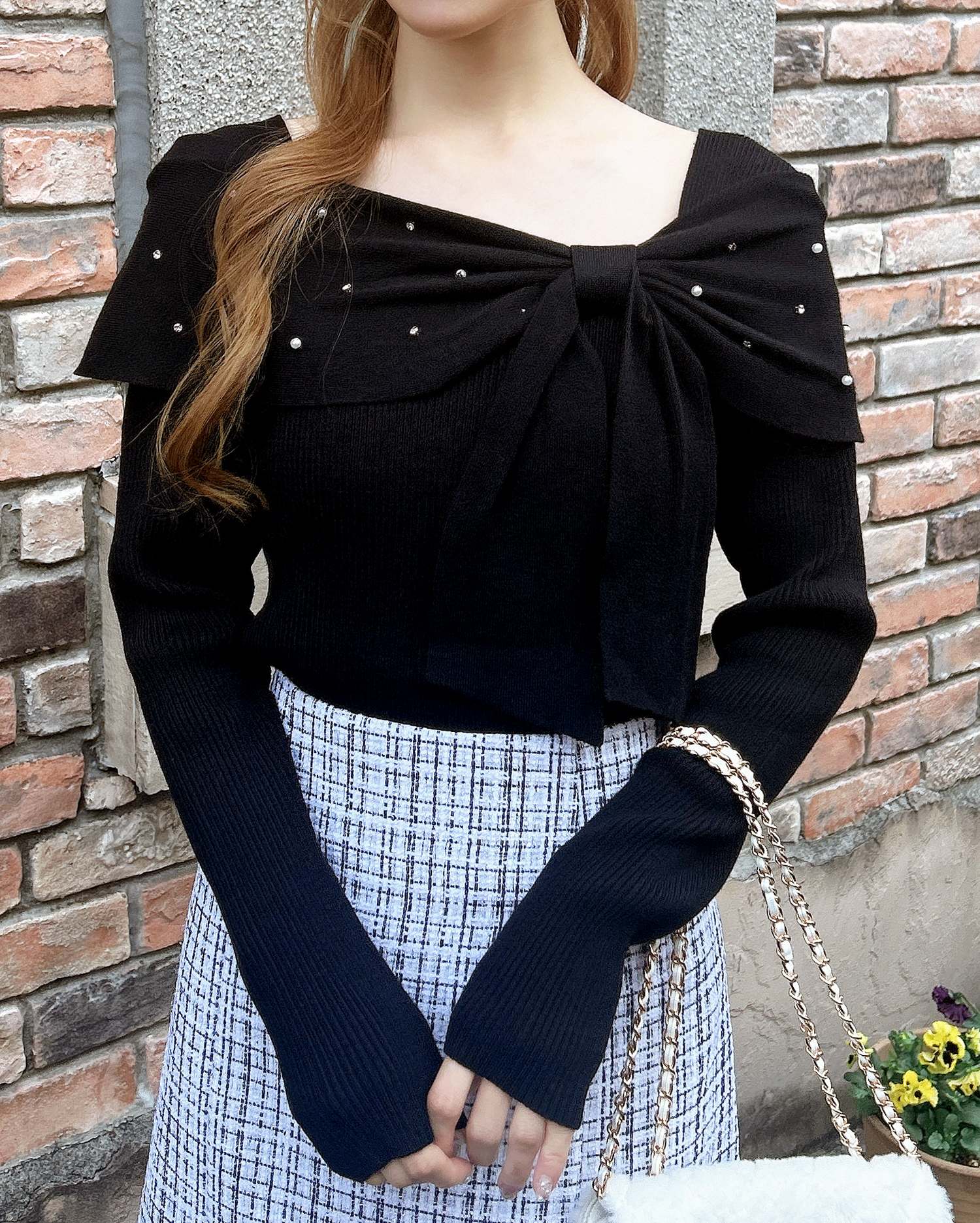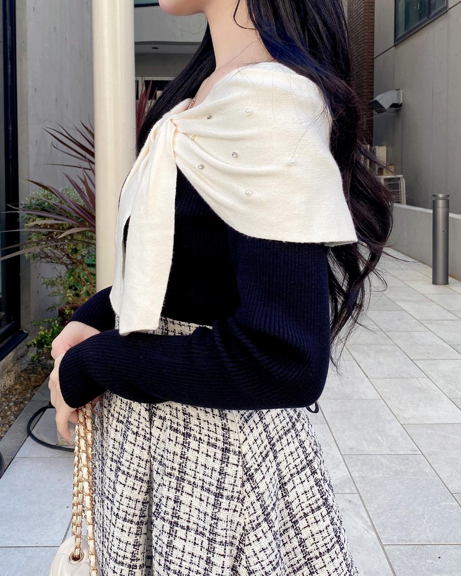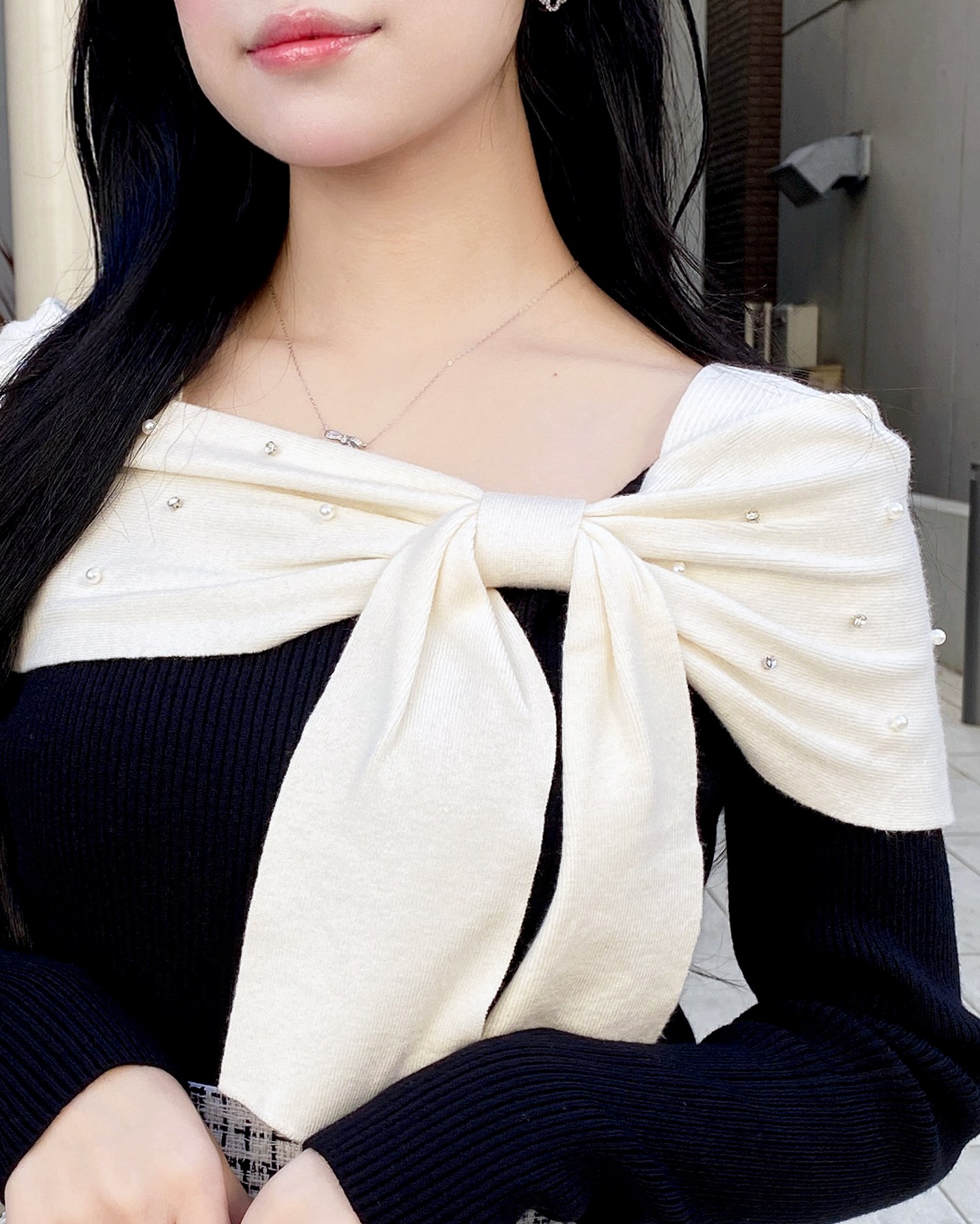 【大きなリボンとビジューがアクセントのオフショルニット】