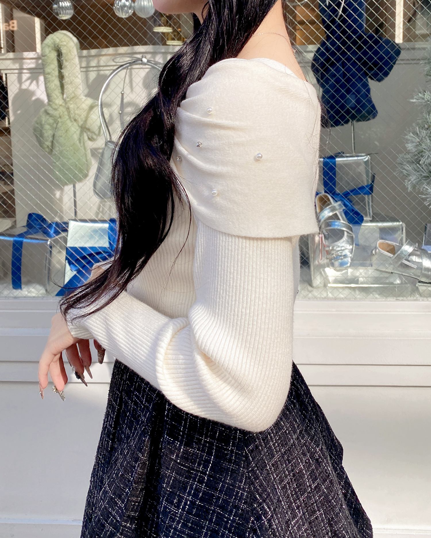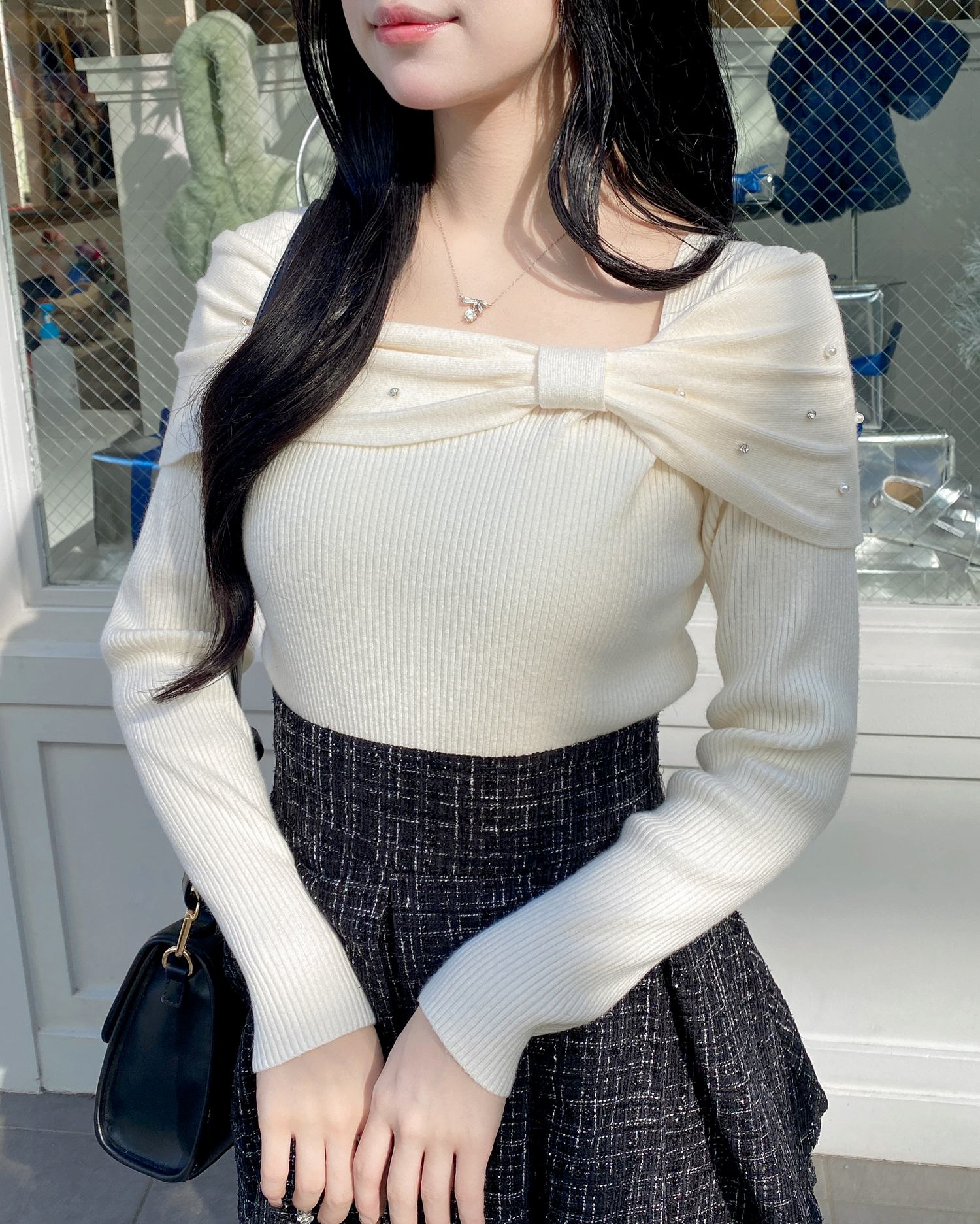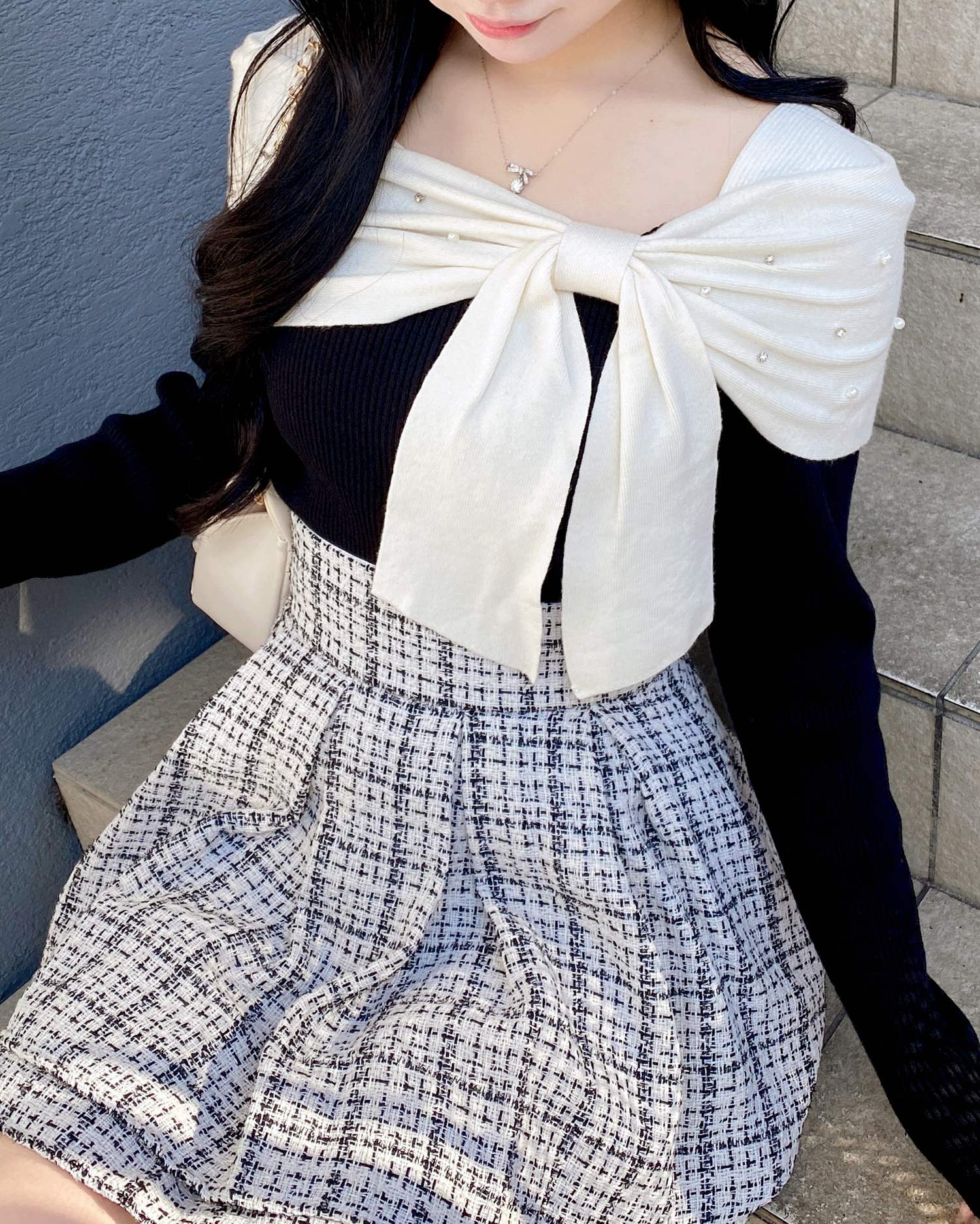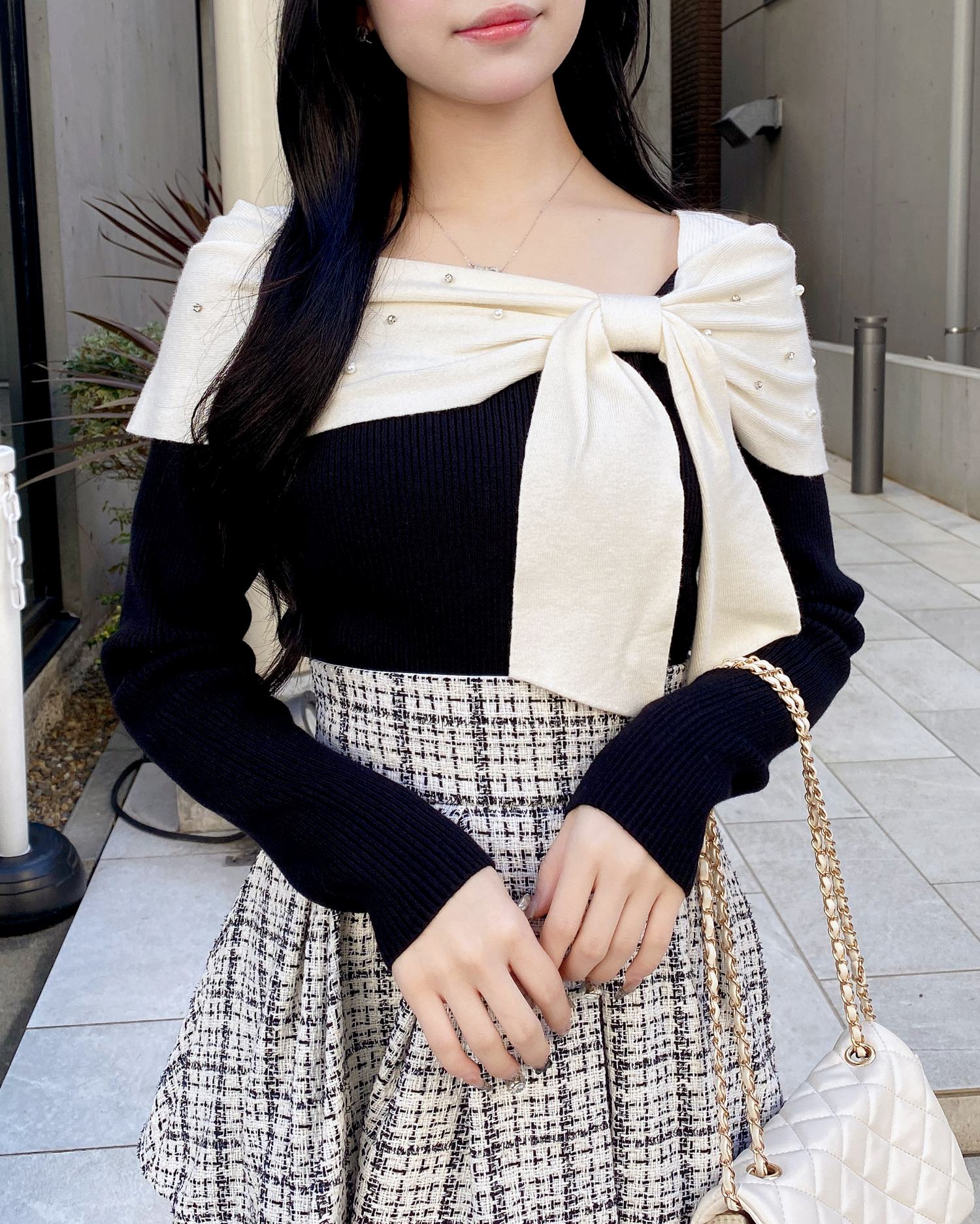 【大きなリボンとビジューがアクセントのオフショルニット】