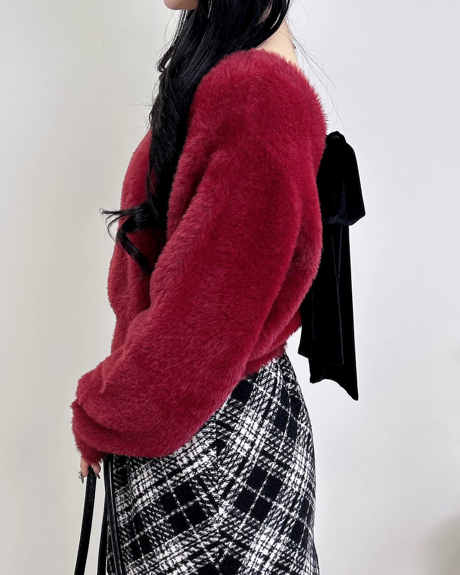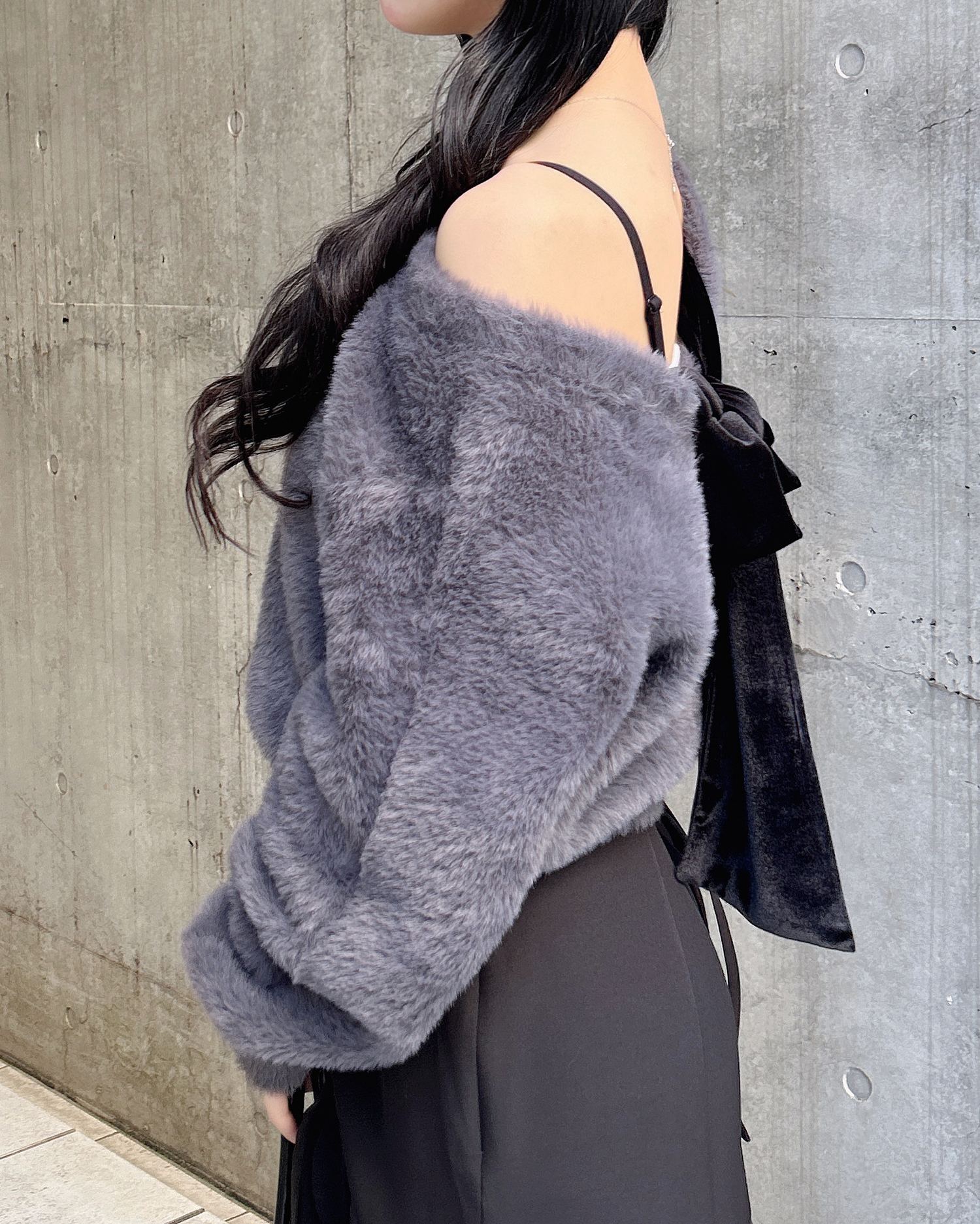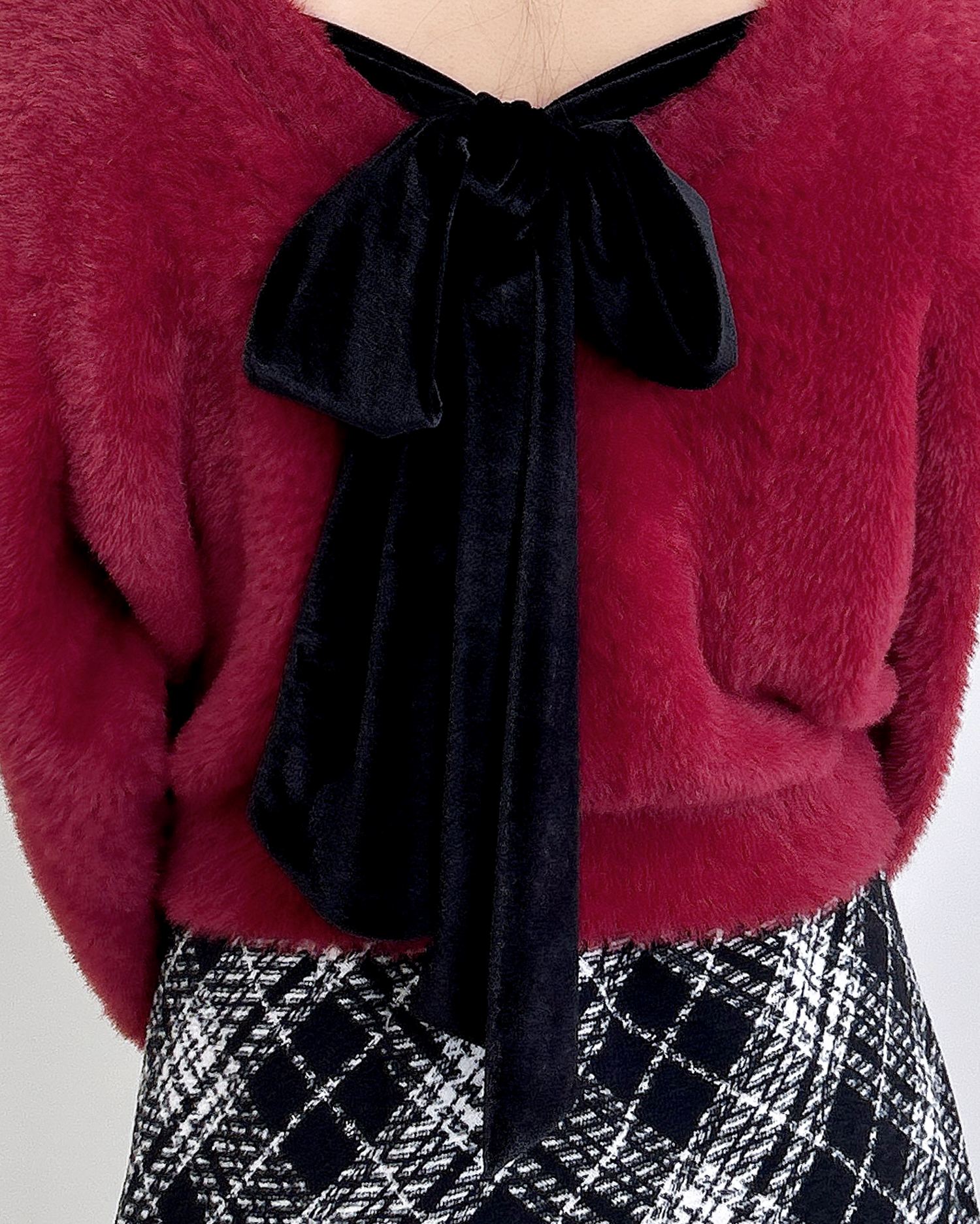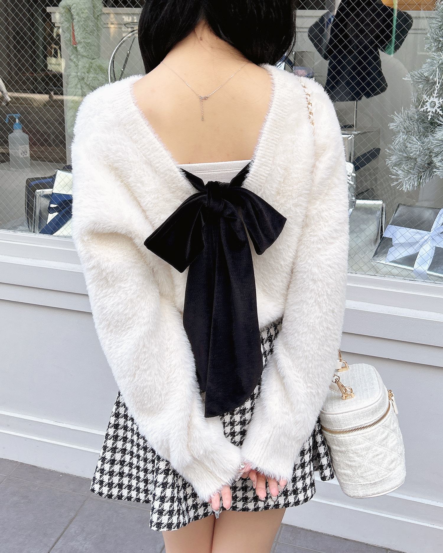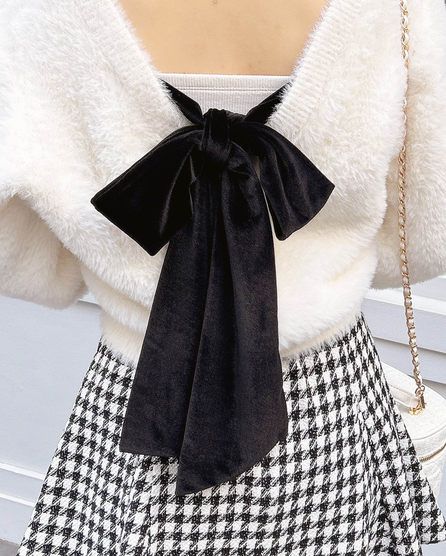 背中には冬らしいベロア生地のリボンがあしらわれ