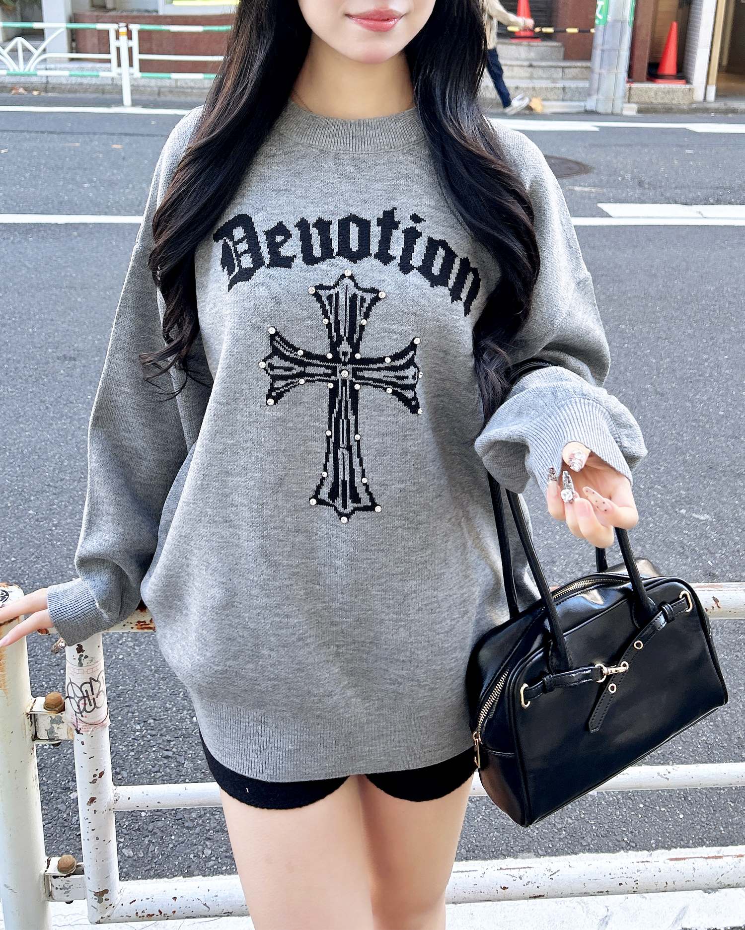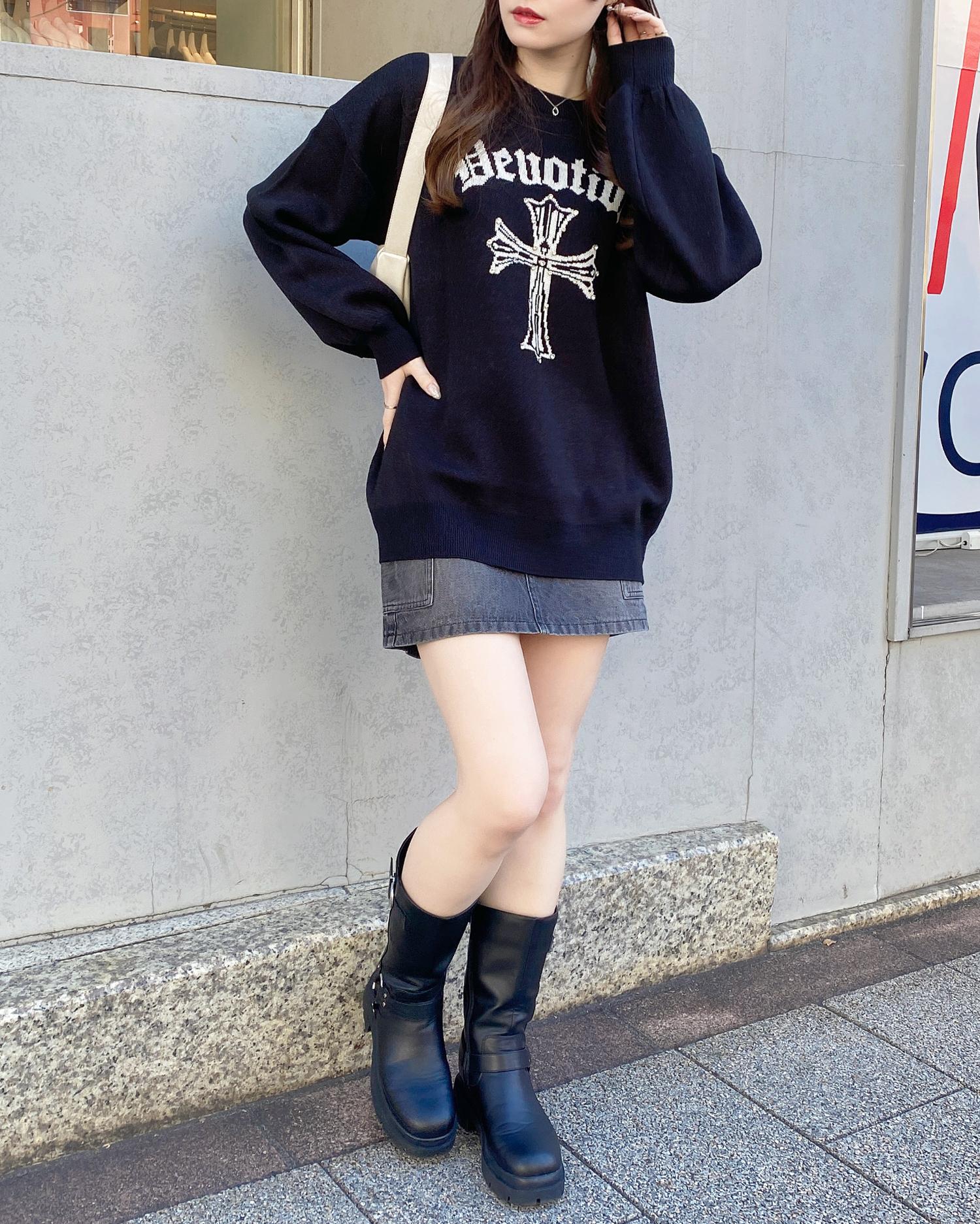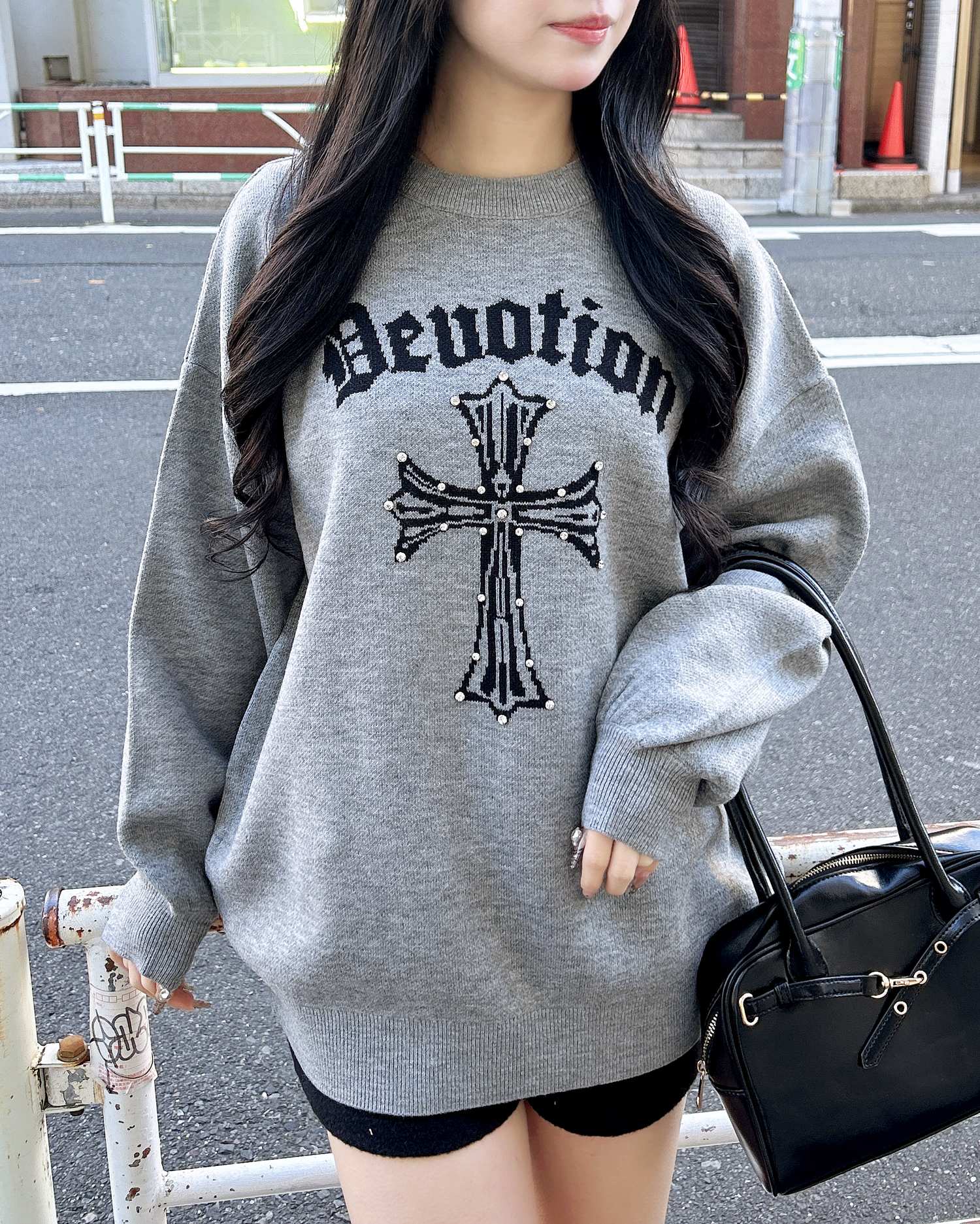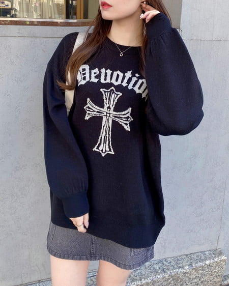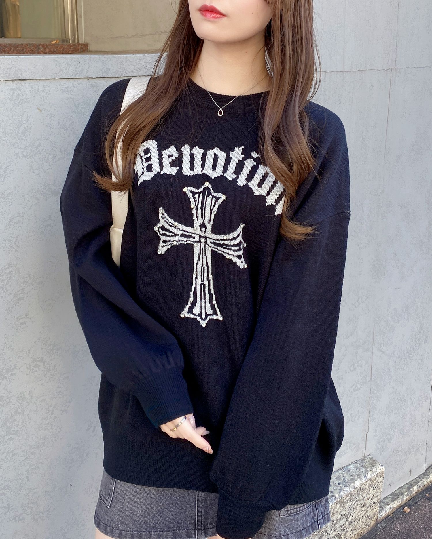 インパクト抜群のクロスロゴ&ビジューがアクセントのジャガードニット。