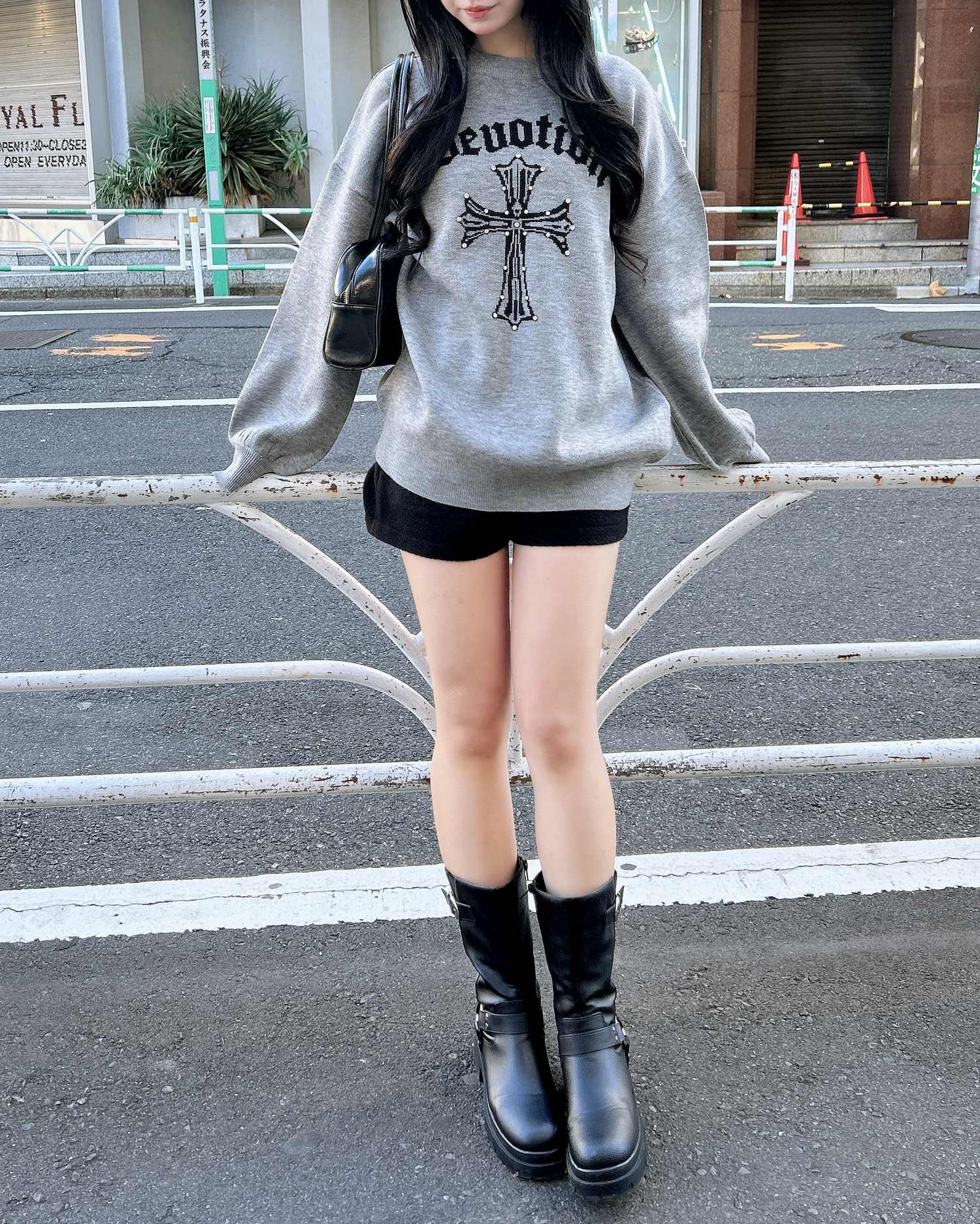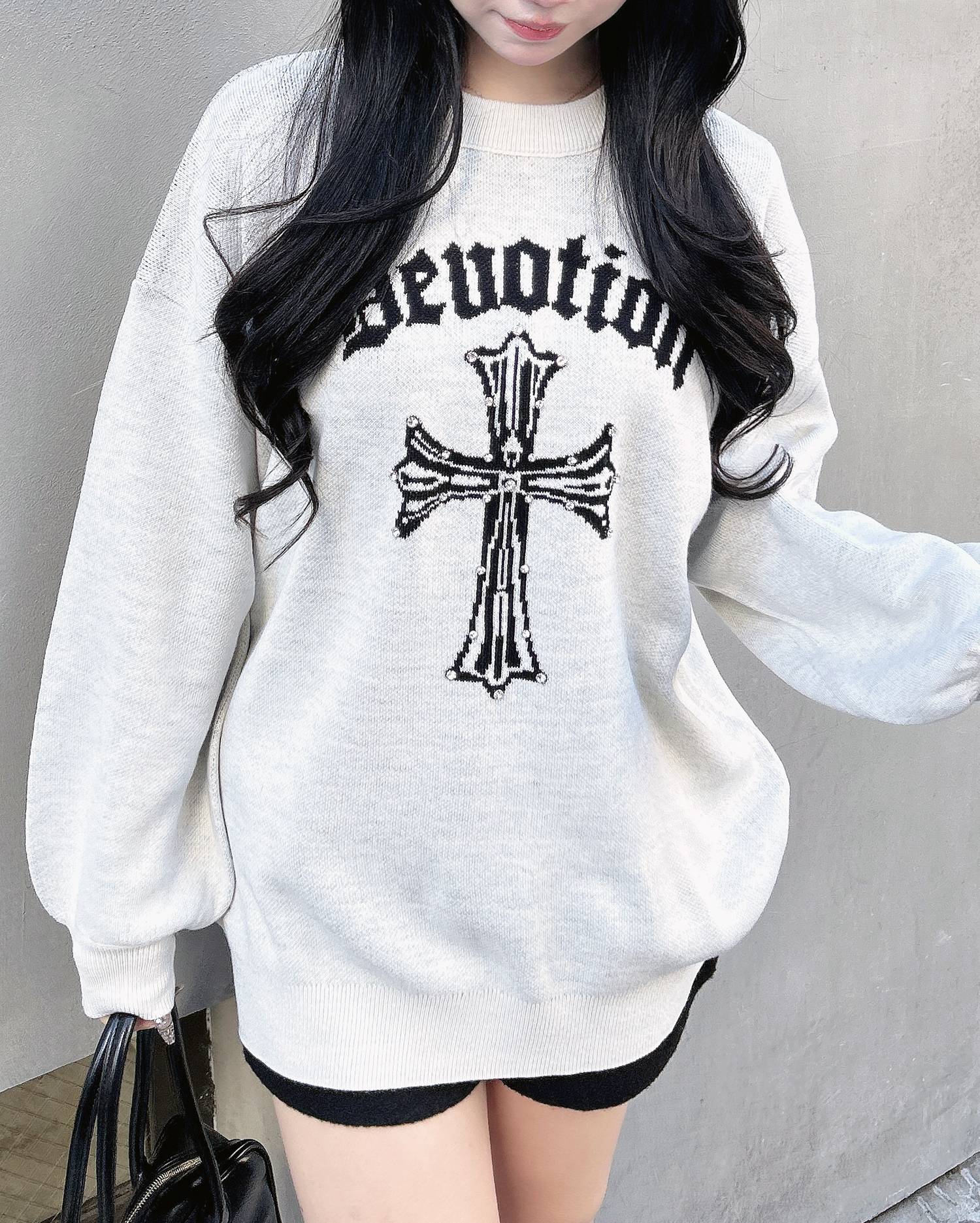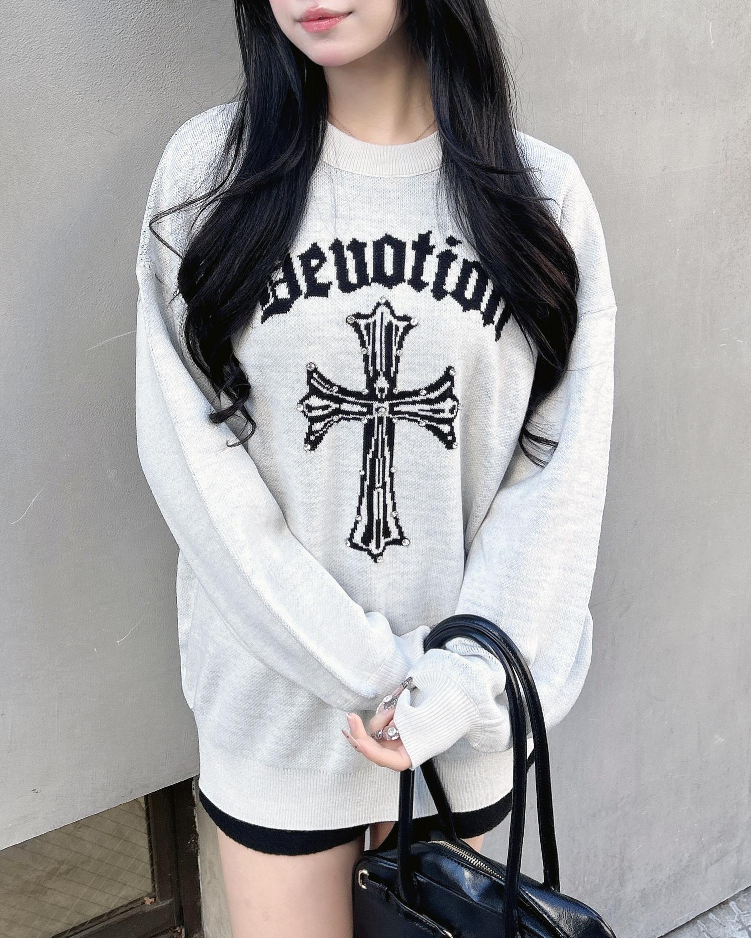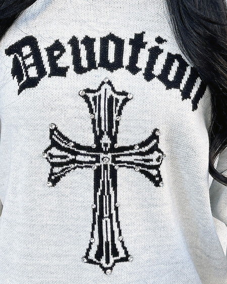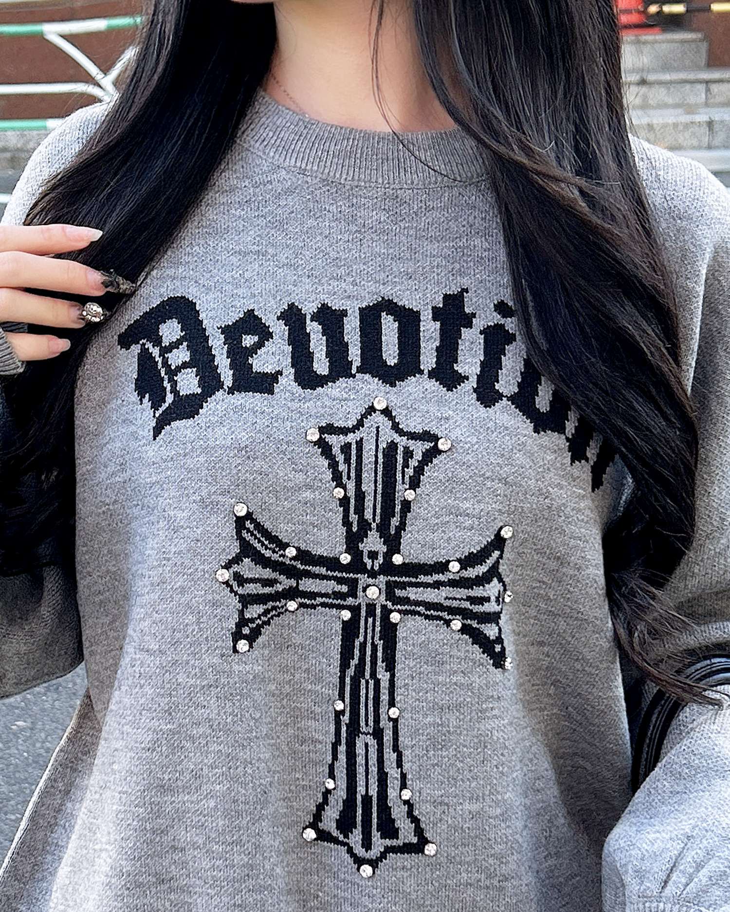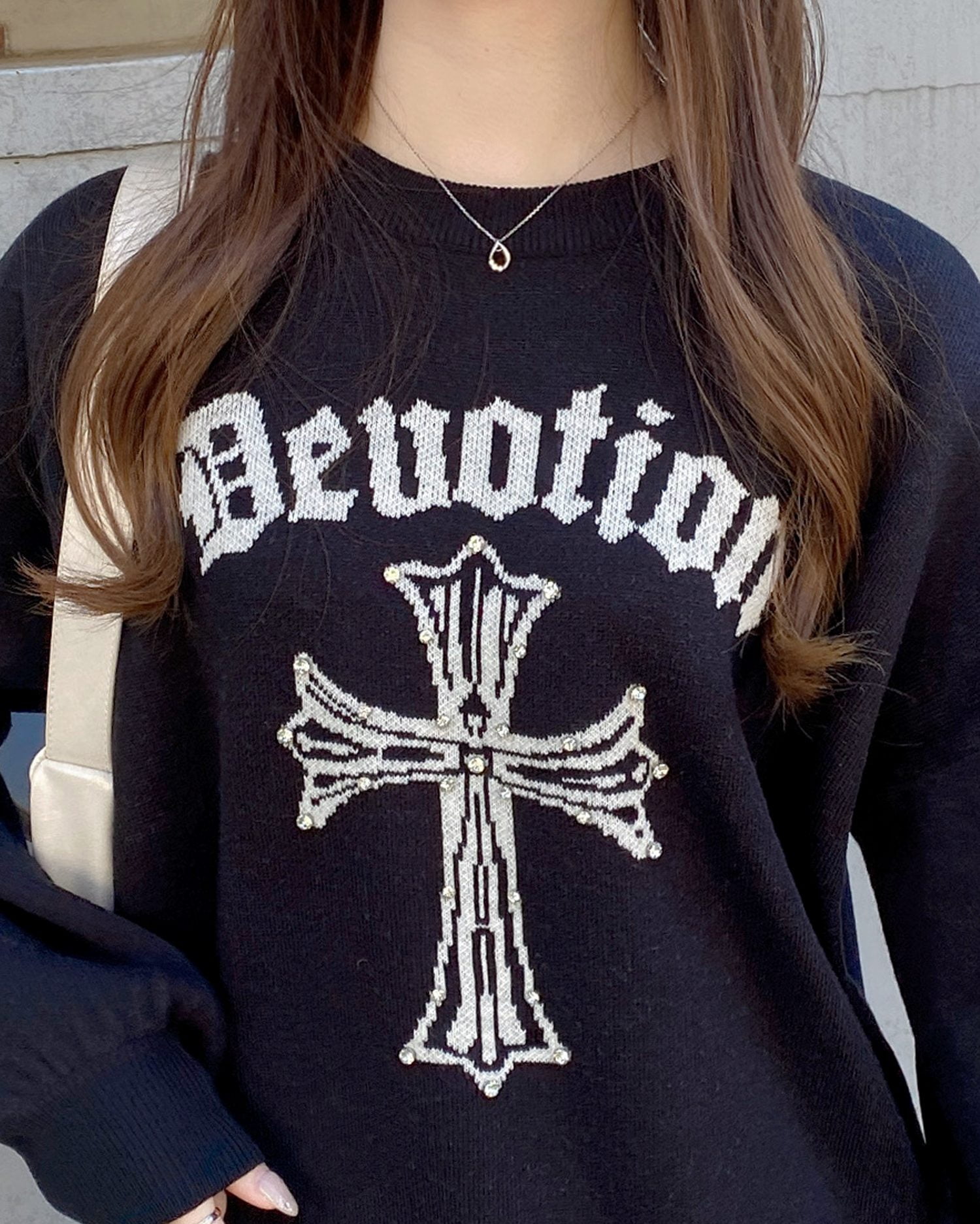 インパクト抜群のクロスロゴ&ビジューがアクセントのジャガードニット。