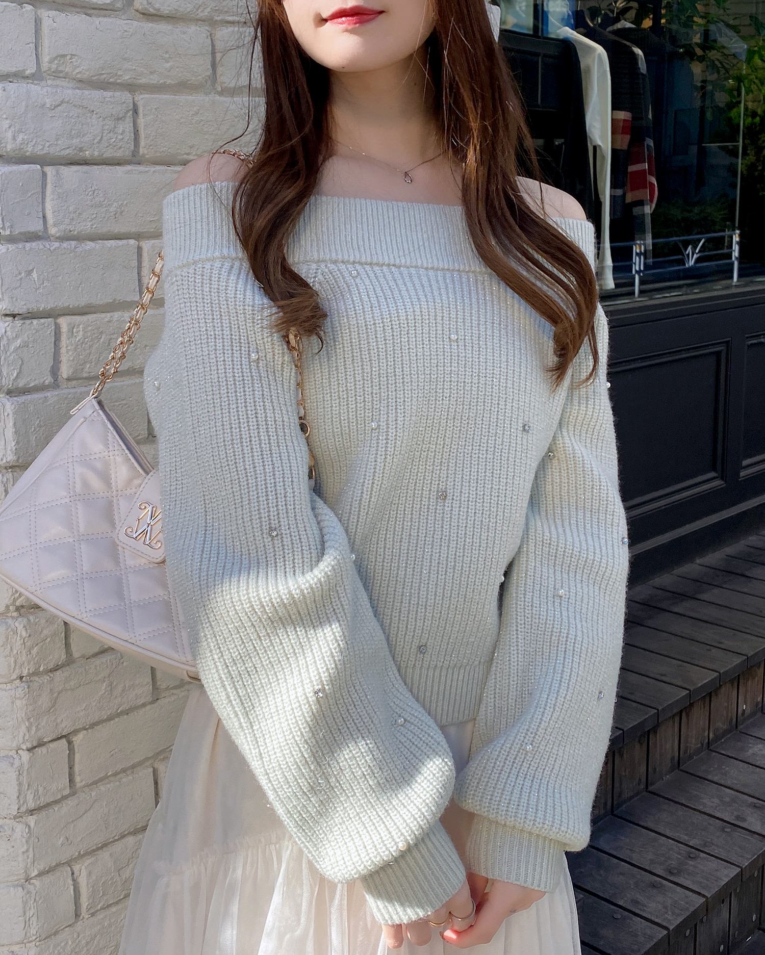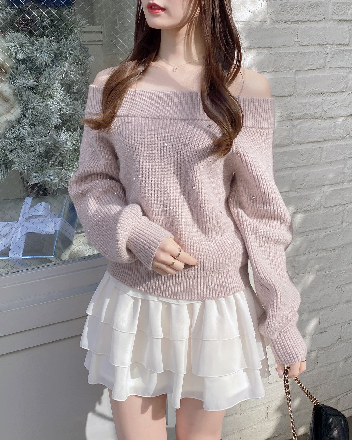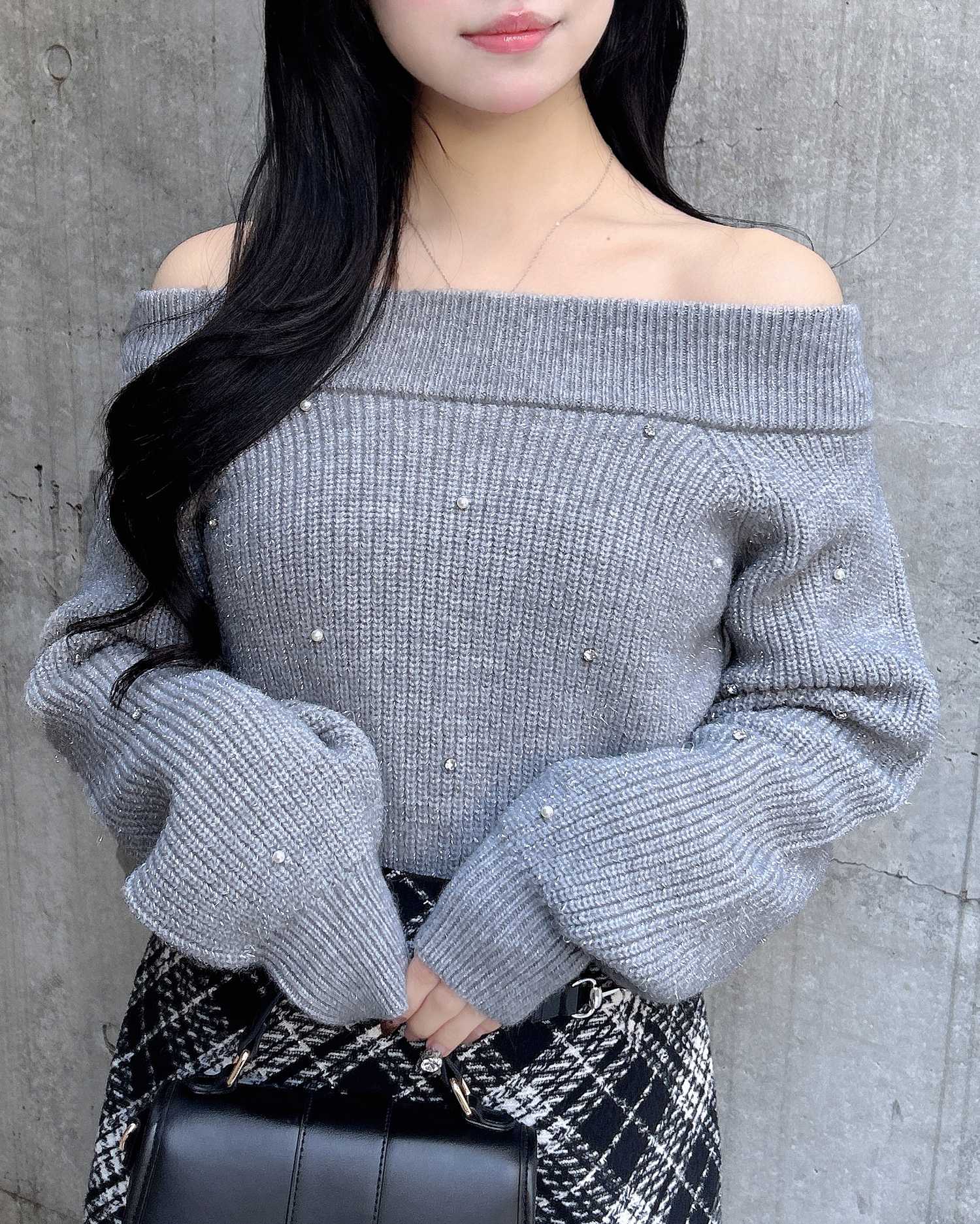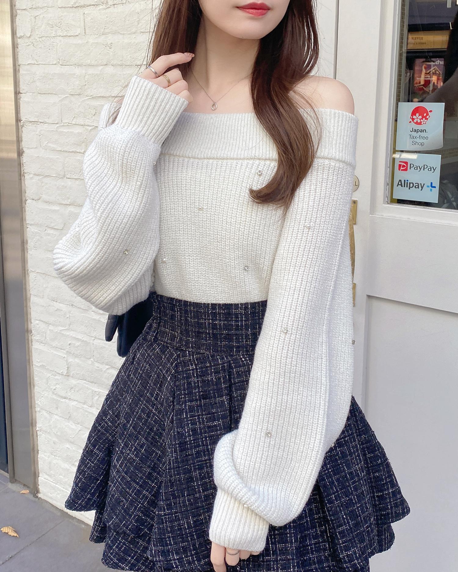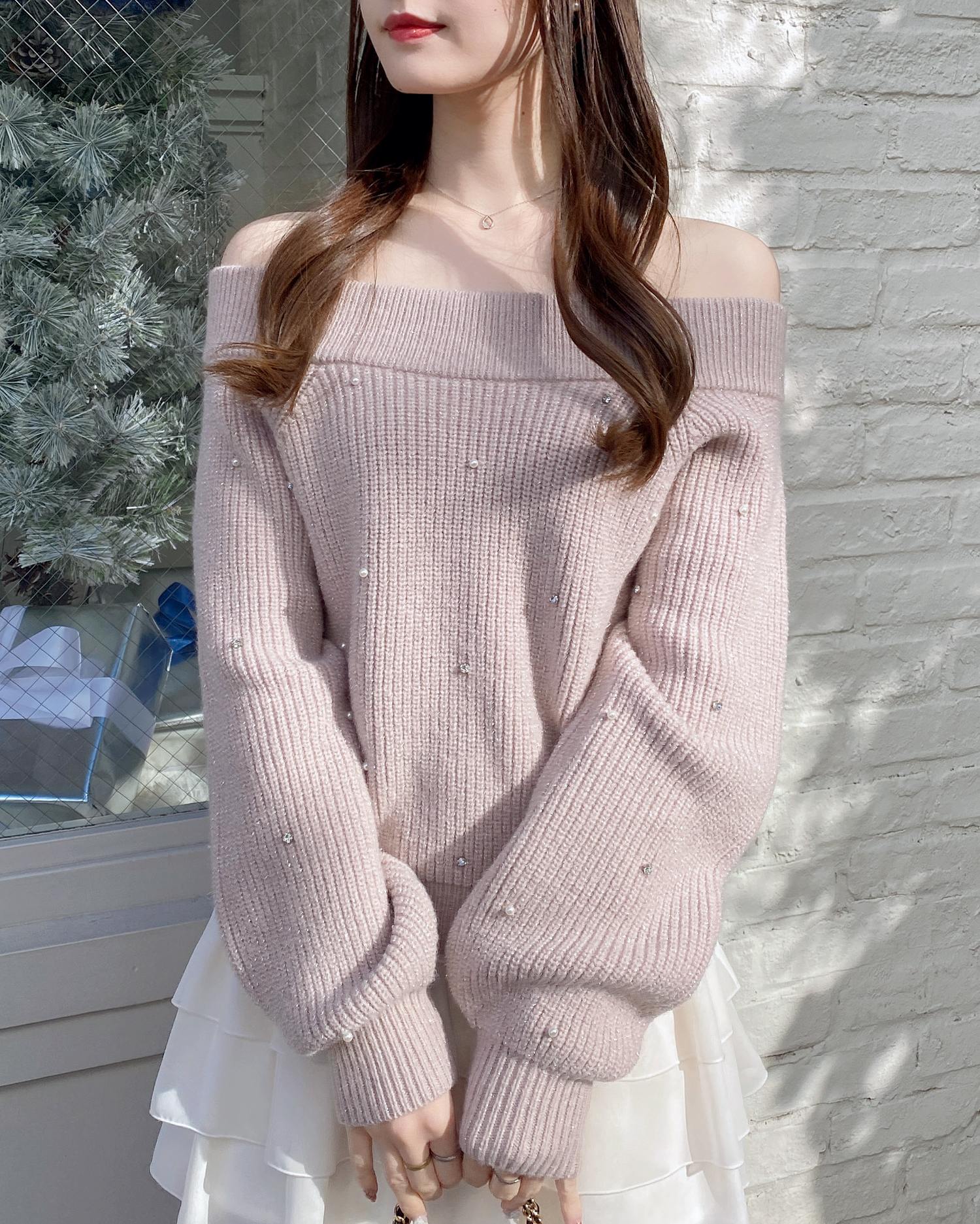 【キラキラのビジューがかわいい♡オフショルニット】