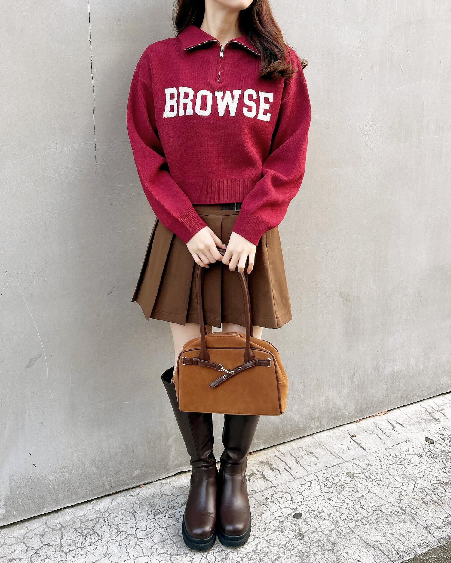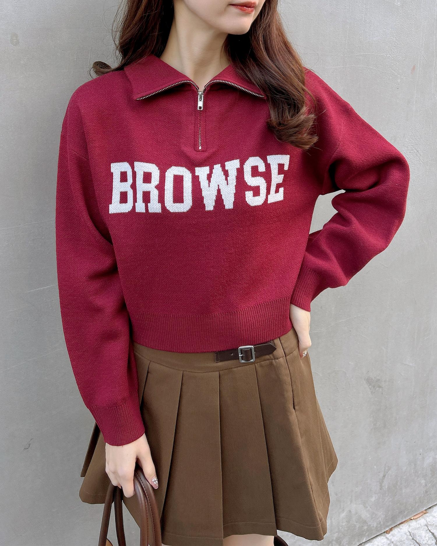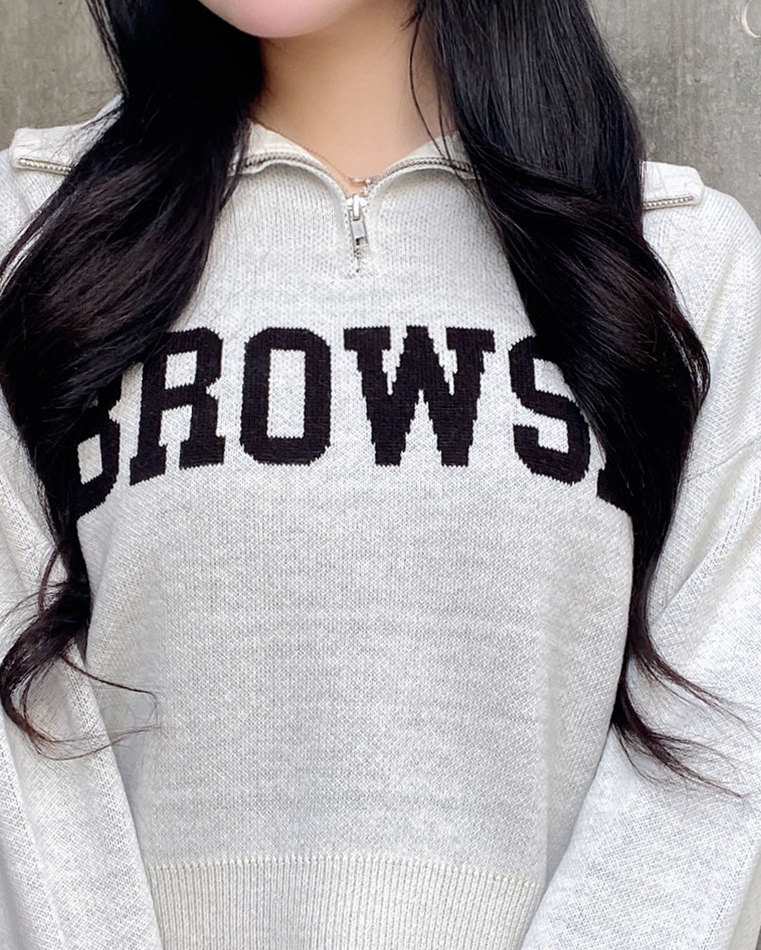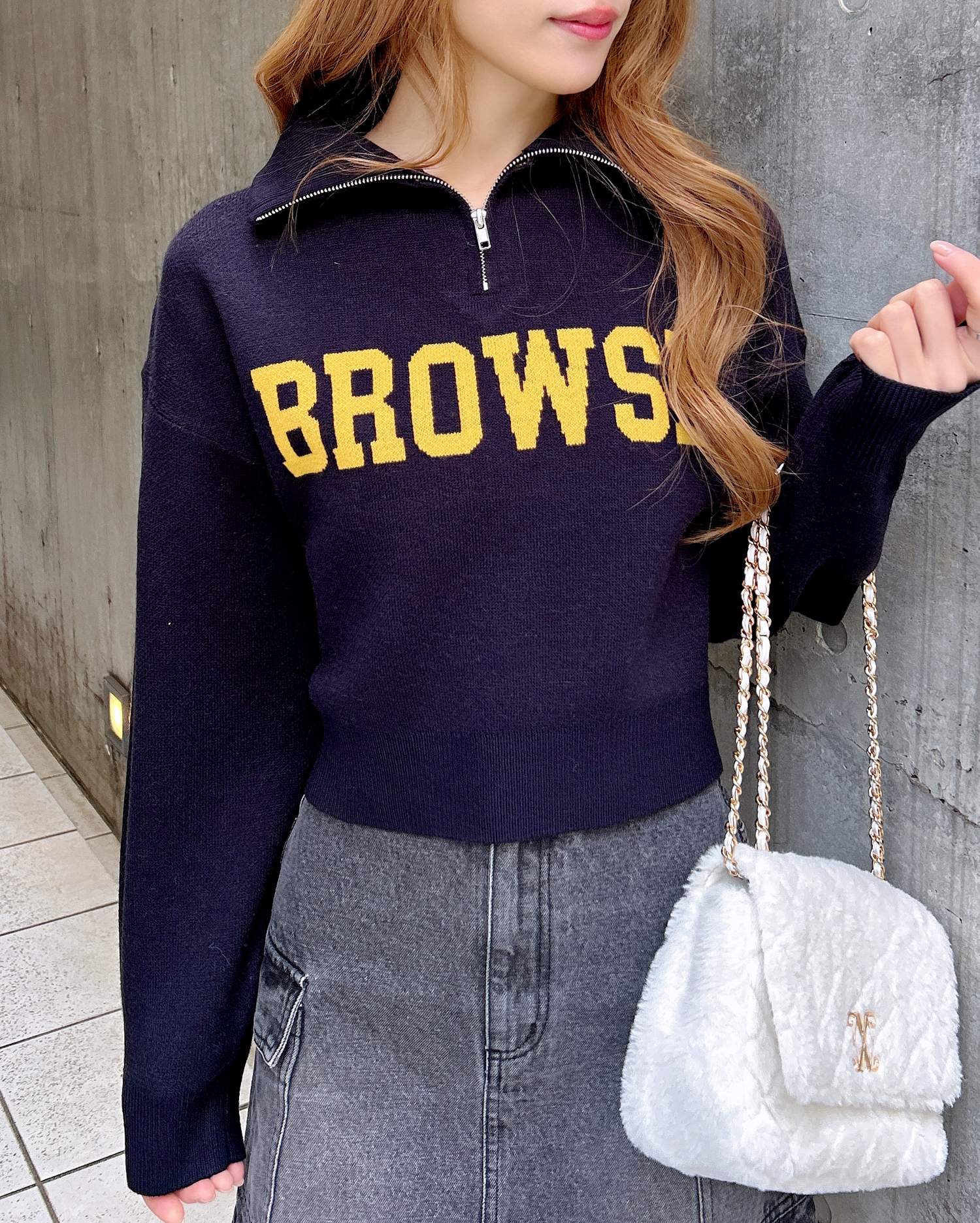 【フロントの大きなロゴがアクセントになるハーフジップニット】