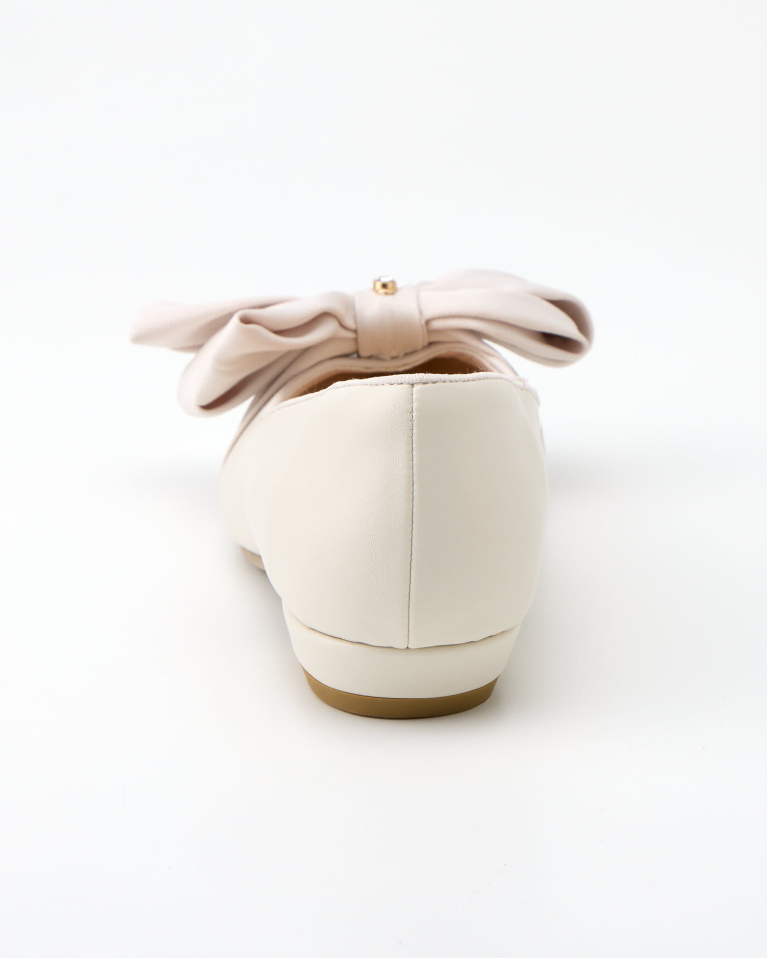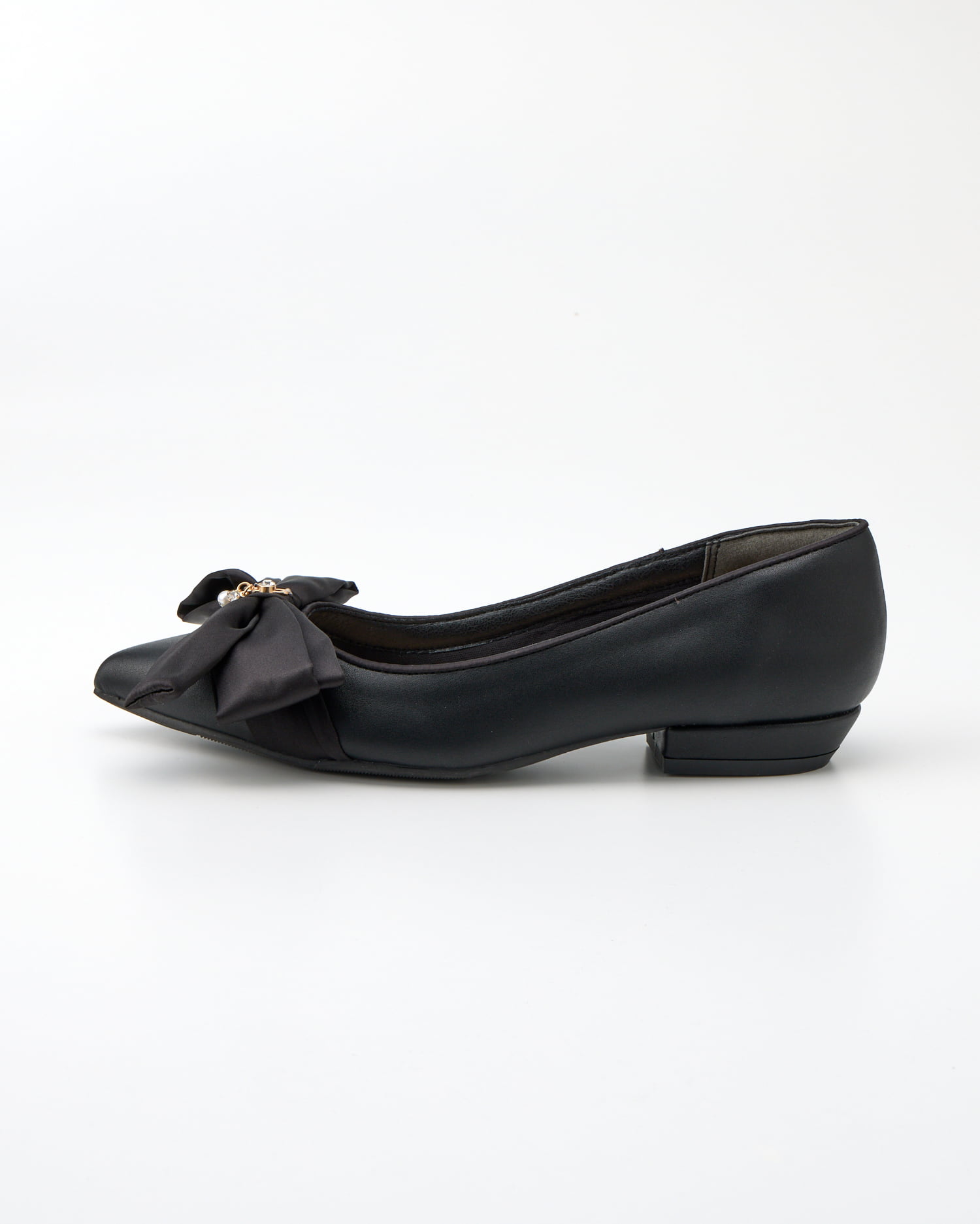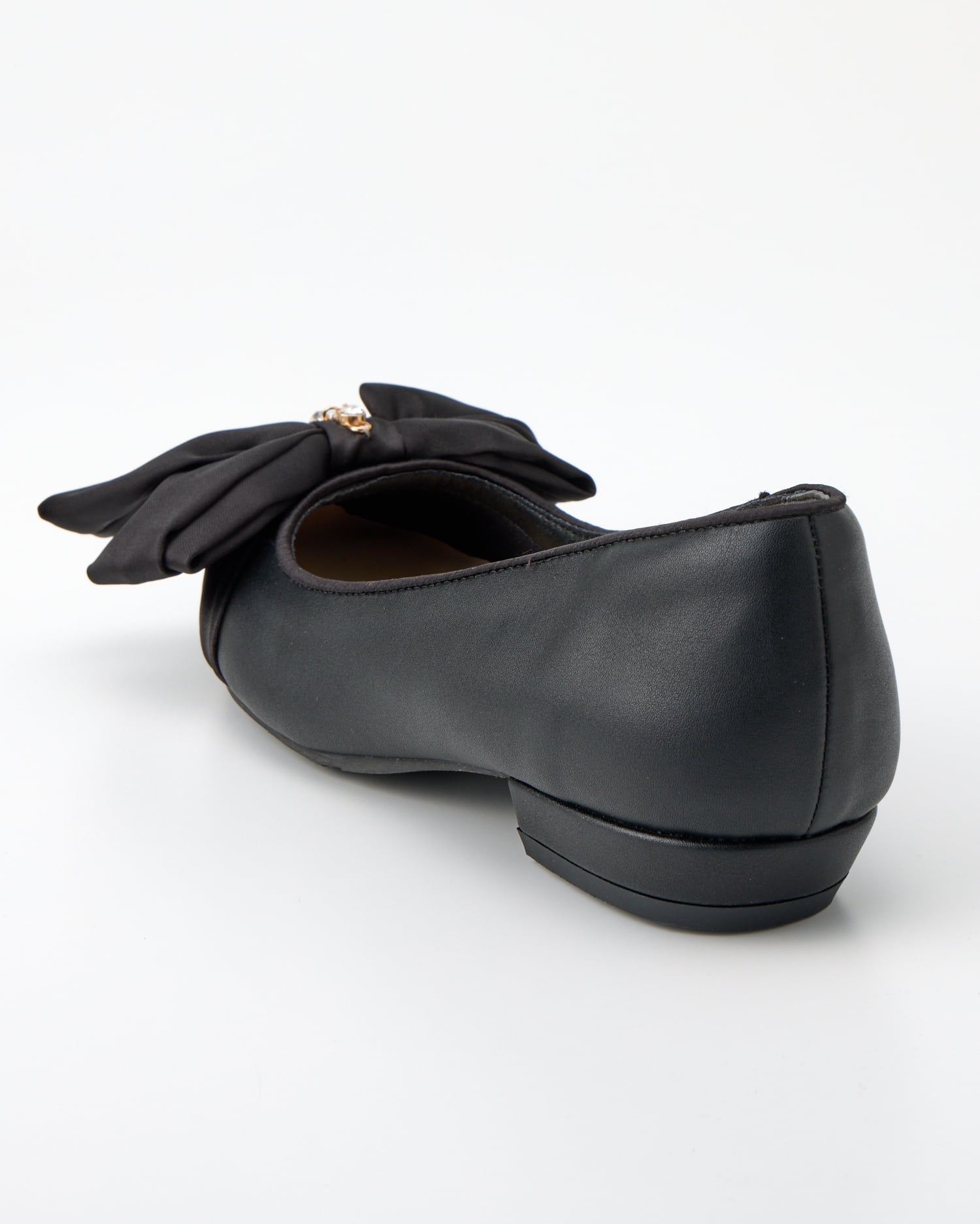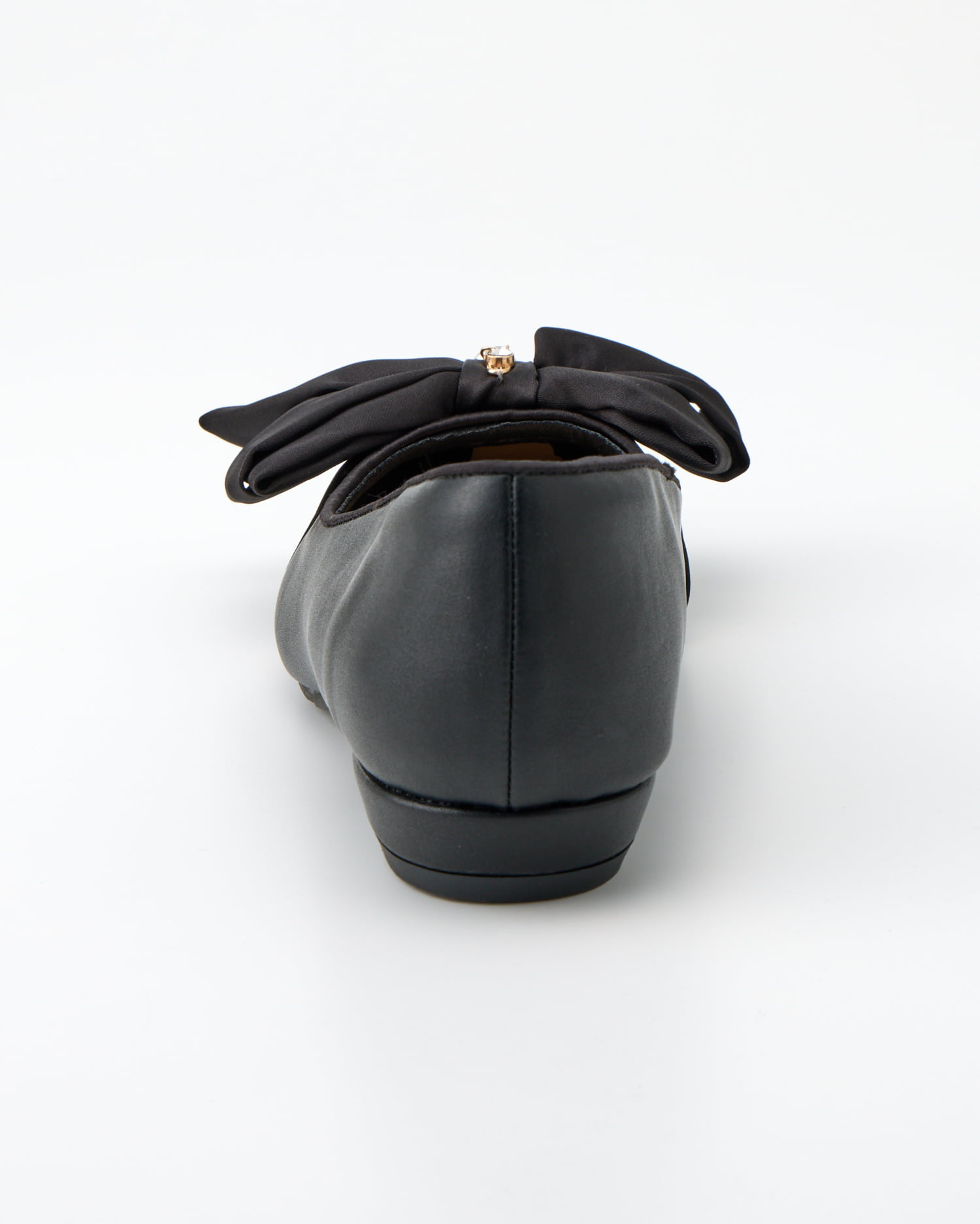 大人レディなぺたんこパンプスはアシンメトリーのリボンが印象的。