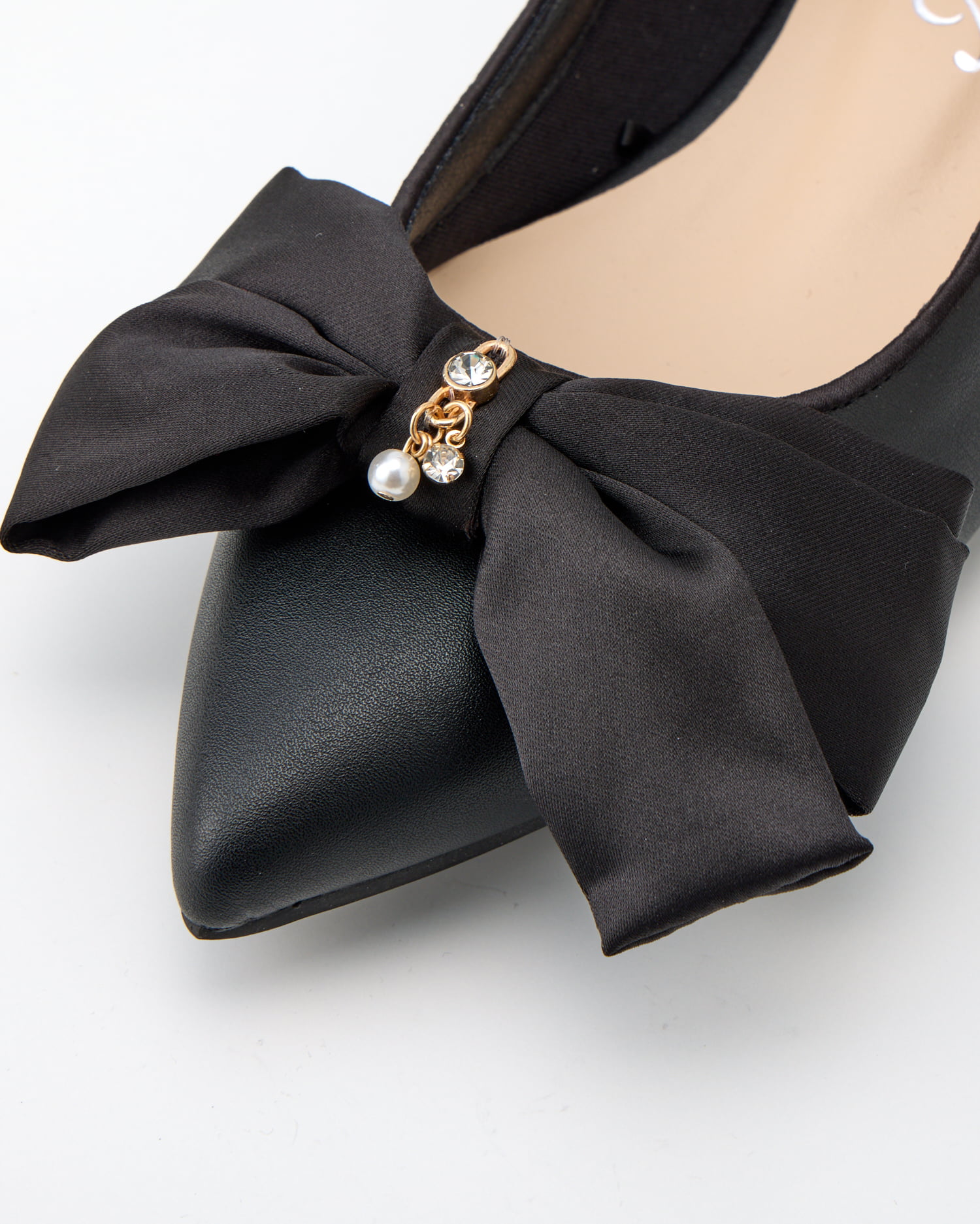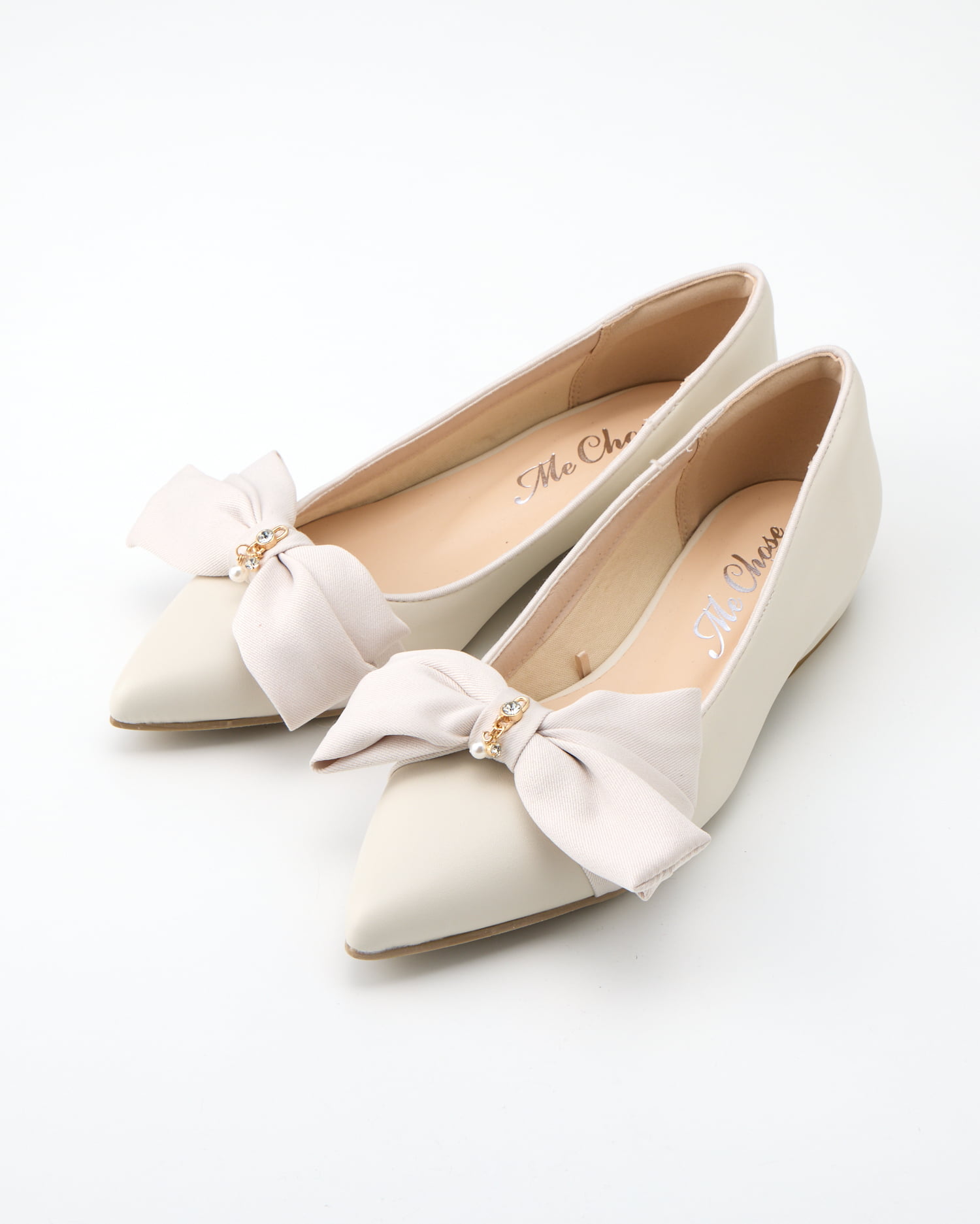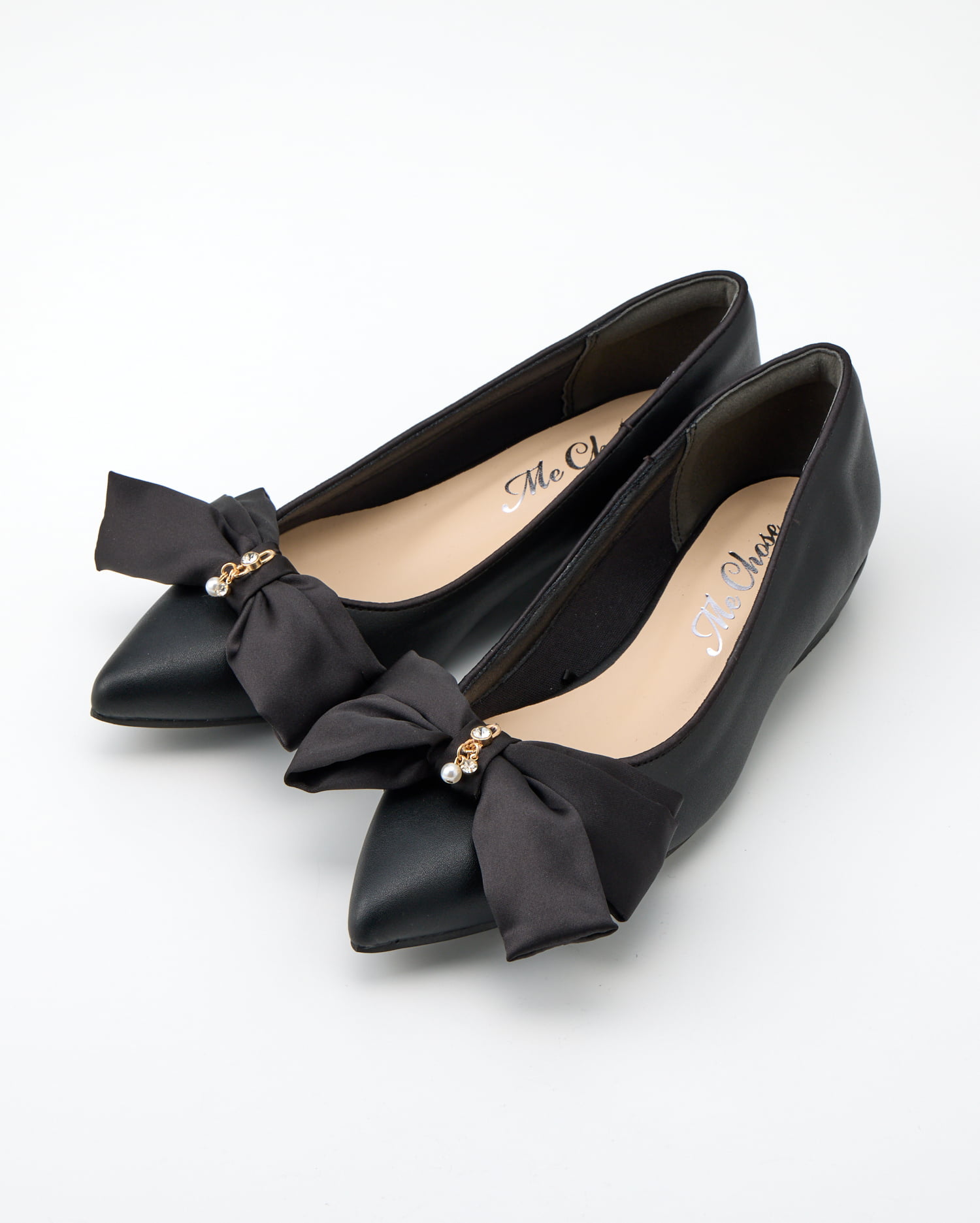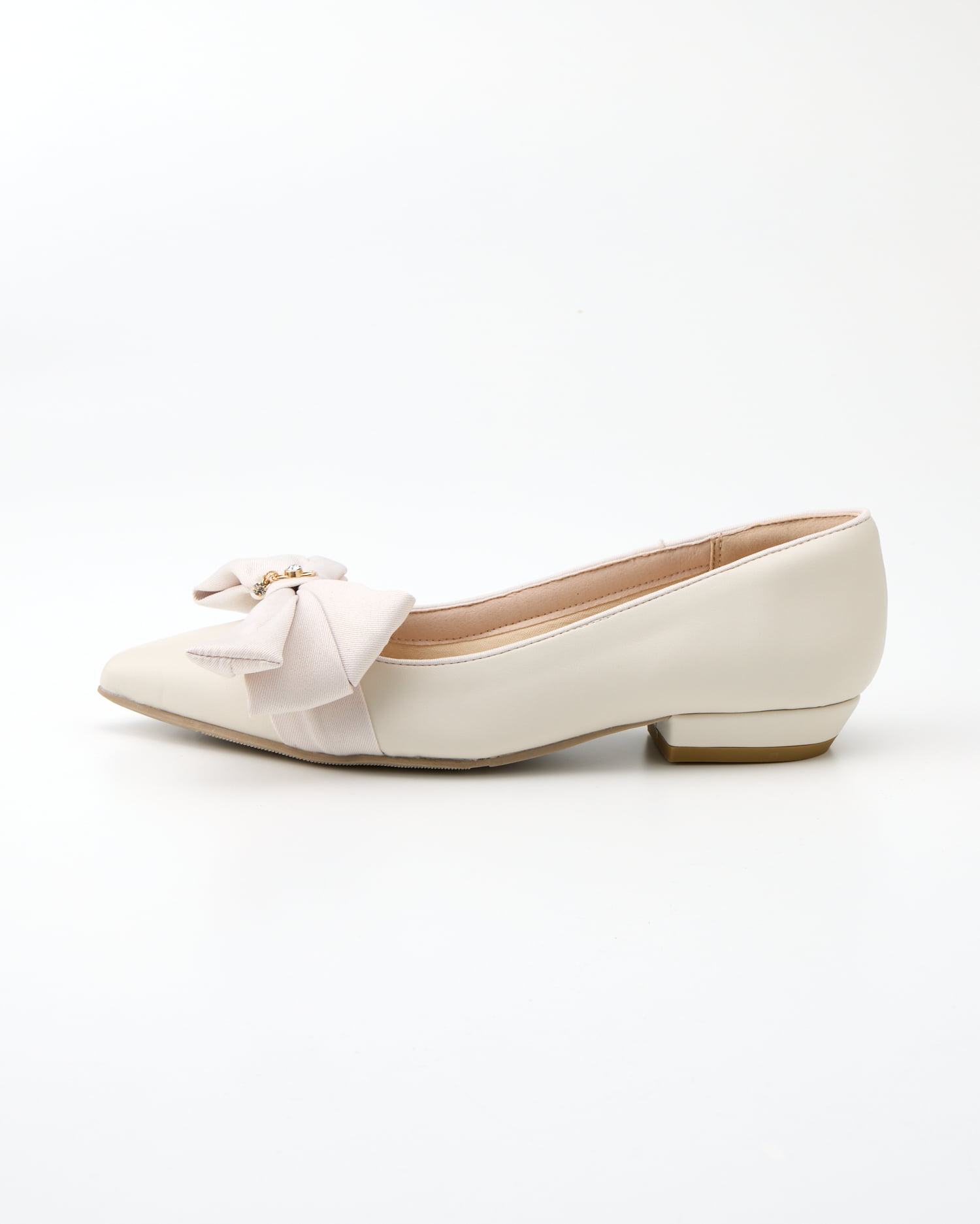 大人レディなぺたんこパンプスはアシンメトリーのリボンが印象的。