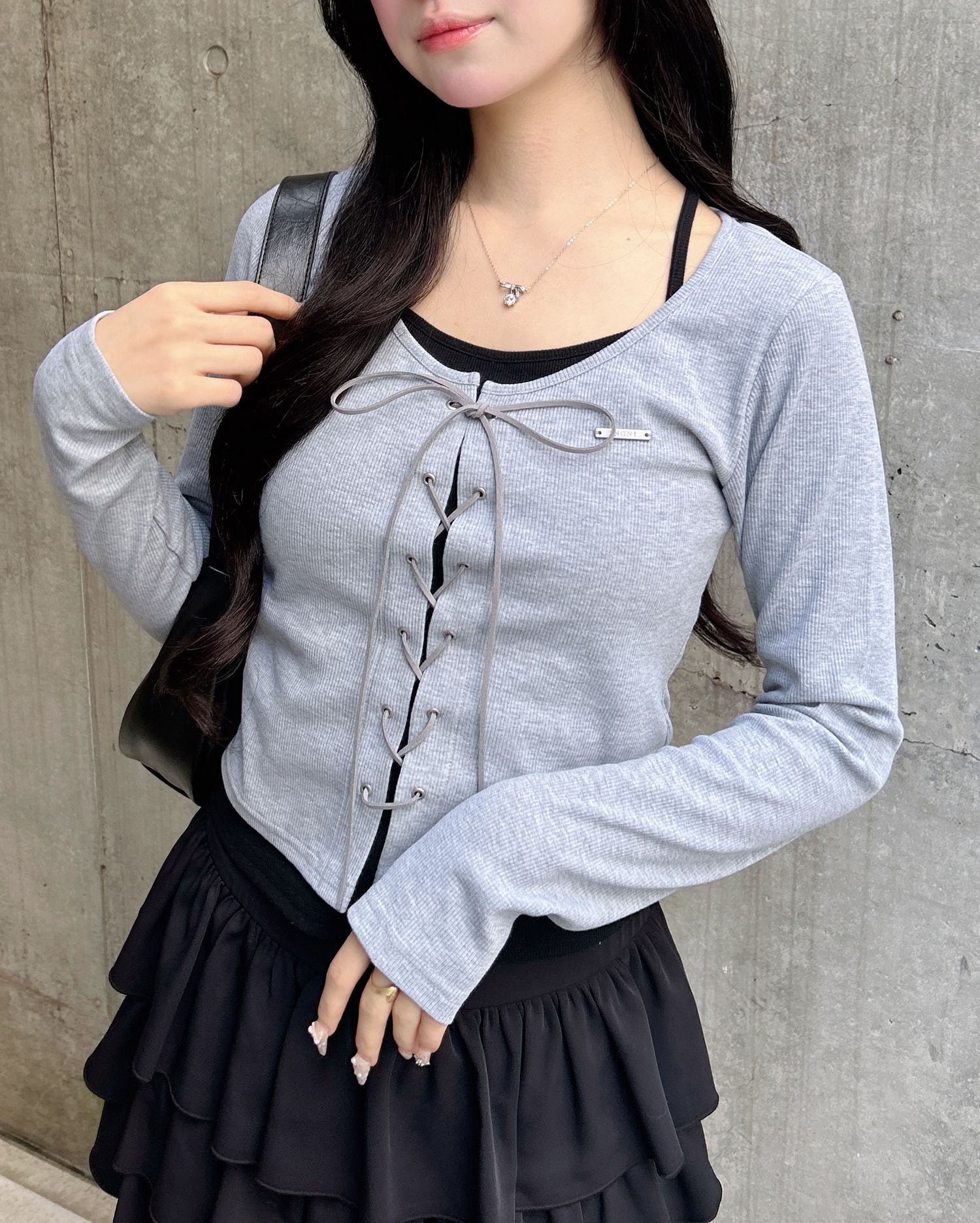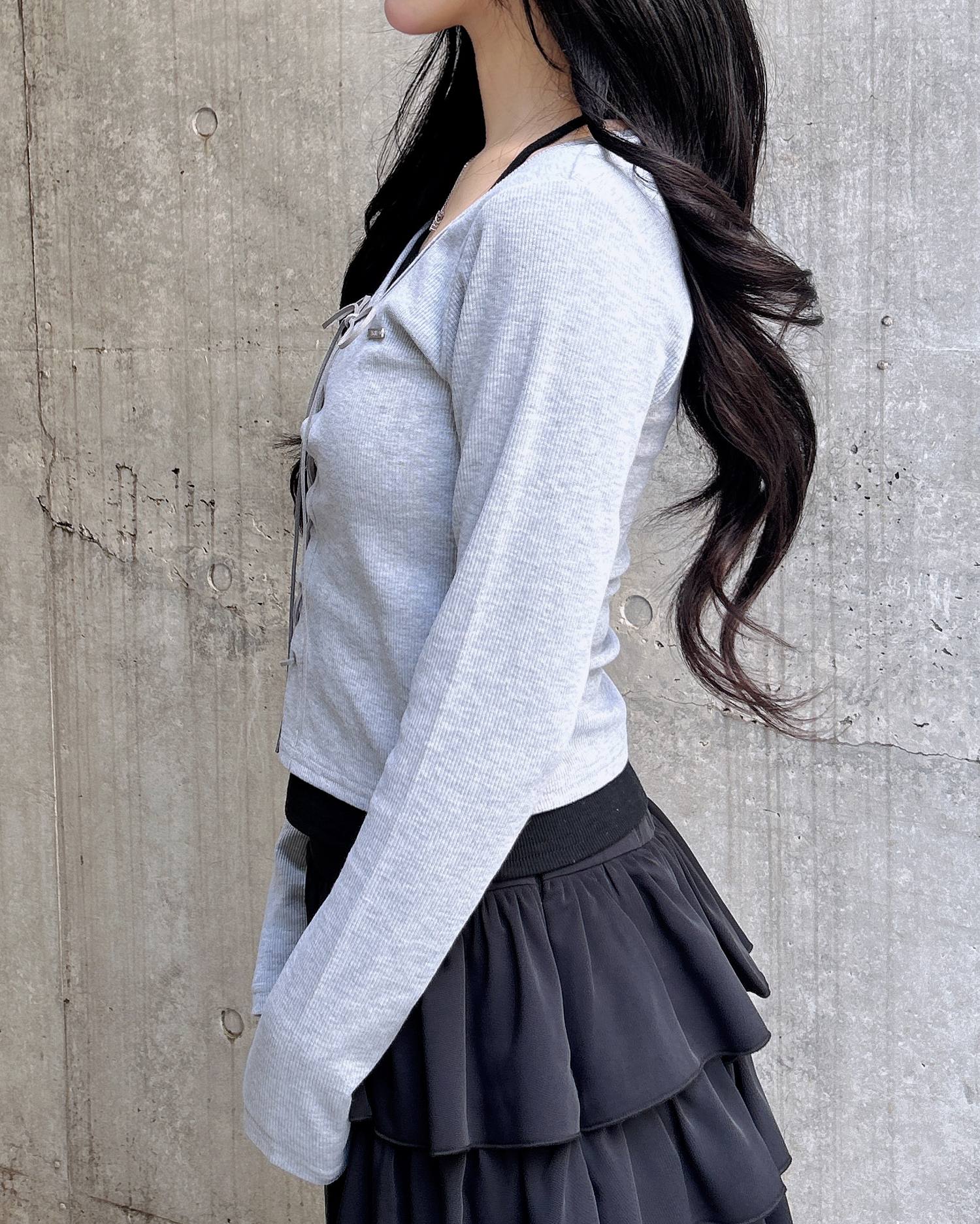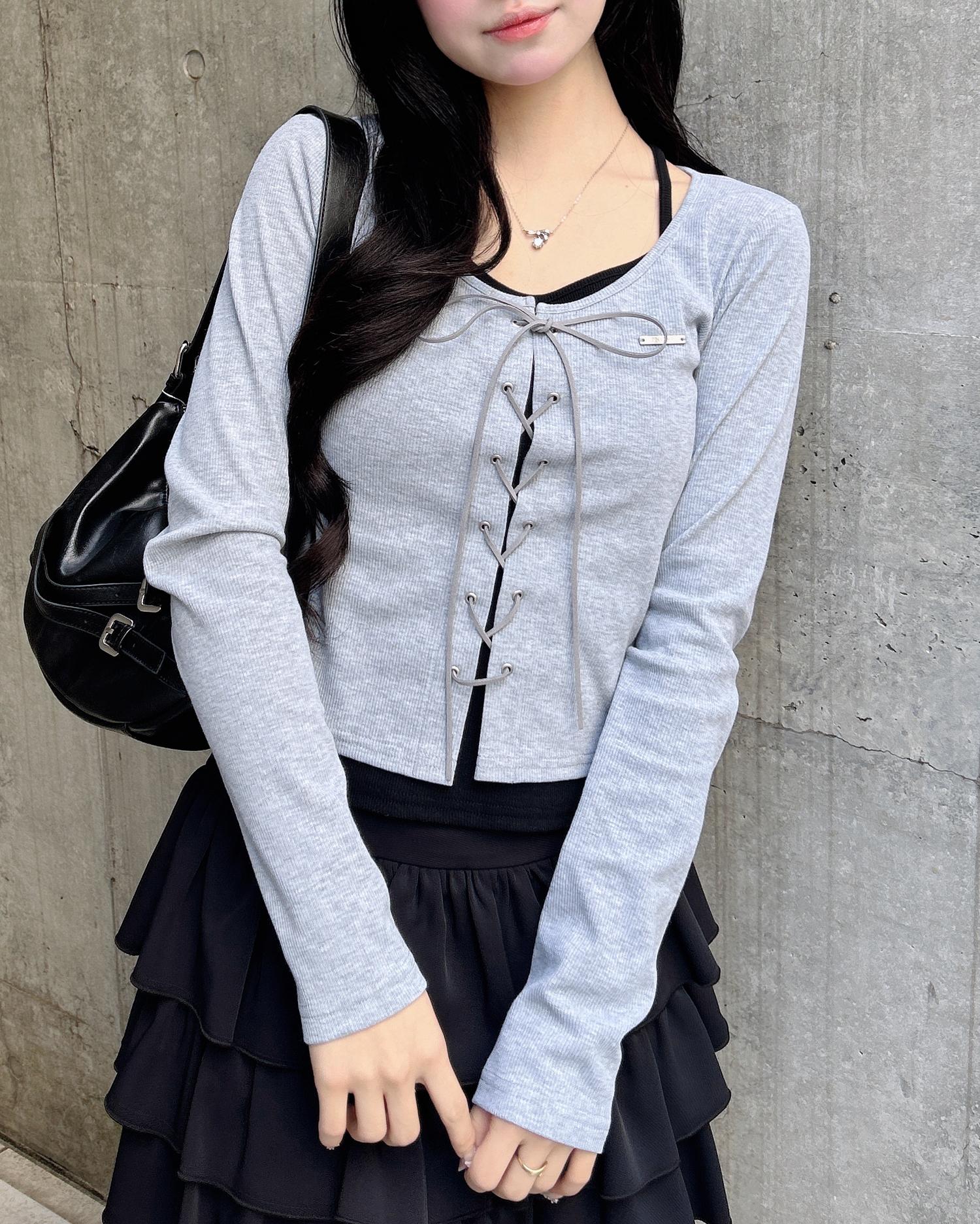 レースアップ&レイヤード風のデザインで表情たっぷりに。