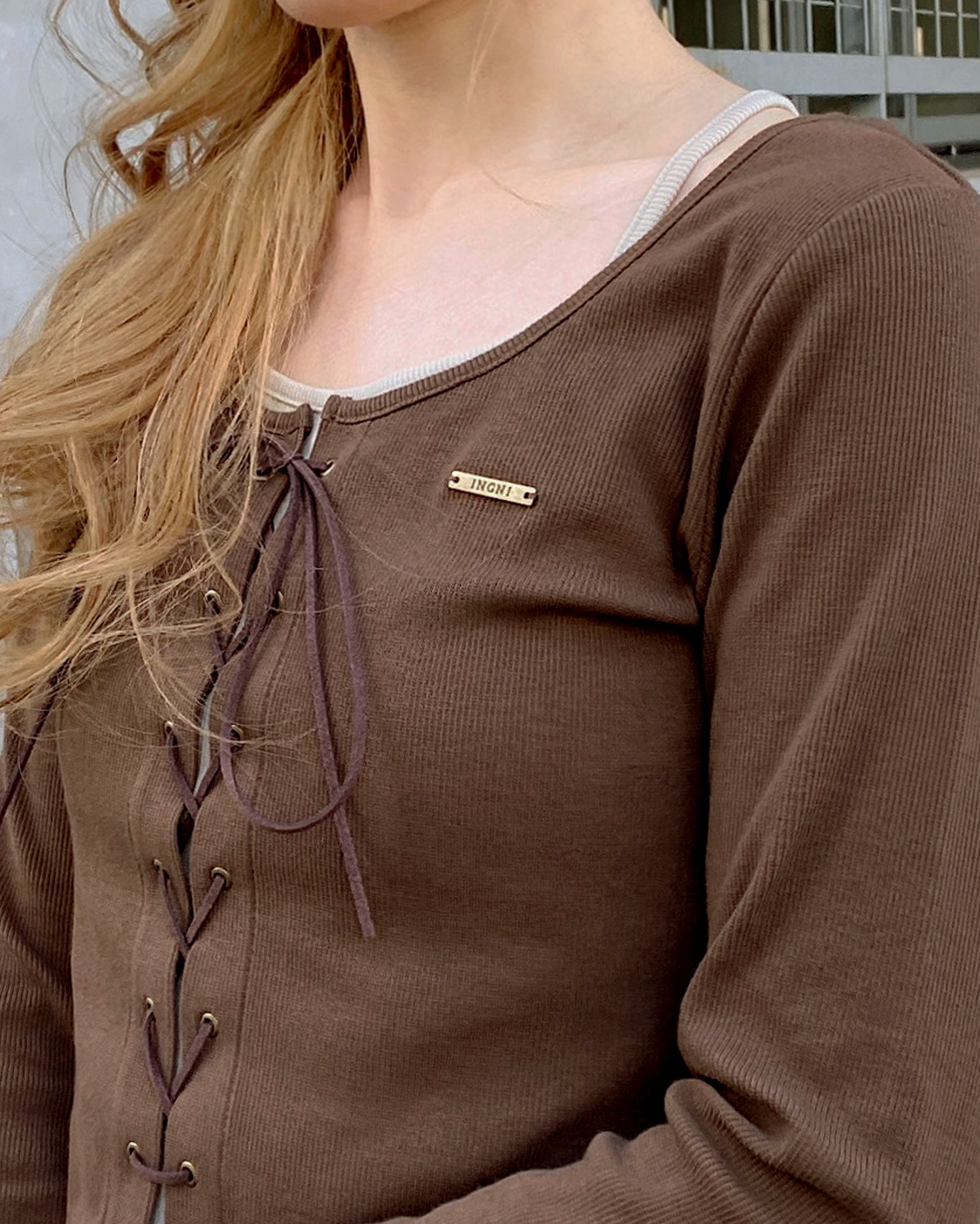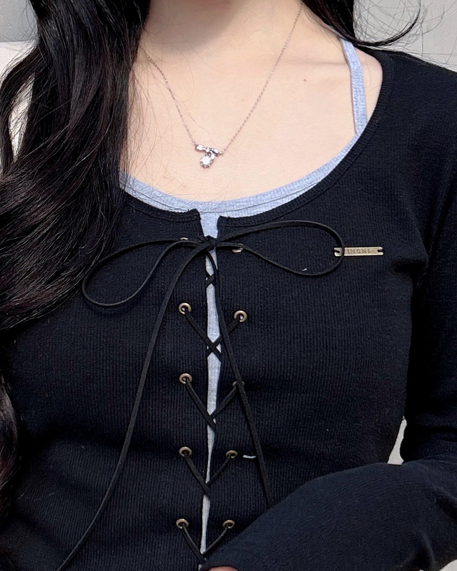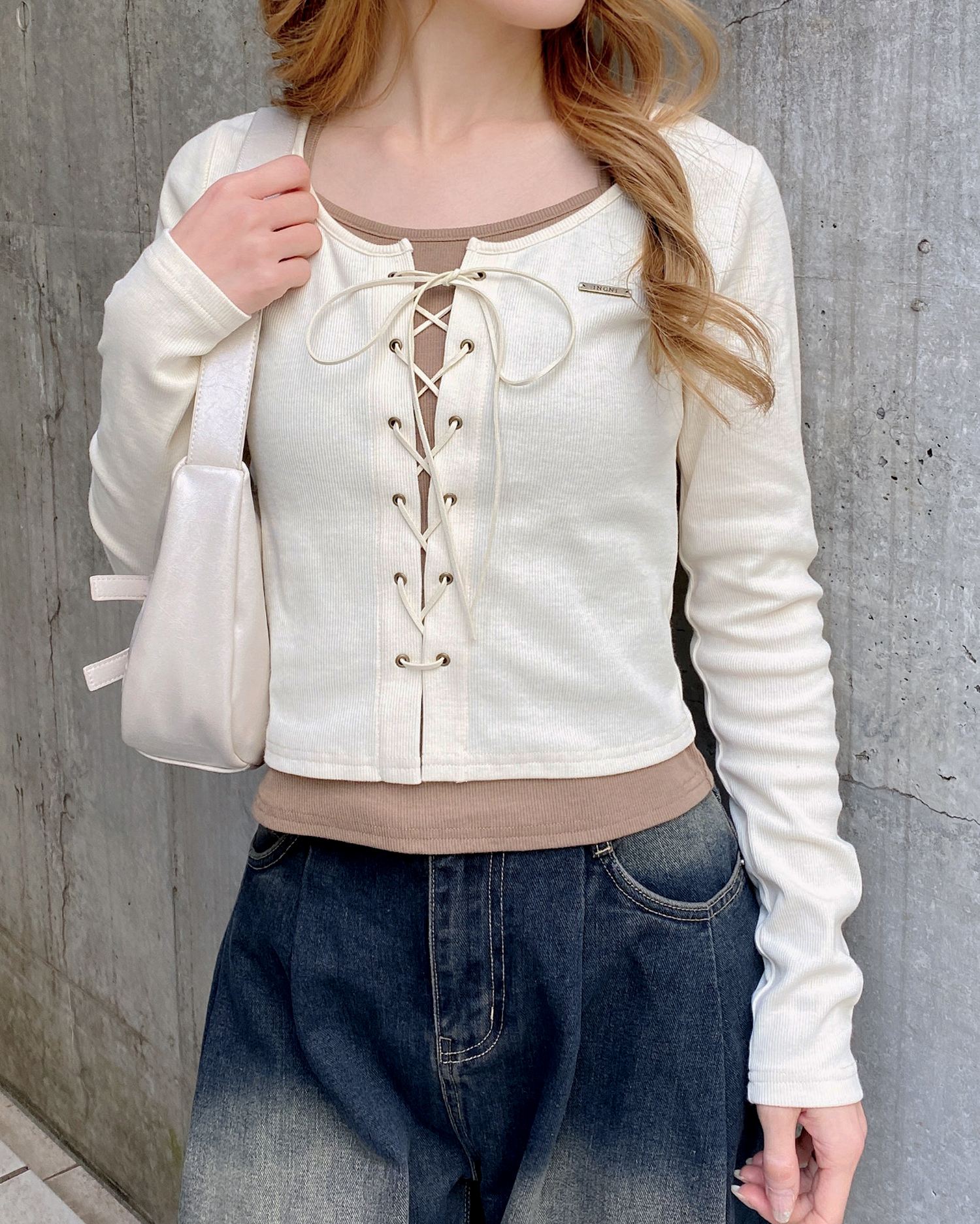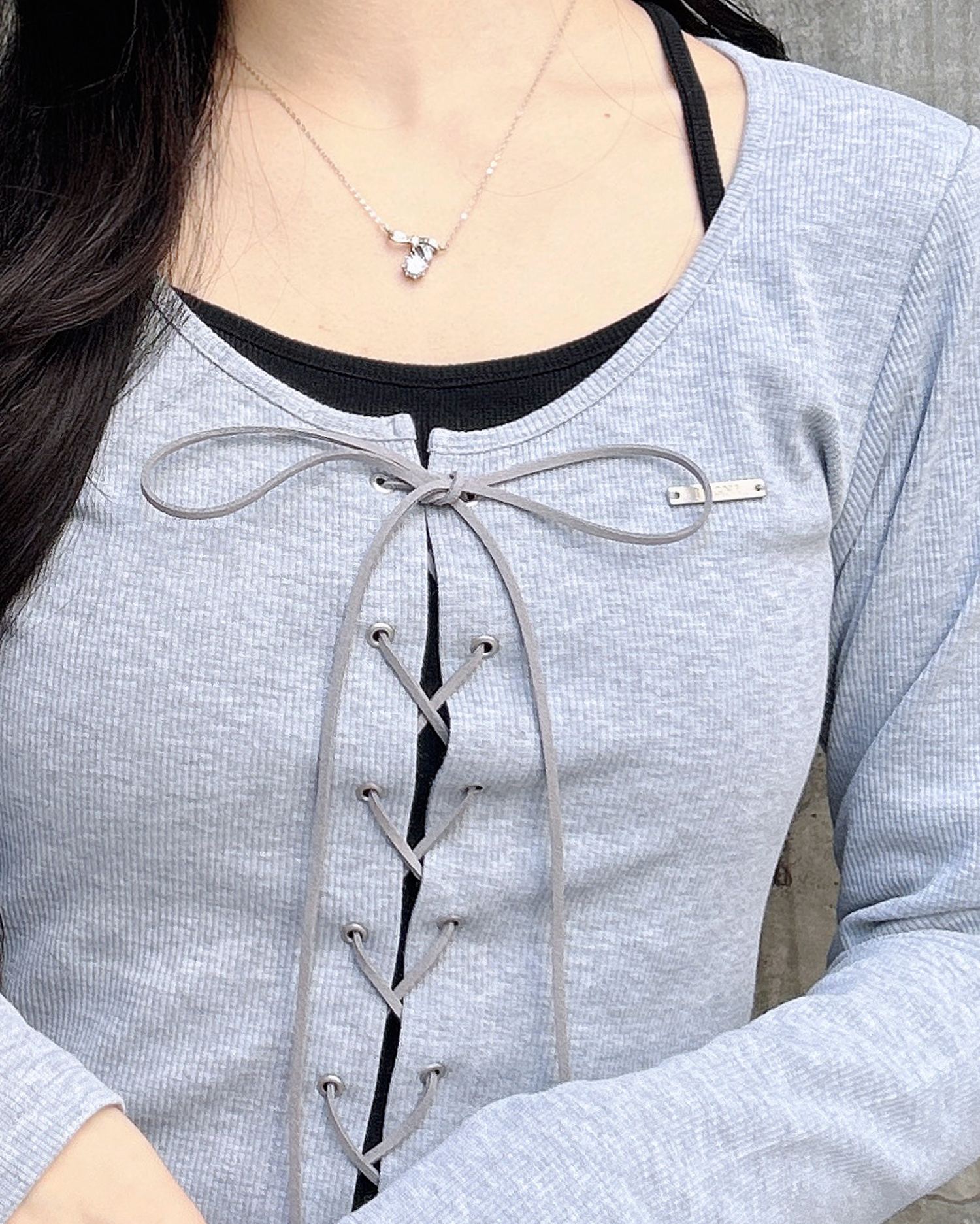 レースアップ&レイヤード風のデザインで表情たっぷりに。