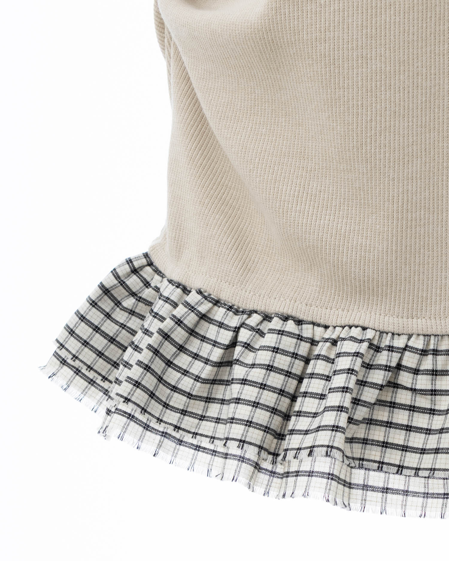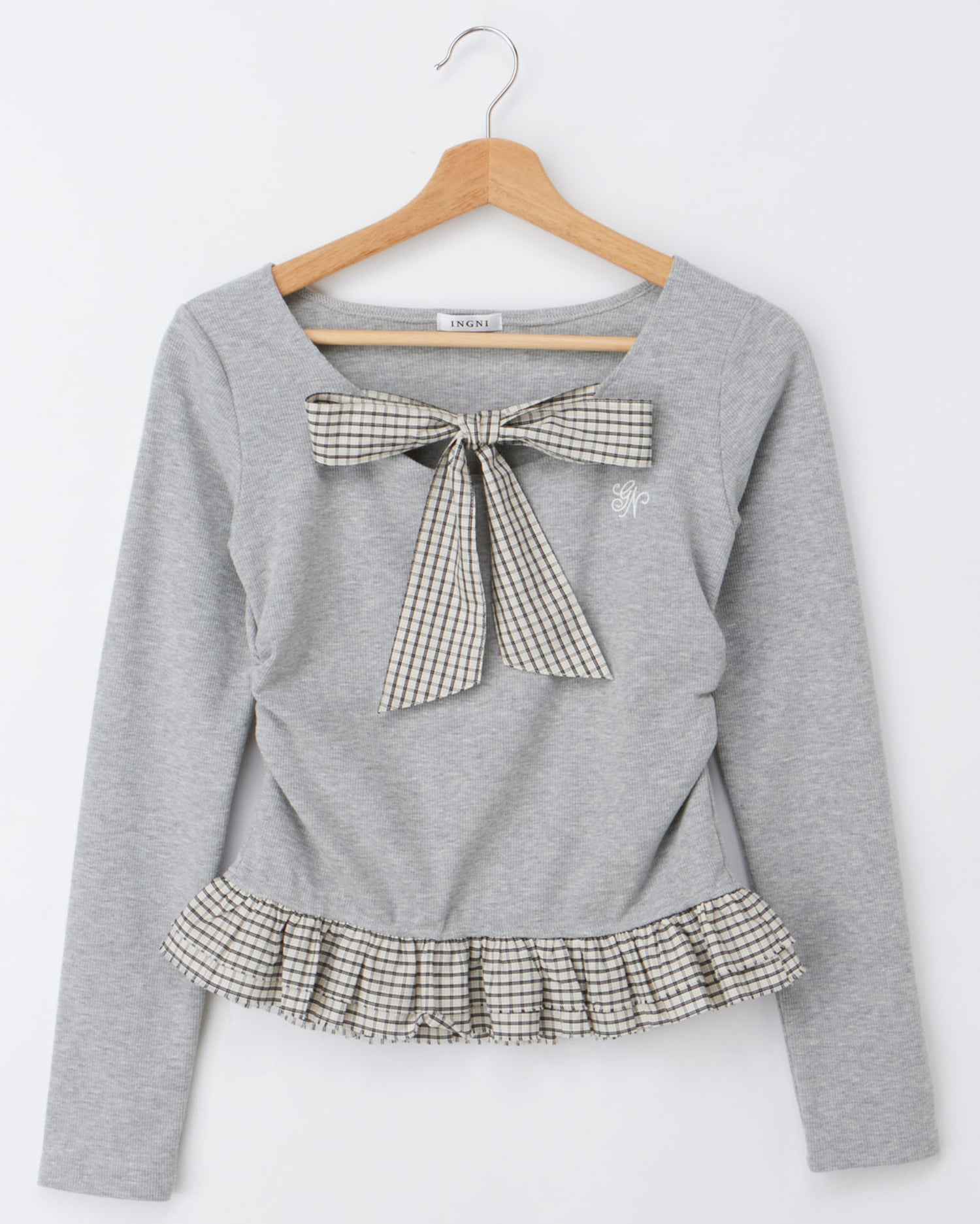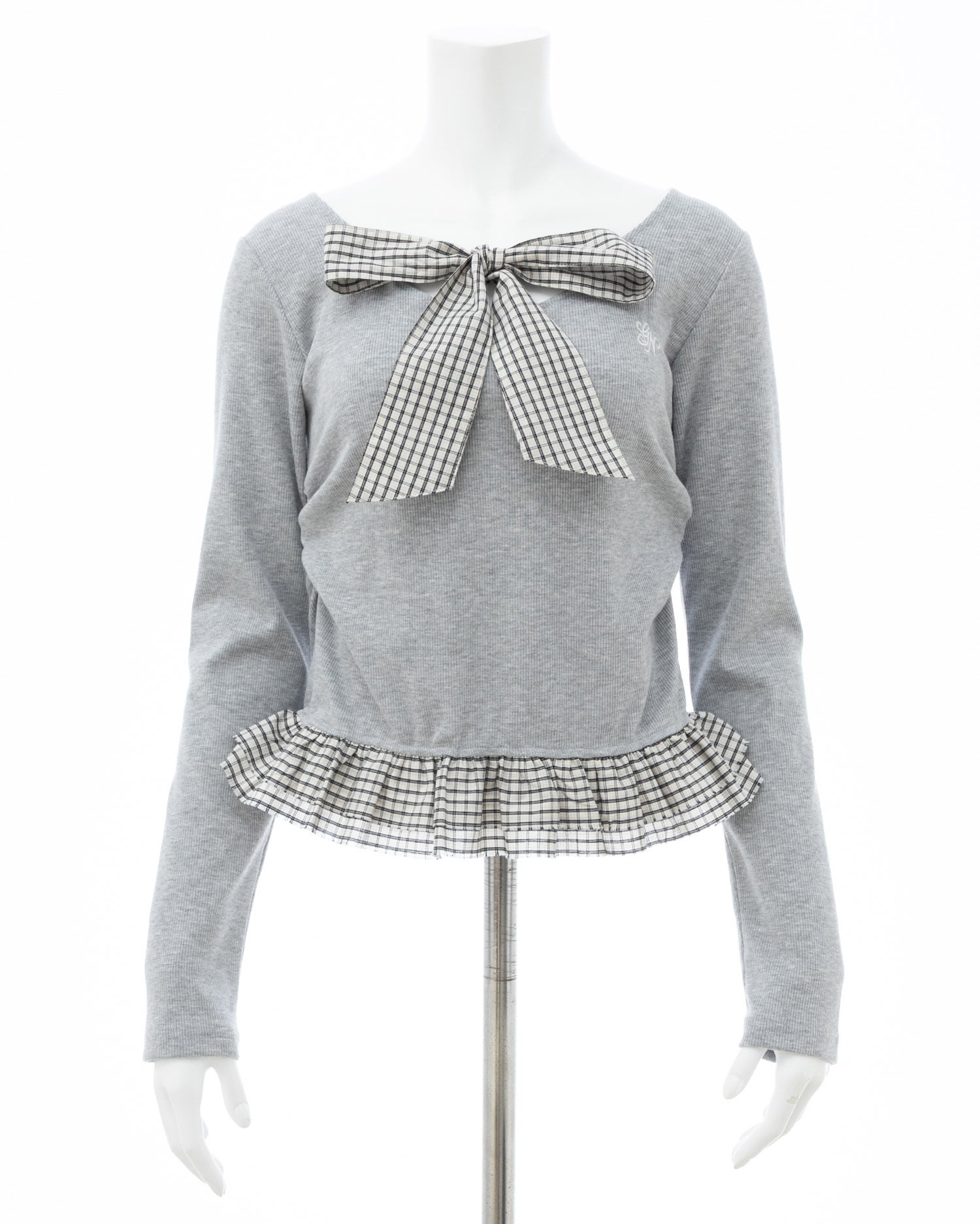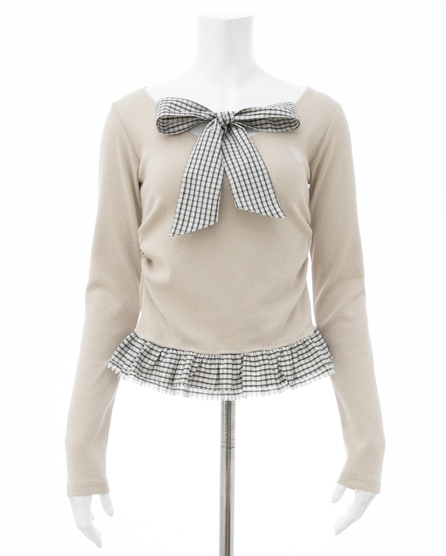 伸縮性抜群のリブカットソーにチェック柄のリボンと裾のフリルでアクセントをプラス。