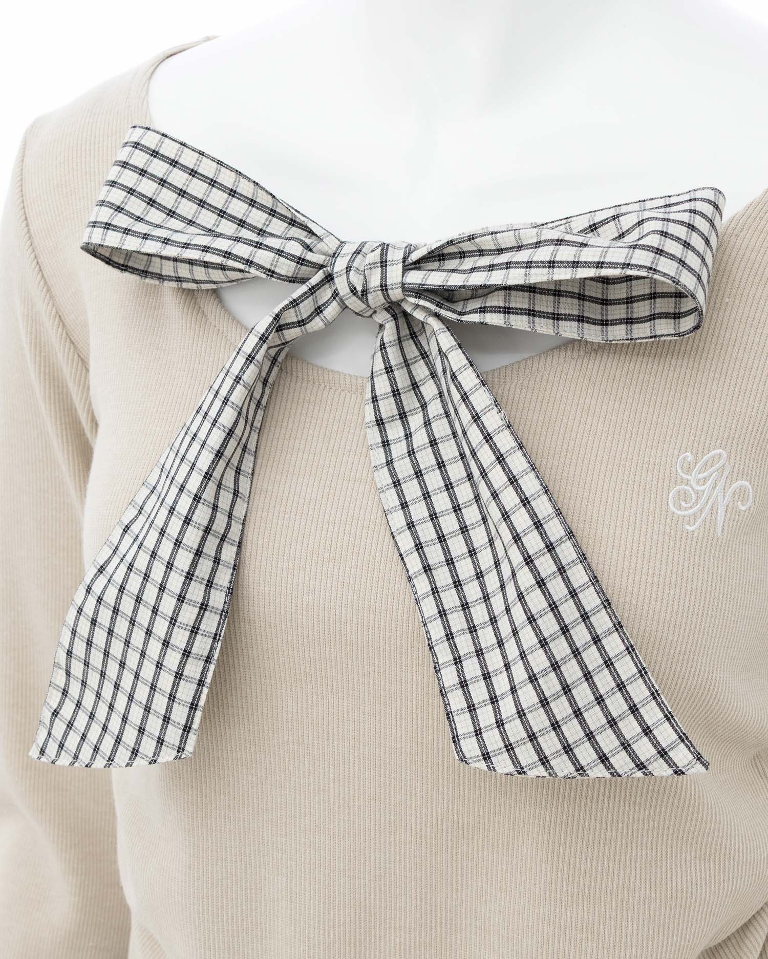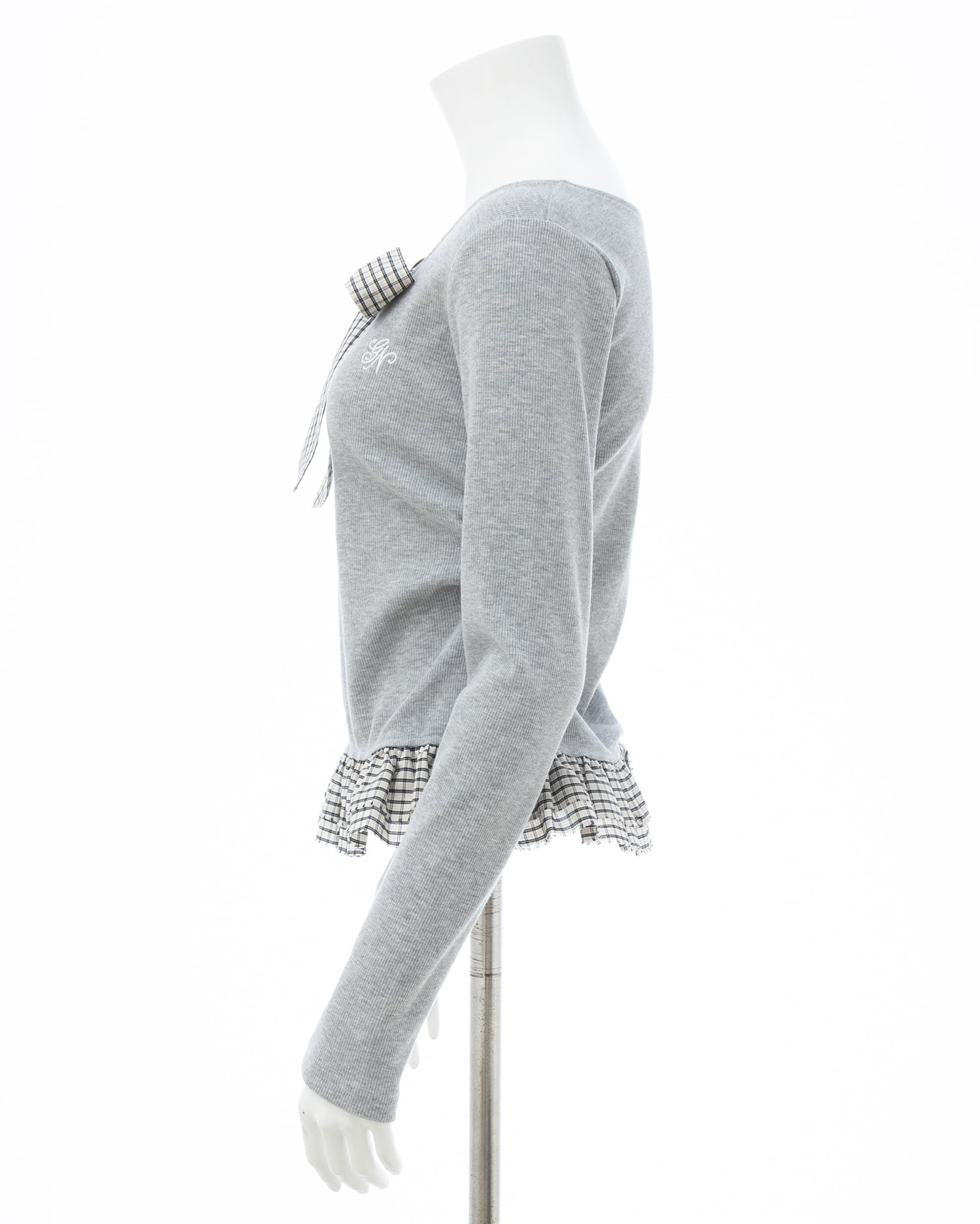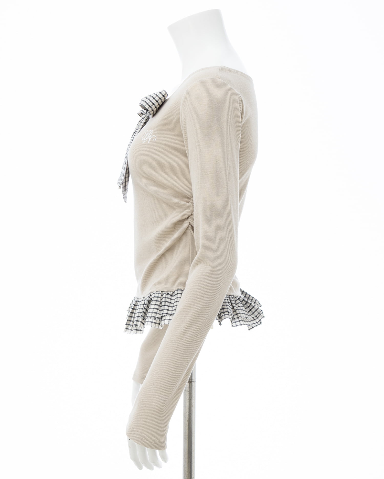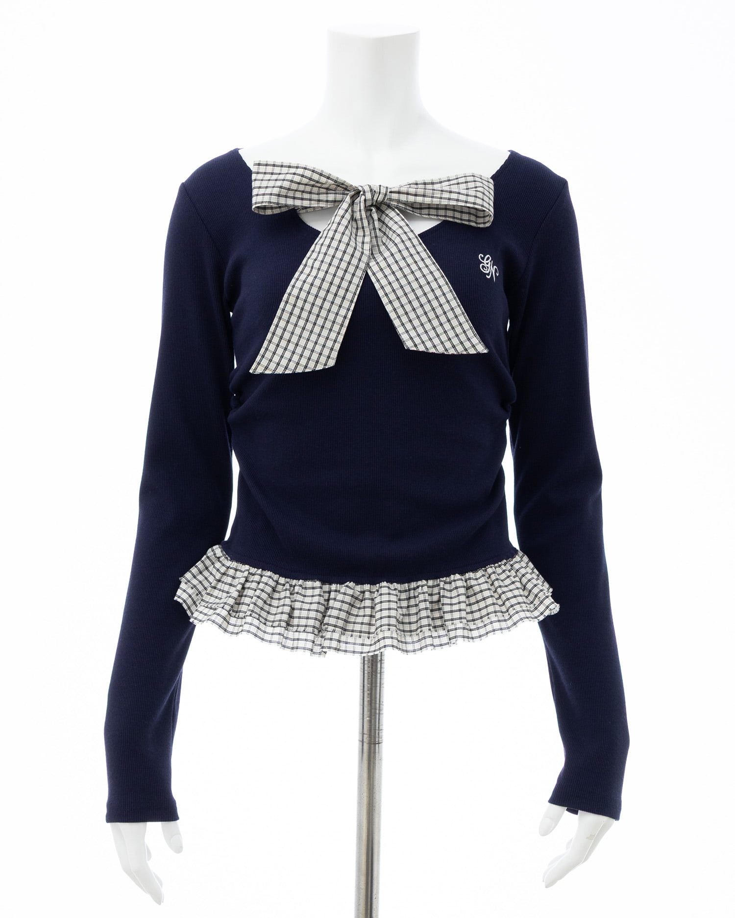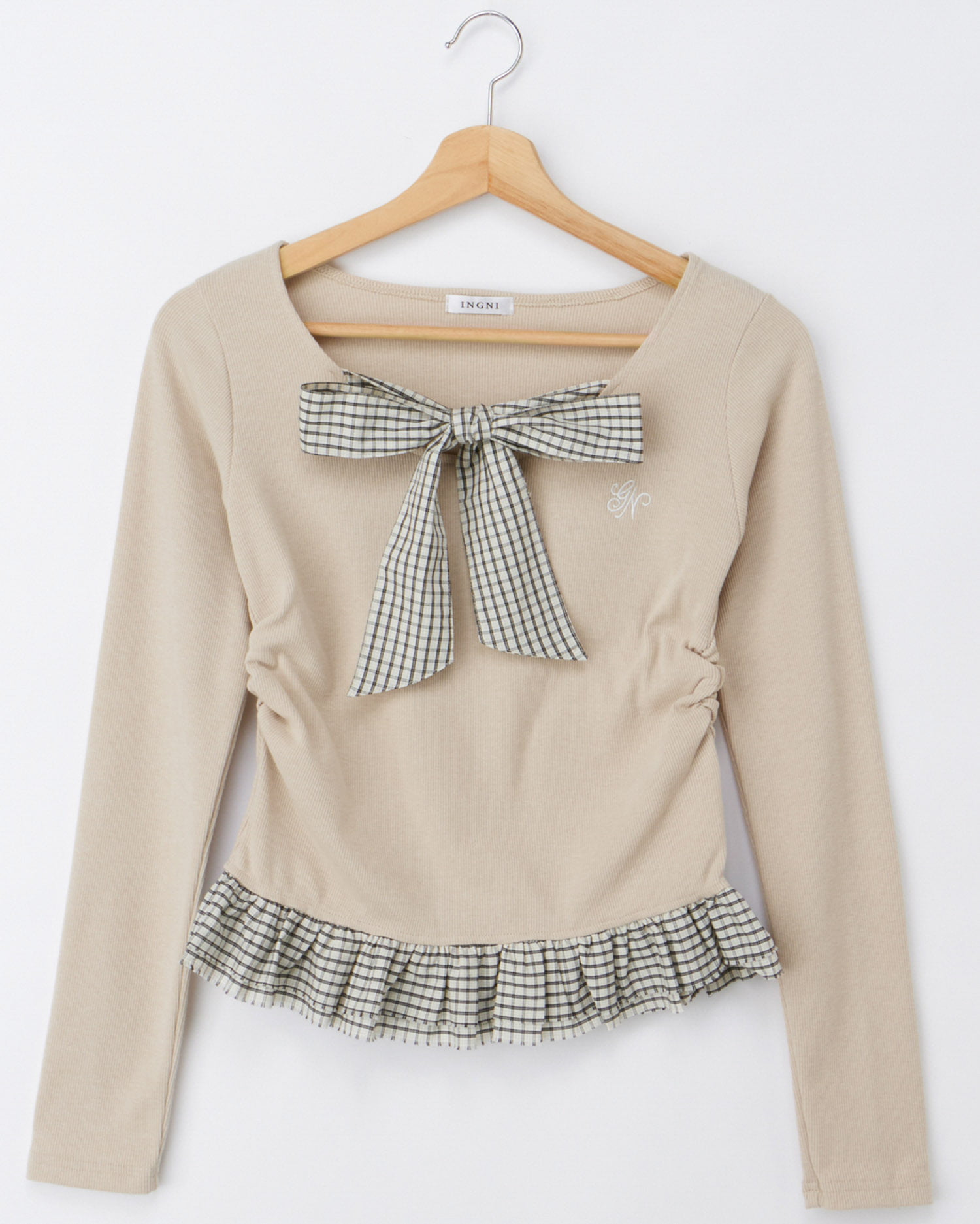 伸縮性抜群のリブカットソーにチェック柄のリボンと裾のフリルでアクセントをプラス。
