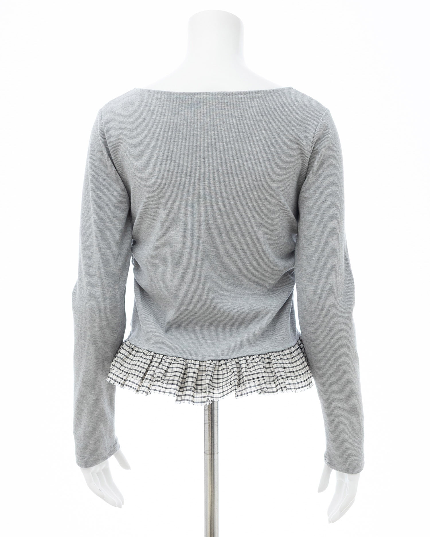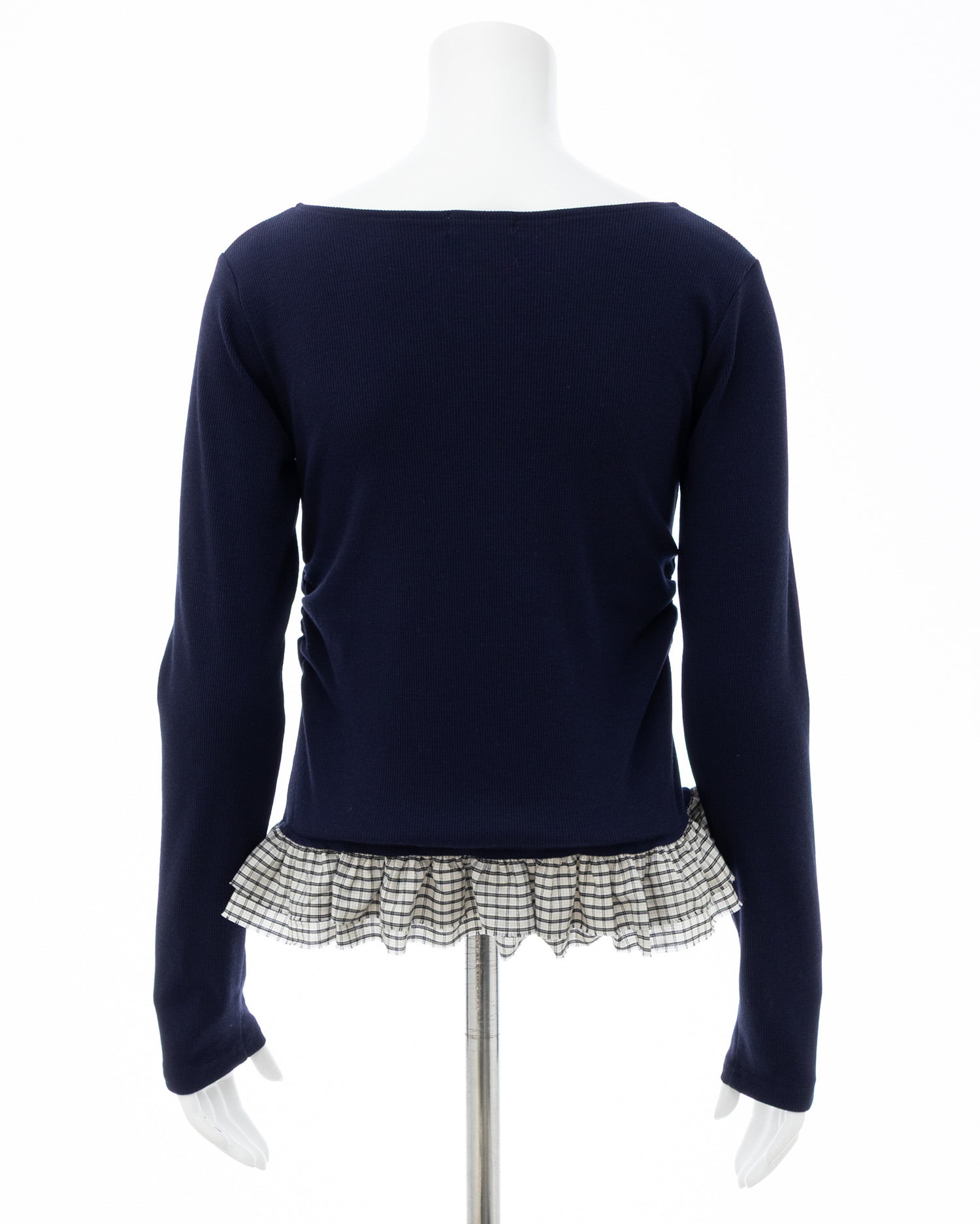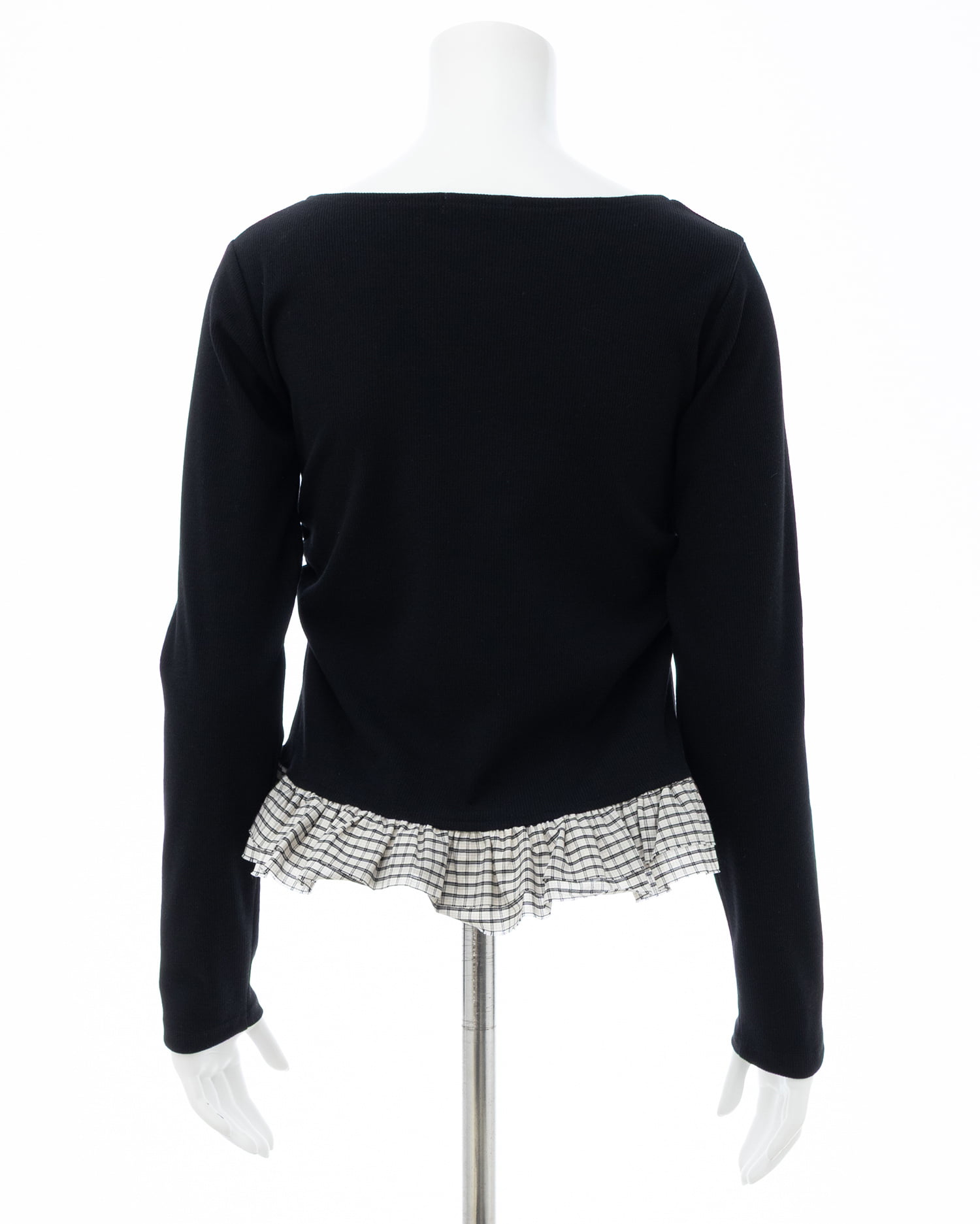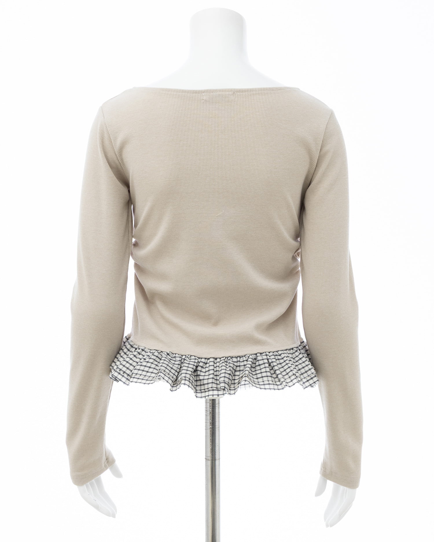 伸縮性抜群のリブカットソーにチェック柄のリボンと裾のフリルでアクセントをプラス。