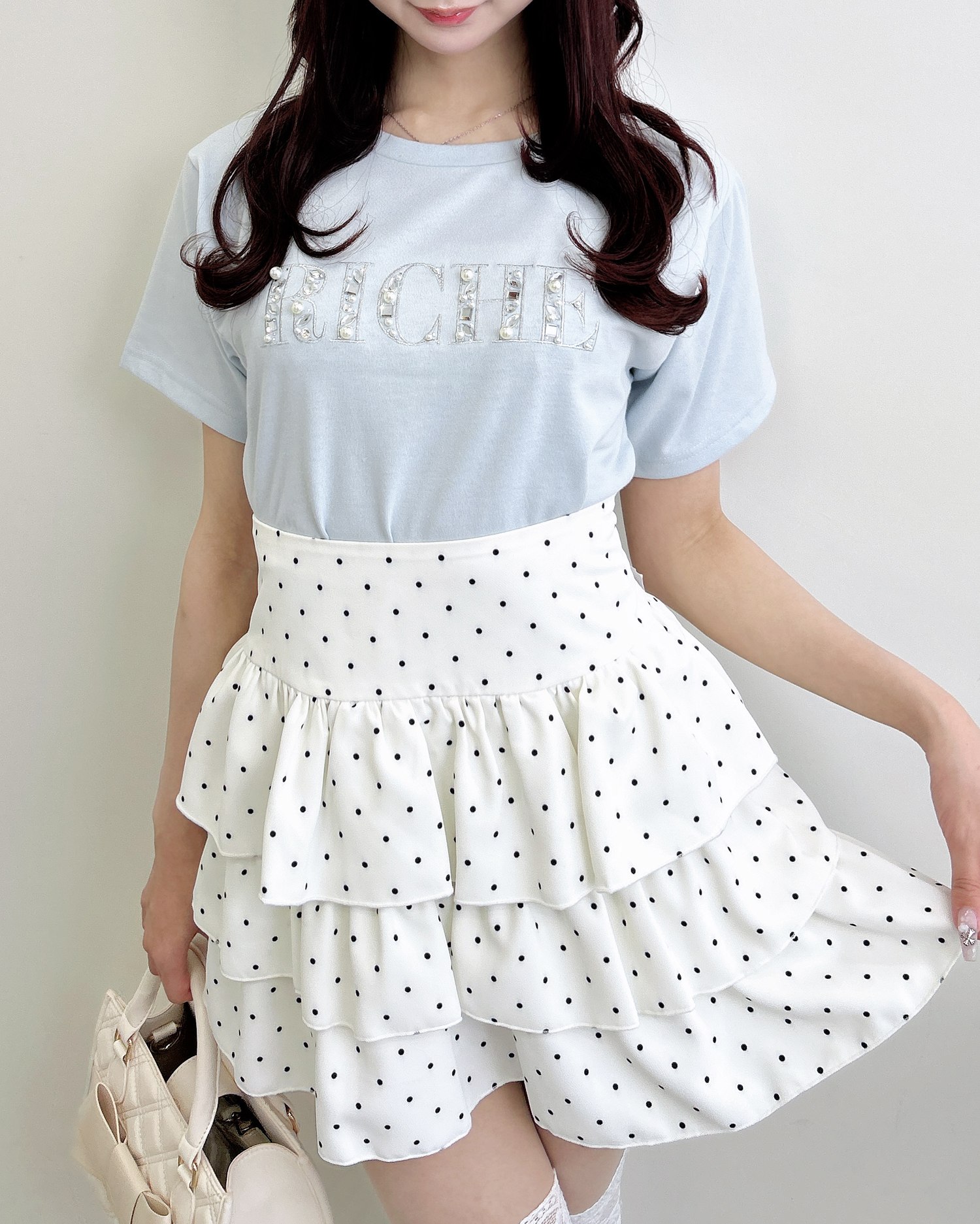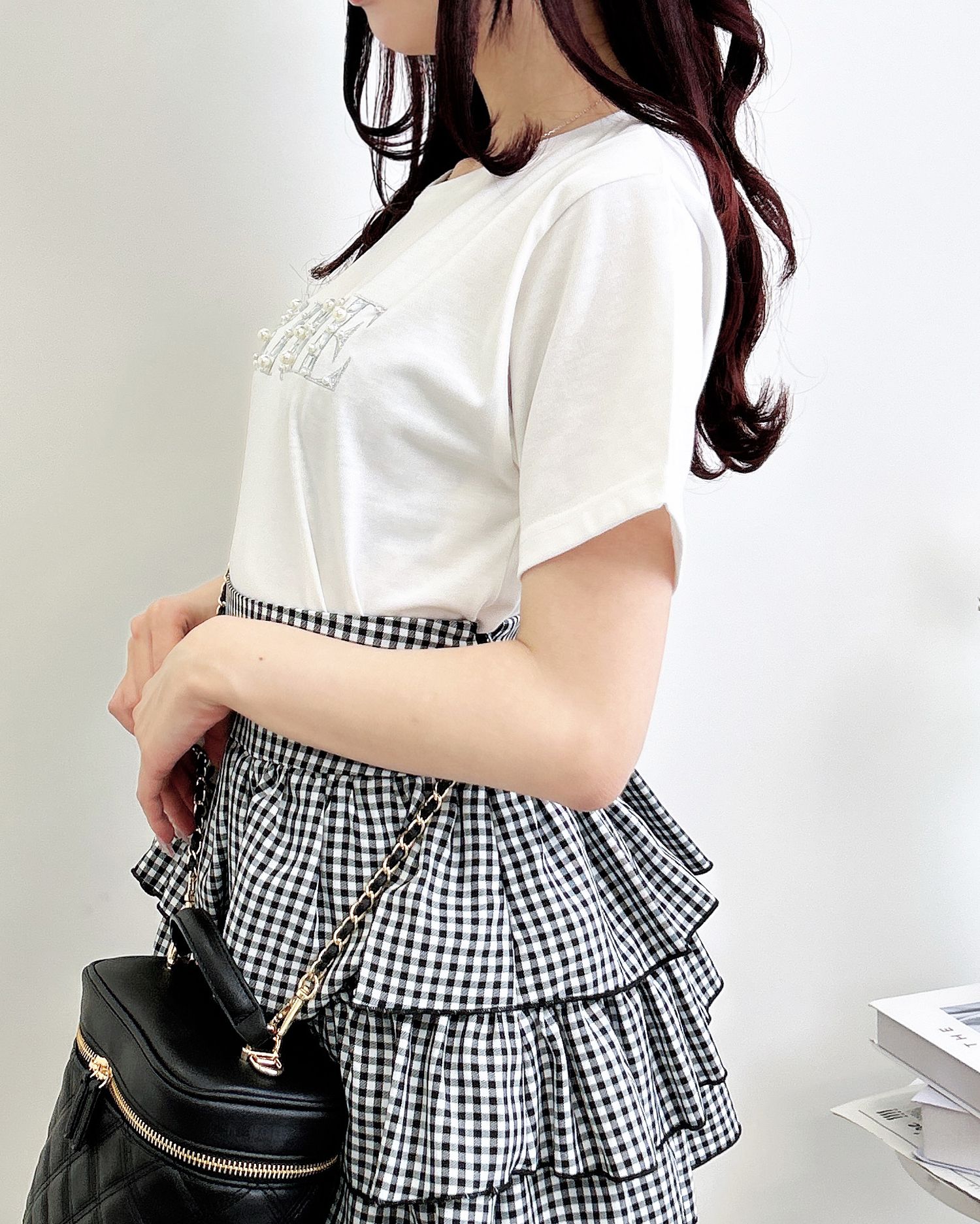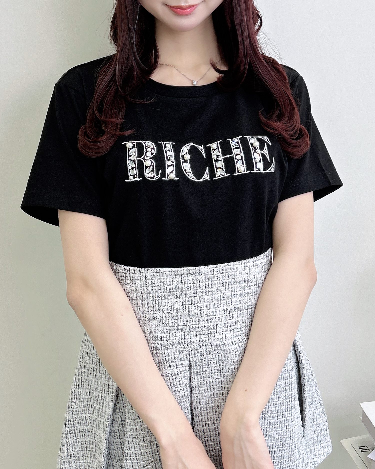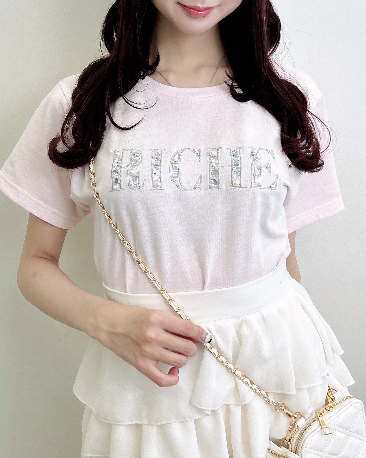 胸元のパールビジューロゴは甘すぎず、大人っぽい印象に仕上げました。