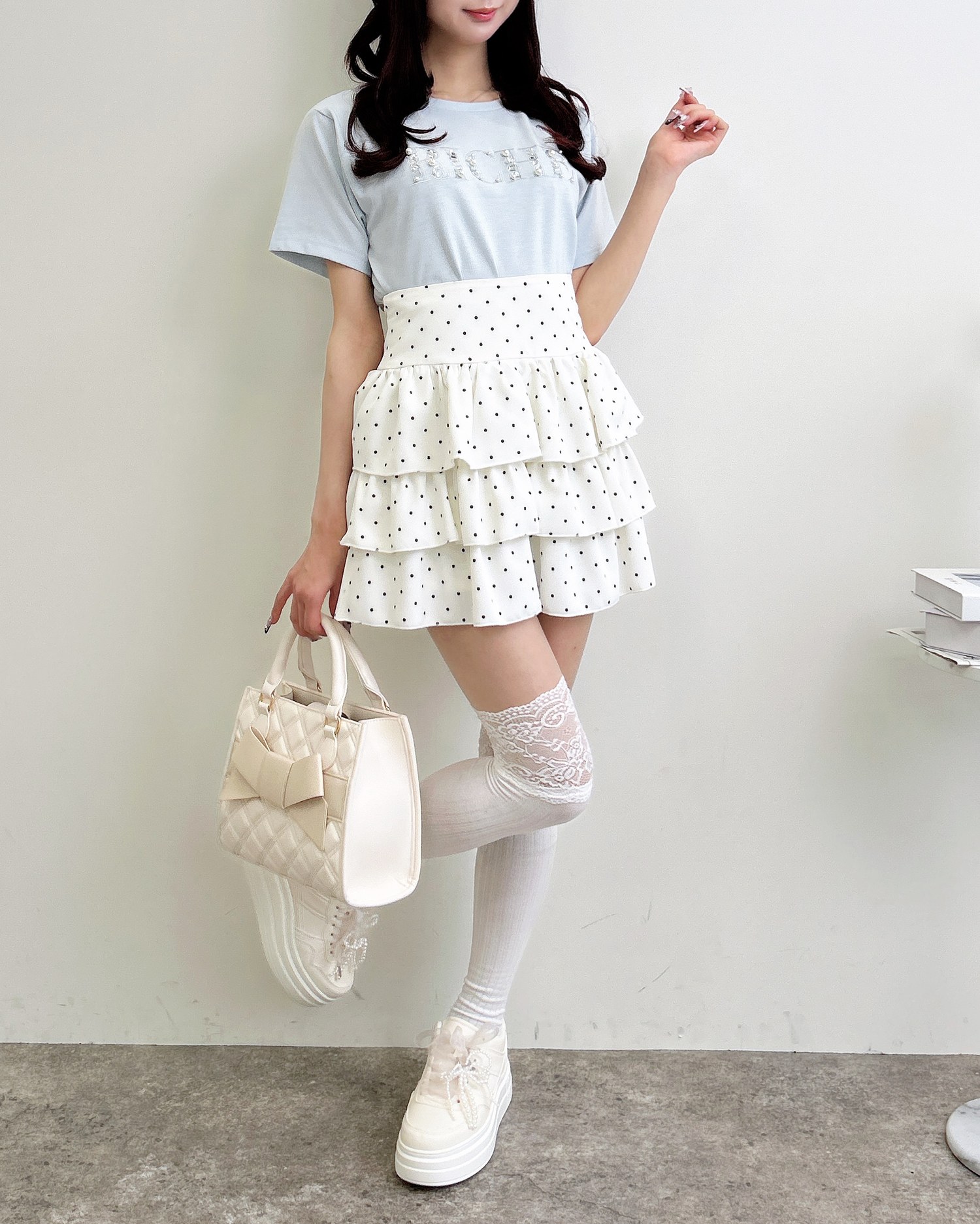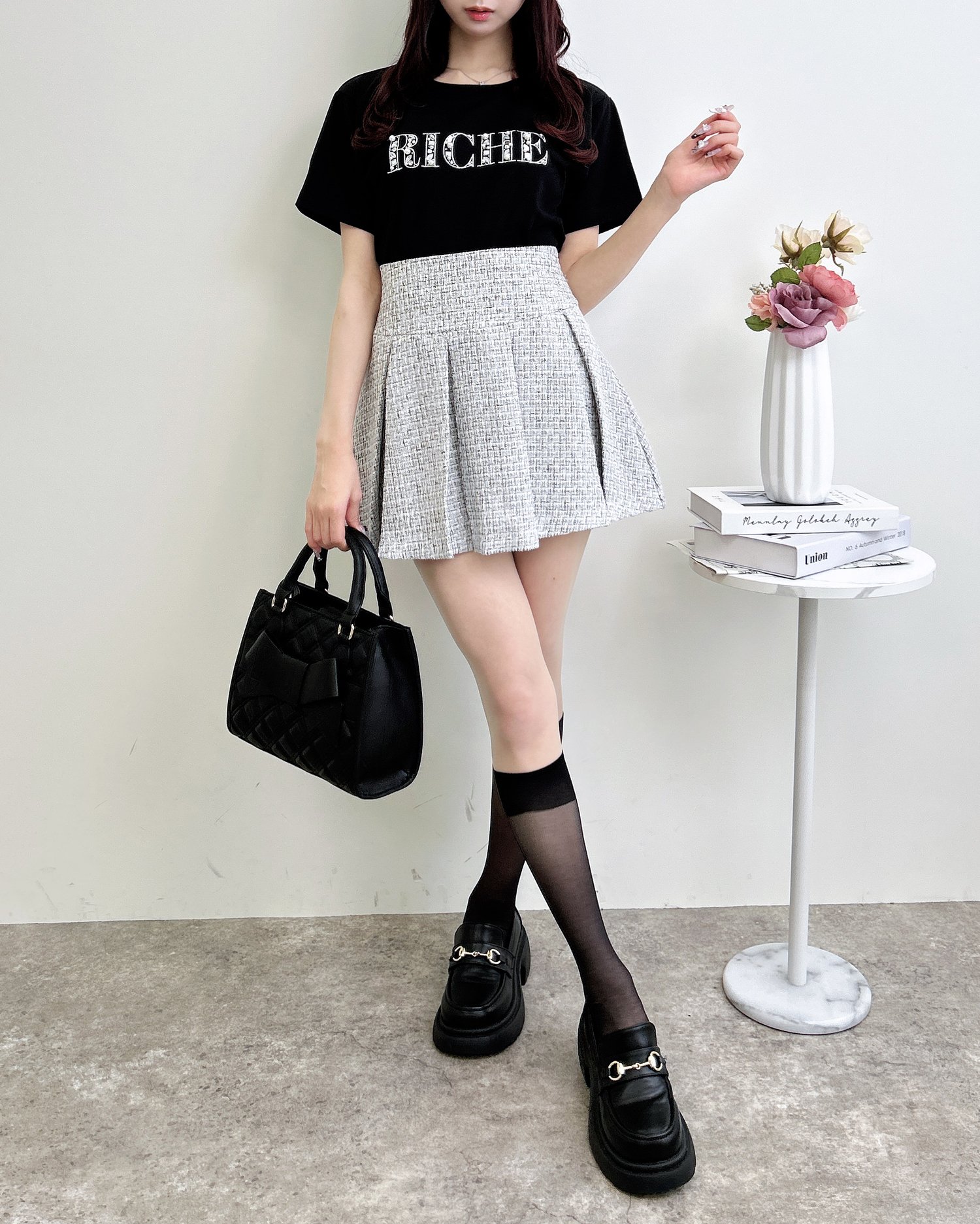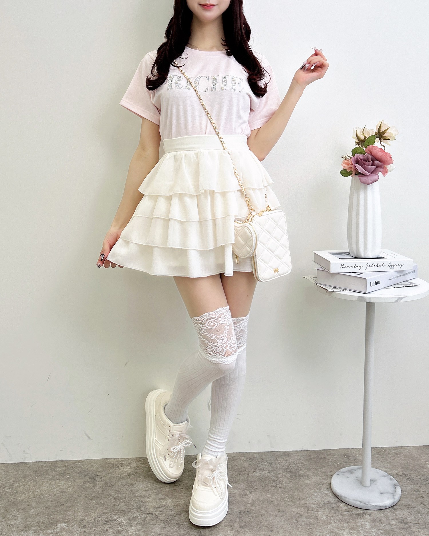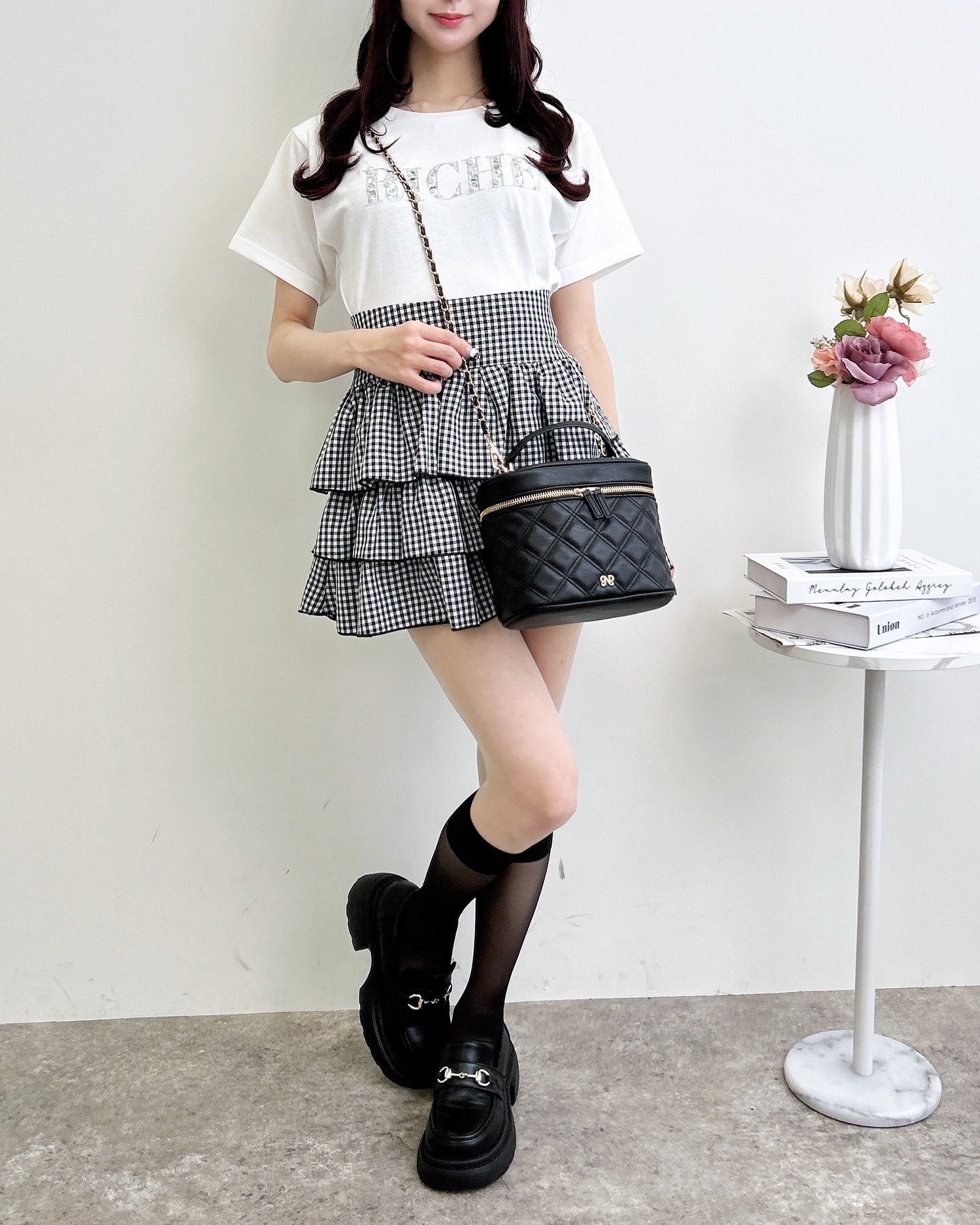 胸元のパールビジューロゴは甘すぎず、大人っぽい印象に仕上げました。