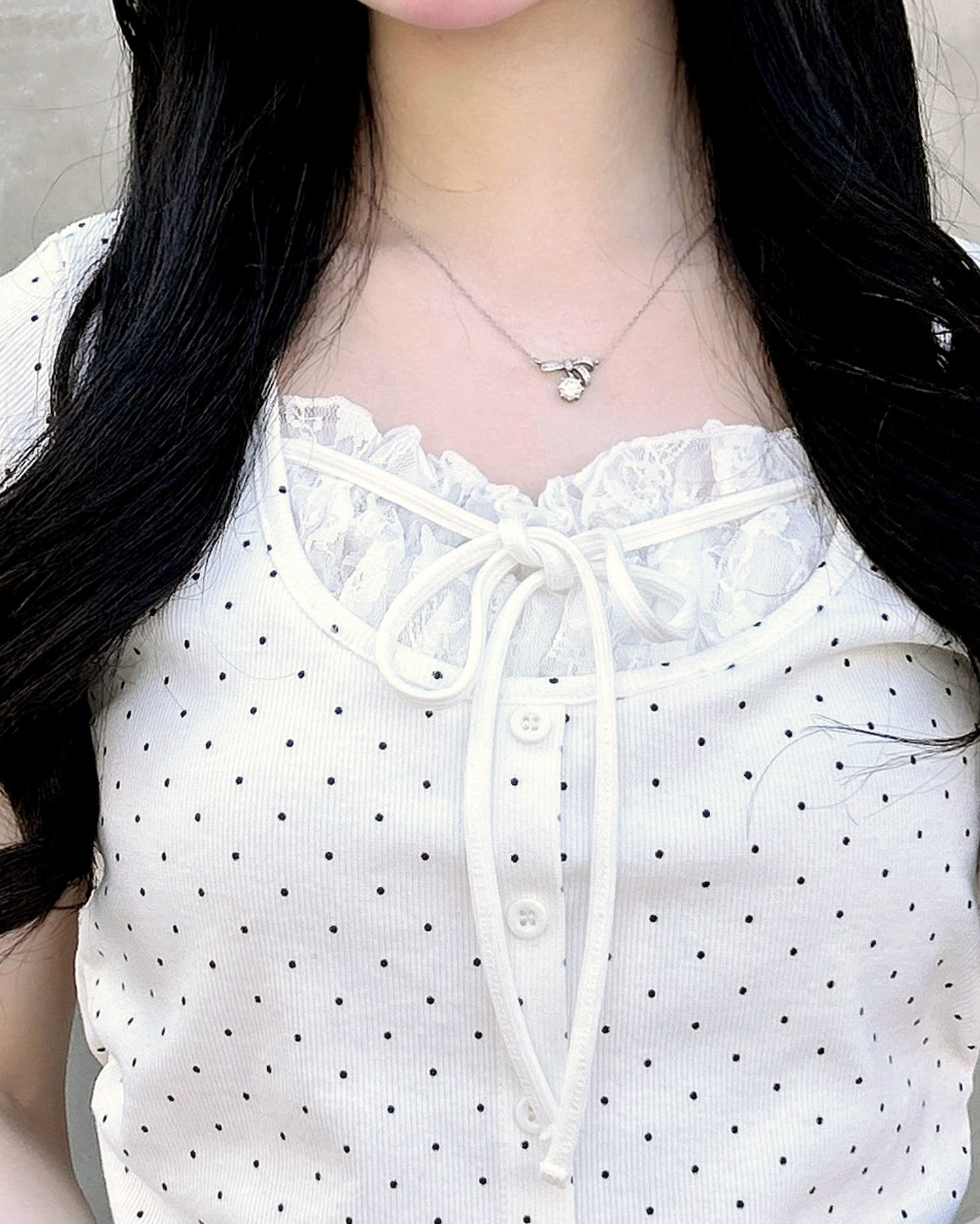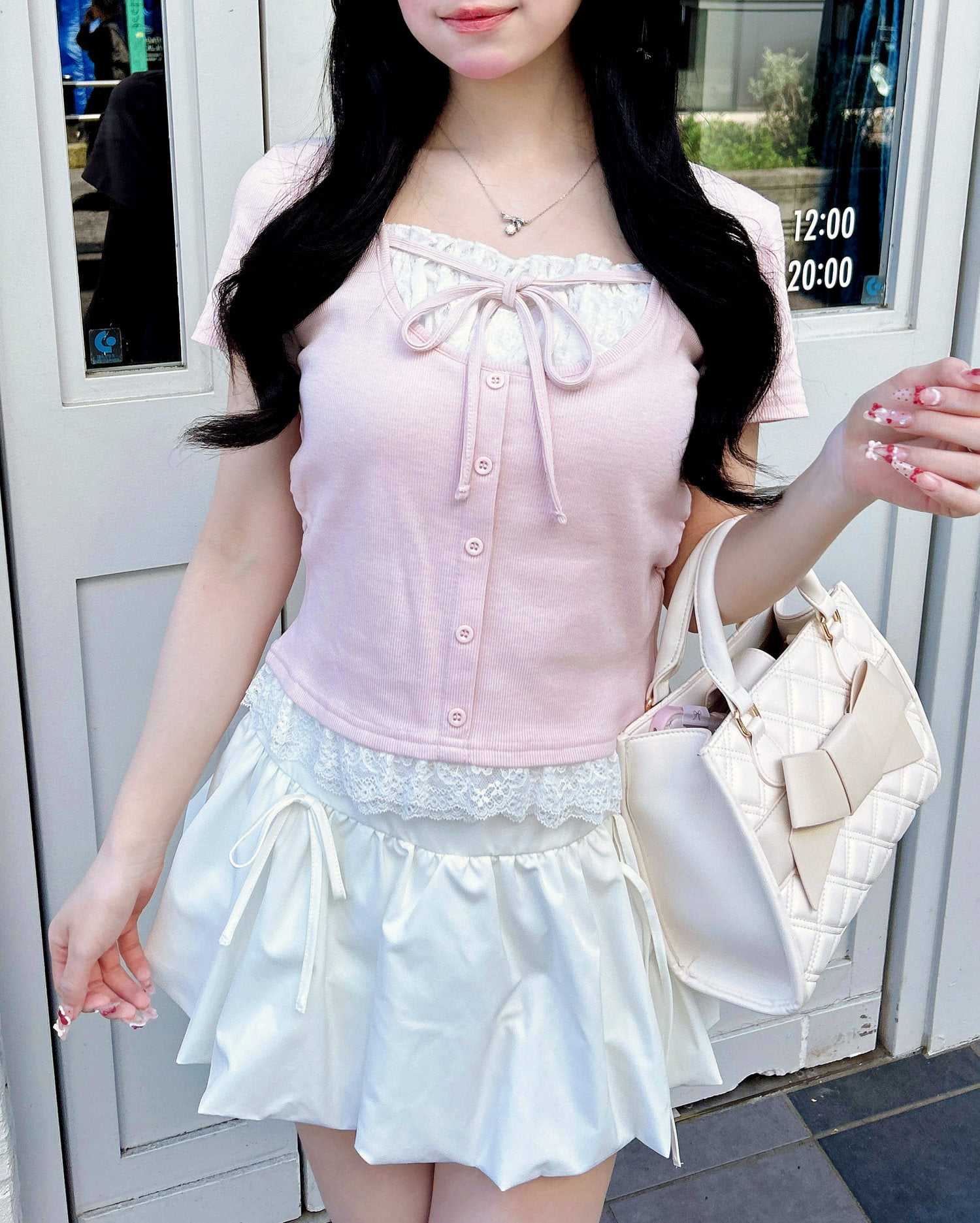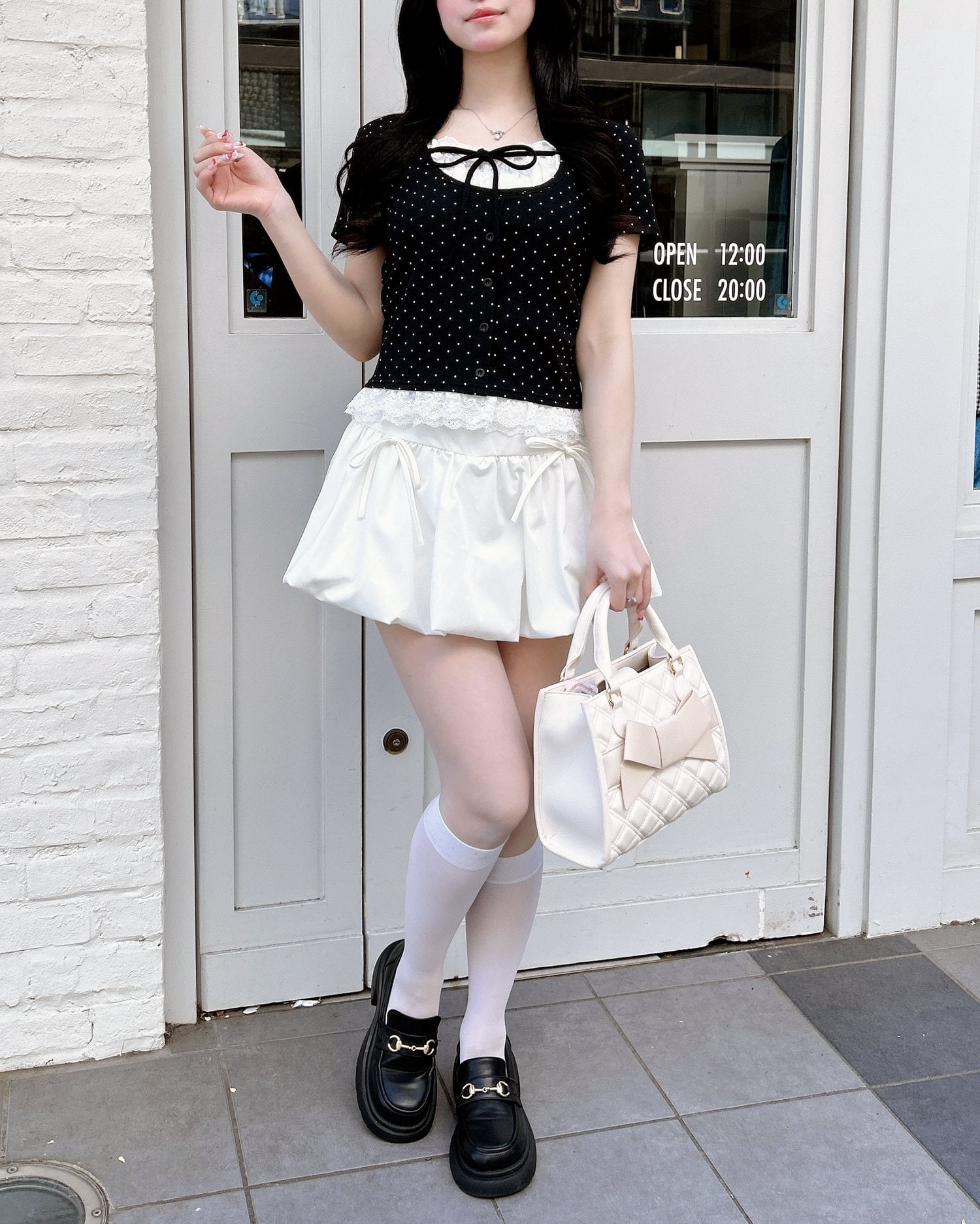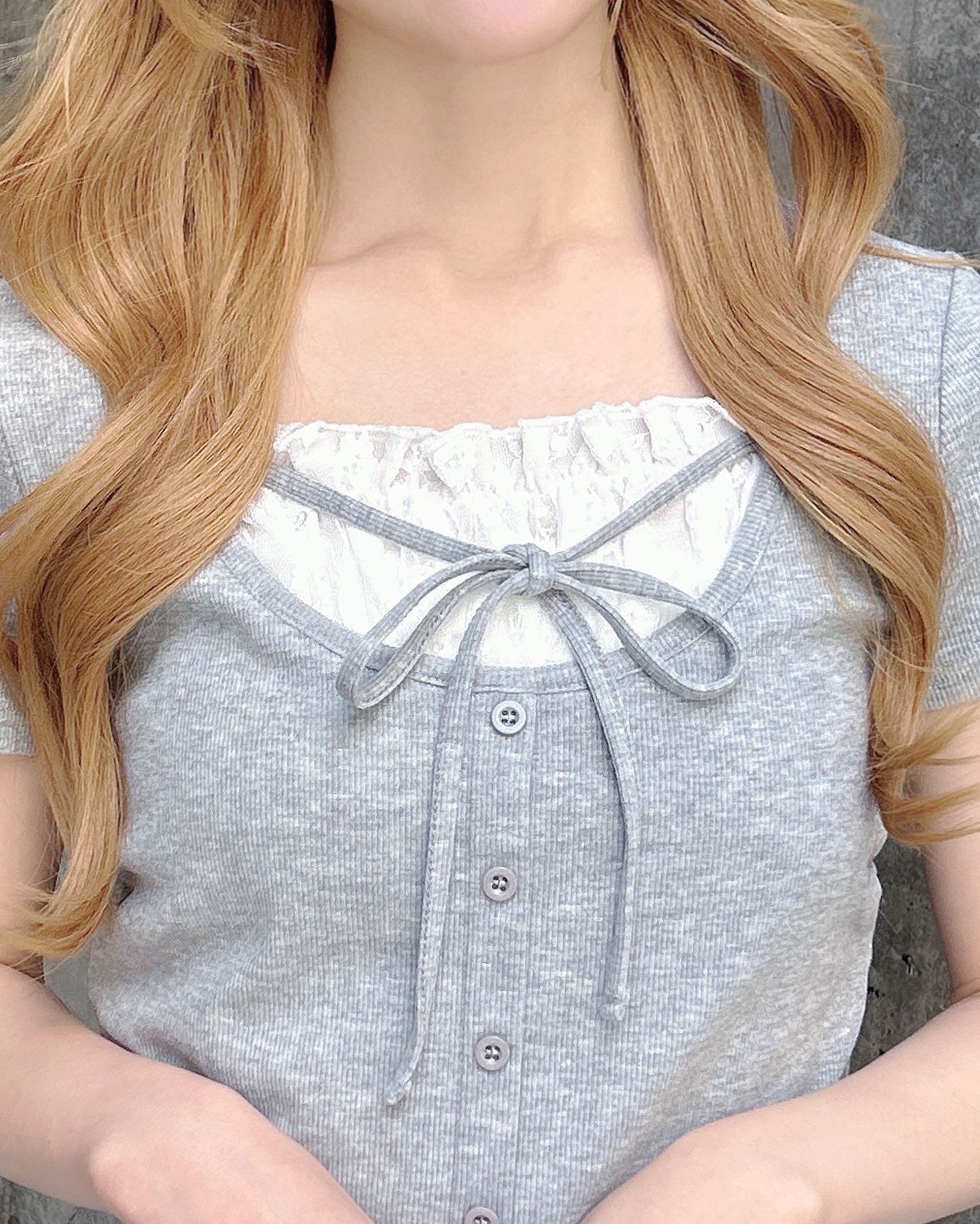 胸元と裾には繊細なレースをあしらってフェミニンなアクセントに。