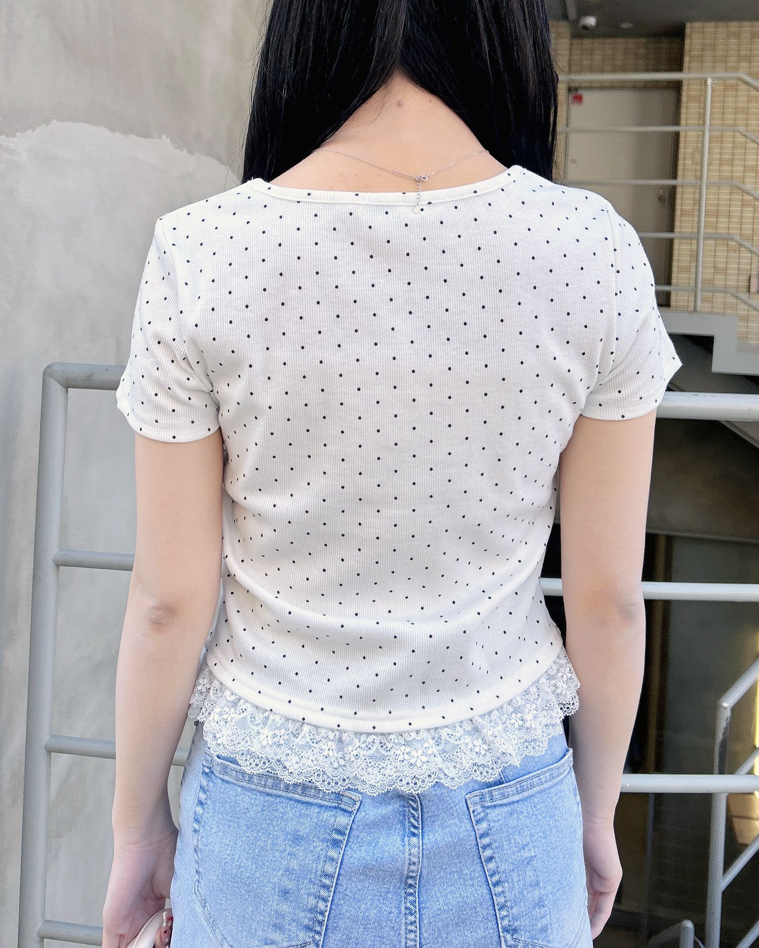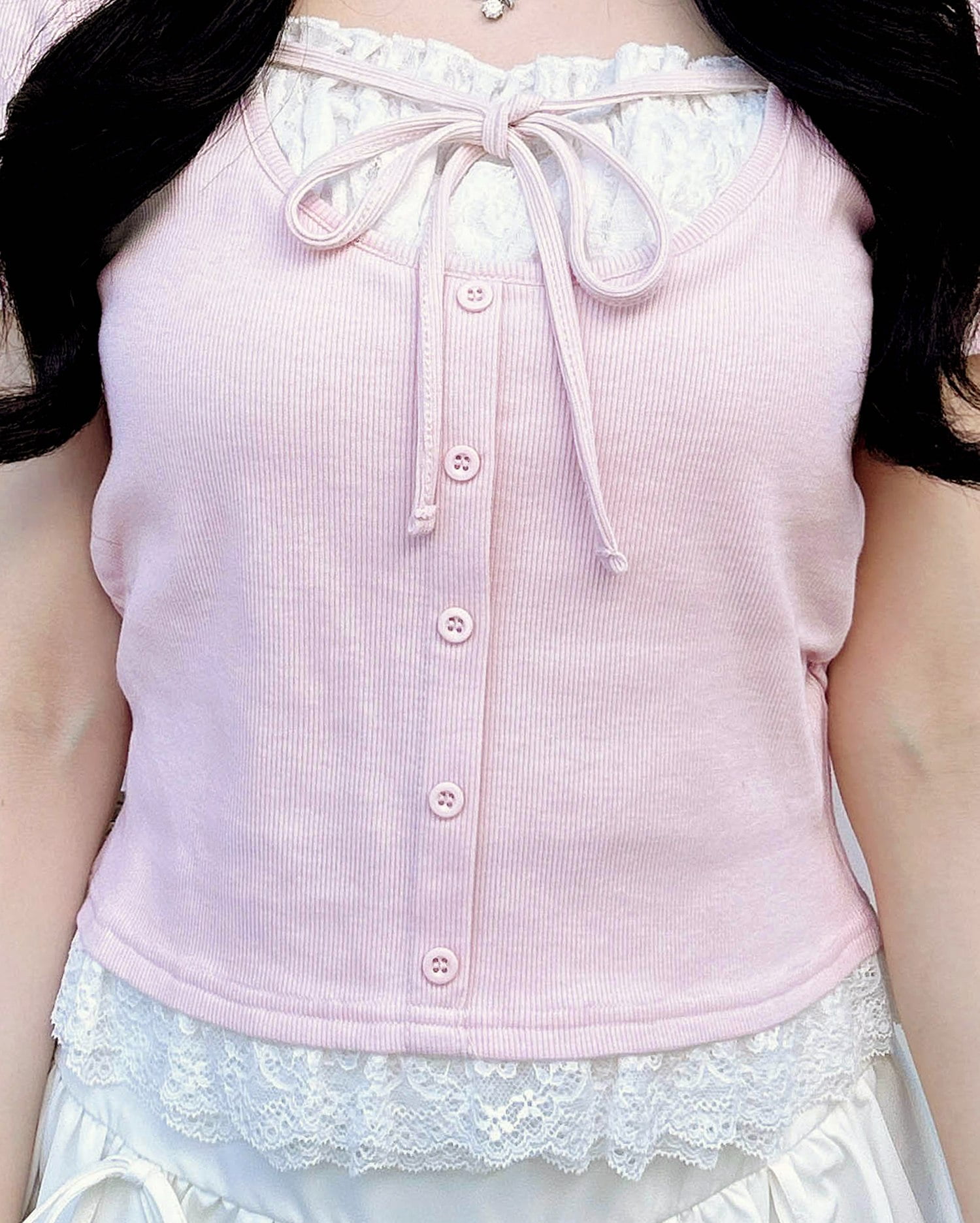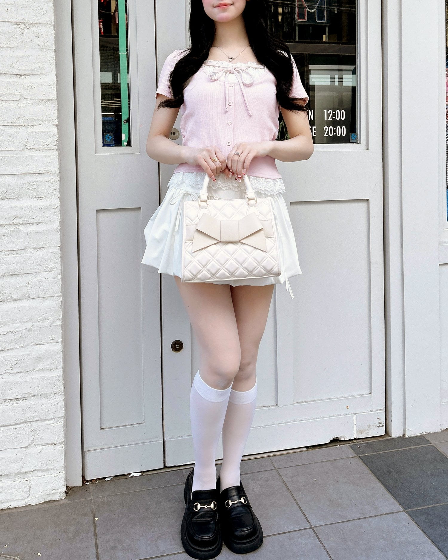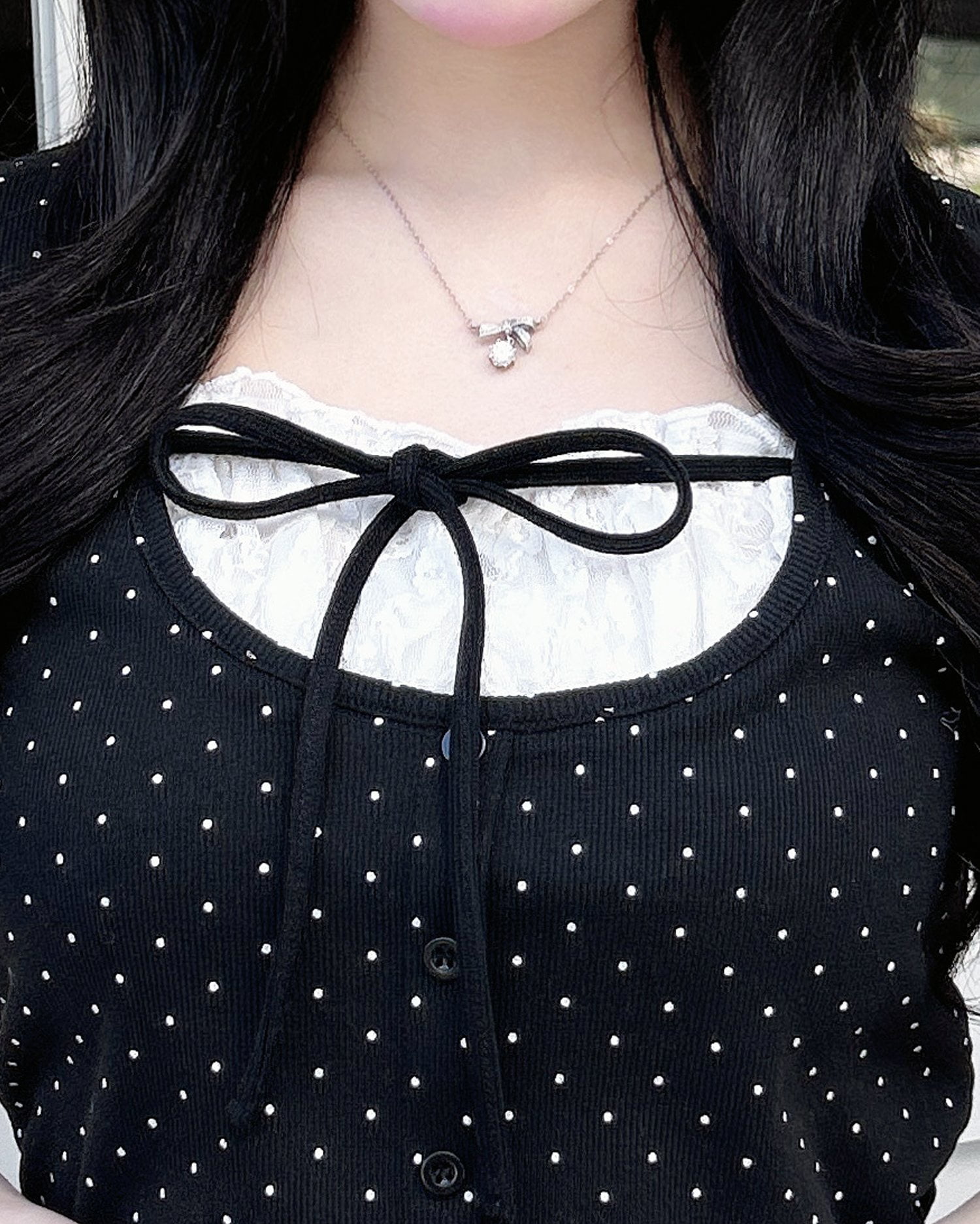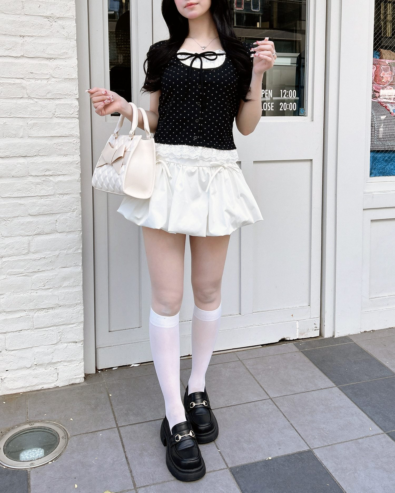 胸元と裾には繊細なレースをあしらってフェミニンなアクセントに。