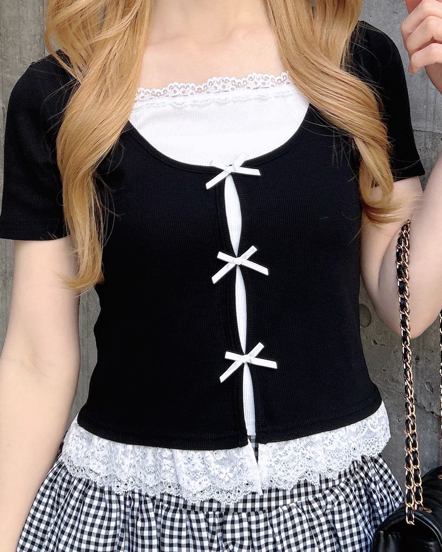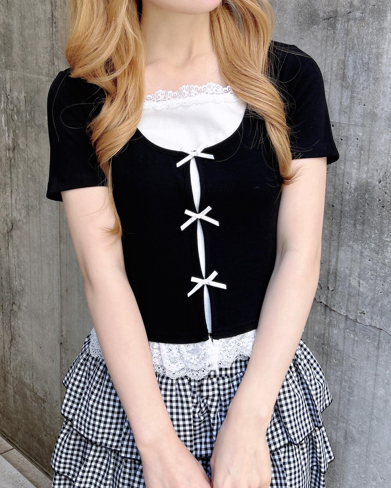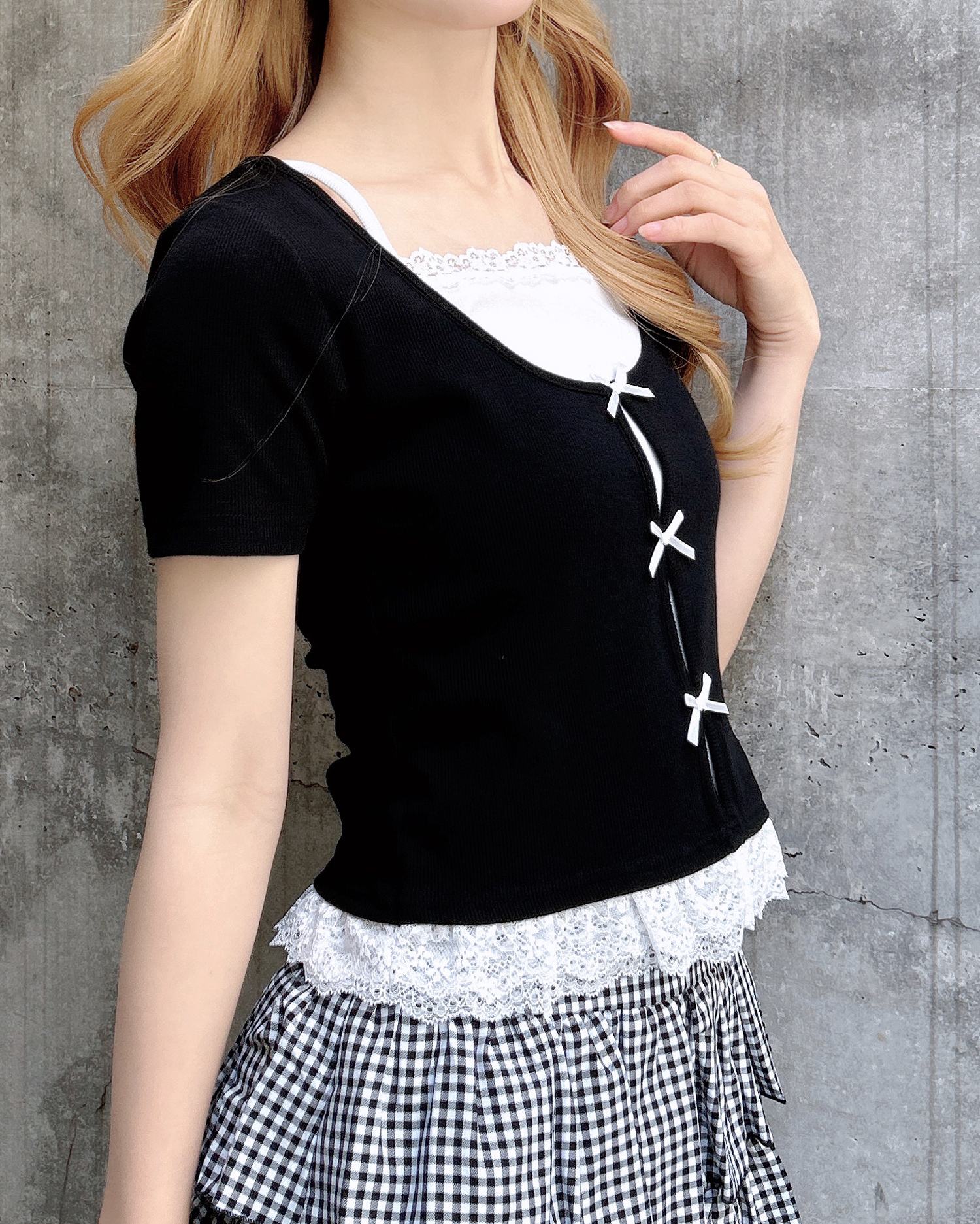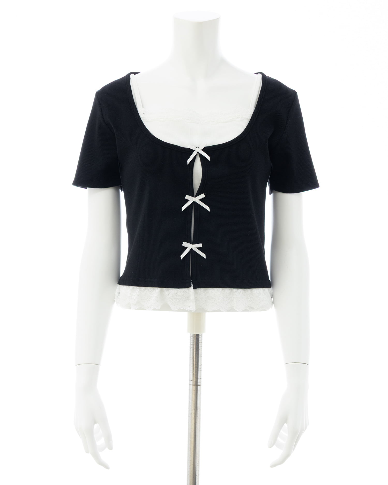 • INGNI(イング) レイヤード前リボンリブトップス クロ