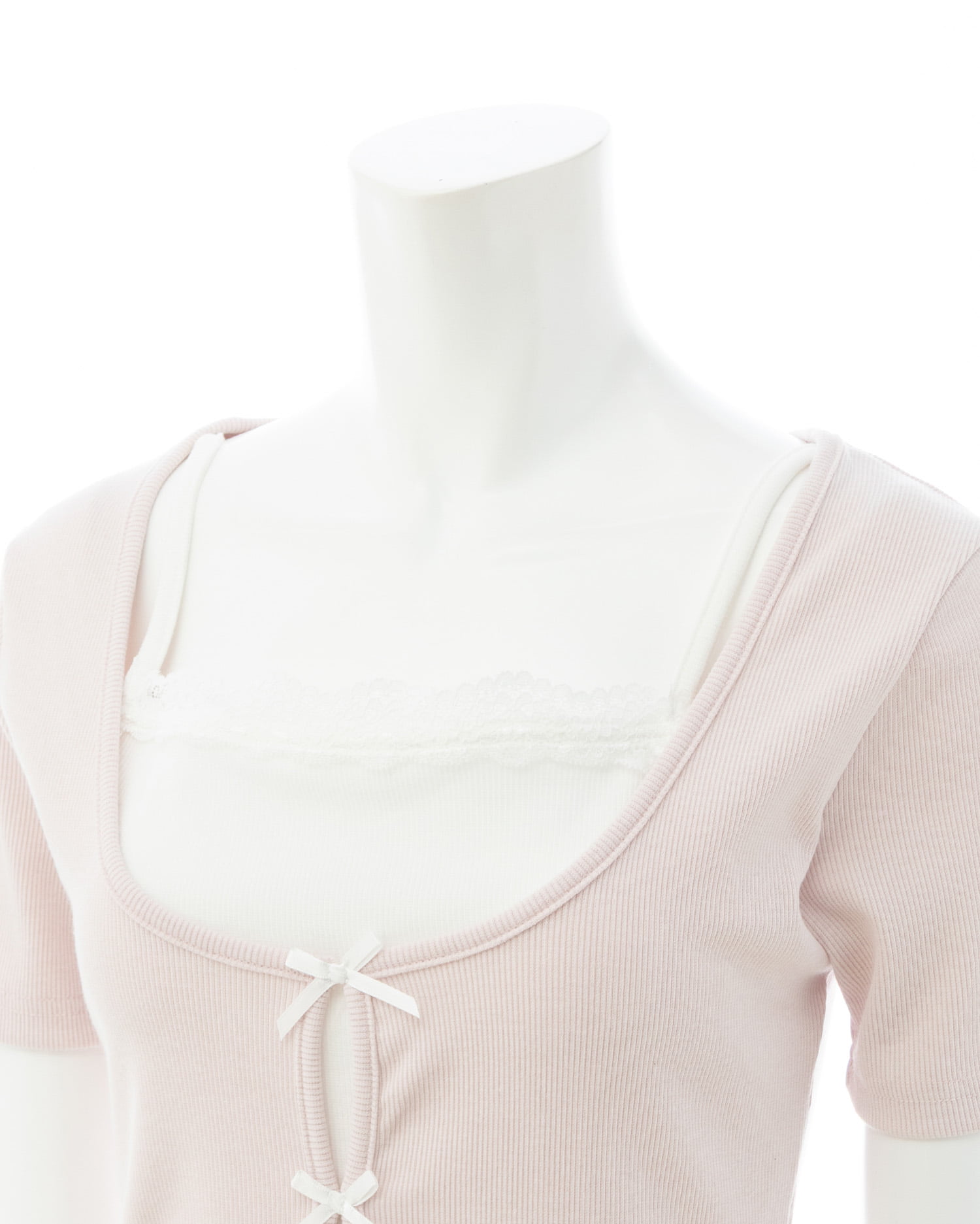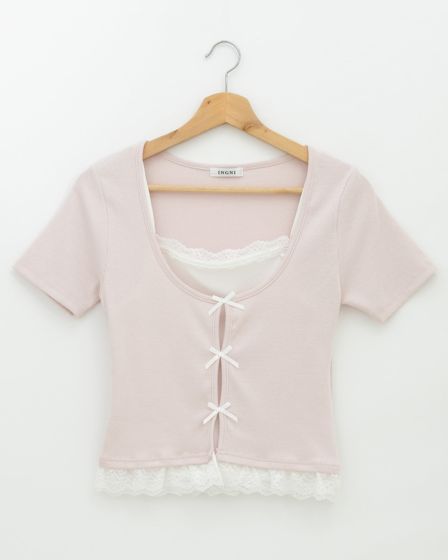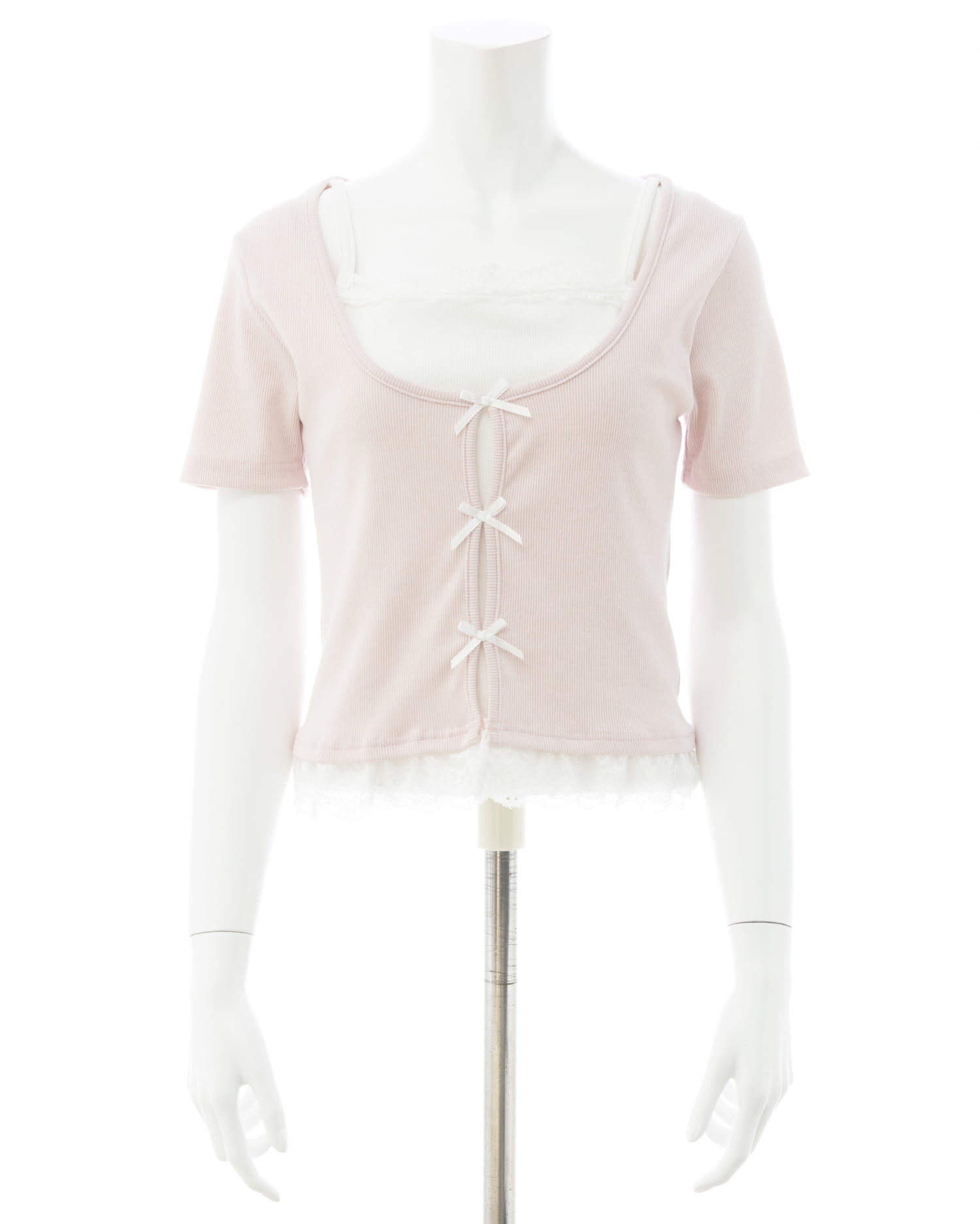 • INGNI(イング) レイヤード前リボンリブトップス ピンク