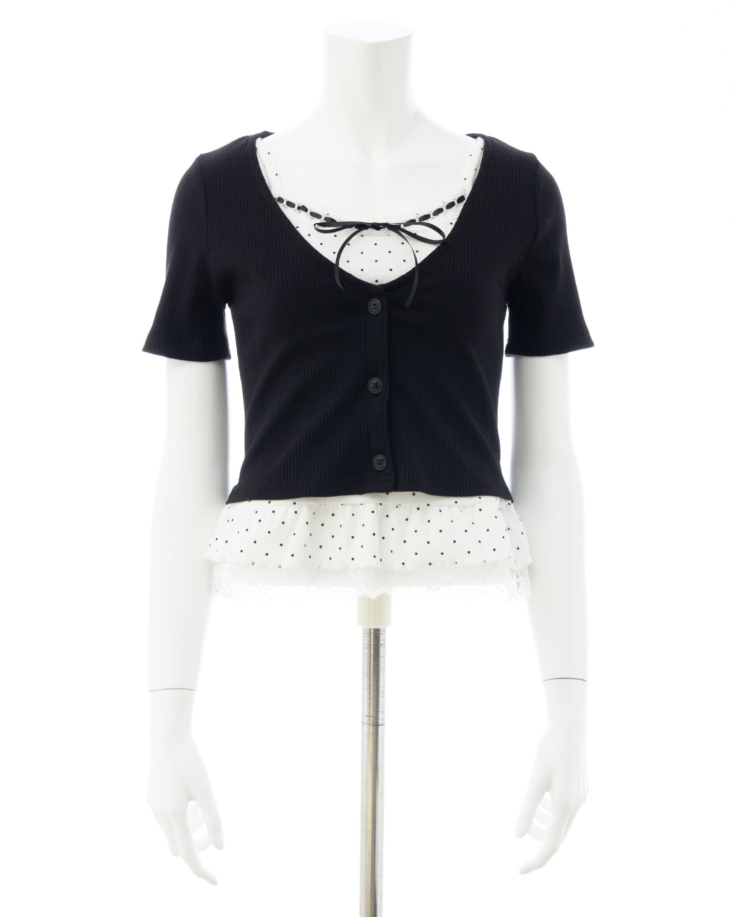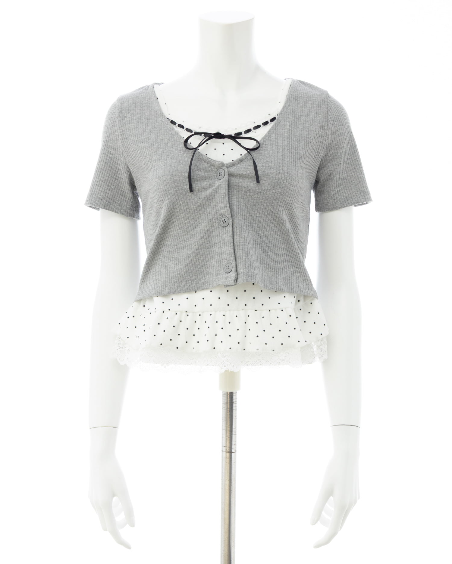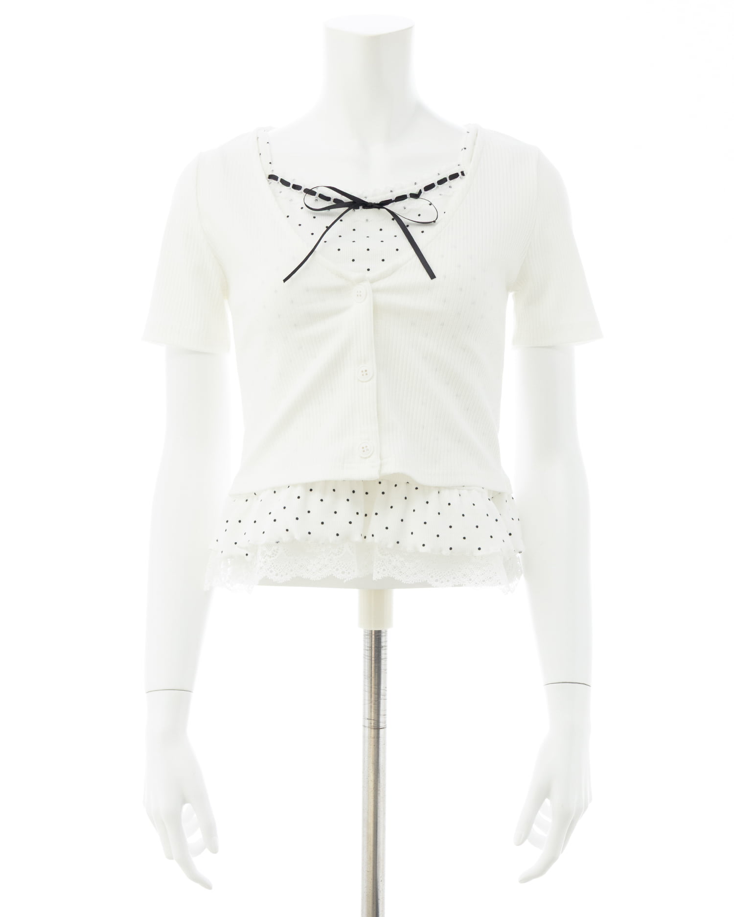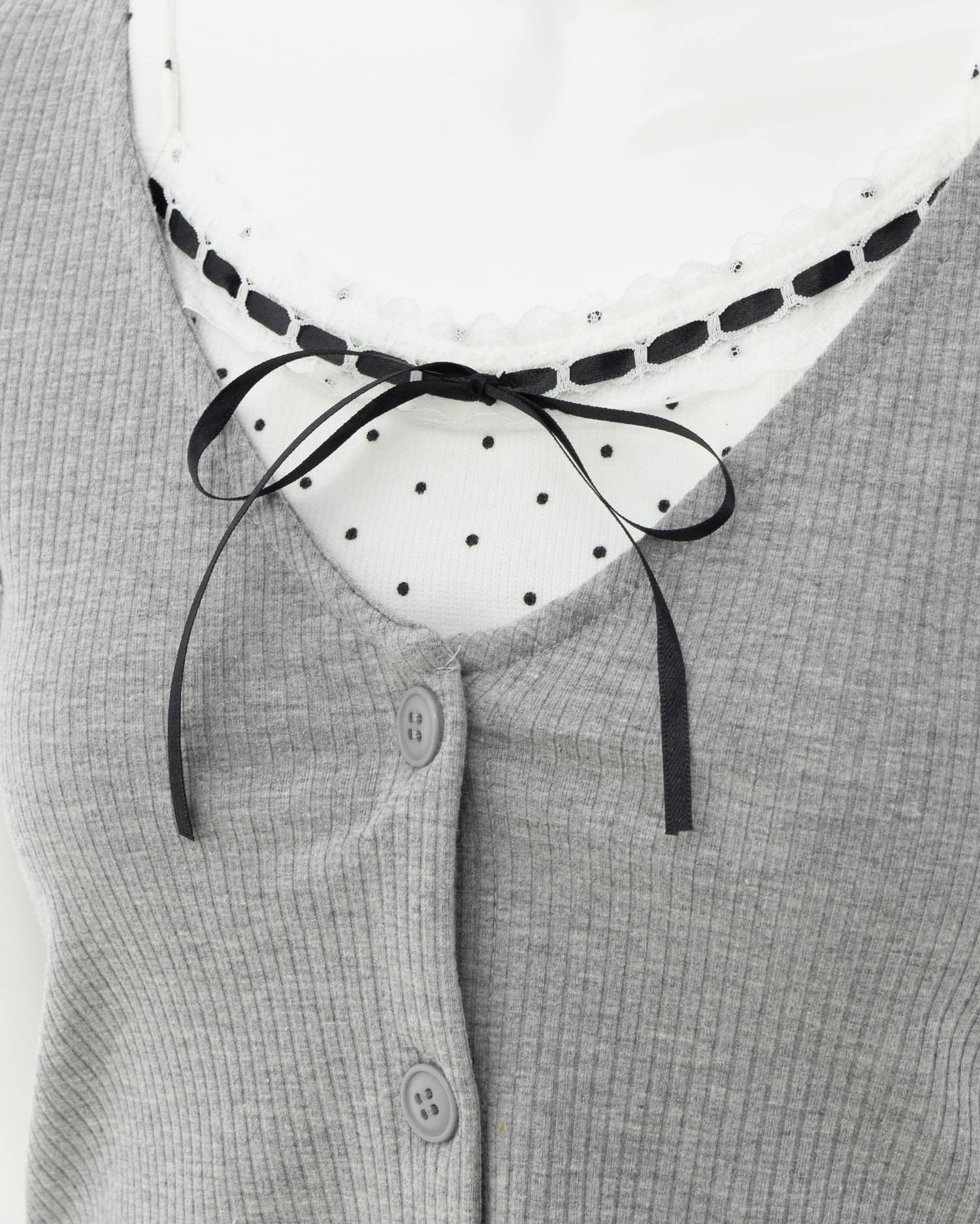 クラシカルなドットのキャミソールにカーディガンを重ねたかのような