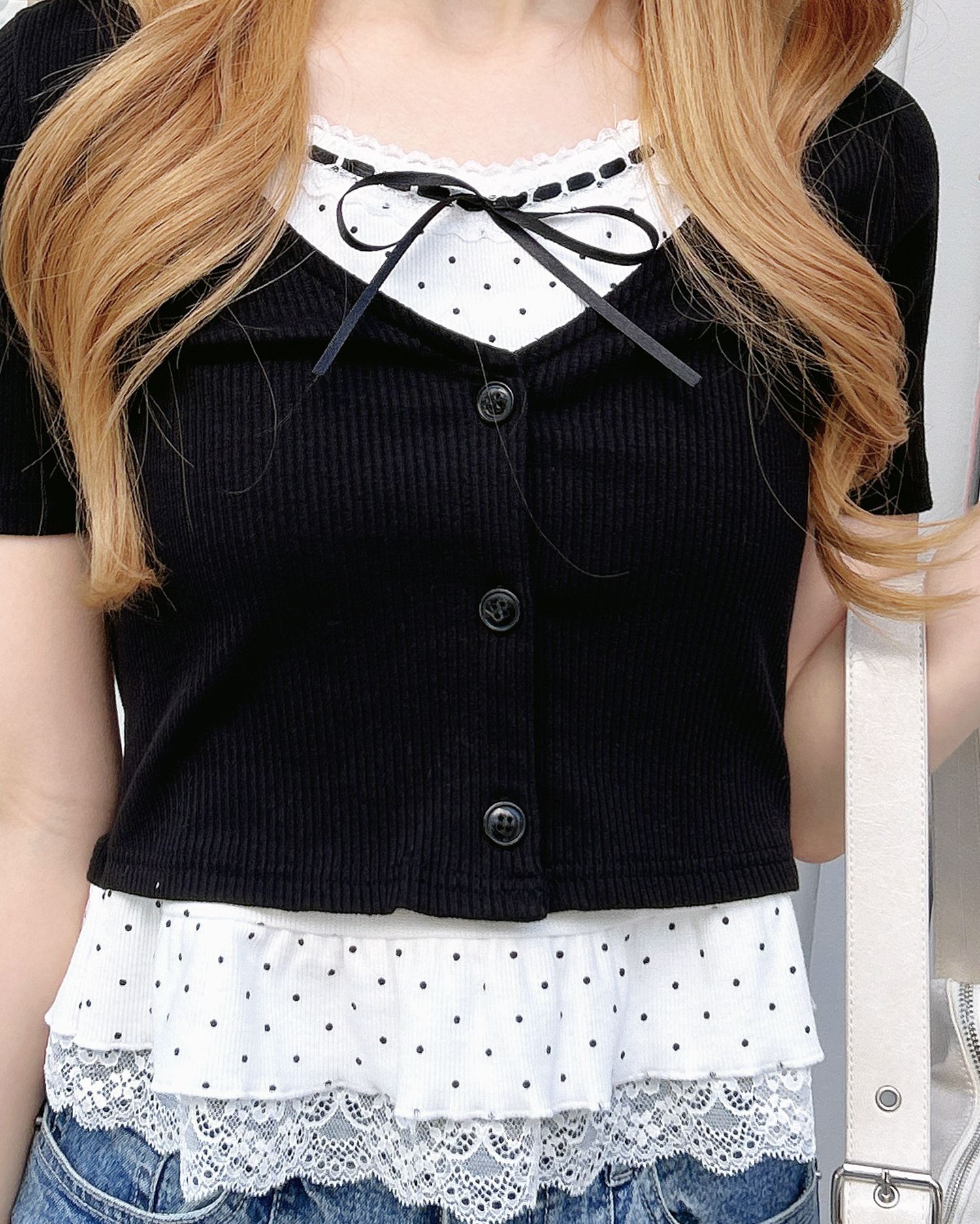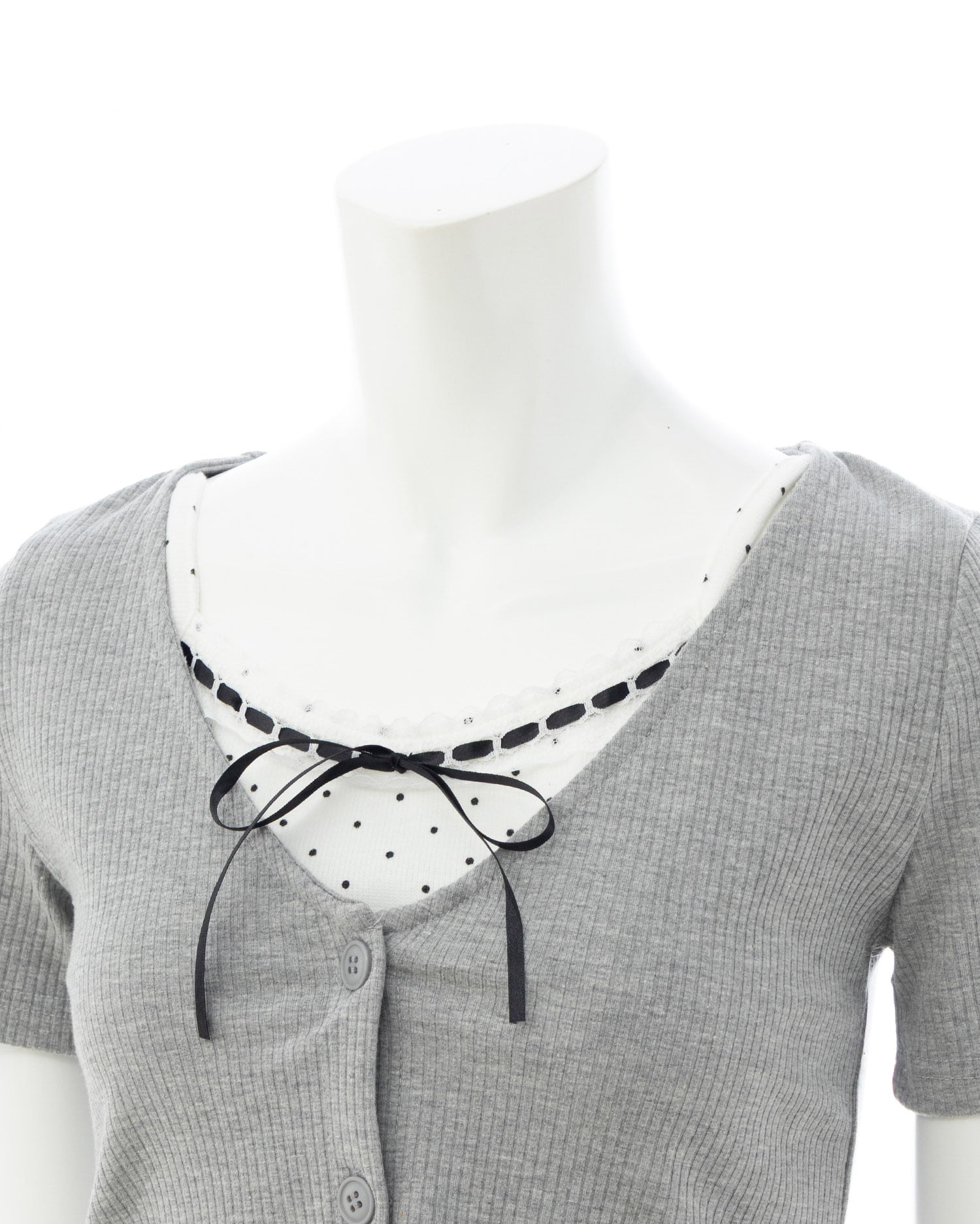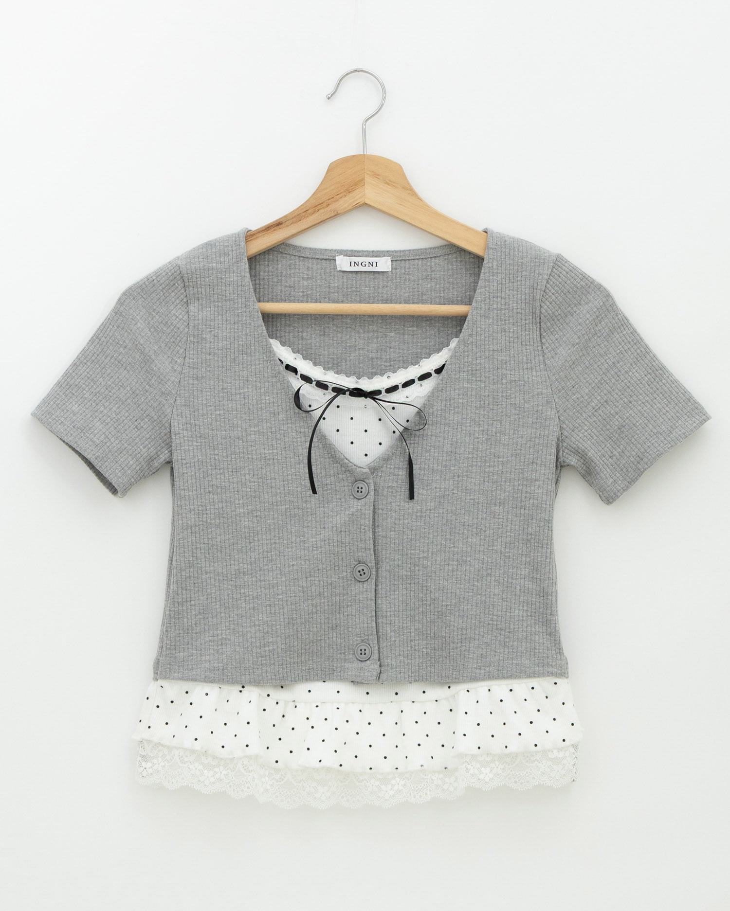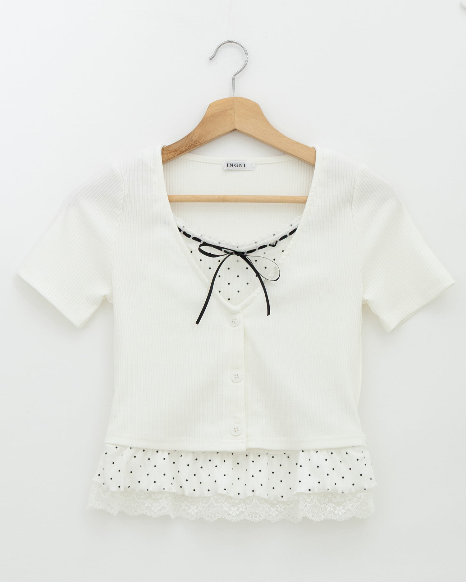 クラシカルなドットのキャミソールにカーディガンを重ねたかのような