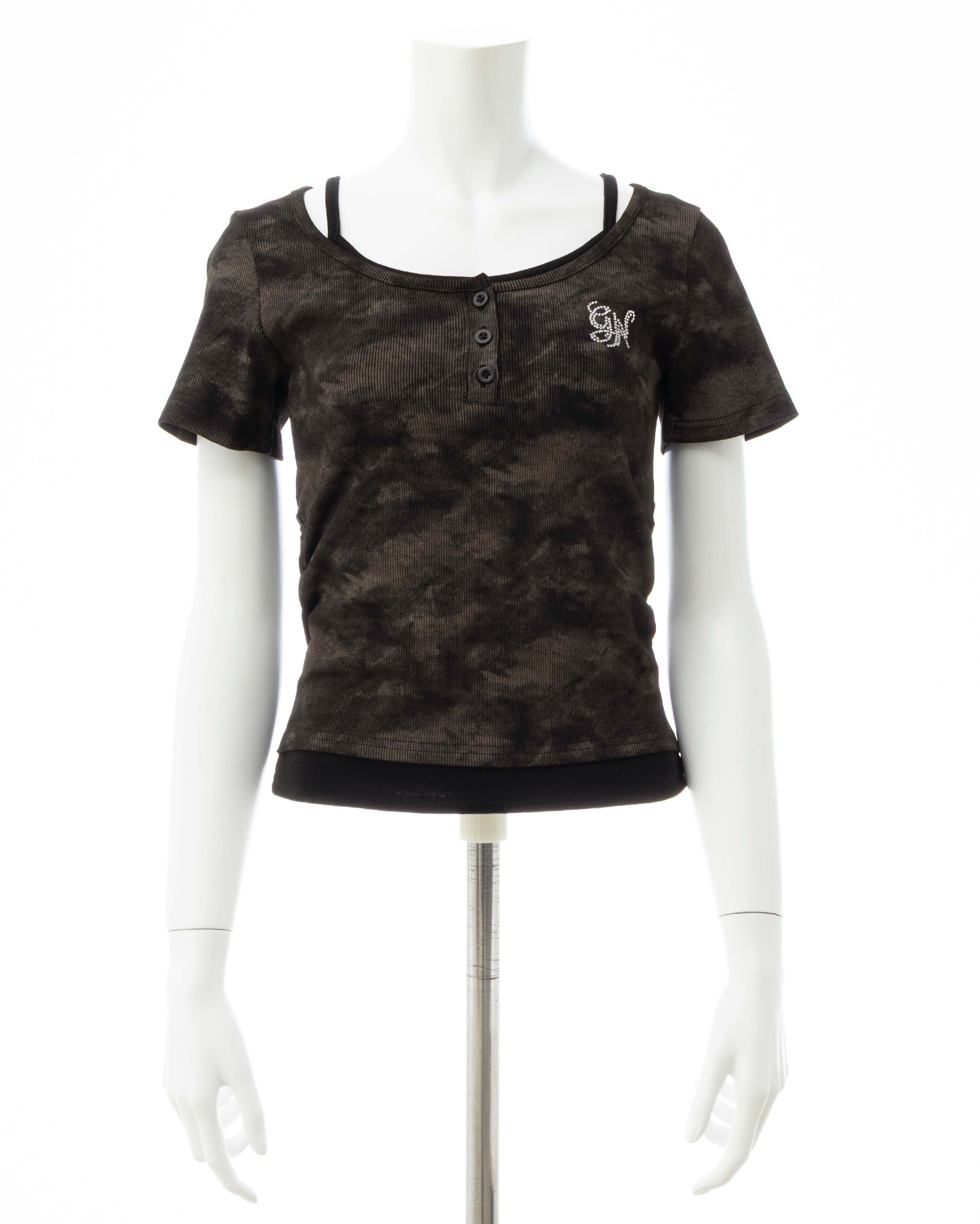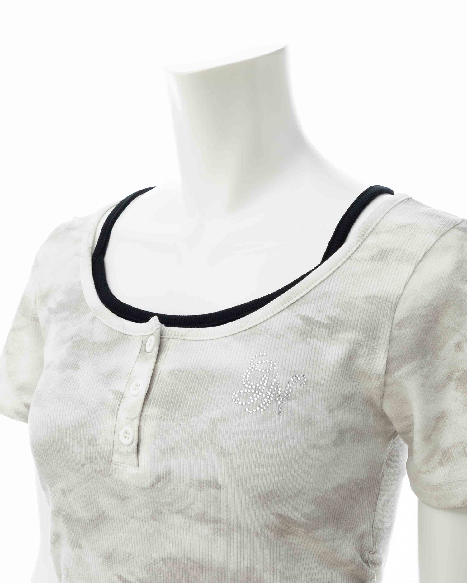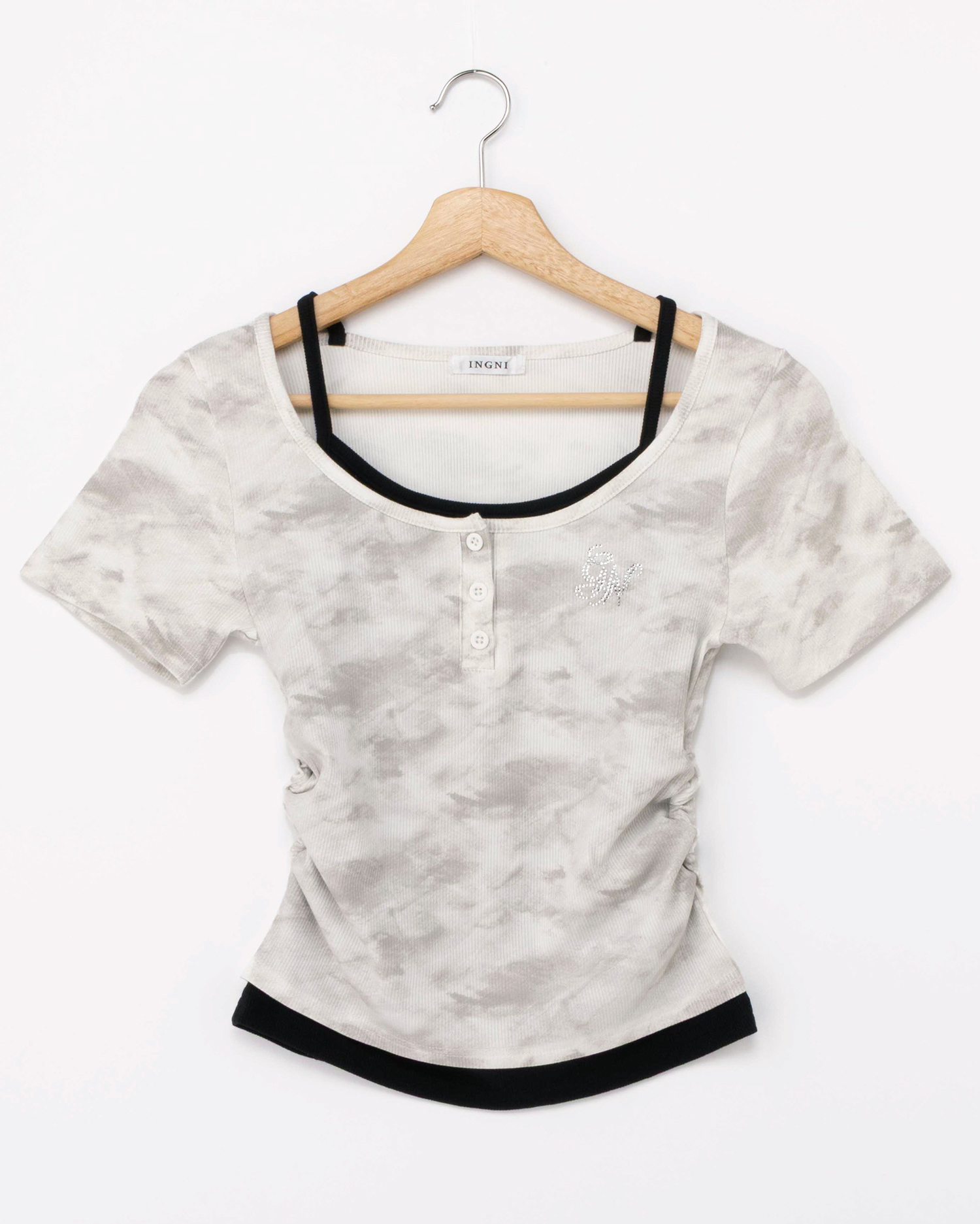 胸元にはラインストーンロゴをあしらってキラキラのアクセントに。
