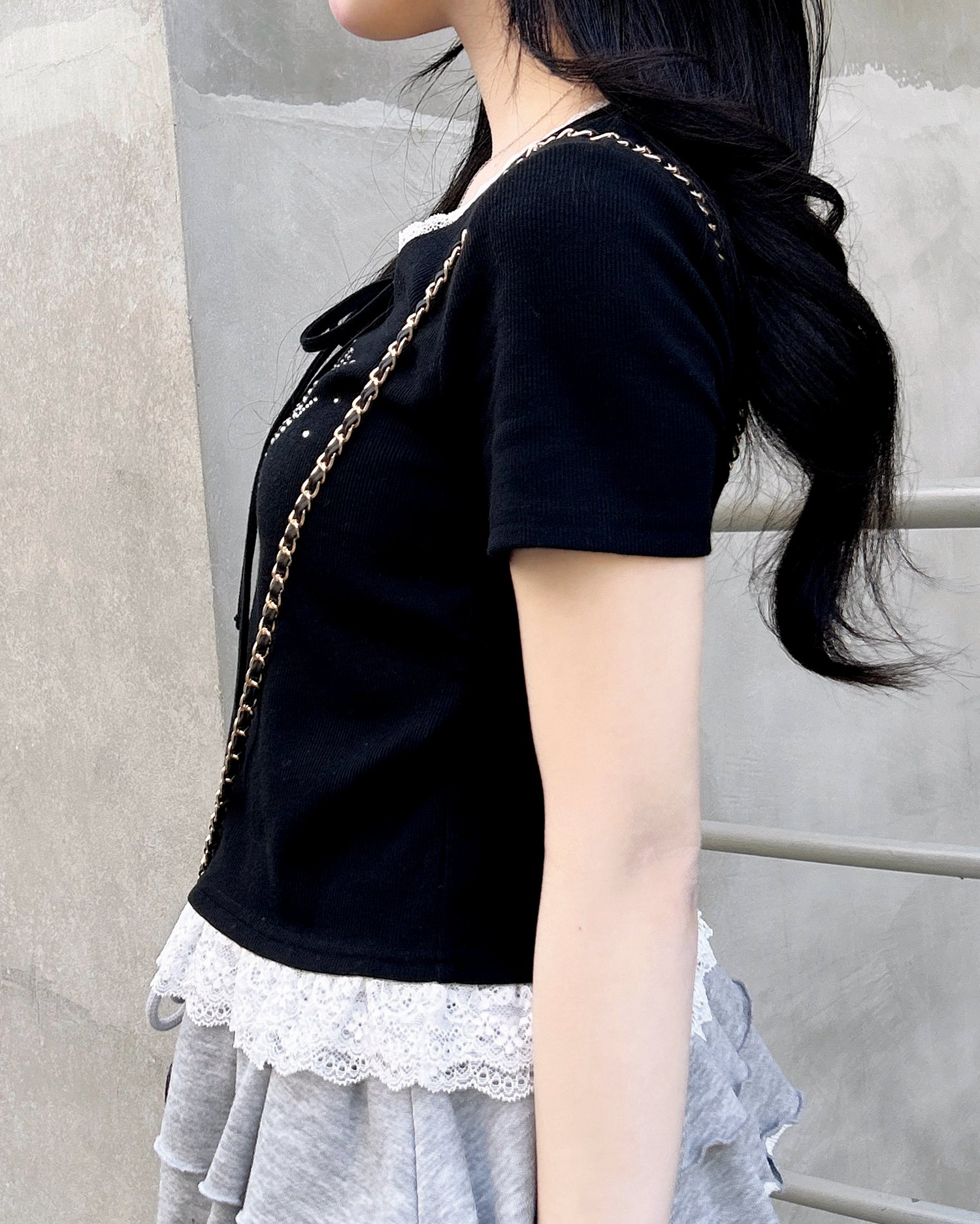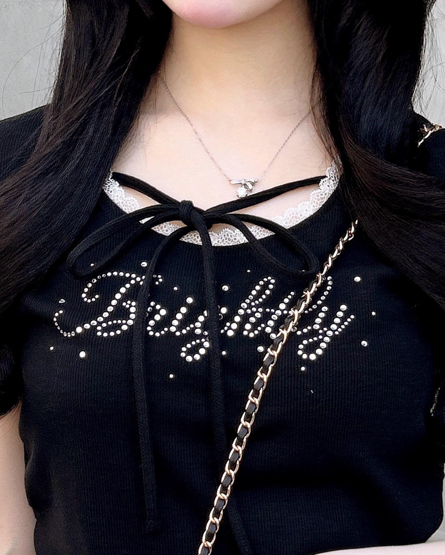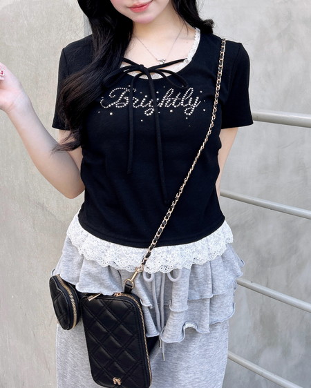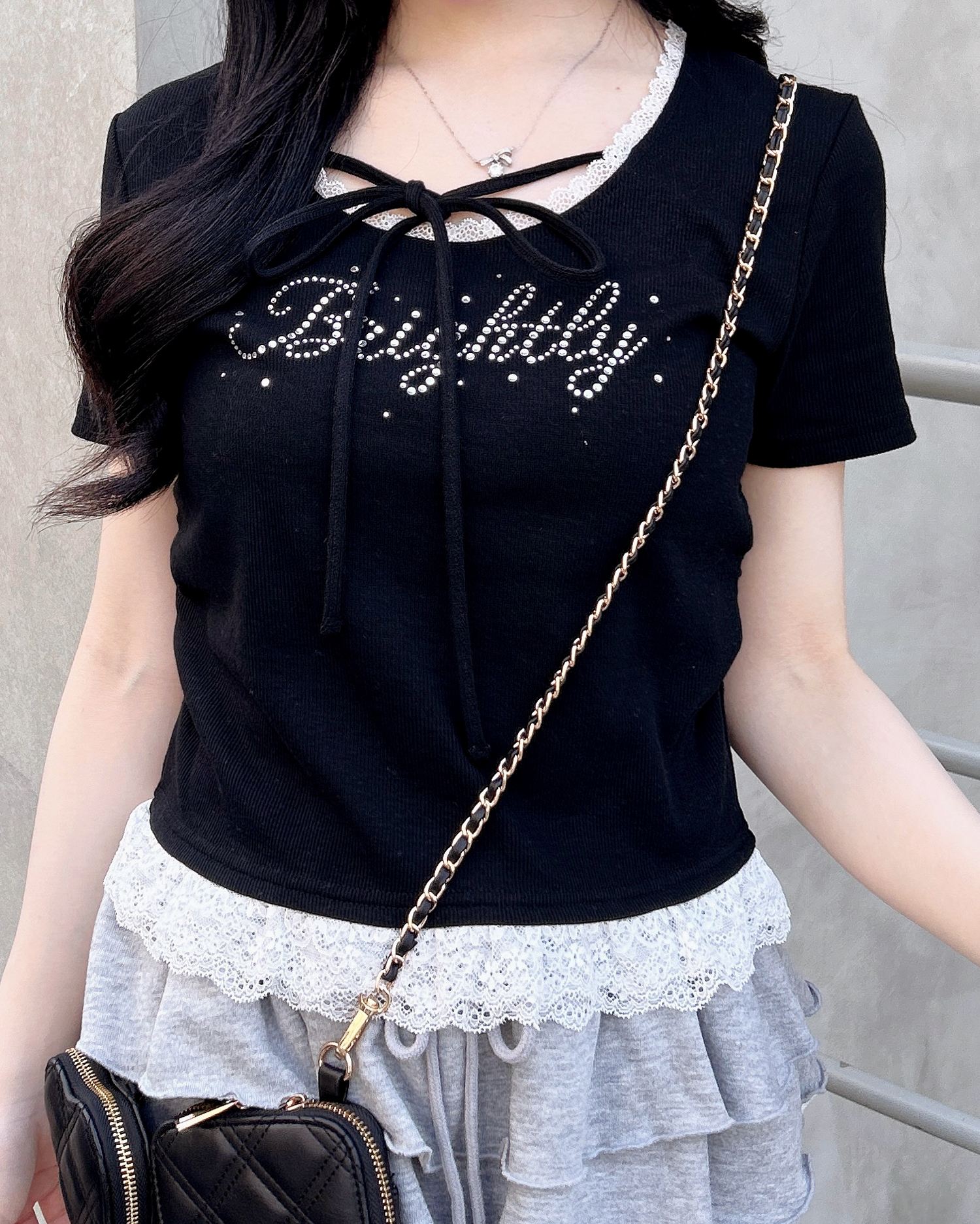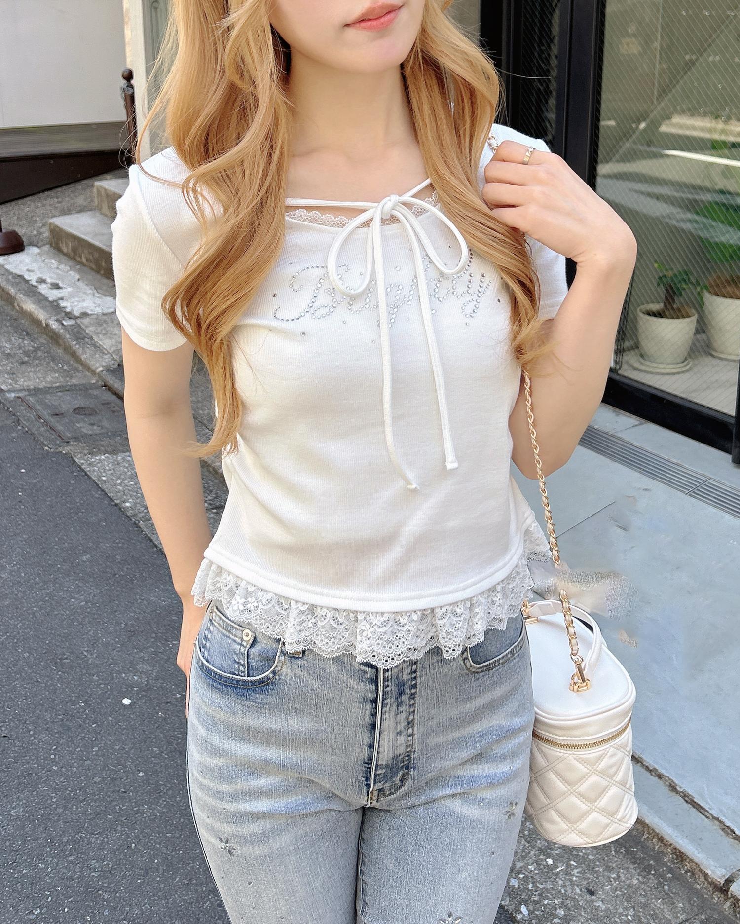 1261-100256 リボン付レース出しラインストーンロゴトップス
