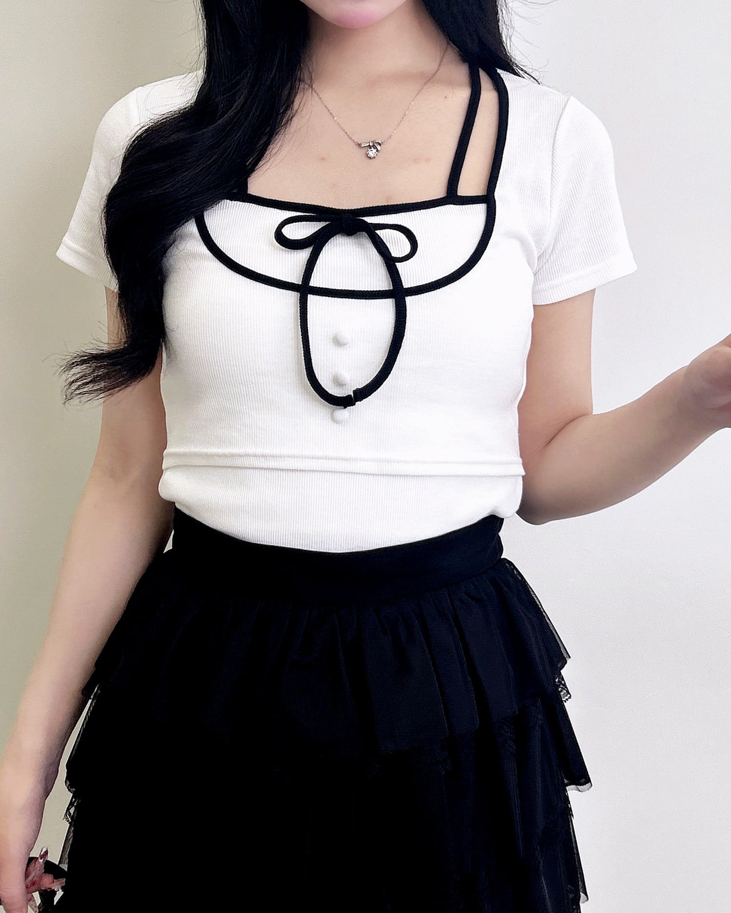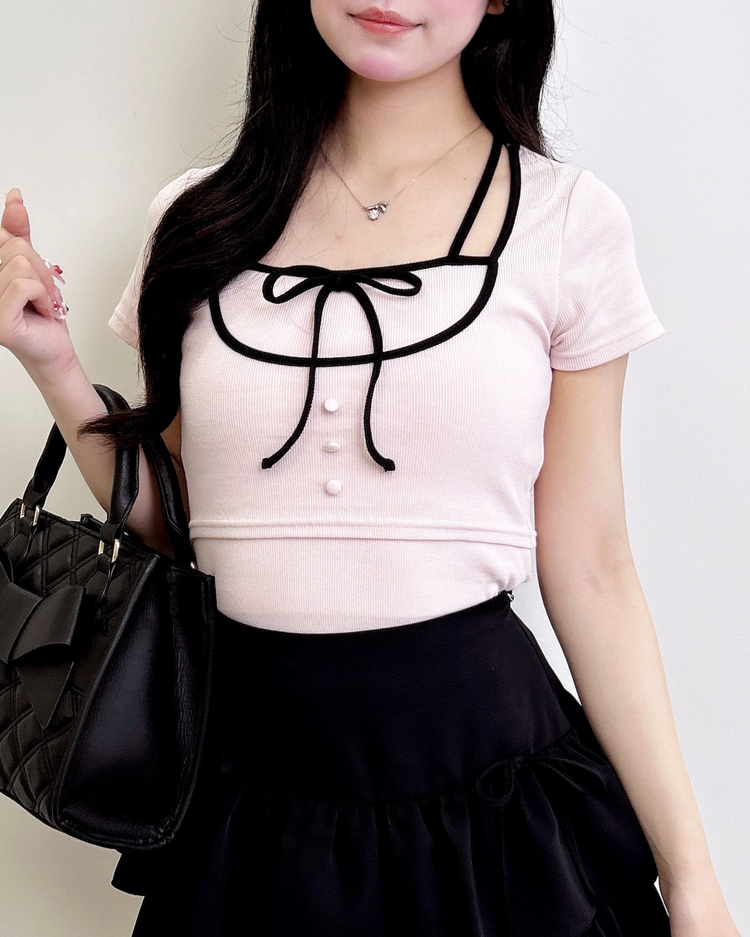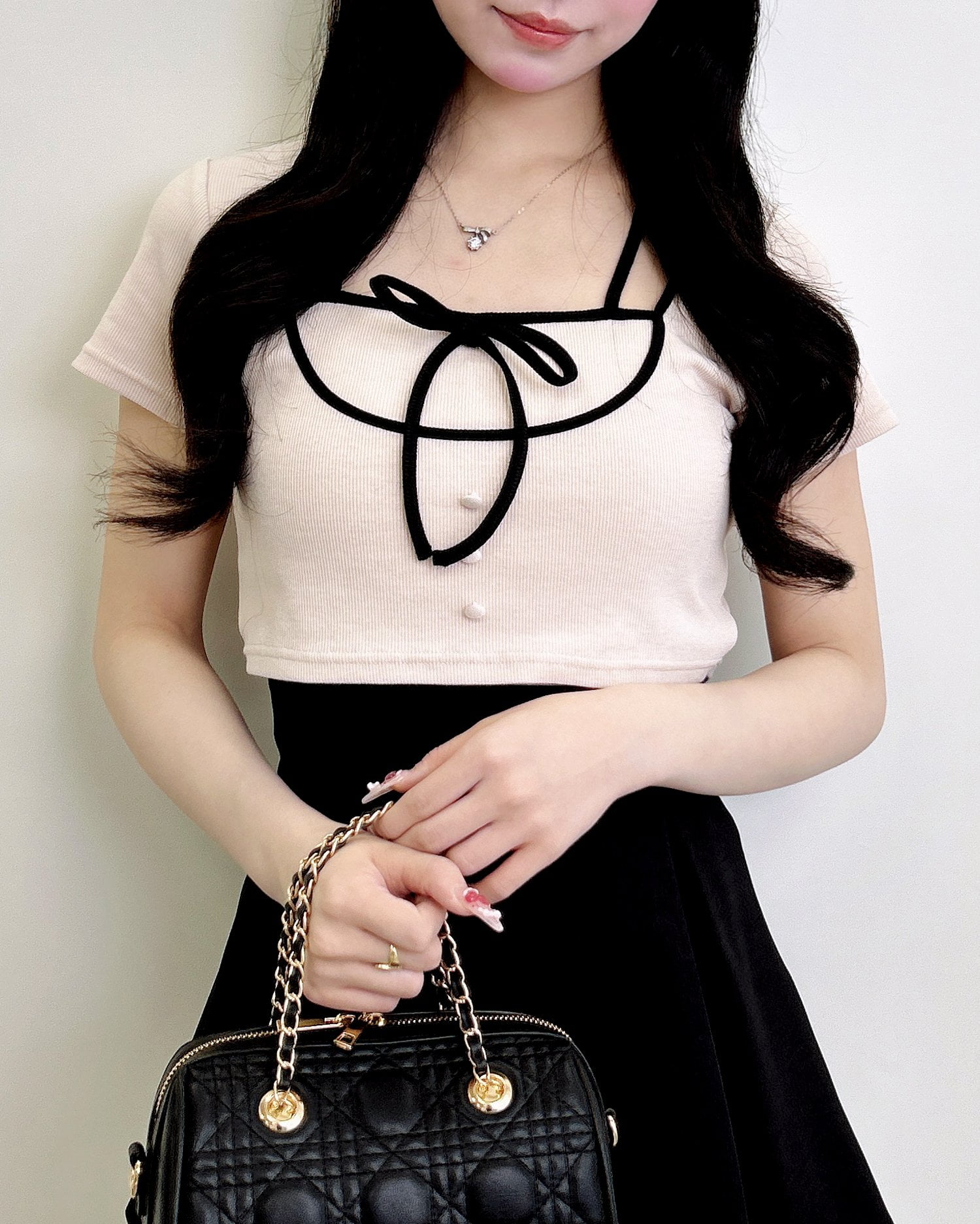 【配色パイピングとリボンデザインが目を惹くレイヤード風トップス】