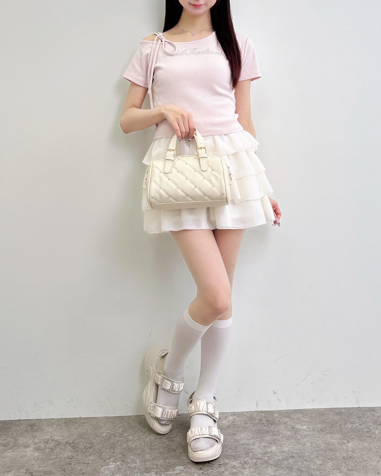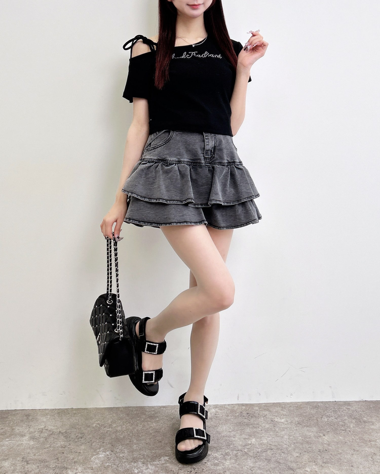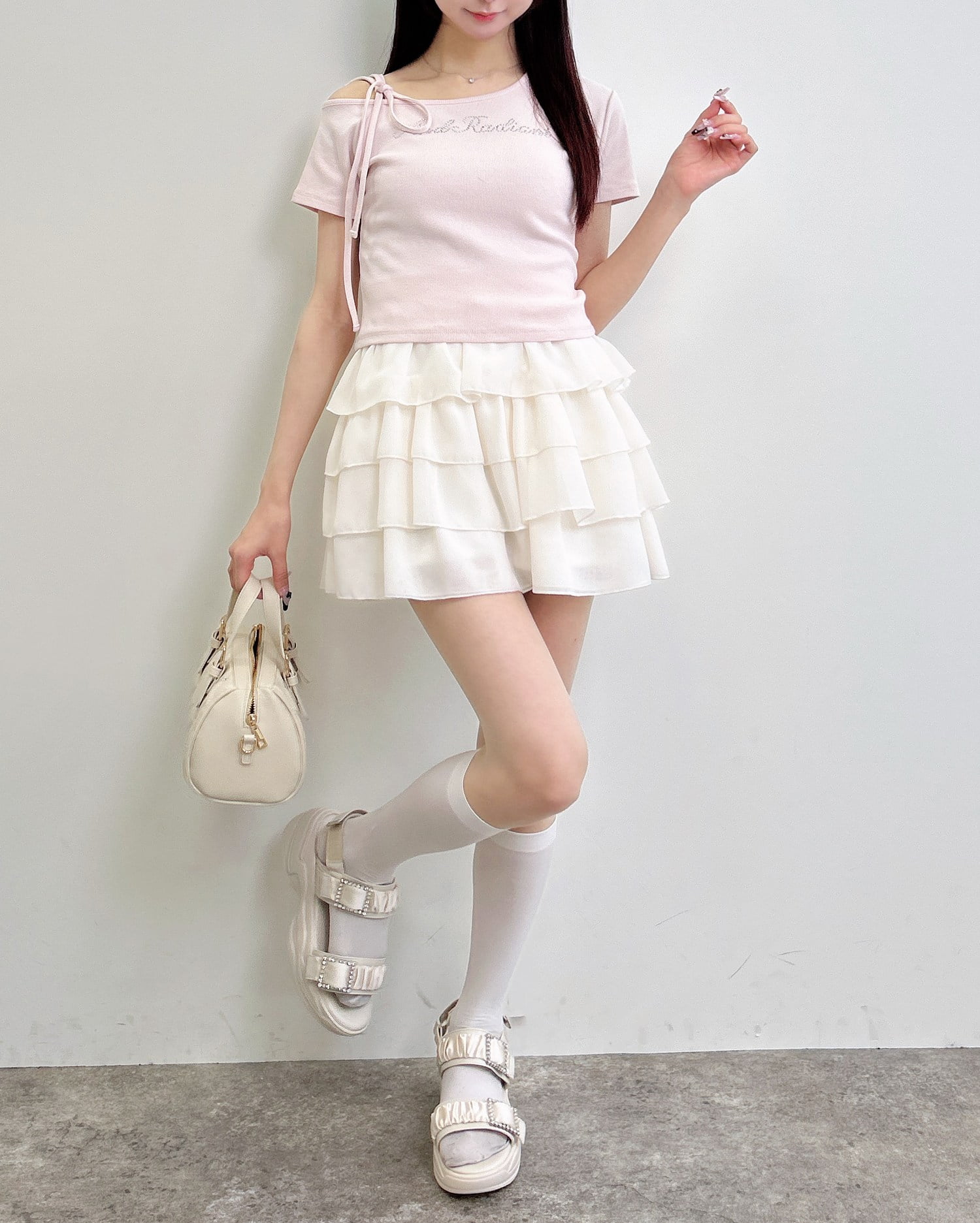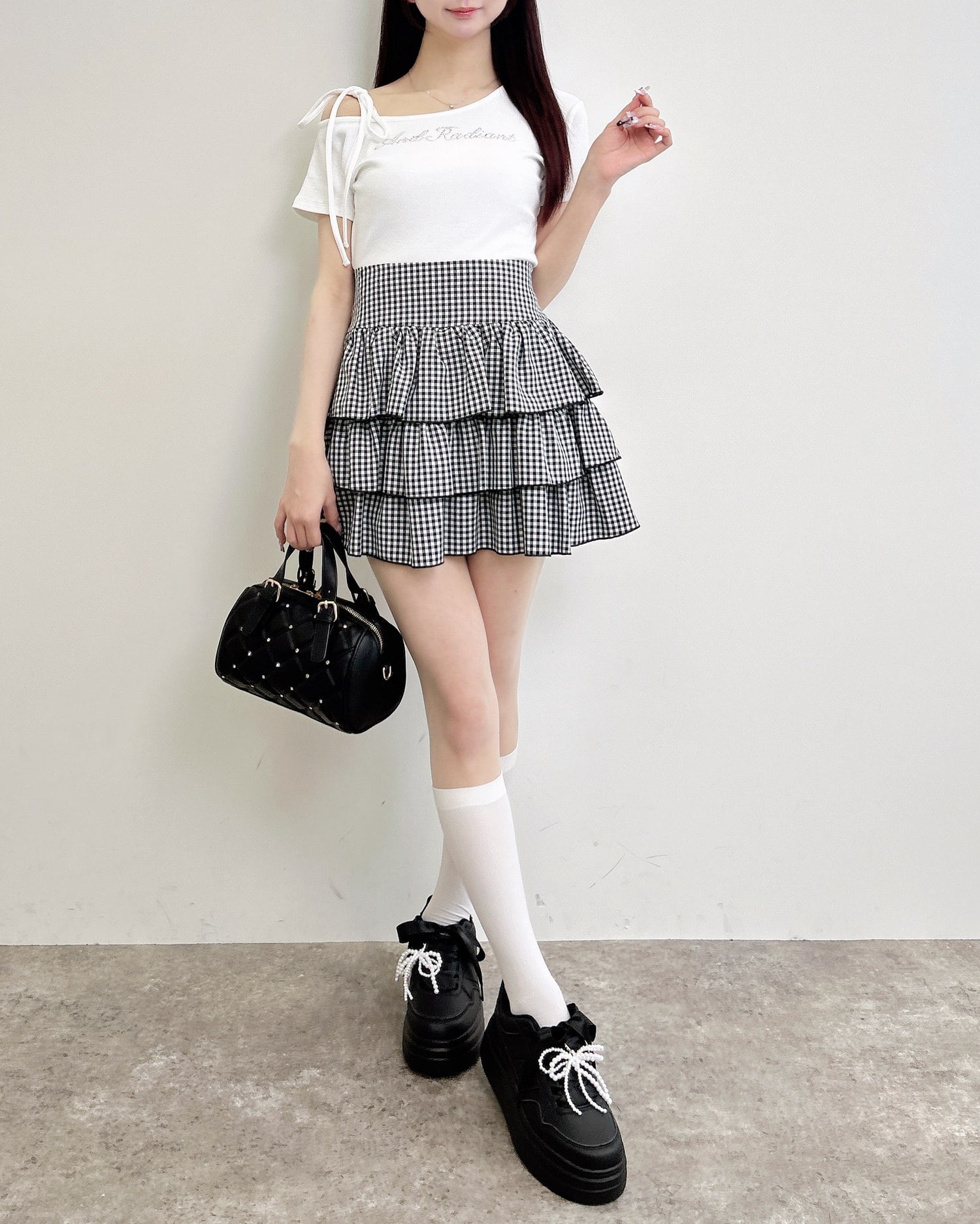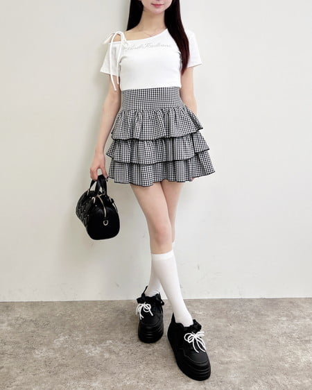 ミニスカートを合わせてガーリーコーデに。