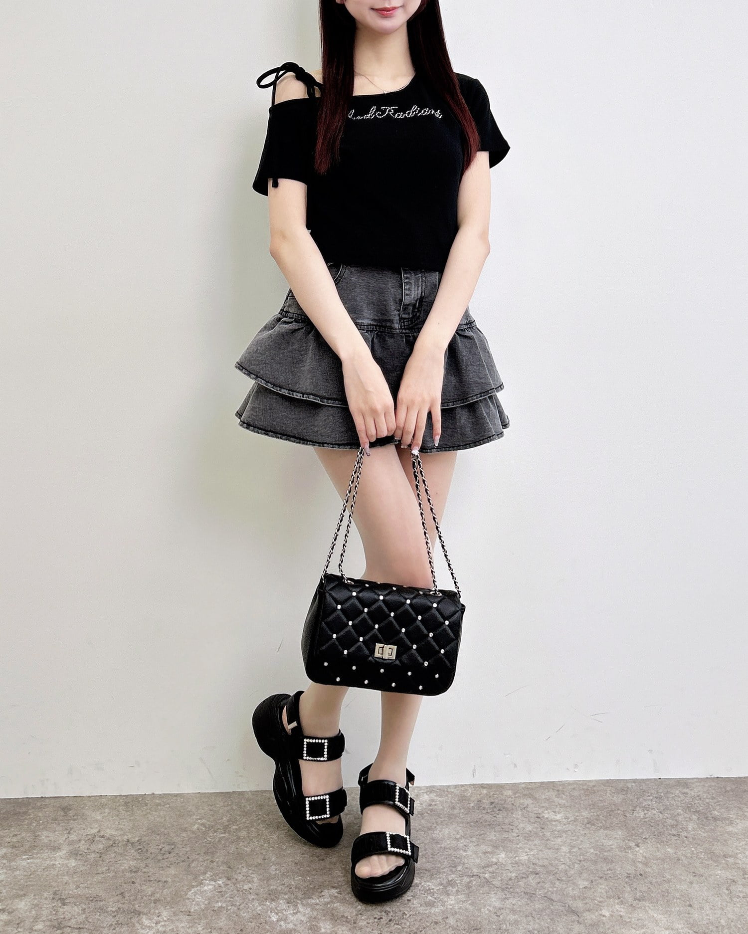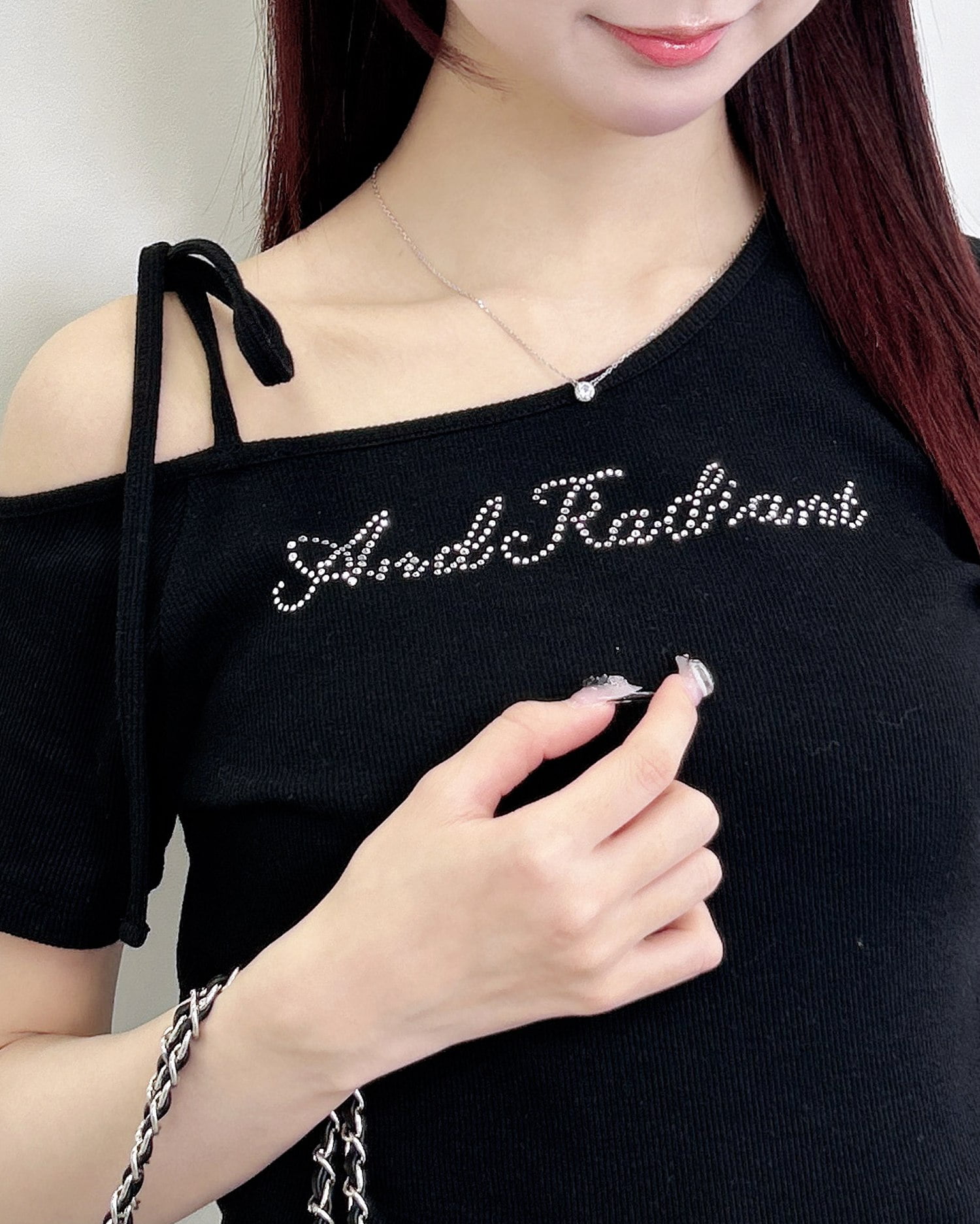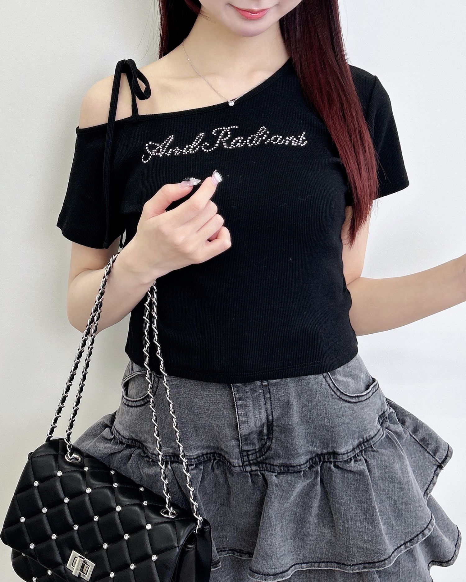 フロントにはラインストーンのロゴが施されているのでアクセントに。