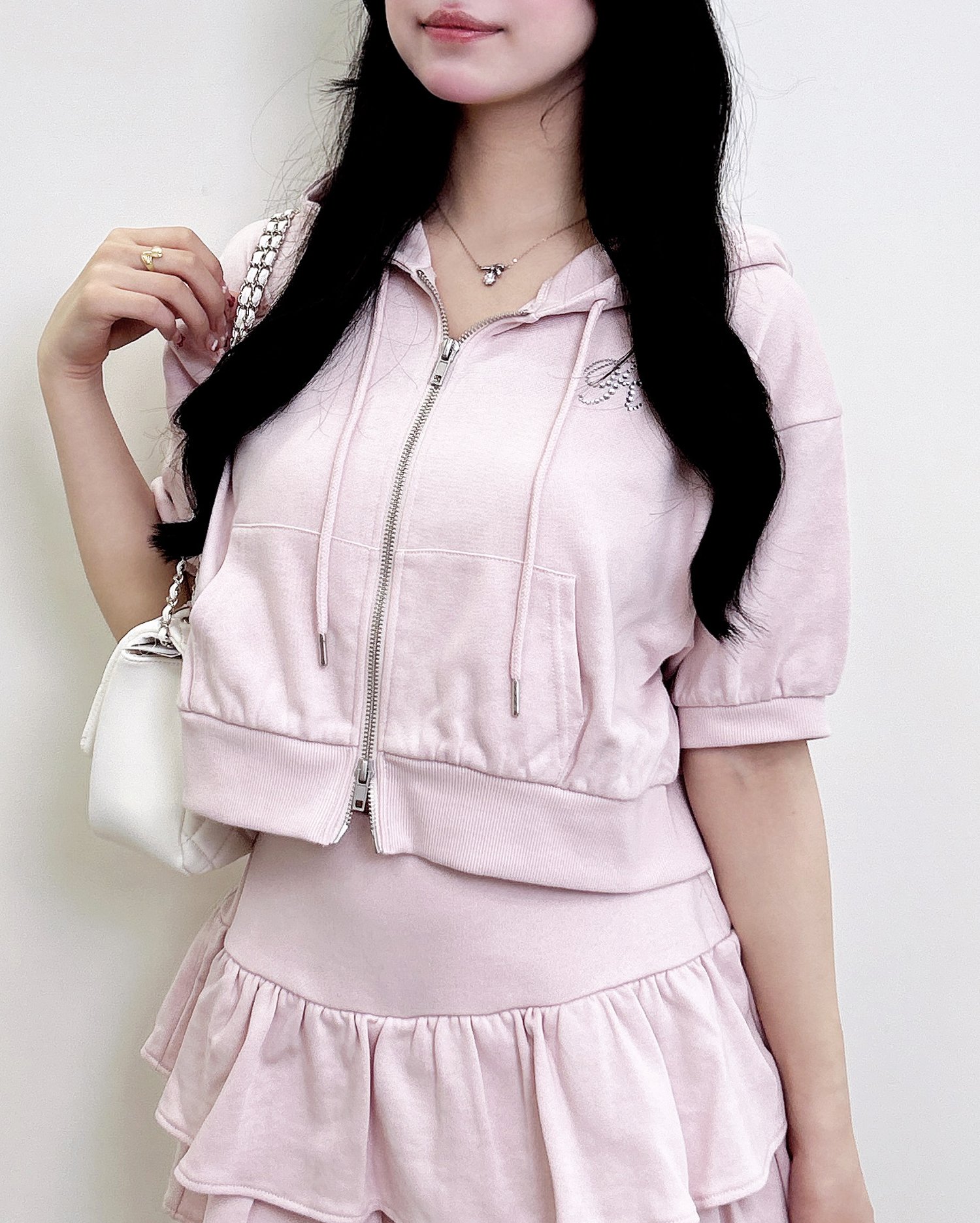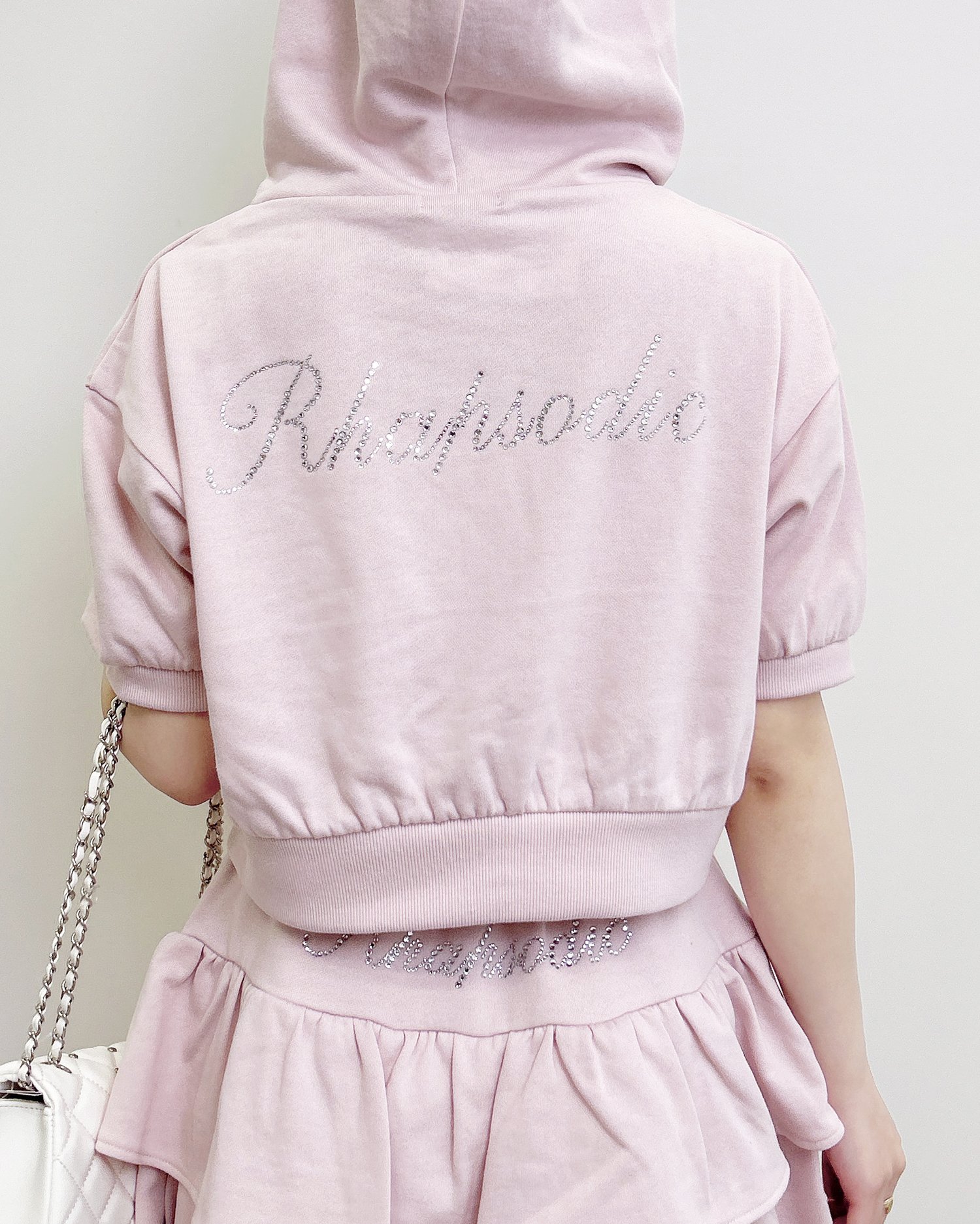 【きらっと光るラインストーンロゴが目を惹くミニ丈パーカー】
