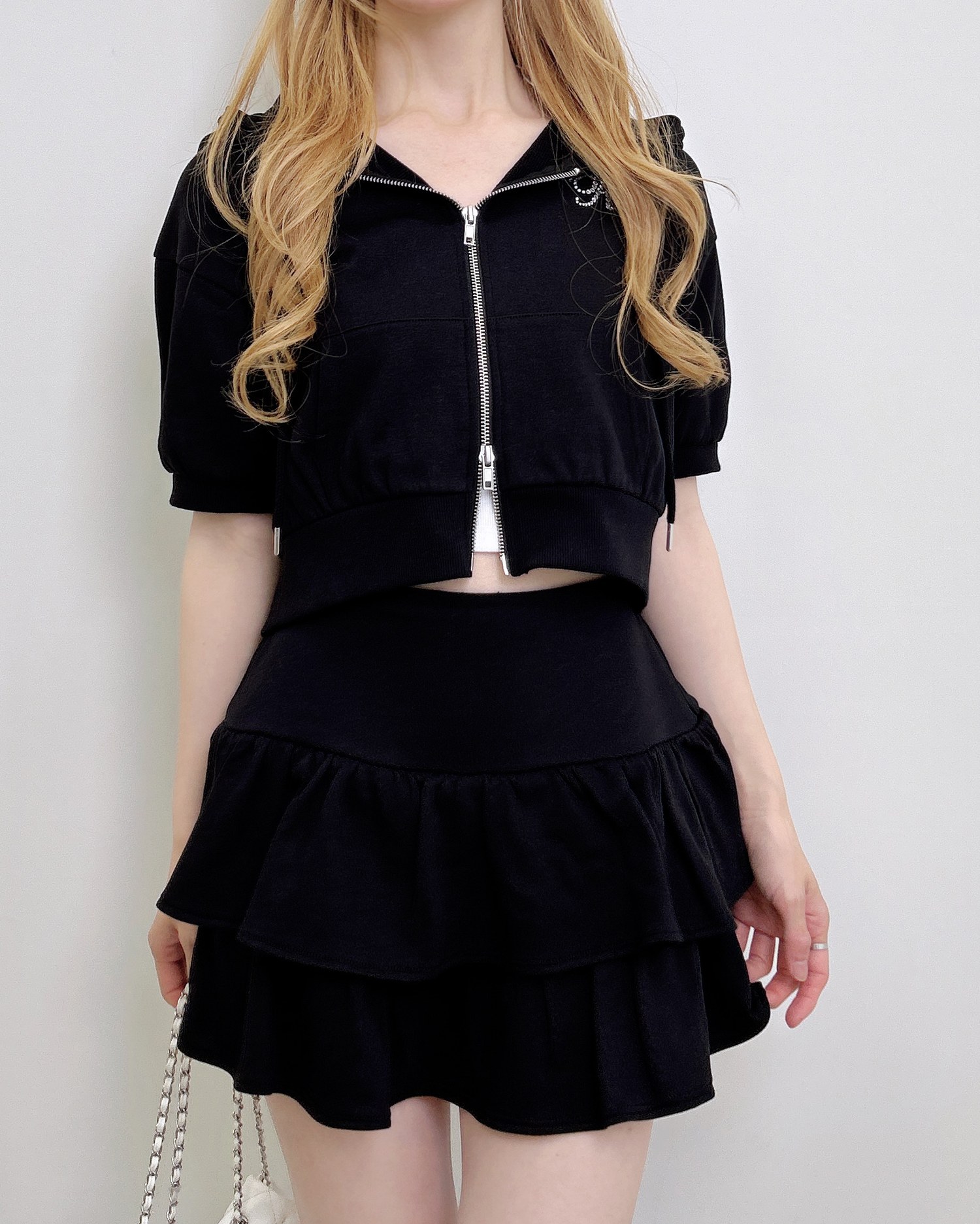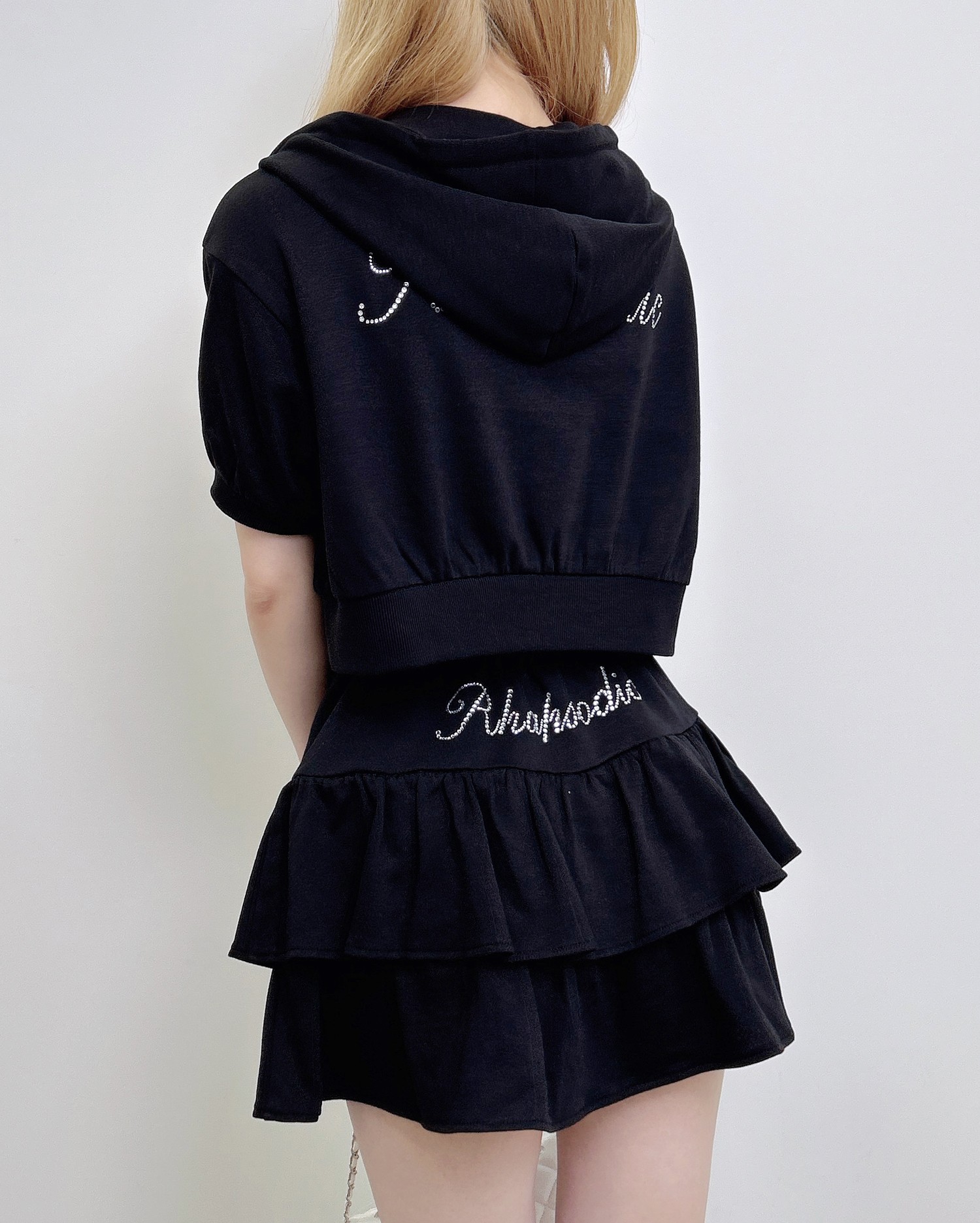 フード付きでカジュアルさをプラスしつつ、ラインストーンでガーリー要素もプラス。