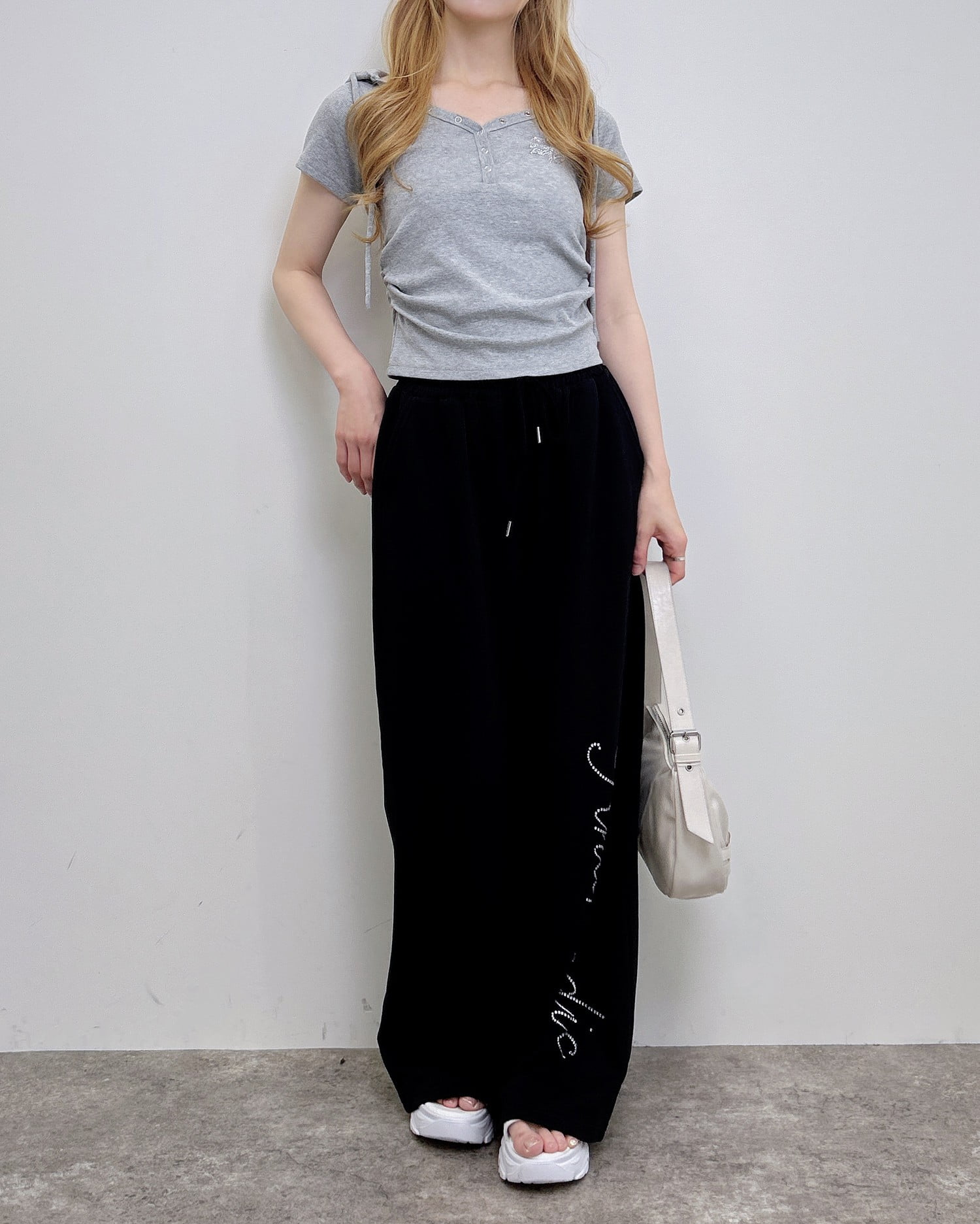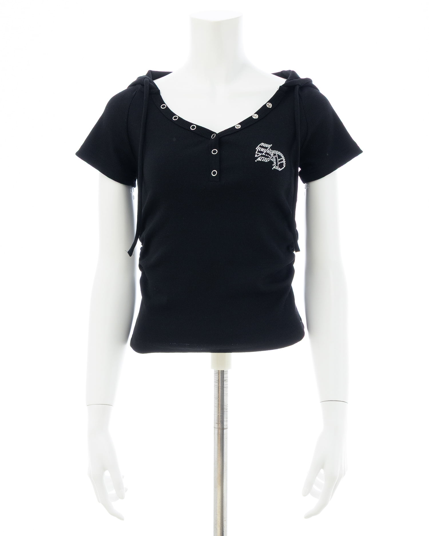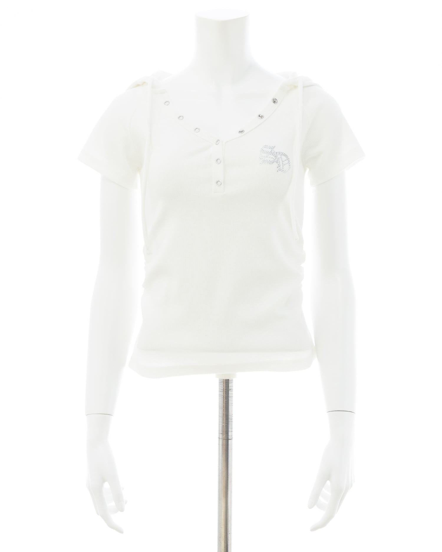 胸元にはラインストーンを敷き詰めたロゴがキラキラと輝きます。