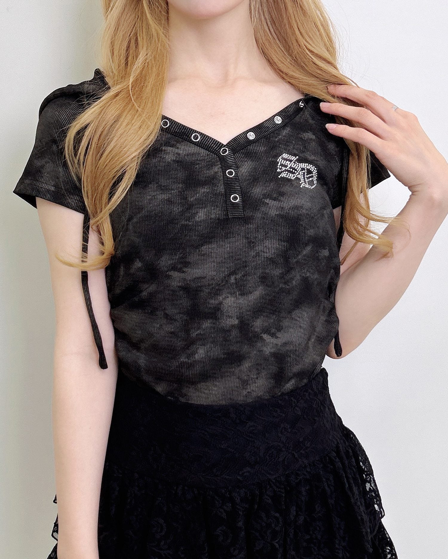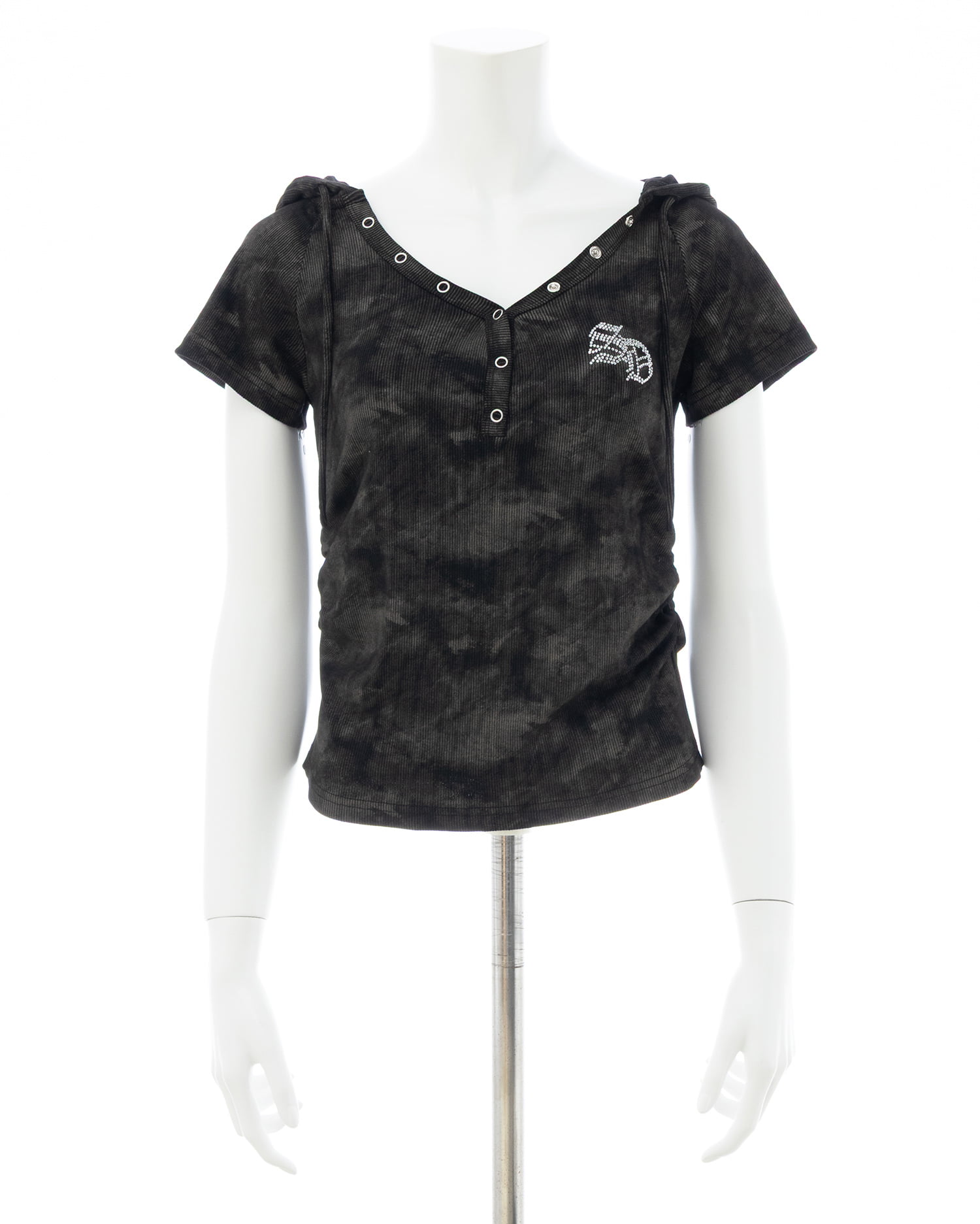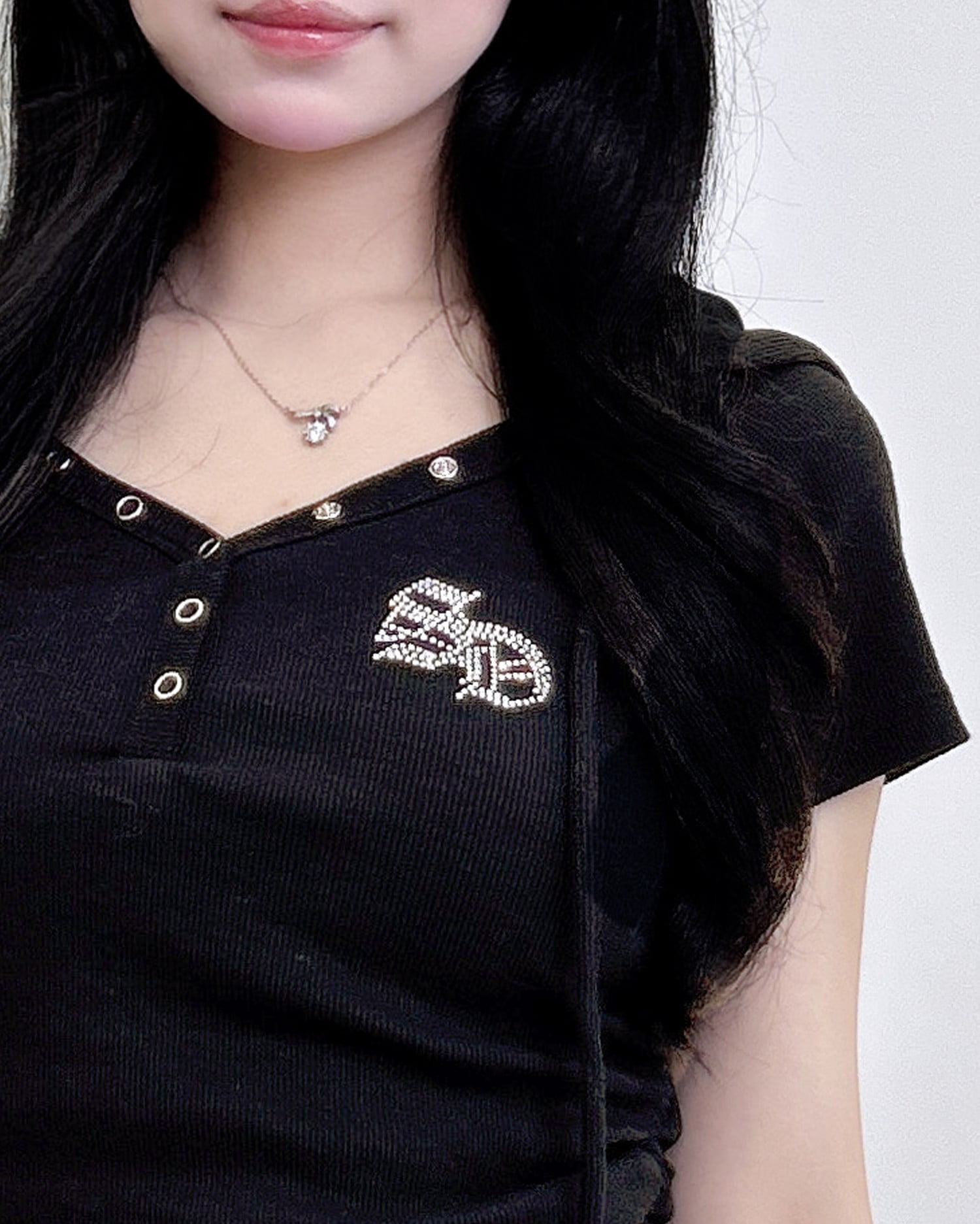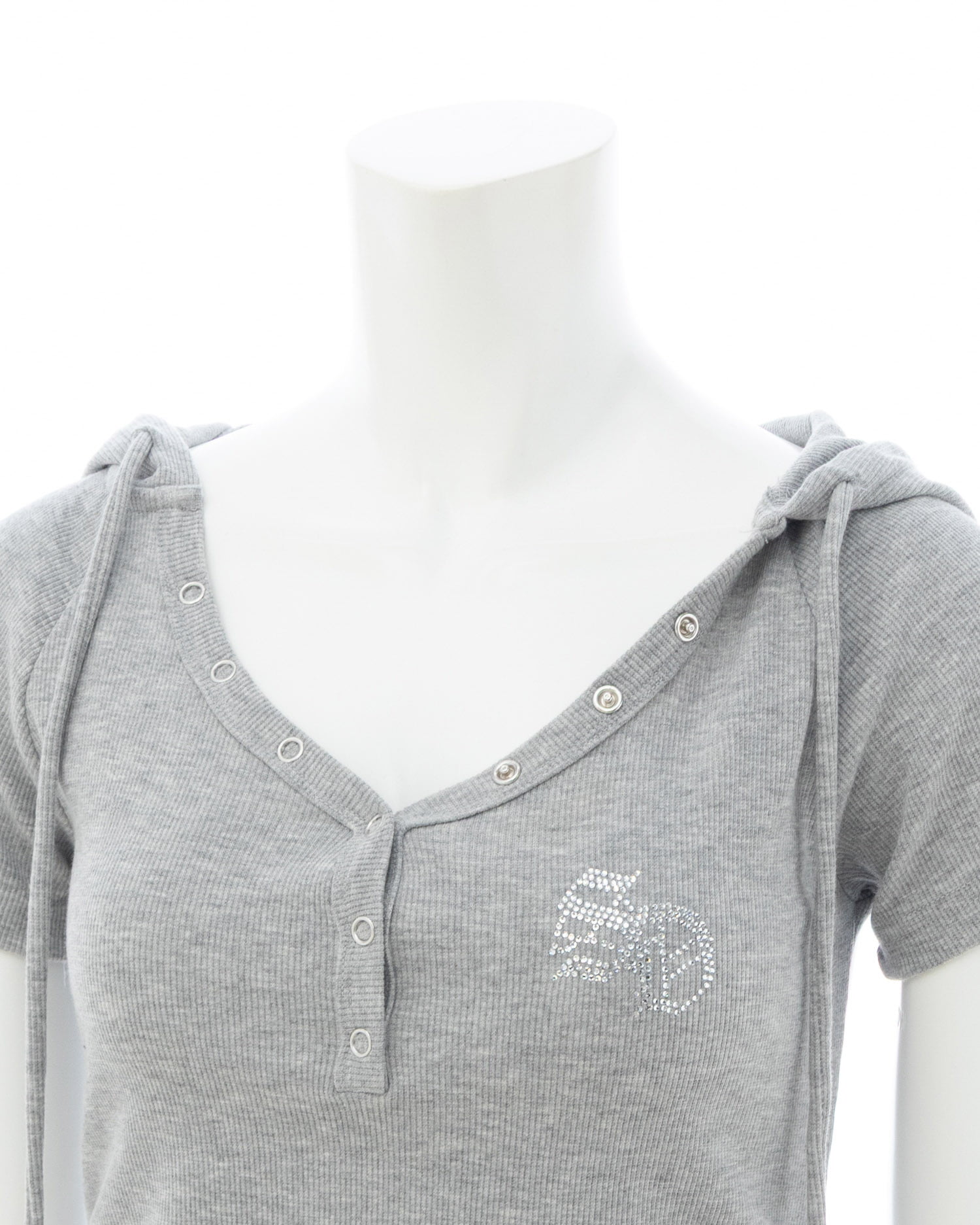 胸元にはラインストーンを敷き詰めたロゴがキラキラと輝きます。