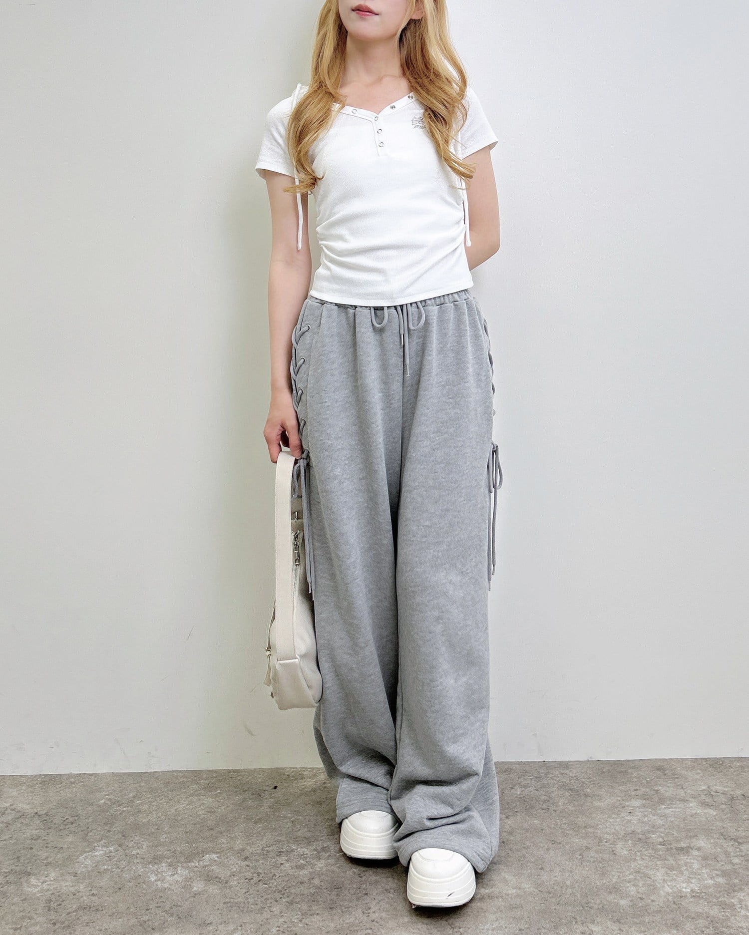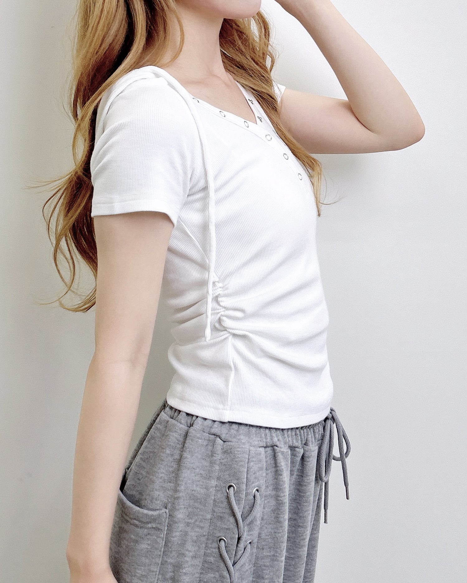 サイドギャザーでスタイルアップも狙えるメリハリシルエット。