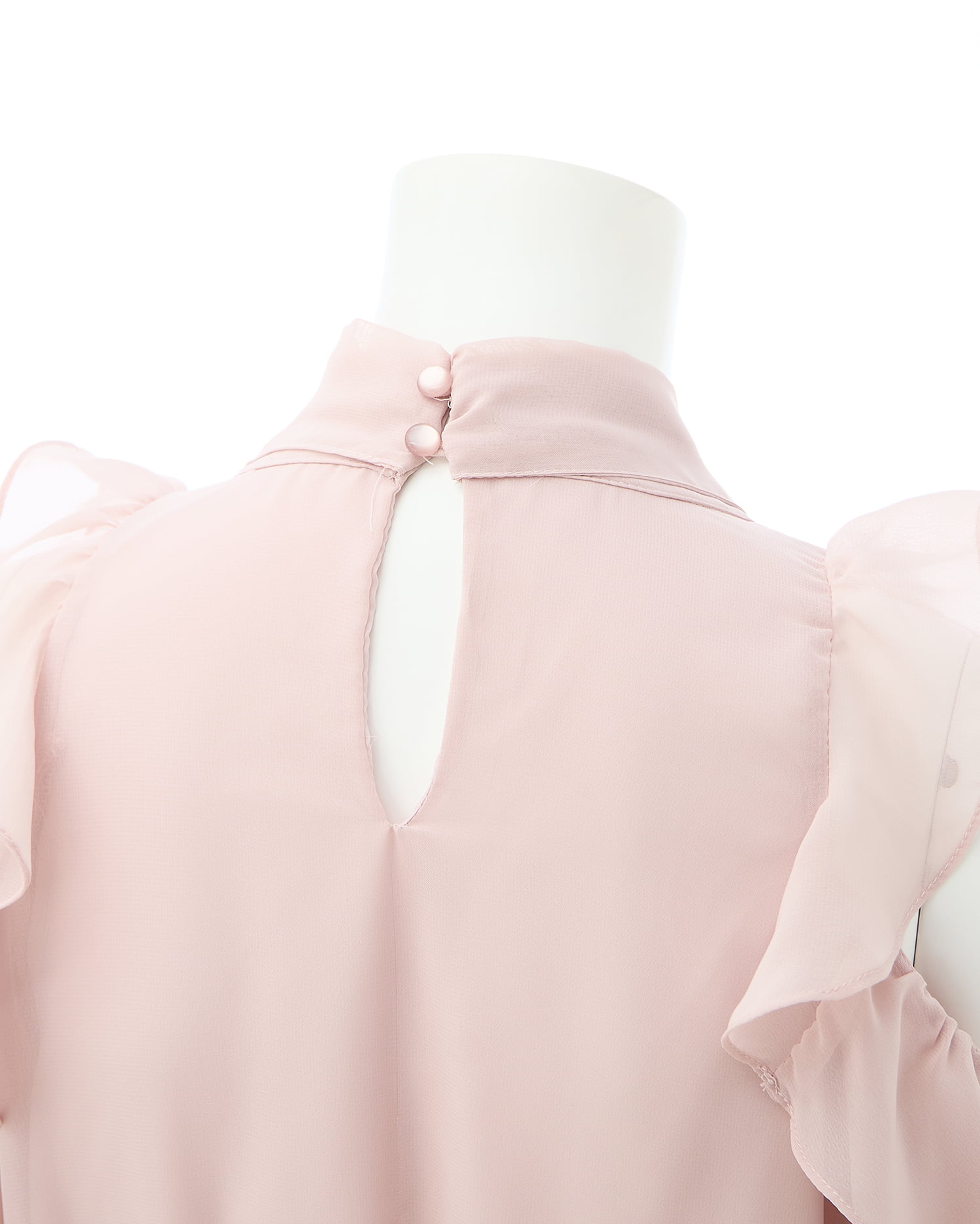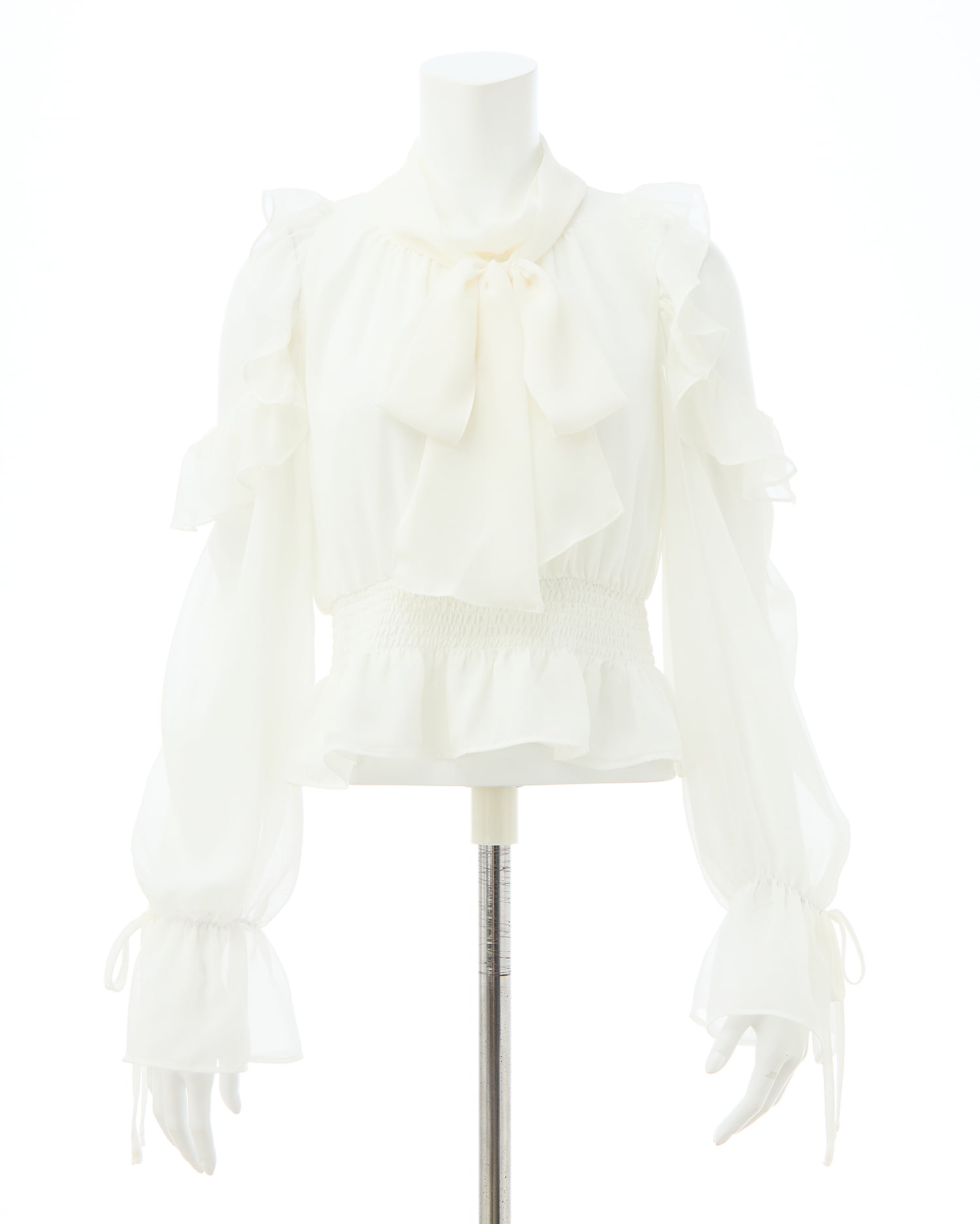 肩口や袖口にたっぷりフリルをあしらってシンプルなワンカラーに表情をプラス。