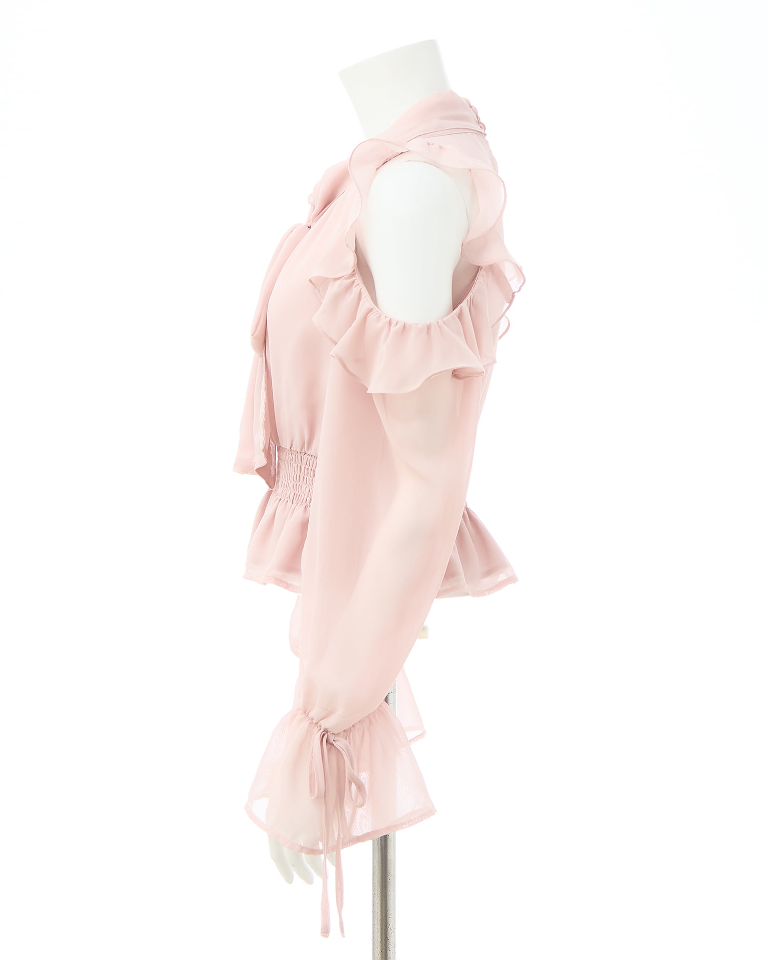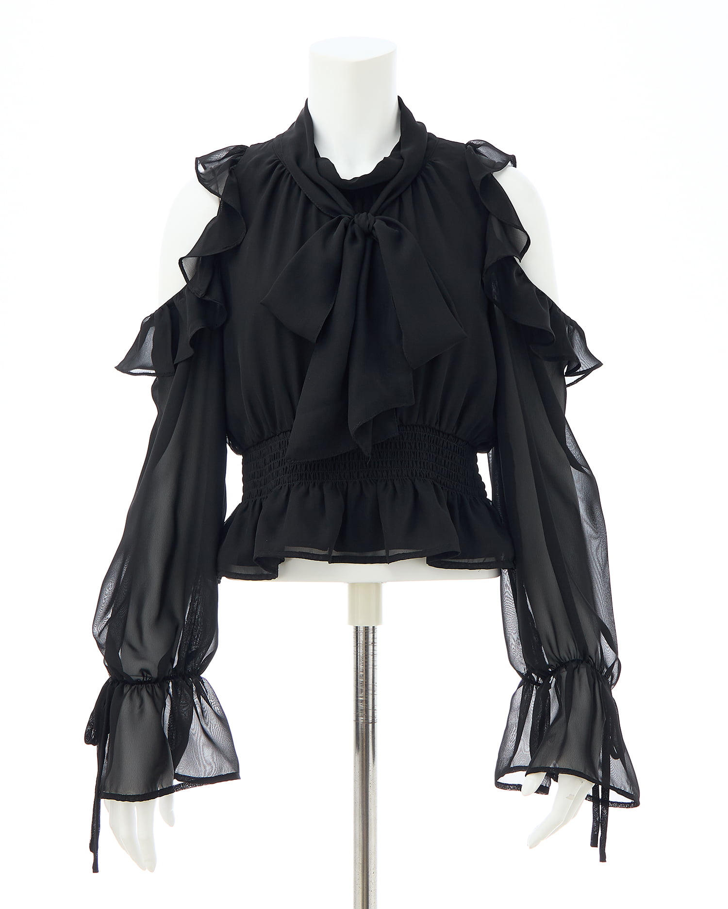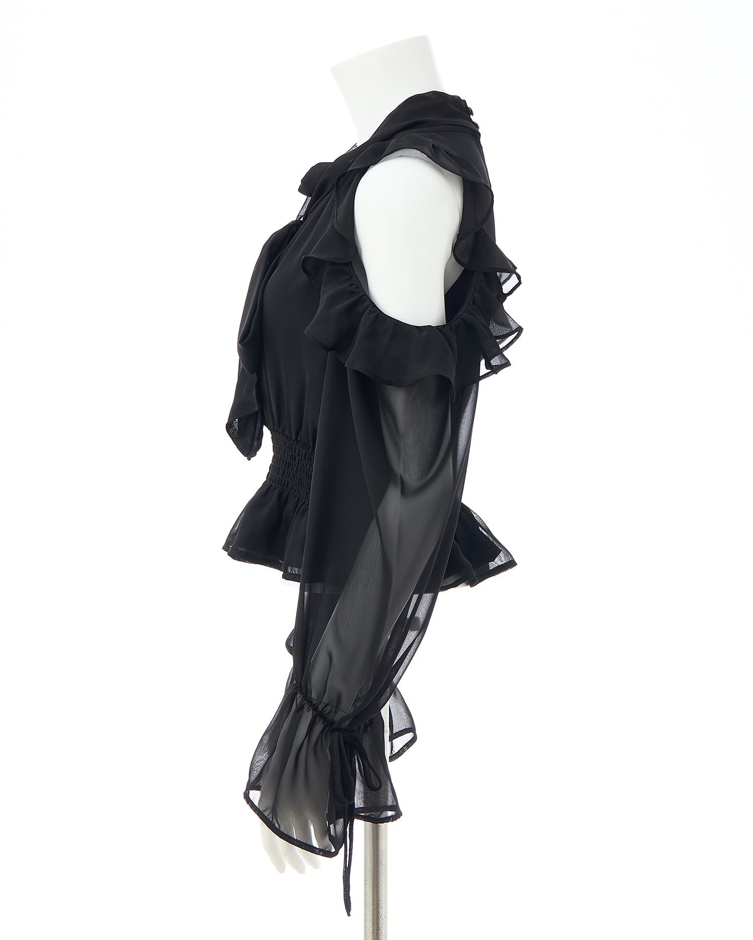 透け感のあるシフォン生地で仕立てたレディなオープンショルダーブラウス。