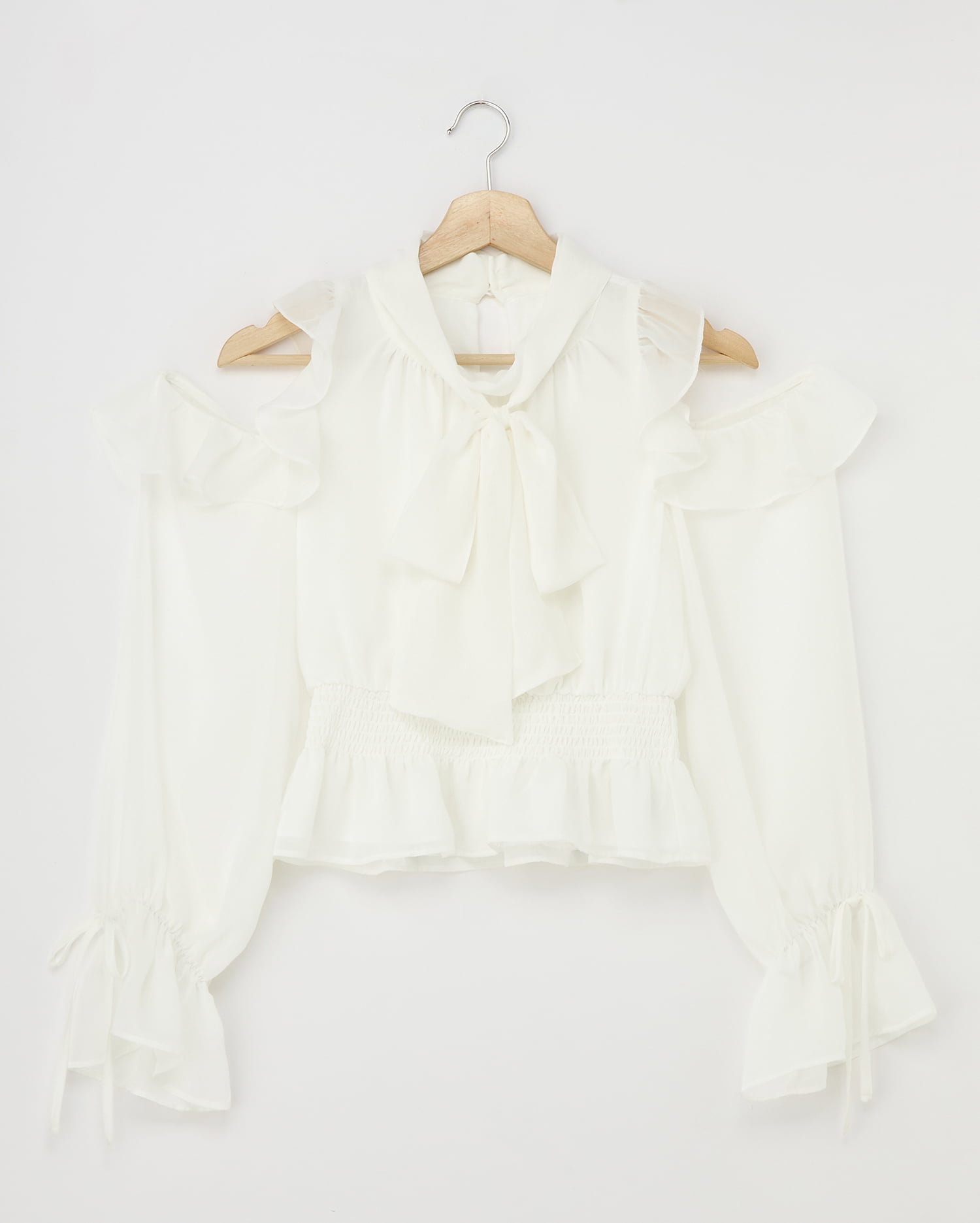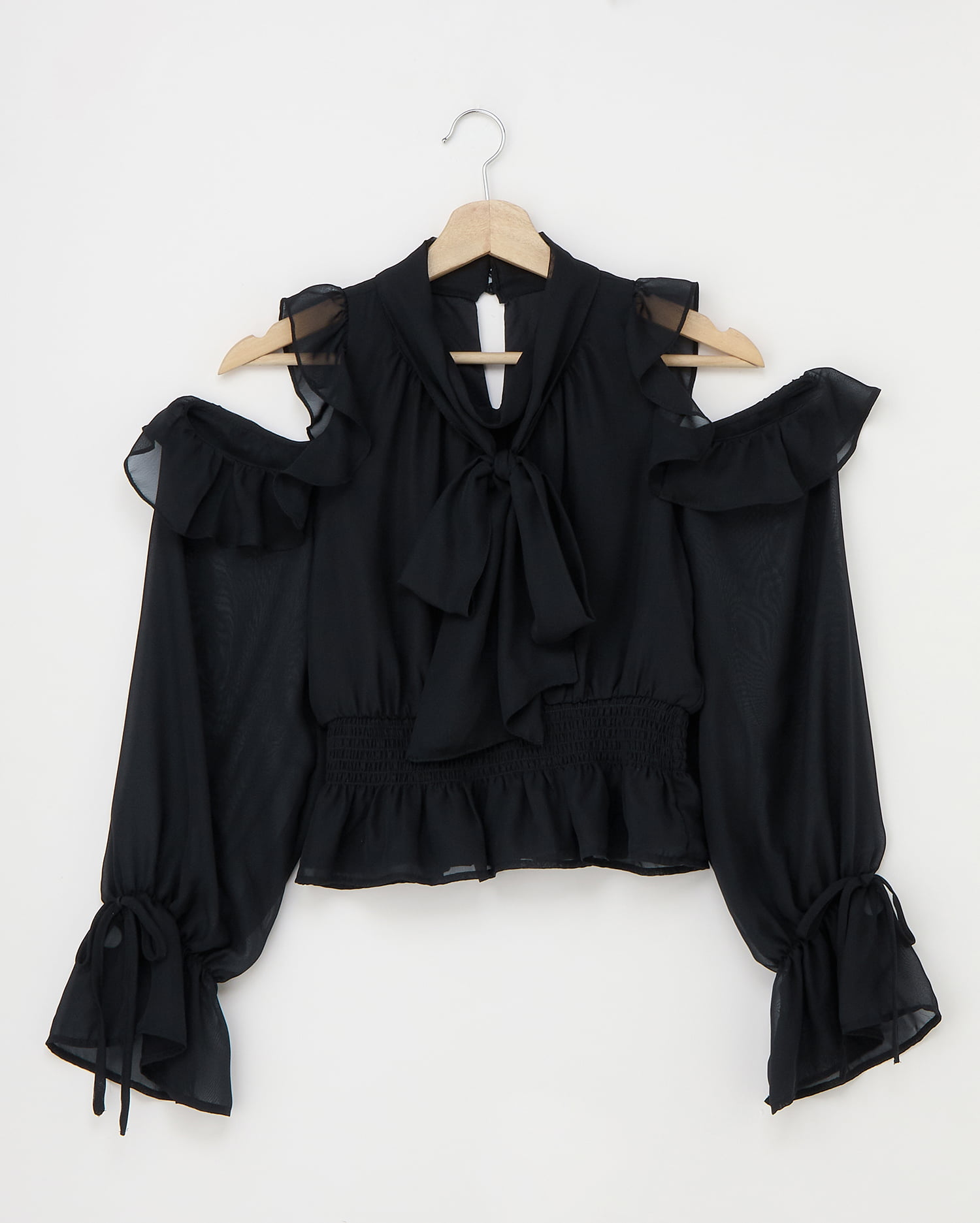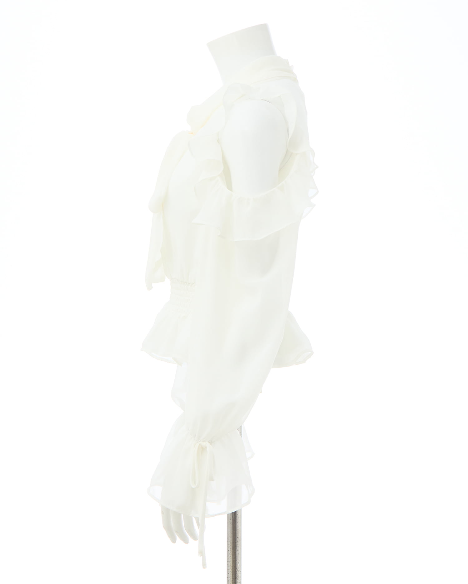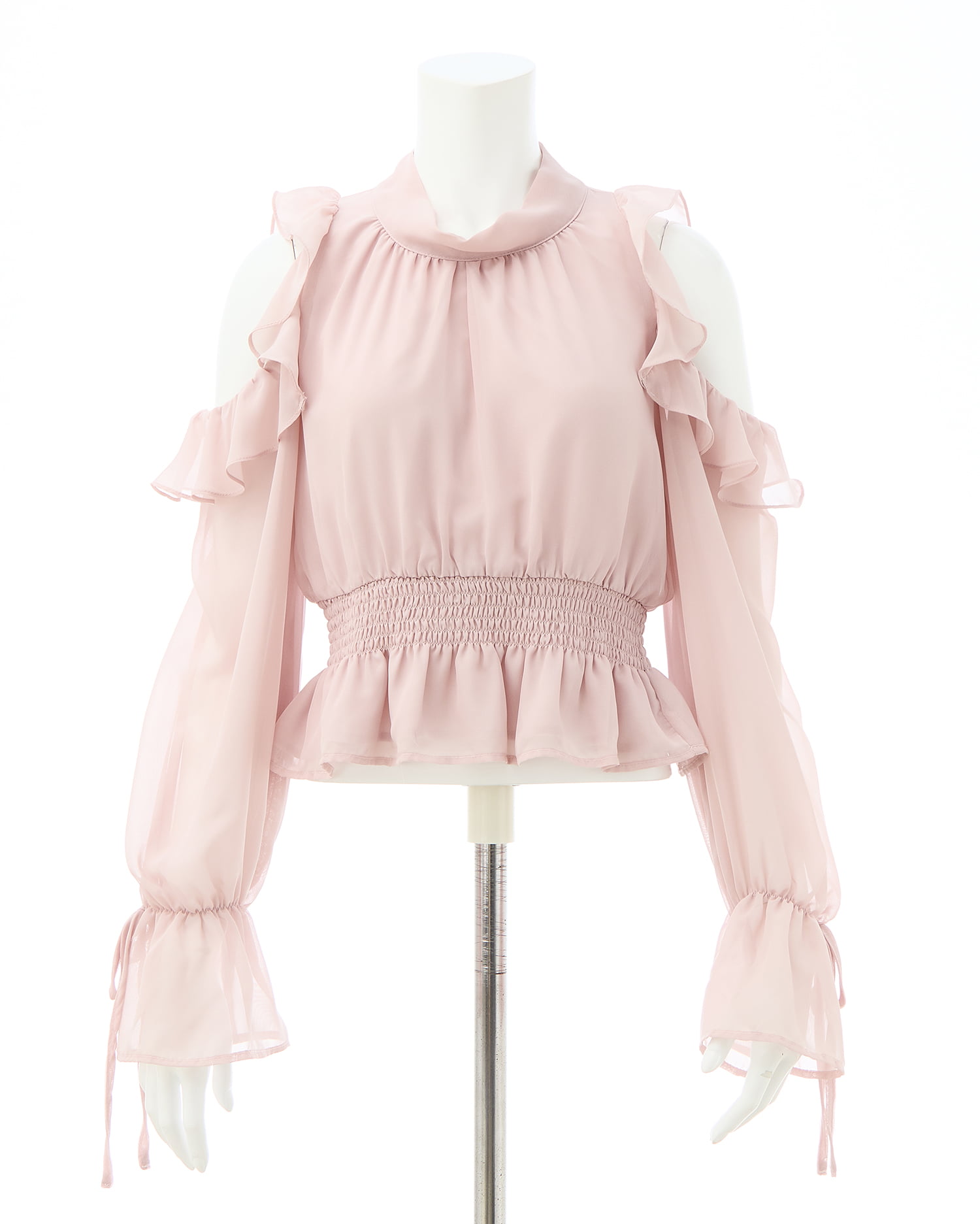 透け感のあるシフォン生地で仕立てたレディなオープンショルダーブラウス。